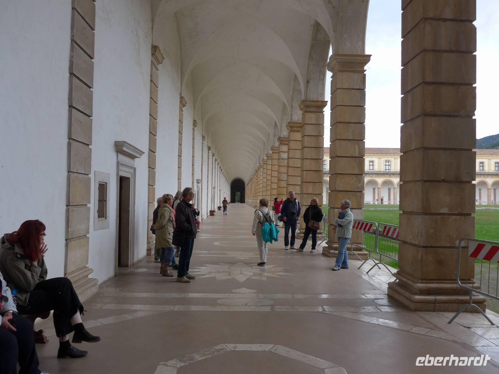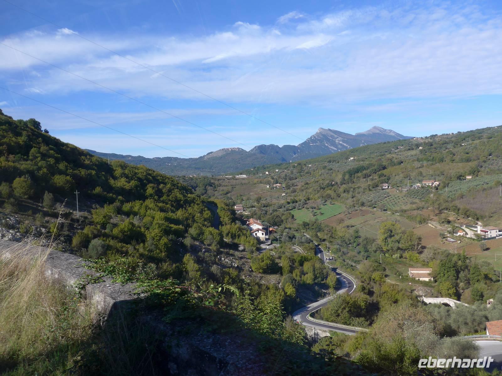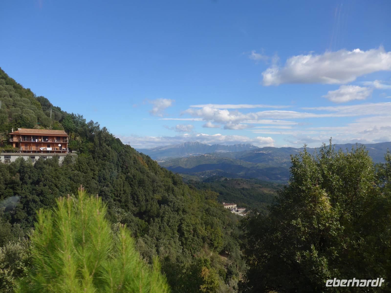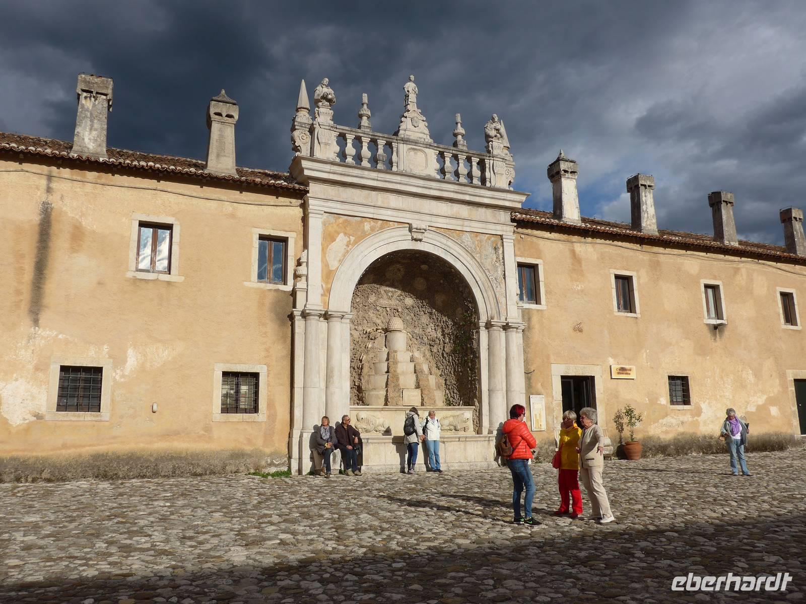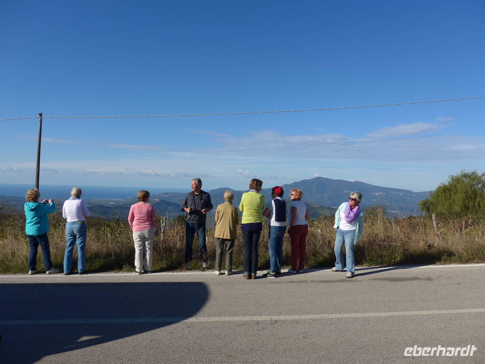 Der Weg nach Padula am anderen Ende des Cilento-National-Parks führte uns wieder durch die Bergwelt des Cilento. Die Luft war klar, die Sonne schien, nur ein wenig kühler als an den Vortagen war es. Unsere erste Pause machten wir im Grünen in der Nähe von Campora mit tollem Blick hinauf zum Bergdorf Magliano Nuovo. Die Strasse ging ständig bergauf und oben in Piaggine hielten wir zur WC- und Kaffeepause. Danach ging es immer noch weiter hinauf zum Paß mit Ausblicken bis zum Golf von Salerno und zur Amalfiküste. Wir stiegen aus und ich spendierte einen Limoncello und Hochzeitsgebäck aus dem Cilento. Und natürlich hielten wir alles in einem Gruppenfoto fest. Die Landschaft da oben ganz in der Nähe des höchten Berges des Cilento war traumhaft und nur ungern stiegen wir wieder in unseren Bus. Nach kurzer Fahrt über eine Hochebene tat sich der Blick auf hinunter in das Diano-Tal mit unserem Ziel Padula. Wir kamen an der Bischofsstadt Teggiano mit 11 Kirchen oben am Hügel vorbei und querten das Diano-Tal. Am Parkplatz der Kartause nahmen wir einen kleinen Mittagsimbiß und spazierten dann hinauf zur Kartause.