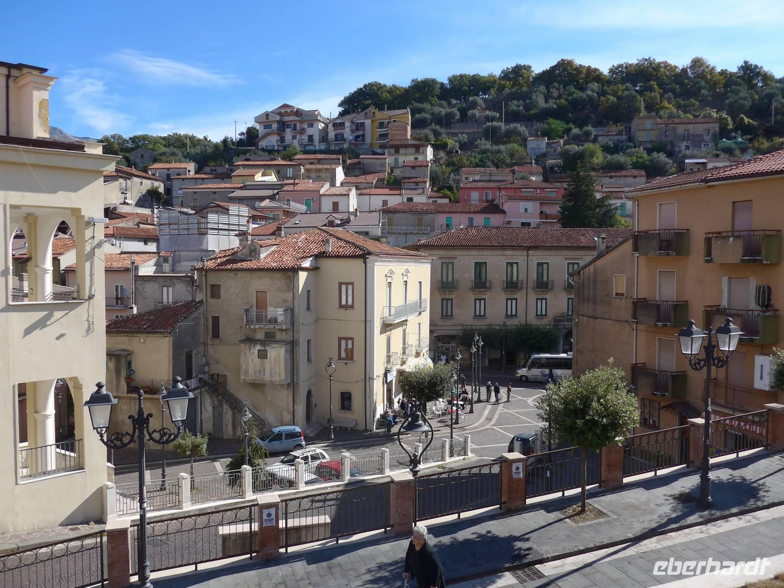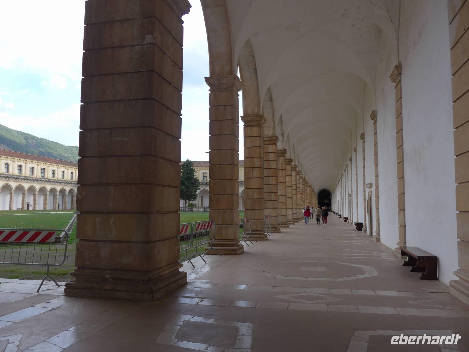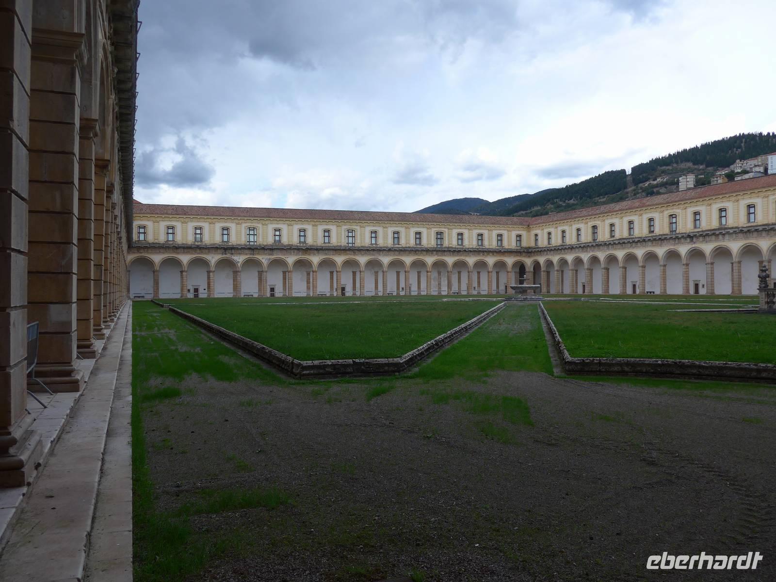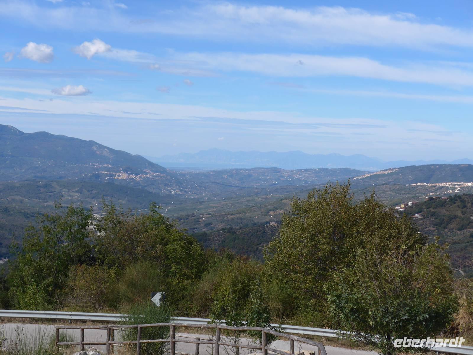 Der Weg nach Padula am anderen Ende des Cilento-National-Parks führte uns wieder durch die Bergwelt des Cilento. Die Luft war klar, die Sonne schien, nur ein wenig kühler als an den Vortagen war es. Unsere erste Pause machten wir im Grünen in der Nähe von Campora mit tollem Blick hinauf zum Bergdorf Magliano Nuovo. Die Strasse ging ständig bergauf und oben in Piaggine hielten wir zur WC- und Kaffeepause. Danach ging es immer noch weiter hinauf zum Paß mit Ausblicken bis zum Golf von Salerno und zur Amalfiküste. Wir stiegen aus und ich spendierte einen Limoncello und Hochzeitsgebäck aus dem Cilento. Und natürlich hielten wir alles in einem Gruppenfoto fest. Die Landschaft da oben ganz in der Nähe des höchten Berges des Cilento war traumhaft und nur ungern stiegen wir wieder in unseren Bus. Nach kurzer Fahrt über eine Hochebene tat sich der Blick auf hinunter in das Diano-Tal mit unserem Ziel Padula. Wir kamen an der Bischofsstadt Teggiano mit 11 Kirchen oben am Hügel vorbei und querten das Diano-Tal. Am Parkplatz der Kartause nahmen wir einen kleinen Mittagsimbiß und spazierten dann hinauf zur Kartause.