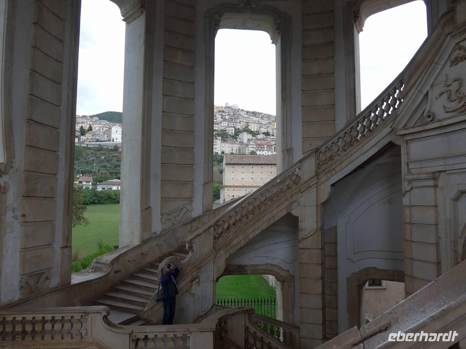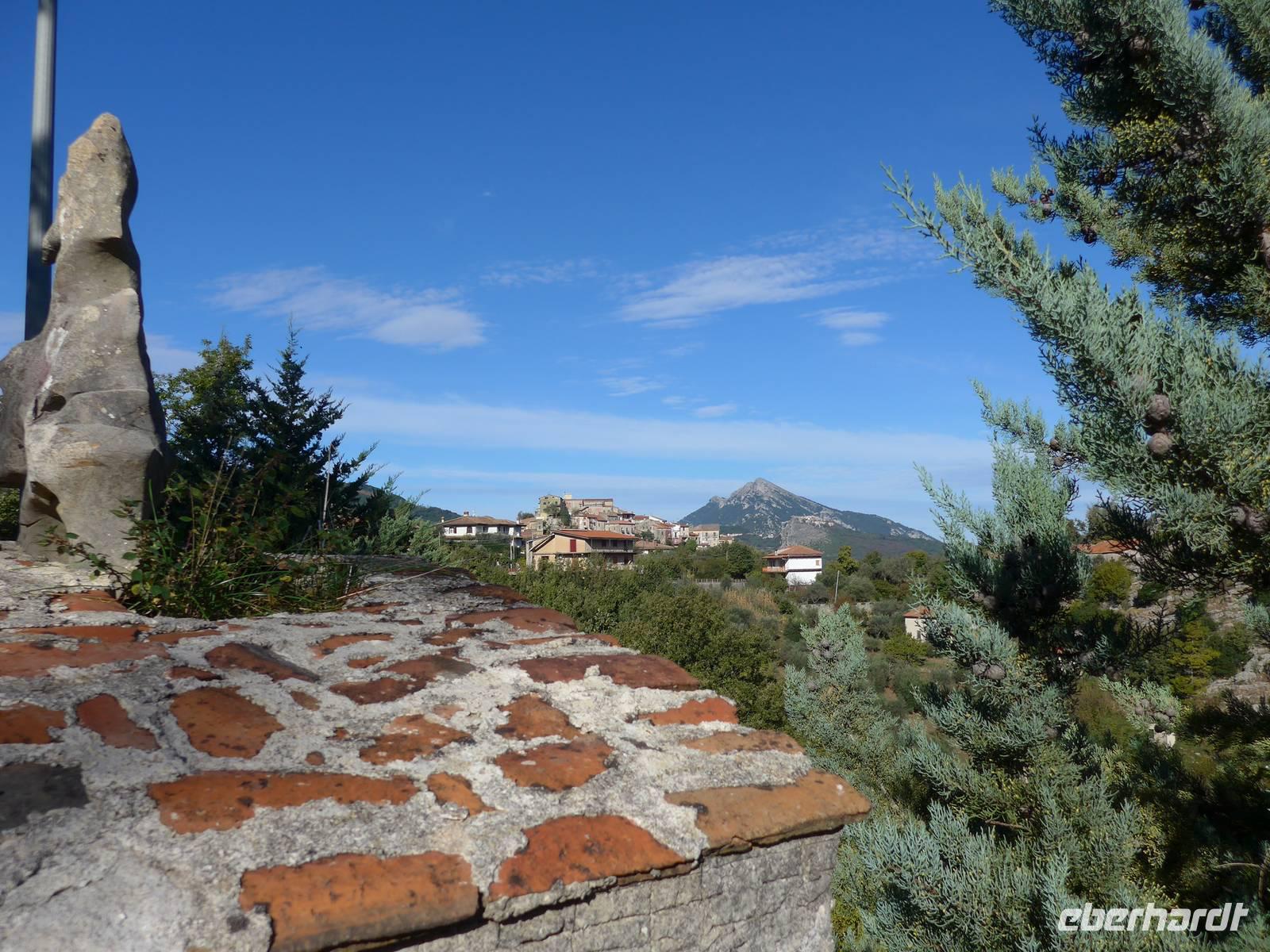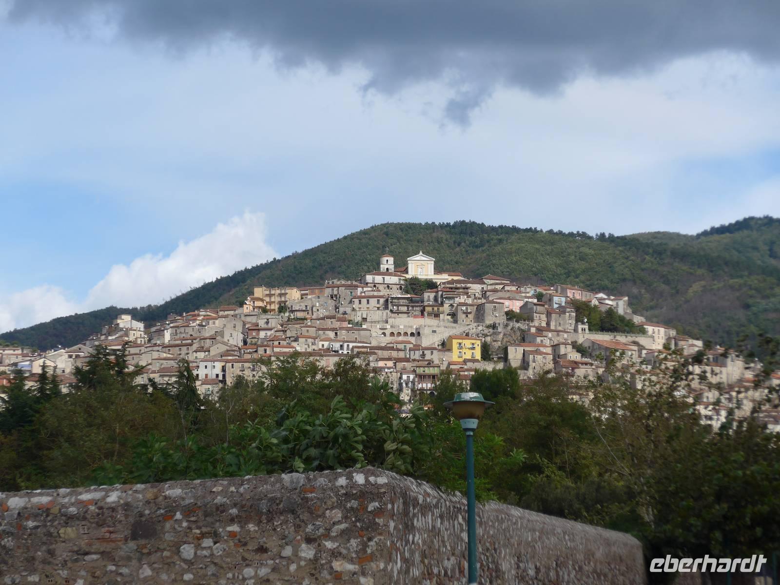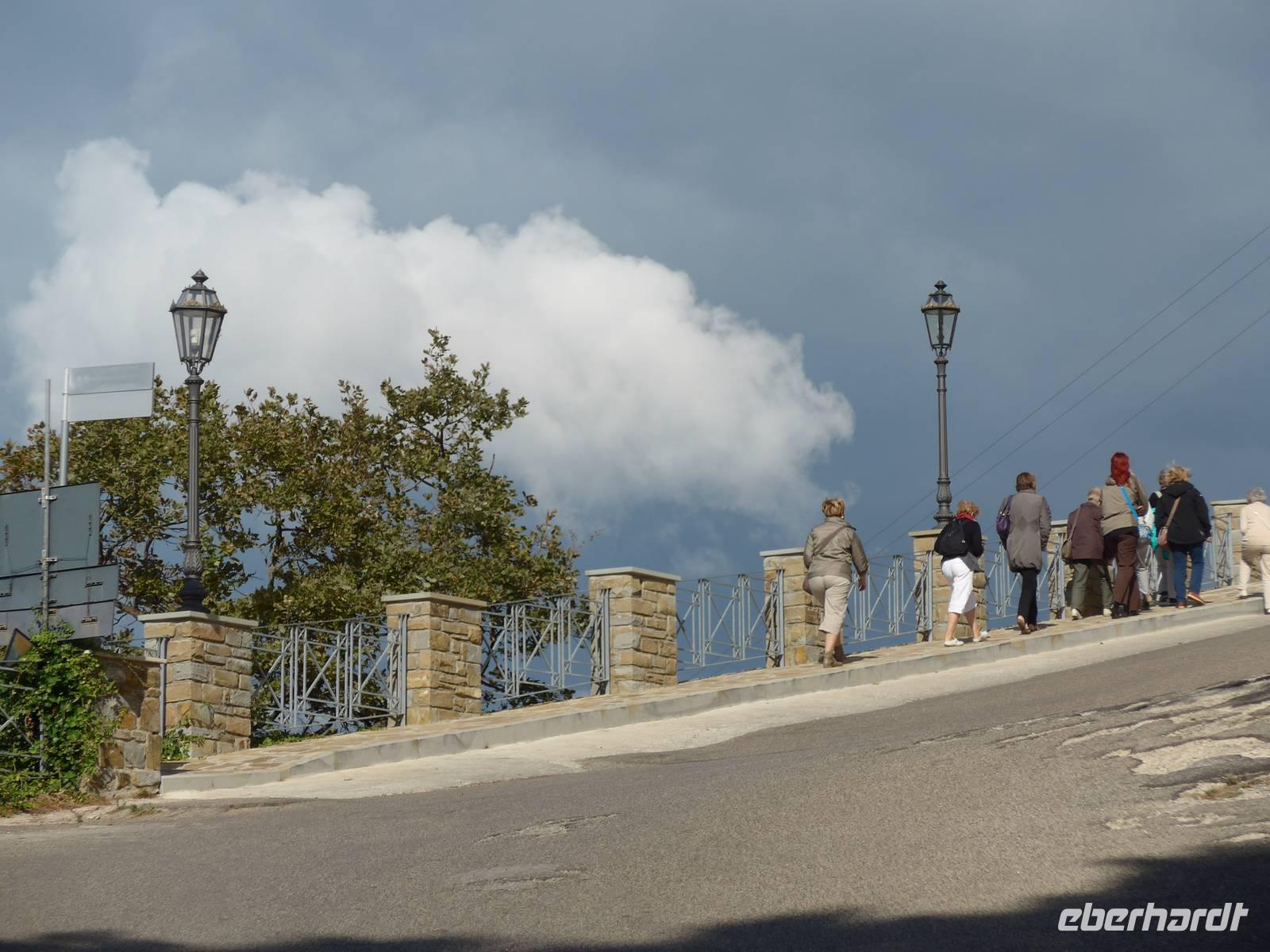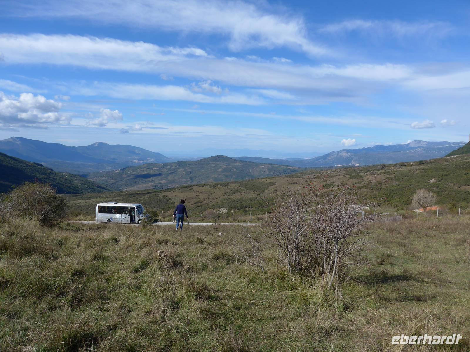Der Weg nach Padula am anderen Ende des Cilento-National-Parks führte uns wieder durch die Bergwelt des Cilento. Die Luft war klar, die Sonne schien, nur ein wenig kühler als an den Vortagen war es. Unsere erste Pause machten wir im Grünen in der Nähe von Campora mit tollem Blick hinauf zum Bergdorf Magliano Nuovo. Die Strasse ging ständig bergauf und oben in Piaggine hielten wir zur WC- und Kaffeepause. Danach ging es immer noch weiter hinauf zum Paß mit Ausblicken bis zum Golf von Salerno und zur Amalfiküste. Wir stiegen aus und ich spendierte einen Limoncello und Hochzeitsgebäck aus dem Cilento. Und natürlich hielten wir alles in einem Gruppenfoto fest. Die Landschaft da oben ganz in der Nähe des höchten Berges des Cilento war traumhaft und nur ungern stiegen wir wieder in unseren Bus. Nach kurzer Fahrt über eine Hochebene tat sich der Blick auf hinunter in das Diano-Tal mit unserem Ziel Padula. Wir kamen an der Bischofsstadt Teggiano mit 11 Kirchen oben am Hügel vorbei und querten das Diano-Tal. Am Parkplatz der Kartause nahmen wir einen kleinen Mittagsimbiß und spazierten dann hinauf zur Kartause.