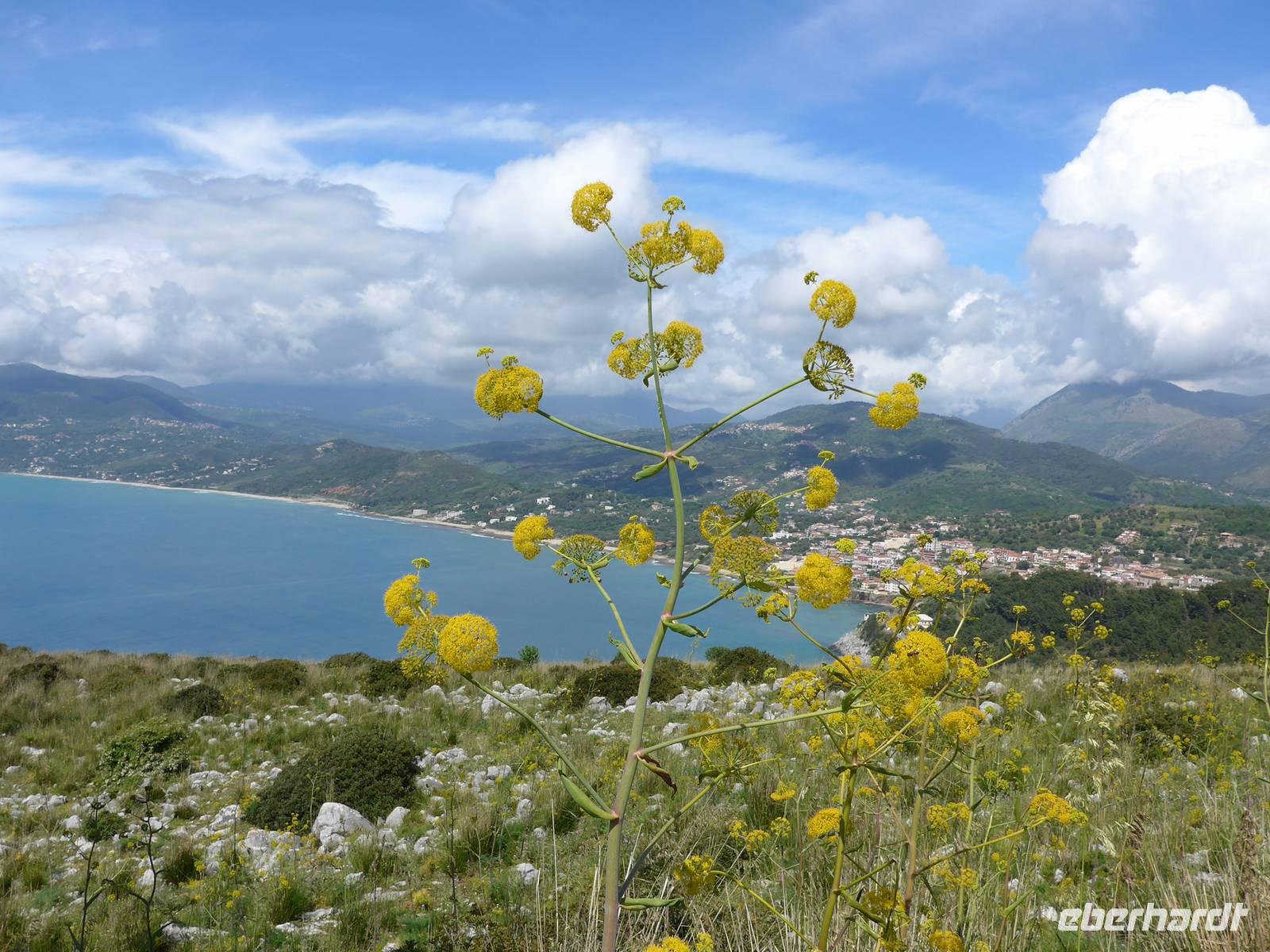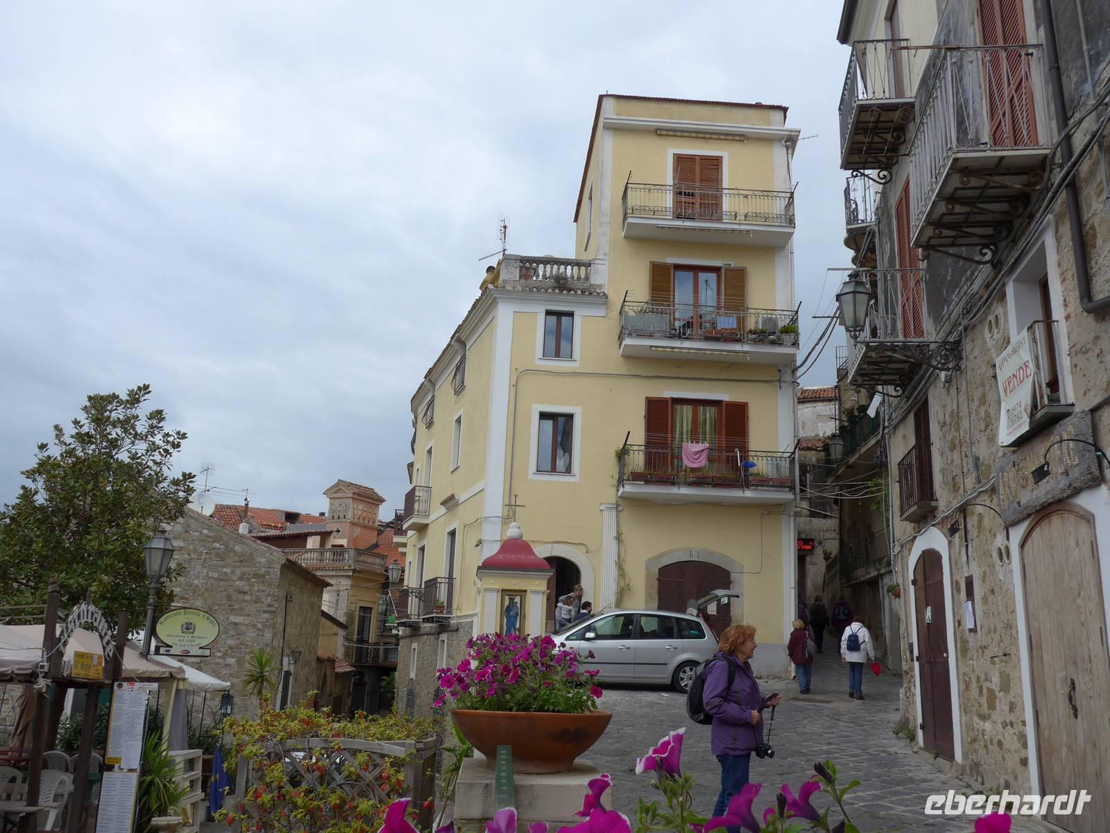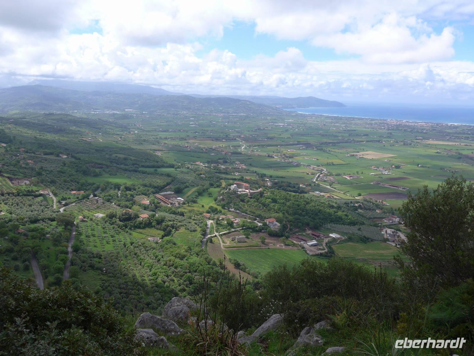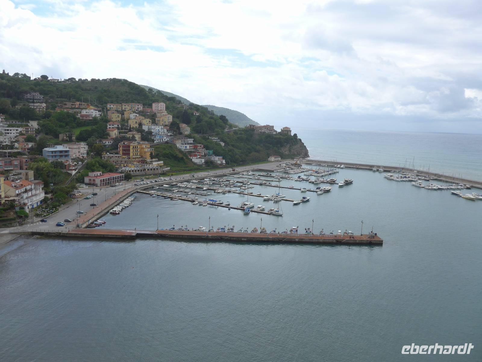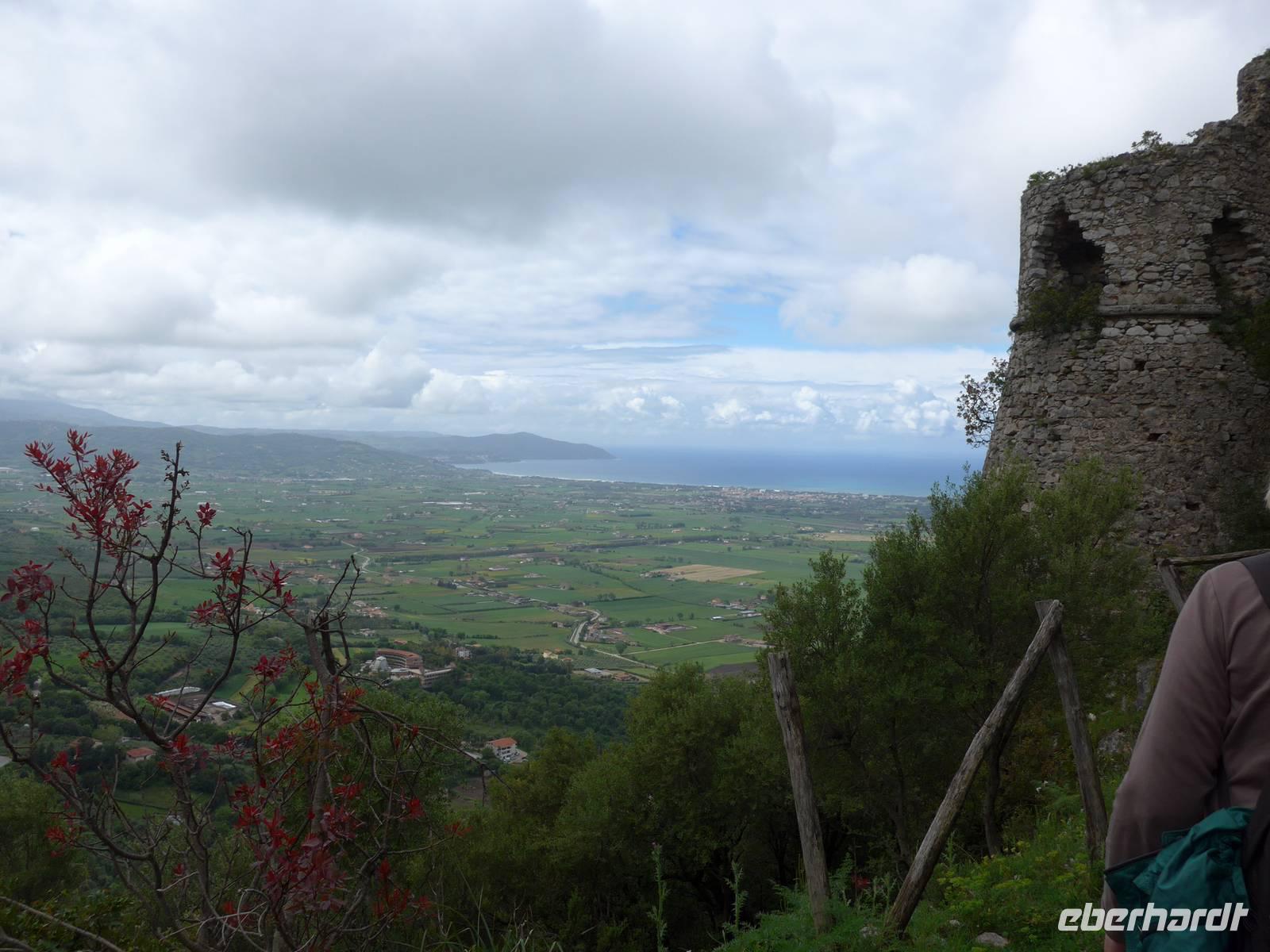 Nach einem ausgiebigen Frühstück starteten wir zum ersten Ausflug und machten gleich Stopp am Supermarkt, um Wasser einzukaufen. Auf der uns schon bekannten Strecke fuhren wir nach Paestum und hinauf zur Wallfahrtskirche der Madonna mit dem Granatapfel. Wir genossen den herrlichen Ausblick hinunter in die Sele-Ebene und begannen unsere Wanderung zunächst auf ebenem Weg und dann steil hinauf zur Festung von Friedrich II. Gäste mit guten Wanderschuhen waren klar im Vorteil und meisterten den Anstieg problemlos. Unterwegs zeigte uns Ursula viele Pflanzen und wir genossen immer wieder die tolle Aussicht. Das letzte Stück war weglos und bedurfte der ganzen Aufmerksamkeit. Oben wurden wir aber mit unvergeßlichen Ausblicken belohnt. Nach kurzem Aufenthalt stiegen wir auf gleichem Weg wieder ab und trafen uns an der Kirche, die wir anschließend besichtigten. Wir waren überrascht vom stark abfallenden Fußboden in der Kirche. Dann ging es hinunter in die Sele-Ebene zur Mittagspause in der Wasserbüffelfarm Barlotti in Capaccio. Wir probierten die Produkte aus Büffelmilch. Mit der Haltung der Wasserbüffel und vor allem der "Aufbewahrung" der Babys konnten wir nicht einverstanden sein und empfehlen Eberhardt Travel, künftig eine andere Farm aufzusuchen. Den Nachmittag verbrachten wir in Agropoli und spazierten durch die Stadt hinauf in die Altstadt und auf die Festung. Vom höchsten Punkt hatte man eine tolle Aussicht auf die Küste und die Berge des Cilento. Zurück in Pioppi spazierten wir gemeinsam durch den Ort und erkundeten die Geschäfte.