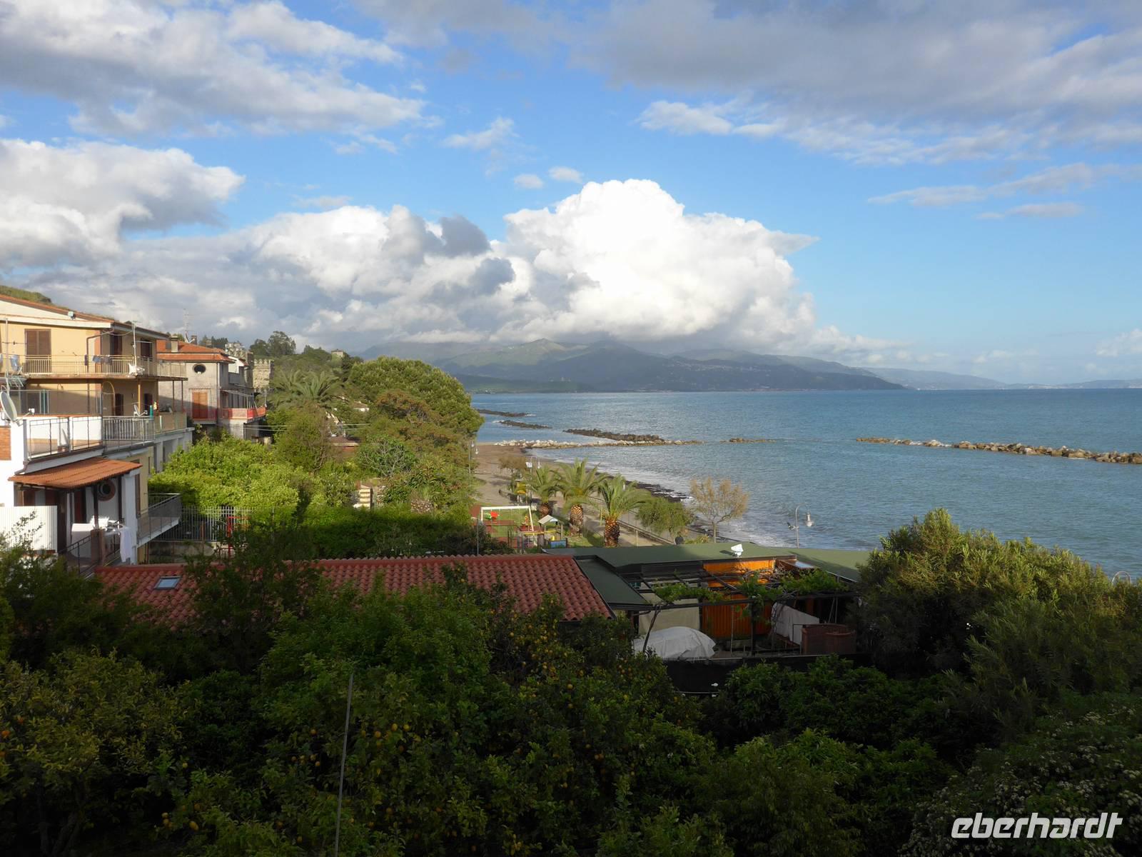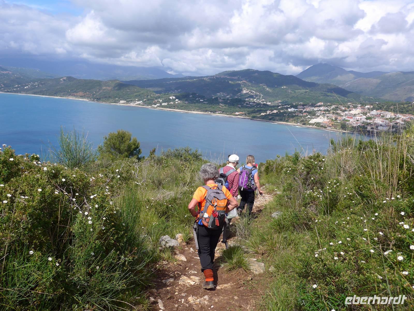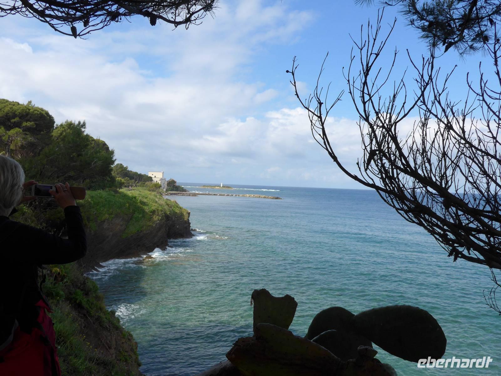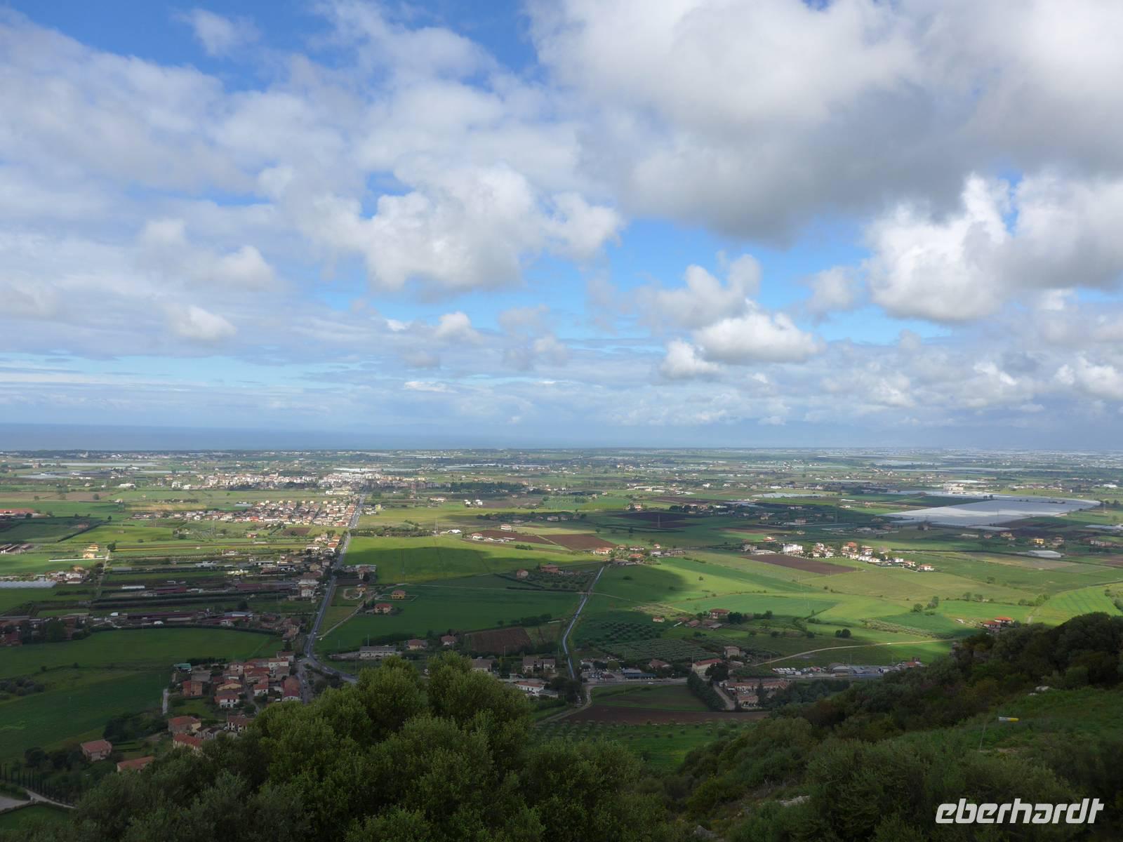 Nach einem ausgiebigen Frühstück starteten wir zum ersten Ausflug und machten gleich Stopp am Supermarkt, um Wasser einzukaufen. Auf der uns schon bekannten Strecke fuhren wir nach Paestum und hinauf zur Wallfahrtskirche der Madonna mit dem Granatapfel. Wir genossen den herrlichen Ausblick hinunter in die Sele-Ebene und begannen unsere Wanderung zunächst auf ebenem Weg und dann steil hinauf zur Festung von Friedrich II. Gäste mit guten Wanderschuhen waren klar im Vorteil und meisterten den Anstieg problemlos. Unterwegs zeigte uns Ursula viele Pflanzen und wir genossen immer wieder die tolle Aussicht. Das letzte Stück war weglos und bedurfte der ganzen Aufmerksamkeit. Oben wurden wir aber mit unvergeßlichen Ausblicken belohnt. Nach kurzem Aufenthalt stiegen wir auf gleichem Weg wieder ab und trafen uns an der Kirche, die wir anschließend besichtigten. Wir waren überrascht vom stark abfallenden Fußboden in der Kirche. Dann ging es hinunter in die Sele-Ebene zur Mittagspause in der Wasserbüffelfarm Barlotti in Capaccio. Wir probierten die Produkte aus Büffelmilch. Mit der Haltung der Wasserbüffel und vor allem der "Aufbewahrung" der Babys konnten wir nicht einverstanden sein und empfehlen Eberhardt Travel, künftig eine andere Farm aufzusuchen. Den Nachmittag verbrachten wir in Agropoli und spazierten durch die Stadt hinauf in die Altstadt und auf die Festung. Vom höchsten Punkt hatte man eine tolle Aussicht auf die Küste und die Berge des Cilento. Zurück in Pioppi spazierten wir gemeinsam durch den Ort und erkundeten die Geschäfte.