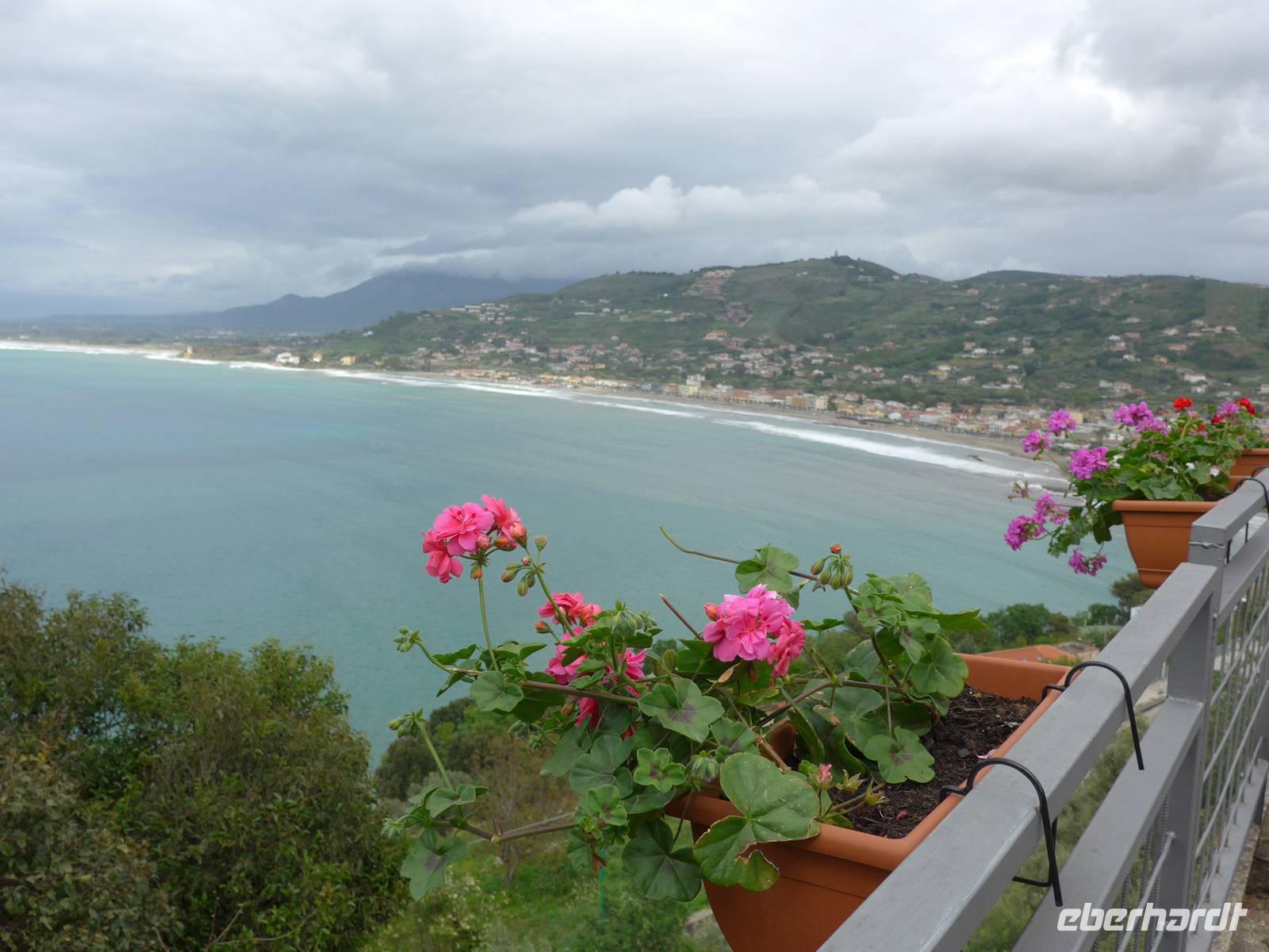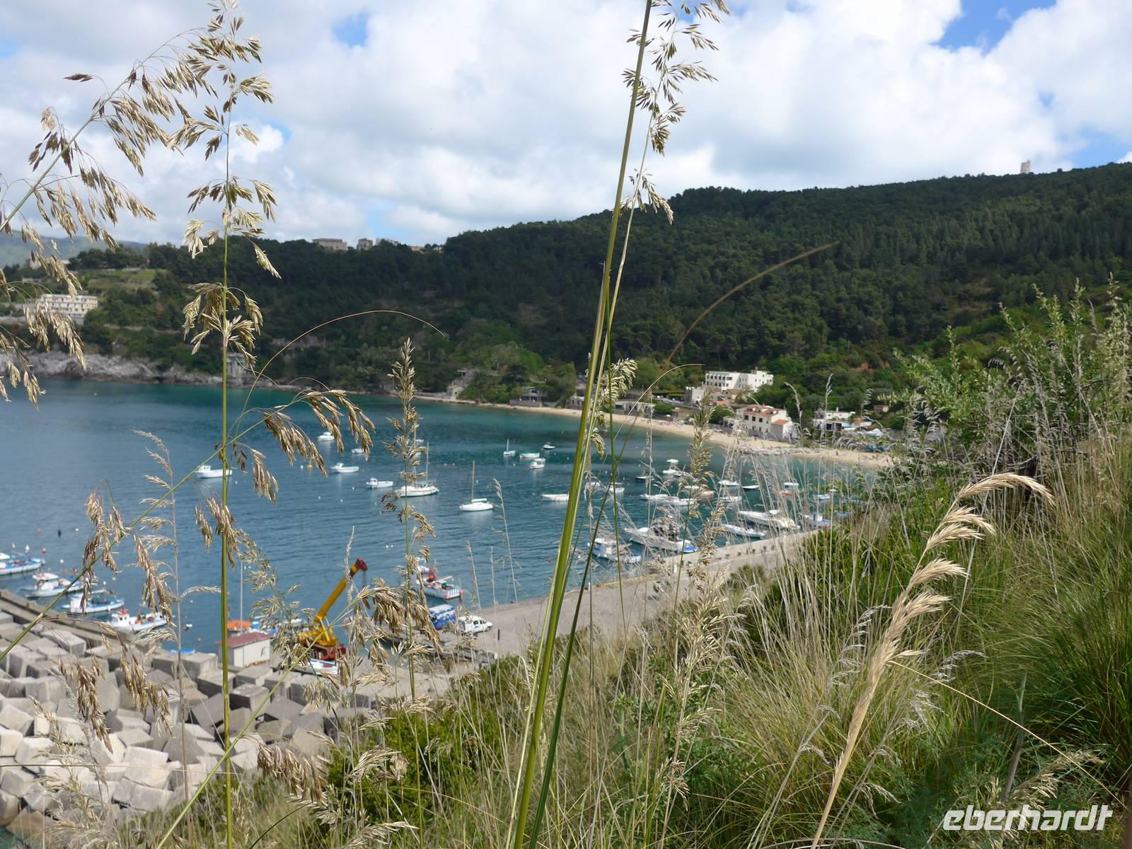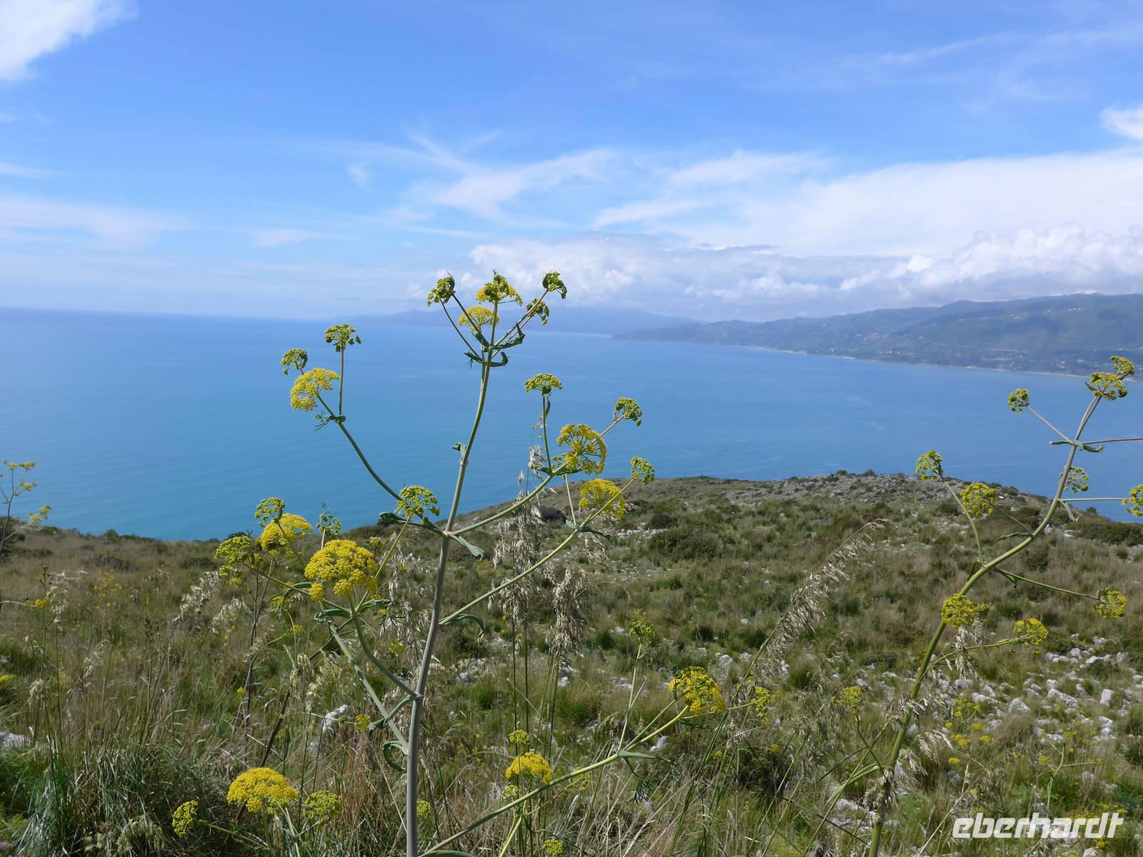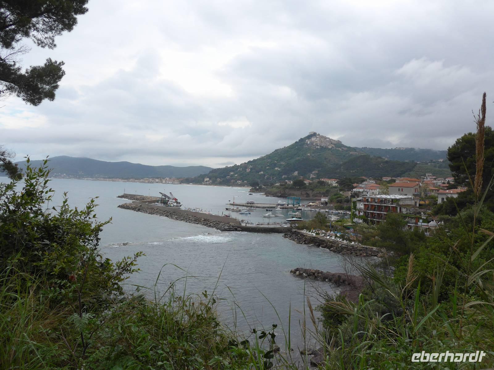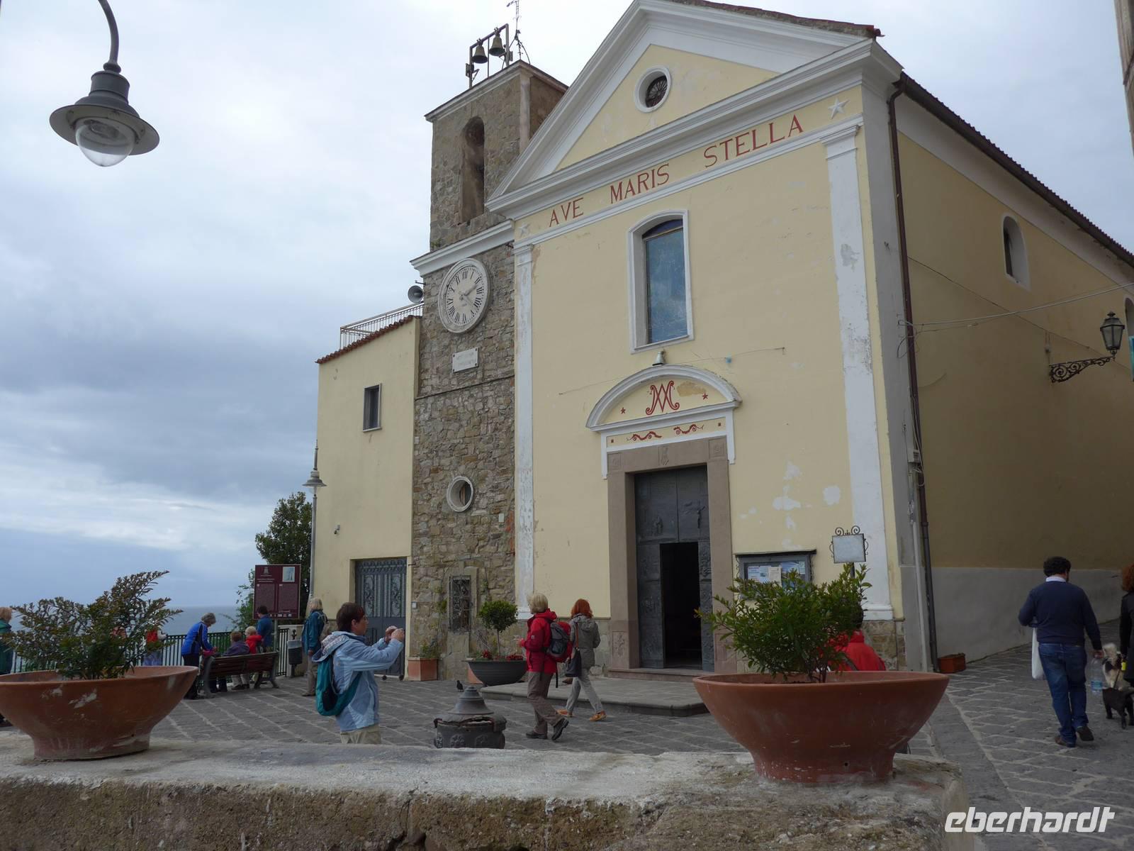 Nach einem ausgiebigen Frühstück starteten wir zum ersten Ausflug und machten gleich Stopp am Supermarkt, um Wasser einzukaufen. Auf der uns schon bekannten Strecke fuhren wir nach Paestum und hinauf zur Wallfahrtskirche der Madonna mit dem Granatapfel. Wir genossen den herrlichen Ausblick hinunter in die Sele-Ebene und begannen unsere Wanderung zunächst auf ebenem Weg und dann steil hinauf zur Festung von Friedrich II. Gäste mit guten Wanderschuhen waren klar im Vorteil und meisterten den Anstieg problemlos. Unterwegs zeigte uns Ursula viele Pflanzen und wir genossen immer wieder die tolle Aussicht. Das letzte Stück war weglos und bedurfte der ganzen Aufmerksamkeit. Oben wurden wir aber mit unvergeßlichen Ausblicken belohnt. Nach kurzem Aufenthalt stiegen wir auf gleichem Weg wieder ab und trafen uns an der Kirche, die wir anschließend besichtigten. Wir waren überrascht vom stark abfallenden Fußboden in der Kirche. Dann ging es hinunter in die Sele-Ebene zur Mittagspause in der Wasserbüffelfarm Barlotti in Capaccio. Wir probierten die Produkte aus Büffelmilch. Mit der Haltung der Wasserbüffel und vor allem der "Aufbewahrung" der Babys konnten wir nicht einverstanden sein und empfehlen Eberhardt Travel, künftig eine andere Farm aufzusuchen. Den Nachmittag verbrachten wir in Agropoli und spazierten durch die Stadt hinauf in die Altstadt und auf die Festung. Vom höchsten Punkt hatte man eine tolle Aussicht auf die Küste und die Berge des Cilento. Zurück in Pioppi spazierten wir gemeinsam durch den Ort und erkundeten die Geschäfte.
