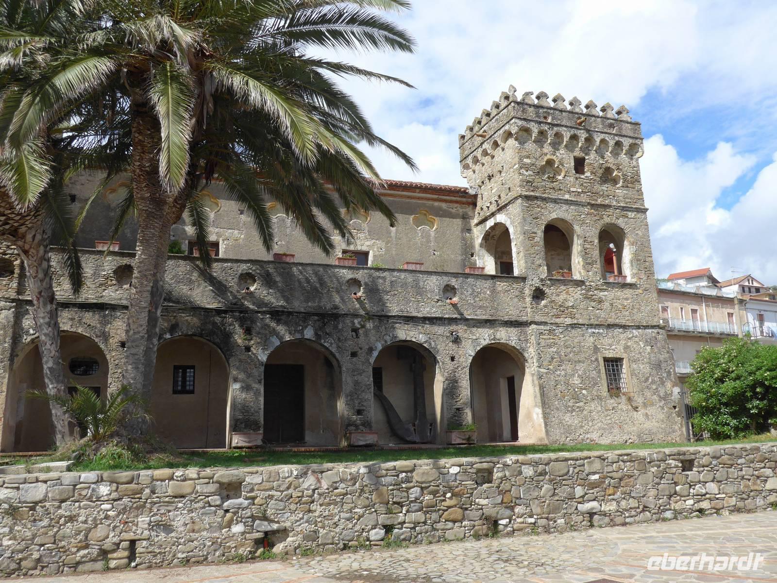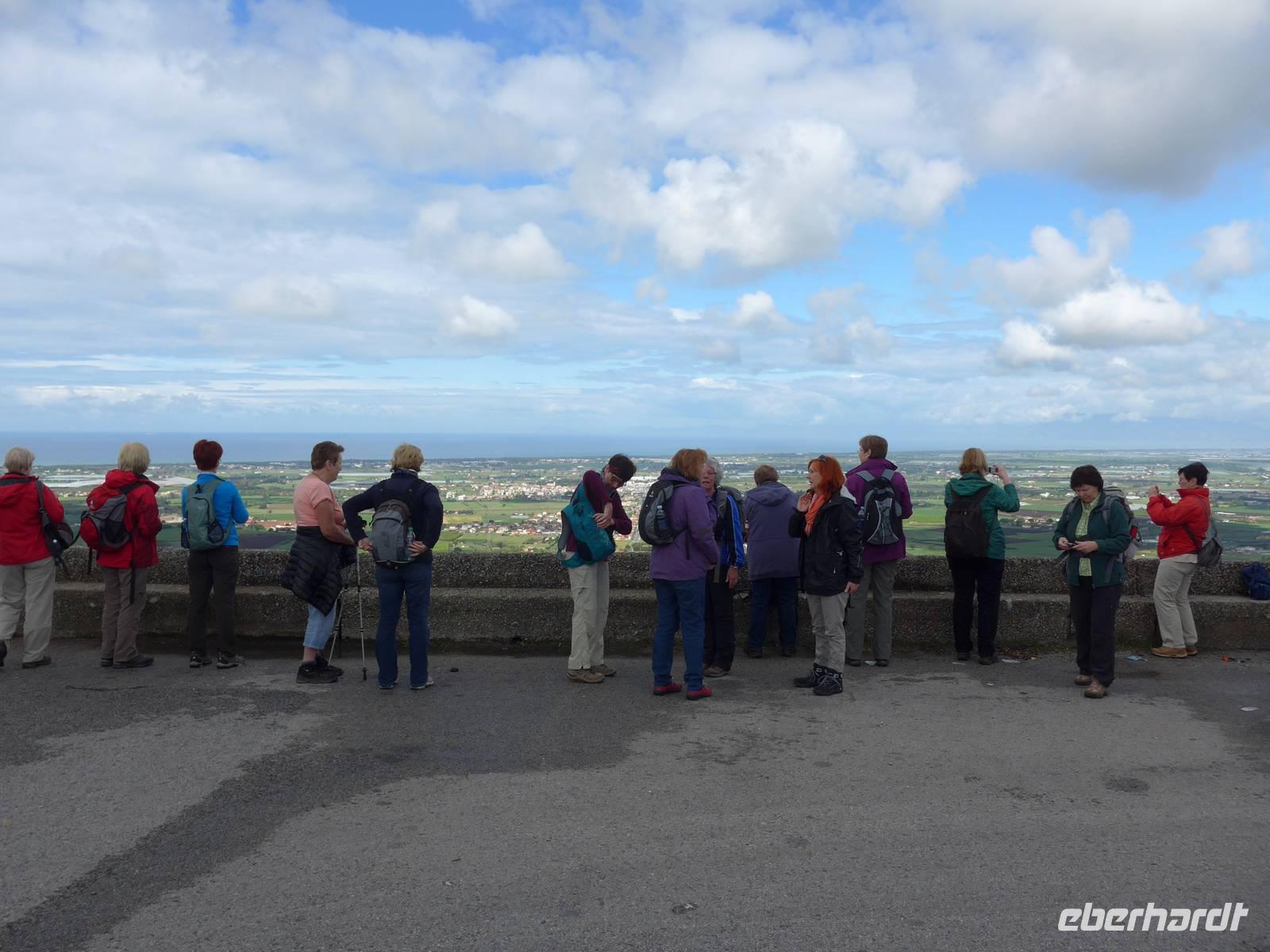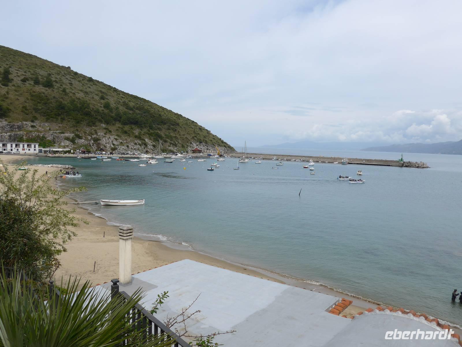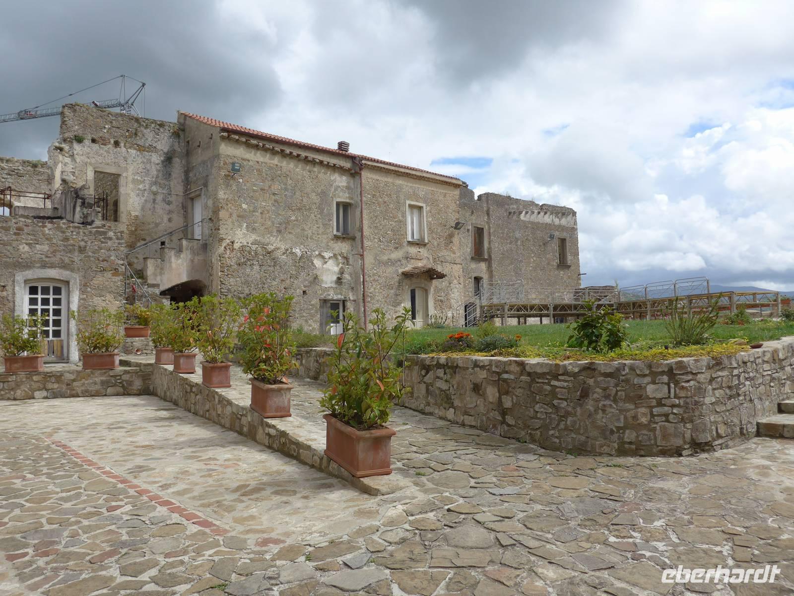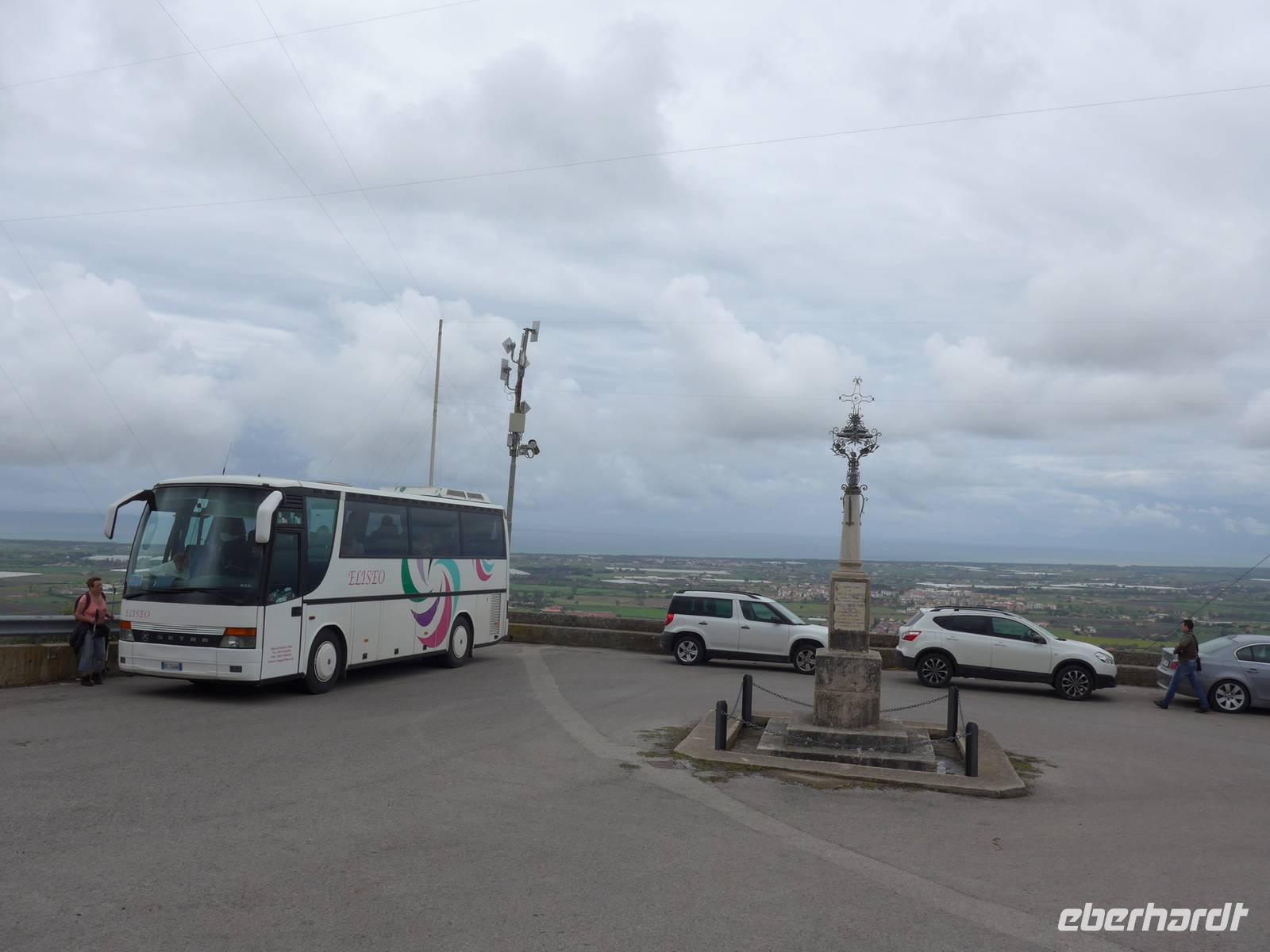 Nach einem ausgiebigen Frühstück starteten wir zum ersten Ausflug und machten gleich Stopp am Supermarkt, um Wasser einzukaufen. Auf der uns schon bekannten Strecke fuhren wir nach Paestum und hinauf zur Wallfahrtskirche der Madonna mit dem Granatapfel. Wir genossen den herrlichen Ausblick hinunter in die Sele-Ebene und begannen unsere Wanderung zunächst auf ebenem Weg und dann steil hinauf zur Festung von Friedrich II. Gäste mit guten Wanderschuhen waren klar im Vorteil und meisterten den Anstieg problemlos. Unterwegs zeigte uns Ursula viele Pflanzen und wir genossen immer wieder die tolle Aussicht. Das letzte Stück war weglos und bedurfte der ganzen Aufmerksamkeit. Oben wurden wir aber mit unvergeßlichen Ausblicken belohnt. Nach kurzem Aufenthalt stiegen wir auf gleichem Weg wieder ab und trafen uns an der Kirche, die wir anschließend besichtigten. Wir waren überrascht vom stark abfallenden Fußboden in der Kirche. Dann ging es hinunter in die Sele-Ebene zur Mittagspause in der Wasserbüffelfarm Barlotti in Capaccio. Wir probierten die Produkte aus Büffelmilch. Mit der Haltung der Wasserbüffel und vor allem der "Aufbewahrung" der Babys konnten wir nicht einverstanden sein und empfehlen Eberhardt Travel, künftig eine andere Farm aufzusuchen. Den Nachmittag verbrachten wir in Agropoli und spazierten durch die Stadt hinauf in die Altstadt und auf die Festung. Vom höchsten Punkt hatte man eine tolle Aussicht auf die Küste und die Berge des Cilento. Zurück in Pioppi spazierten wir gemeinsam durch den Ort und erkundeten die Geschäfte.