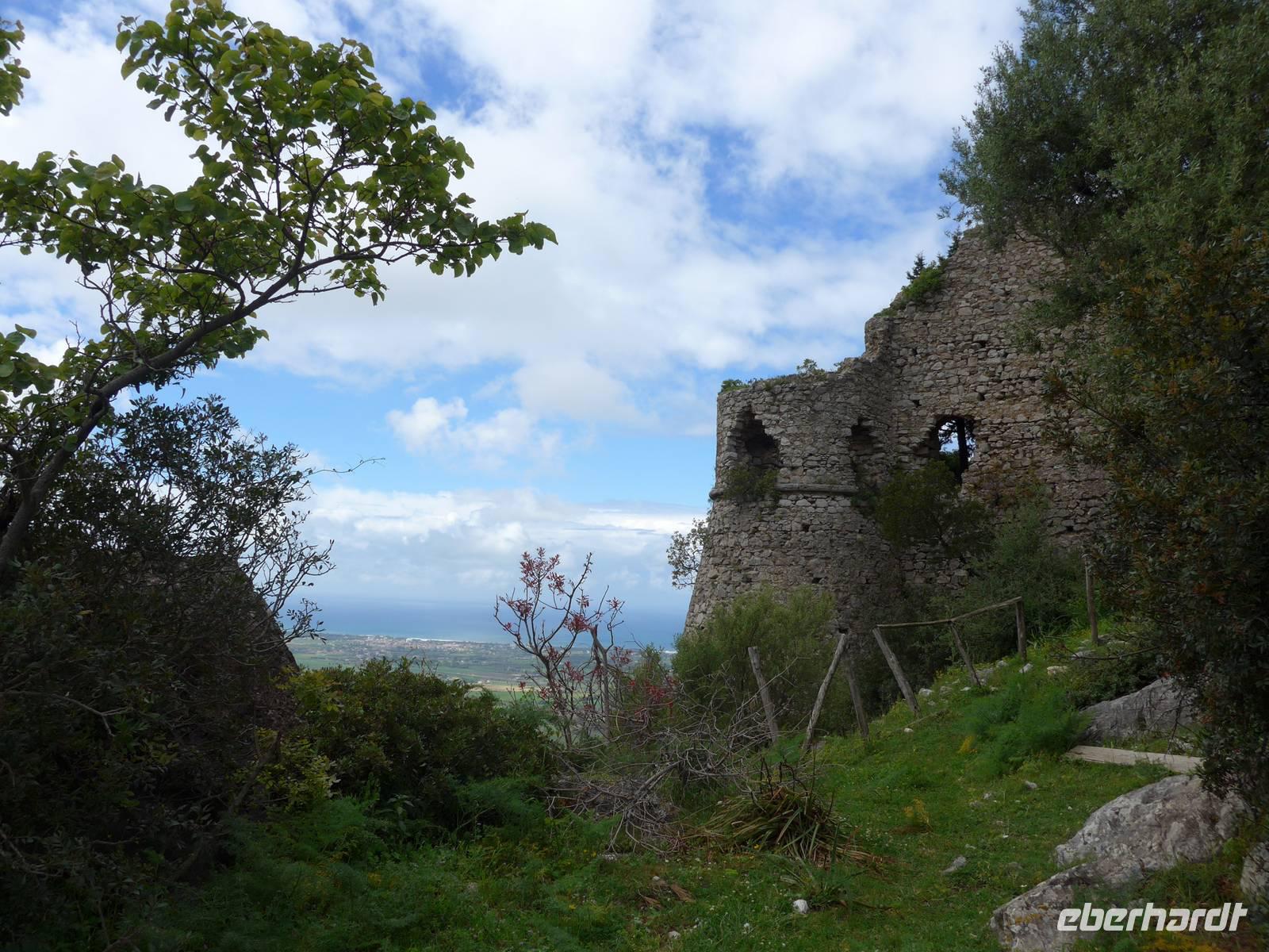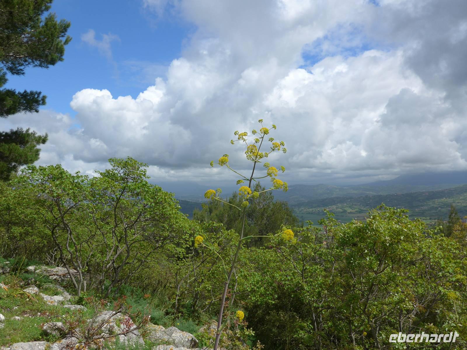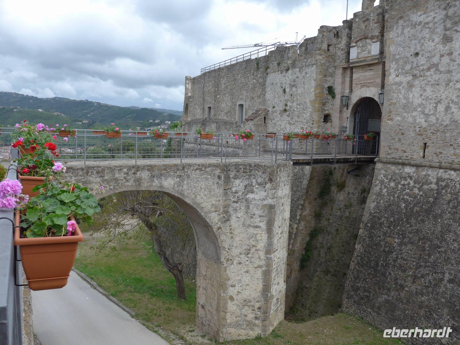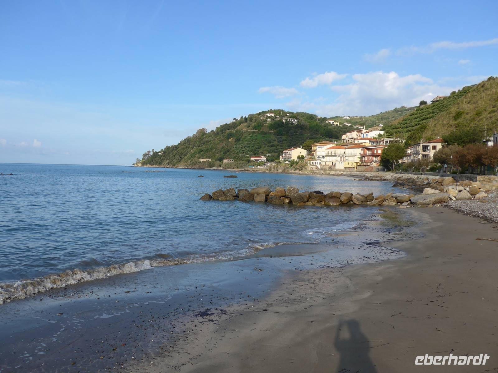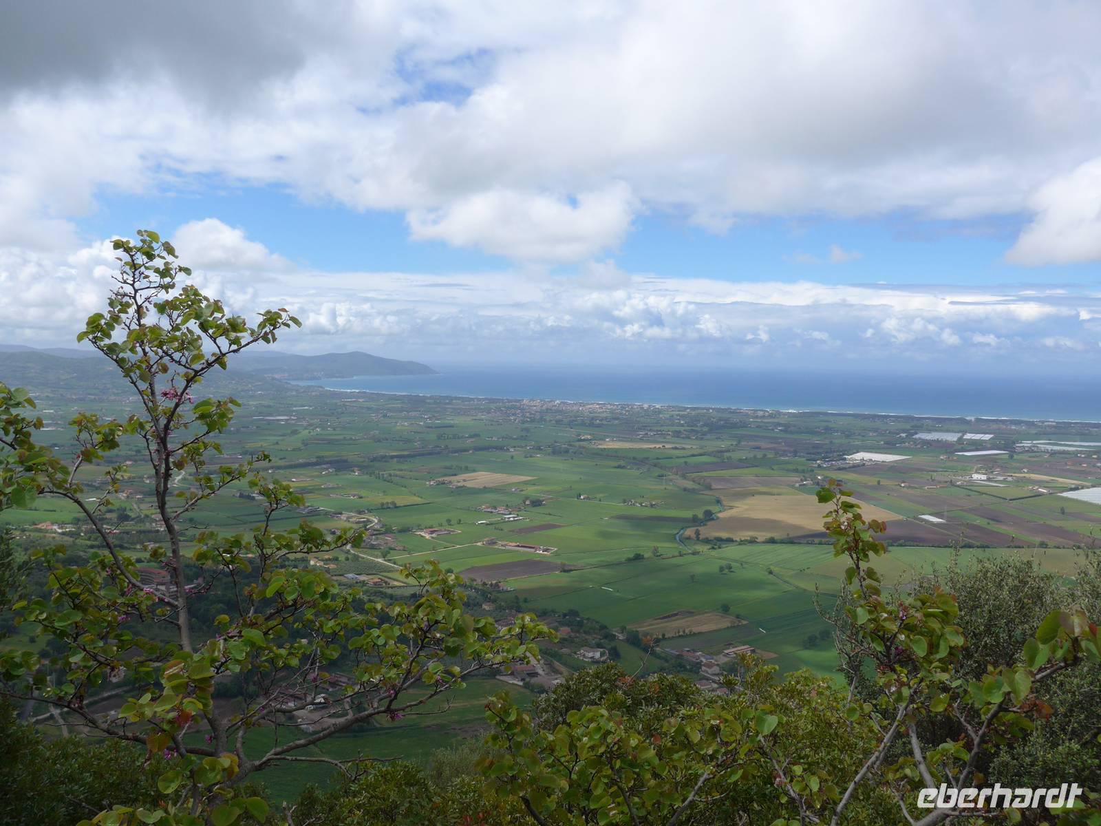 Nach einem ausgiebigen Frühstück starteten wir zum ersten Ausflug und machten gleich Stopp am Supermarkt, um Wasser einzukaufen. Auf der uns schon bekannten Strecke fuhren wir nach Paestum und hinauf zur Wallfahrtskirche der Madonna mit dem Granatapfel. Wir genossen den herrlichen Ausblick hinunter in die Sele-Ebene und begannen unsere Wanderung zunächst auf ebenem Weg und dann steil hinauf zur Festung von Friedrich II. Gäste mit guten Wanderschuhen waren klar im Vorteil und meisterten den Anstieg problemlos. Unterwegs zeigte uns Ursula viele Pflanzen und wir genossen immer wieder die tolle Aussicht. Das letzte Stück war weglos und bedurfte der ganzen Aufmerksamkeit. Oben wurden wir aber mit unvergeßlichen Ausblicken belohnt. Nach kurzem Aufenthalt stiegen wir auf gleichem Weg wieder ab und trafen uns an der Kirche, die wir anschließend besichtigten. Wir waren überrascht vom stark abfallenden Fußboden in der Kirche. Dann ging es hinunter in die Sele-Ebene zur Mittagspause in der Wasserbüffelfarm Barlotti in Capaccio. Wir probierten die Produkte aus Büffelmilch. Mit der Haltung der Wasserbüffel und vor allem der "Aufbewahrung" der Babys konnten wir nicht einverstanden sein und empfehlen Eberhardt Travel, künftig eine andere Farm aufzusuchen. Den Nachmittag verbrachten wir in Agropoli und spazierten durch die Stadt hinauf in die Altstadt und auf die Festung. Vom höchsten Punkt hatte man eine tolle Aussicht auf die Küste und die Berge des Cilento. Zurück in Pioppi spazierten wir gemeinsam durch den Ort und erkundeten die Geschäfte.