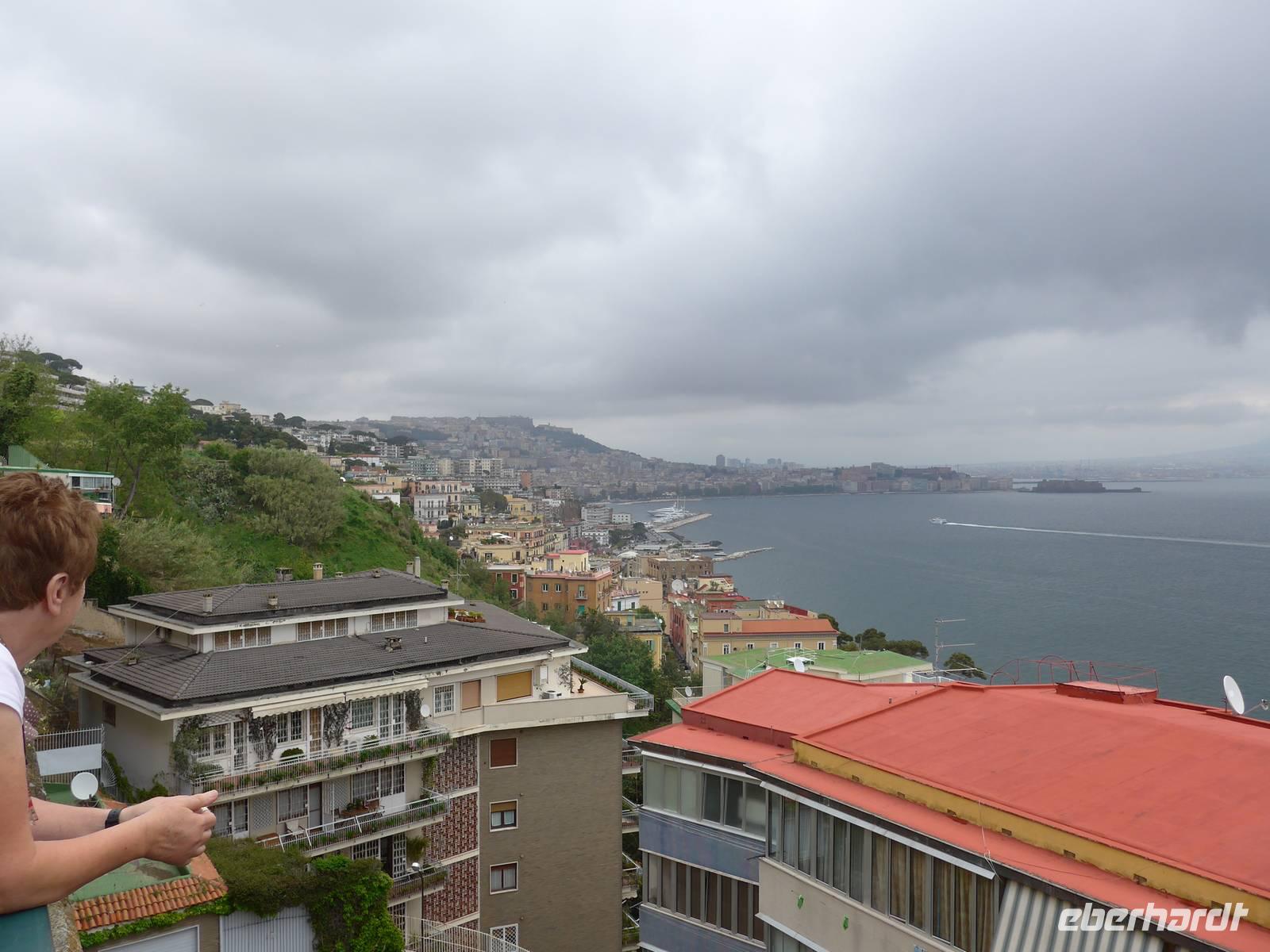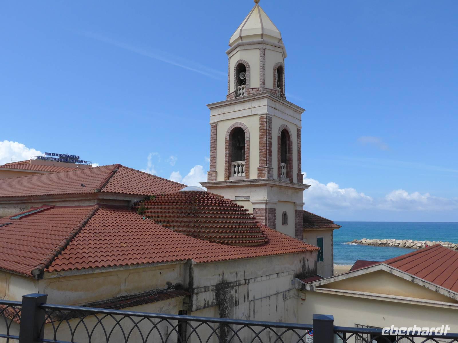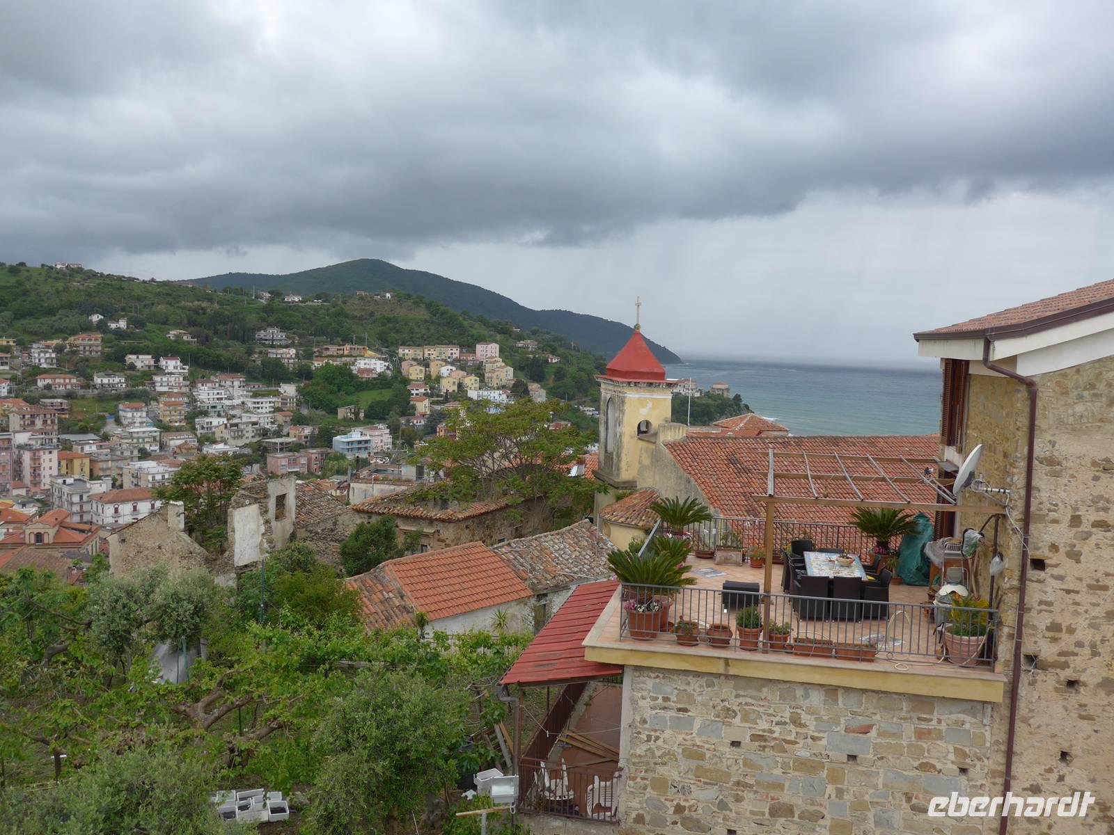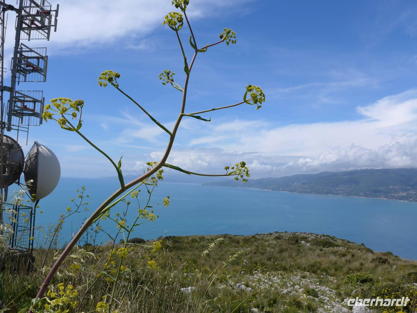 Nach einem ausgiebigen Frühstück starteten wir zum ersten Ausflug und machten gleich Stopp am Supermarkt, um Wasser einzukaufen. Auf der uns schon bekannten Strecke fuhren wir nach Paestum und hinauf zur Wallfahrtskirche der Madonna mit dem Granatapfel. Wir genossen den herrlichen Ausblick hinunter in die Sele-Ebene und begannen unsere Wanderung zunächst auf ebenem Weg und dann steil hinauf zur Festung von Friedrich II. Gäste mit guten Wanderschuhen waren klar im Vorteil und meisterten den Anstieg problemlos. Unterwegs zeigte uns Ursula viele Pflanzen und wir genossen immer wieder die tolle Aussicht. Das letzte Stück war weglos und bedurfte der ganzen Aufmerksamkeit. Oben wurden wir aber mit unvergeßlichen Ausblicken belohnt. Nach kurzem Aufenthalt stiegen wir auf gleichem Weg wieder ab und trafen uns an der Kirche, die wir anschließend besichtigten. Wir waren überrascht vom stark abfallenden Fußboden in der Kirche. Dann ging es hinunter in die Sele-Ebene zur Mittagspause in der Wasserbüffelfarm Barlotti in Capaccio. Wir probierten die Produkte aus Büffelmilch. Mit der Haltung der Wasserbüffel und vor allem der "Aufbewahrung" der Babys konnten wir nicht einverstanden sein und empfehlen Eberhardt Travel, künftig eine andere Farm aufzusuchen. Den Nachmittag verbrachten wir in Agropoli und spazierten durch die Stadt hinauf in die Altstadt und auf die Festung. Vom höchsten Punkt hatte man eine tolle Aussicht auf die Küste und die Berge des Cilento. Zurück in Pioppi spazierten wir gemeinsam durch den Ort und erkundeten die Geschäfte.