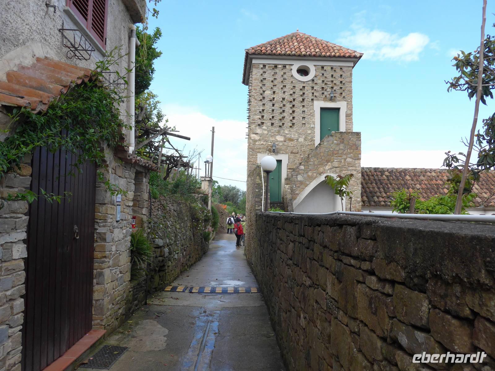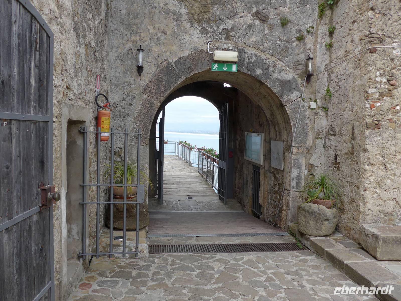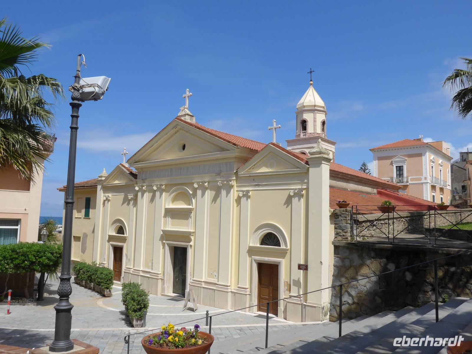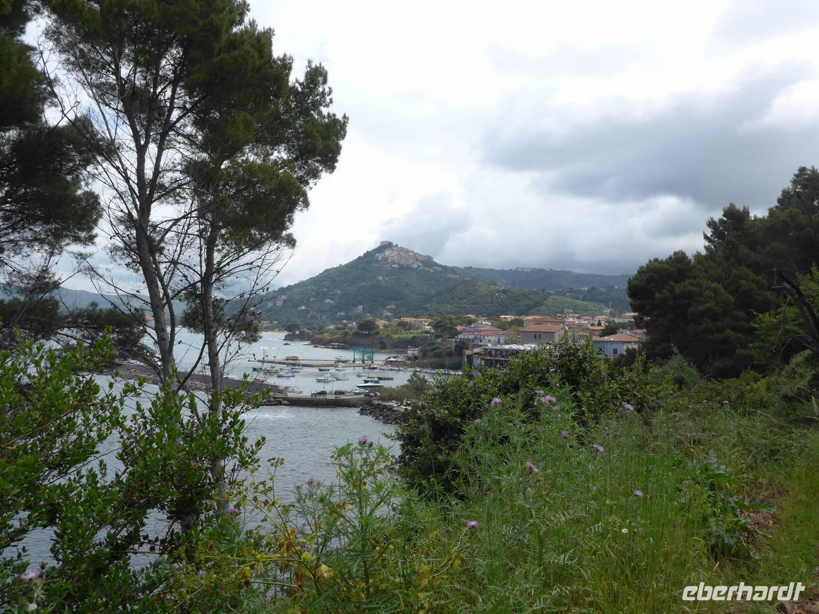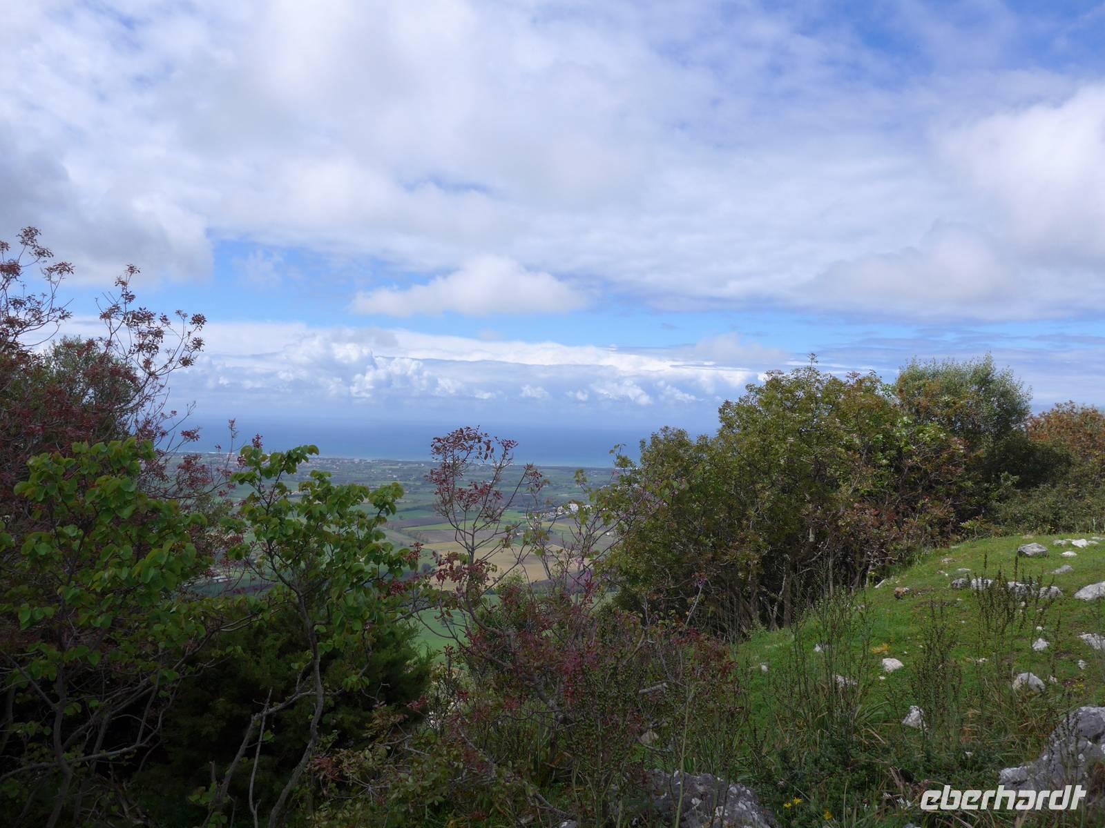 Nach einem ausgiebigen Frühstück starteten wir zum ersten Ausflug und machten gleich Stopp am Supermarkt, um Wasser einzukaufen. Auf der uns schon bekannten Strecke fuhren wir nach Paestum und hinauf zur Wallfahrtskirche der Madonna mit dem Granatapfel. Wir genossen den herrlichen Ausblick hinunter in die Sele-Ebene und begannen unsere Wanderung zunächst auf ebenem Weg und dann steil hinauf zur Festung von Friedrich II. Gäste mit guten Wanderschuhen waren klar im Vorteil und meisterten den Anstieg problemlos. Unterwegs zeigte uns Ursula viele Pflanzen und wir genossen immer wieder die tolle Aussicht. Das letzte Stück war weglos und bedurfte der ganzen Aufmerksamkeit. Oben wurden wir aber mit unvergeßlichen Ausblicken belohnt. Nach kurzem Aufenthalt stiegen wir auf gleichem Weg wieder ab und trafen uns an der Kirche, die wir anschließend besichtigten. Wir waren überrascht vom stark abfallenden Fußboden in der Kirche. Dann ging es hinunter in die Sele-Ebene zur Mittagspause in der Wasserbüffelfarm Barlotti in Capaccio. Wir probierten die Produkte aus Büffelmilch. Mit der Haltung der Wasserbüffel und vor allem der "Aufbewahrung" der Babys konnten wir nicht einverstanden sein und empfehlen Eberhardt Travel, künftig eine andere Farm aufzusuchen. Den Nachmittag verbrachten wir in Agropoli und spazierten durch die Stadt hinauf in die Altstadt und auf die Festung. Vom höchsten Punkt hatte man eine tolle Aussicht auf die Küste und die Berge des Cilento. Zurück in Pioppi spazierten wir gemeinsam durch den Ort und erkundeten die Geschäfte.