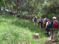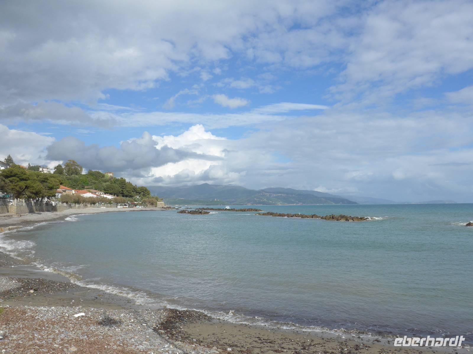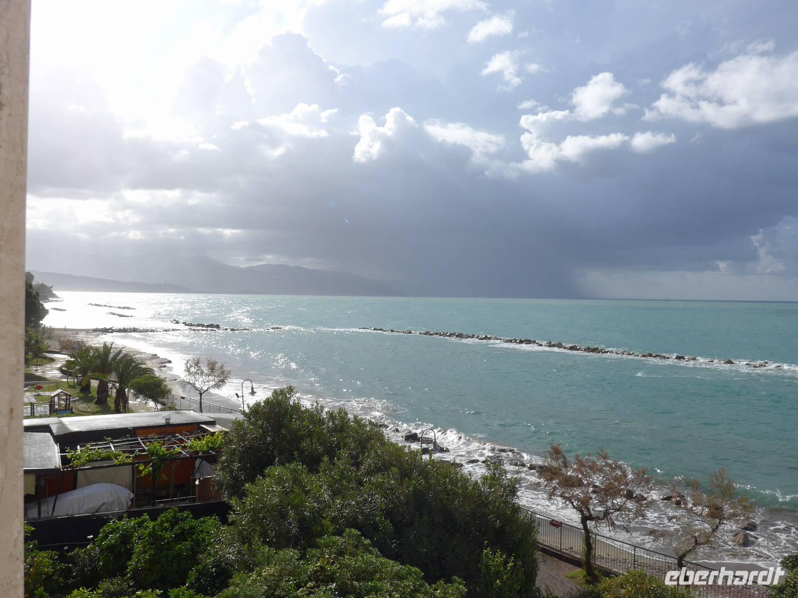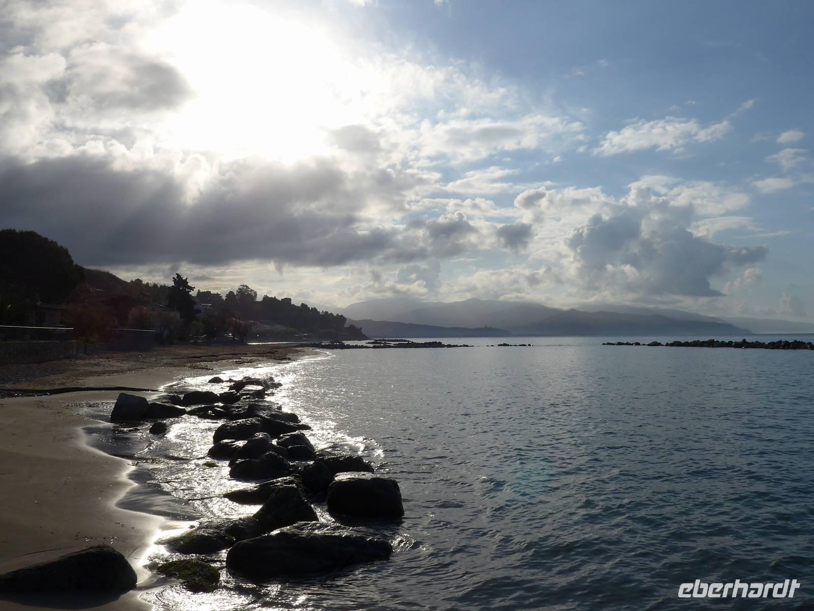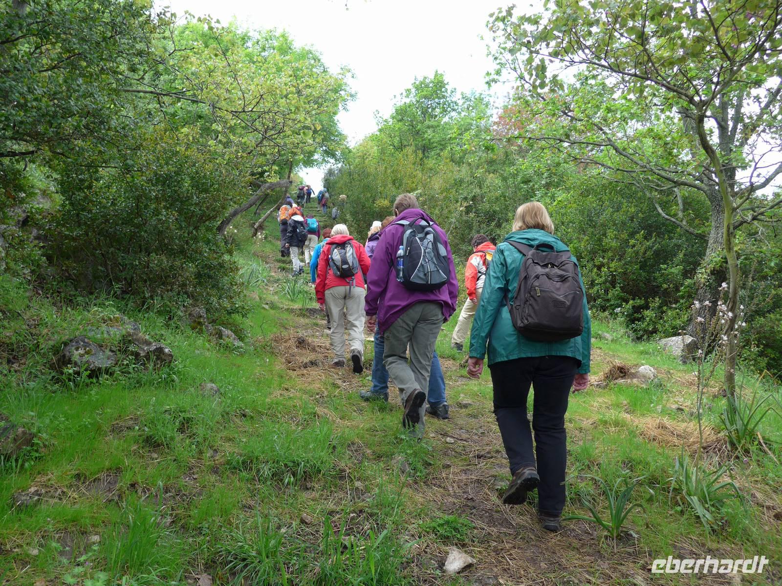 Am Morgen wurden wir von einem starken Gewitter geweckt und auch nach dem Frühstück gewitterte es wieder. So warteten wir ein wenig im Hotelgarten und starteten dann unsere Wanderung auf der Uferpromenade bis zum Ortende und bergan durch Macchia und Ginster. Die Wege waren schlammig und ausgewaschen vom vielen Regen. Ursula zeigte uns wieder viele Pflanzen. Oben in der Sonne hatten wir eine fantastischen Blick auf Pioppi, die Küste und die Berge im Hinterland. Wir machten ein erstes Gruppenfoto. Der weitere Weg war von kurzen Schauern geprägt, aber dann begann starker Regen. Ursula rief unseren Bus und informierte Umberto im Hotel. Unser Picknick unter alten Olivenbäumen konnte nicht stattfinden und so fuhren wir mit dem Bus zurück ins Hotel, wechselten die Kleidung und trafen uns 13.30 Uhr im Hotel zum "Picknick". Zum Aufwärmen gab es heiße Zitrone und Umberto verwöhnte uns mit Spaghetti Alioli, Parmicana di Melanzane, Frittata di Cibolla und Wein. Es schmeckte alles vorzüglich ! Inzwischen hatte der Regen aufgehört und es schien wieder die Sonne. Das Hotelpersonal säuberte die Stühle und Tische im Garten und so konnten wir den Kaffee und Tee im Freien in der Sonne genießen. Am Nachmittag gingen wir gemeinsam zur Ölpresse und Tonino erzählte uns alles über die Olivenernte und -verarbeitung. Auch durften wir das Olivenöl probieren. Danach genossen wir die Sonne am Strand, badeten oder tranken etwas.