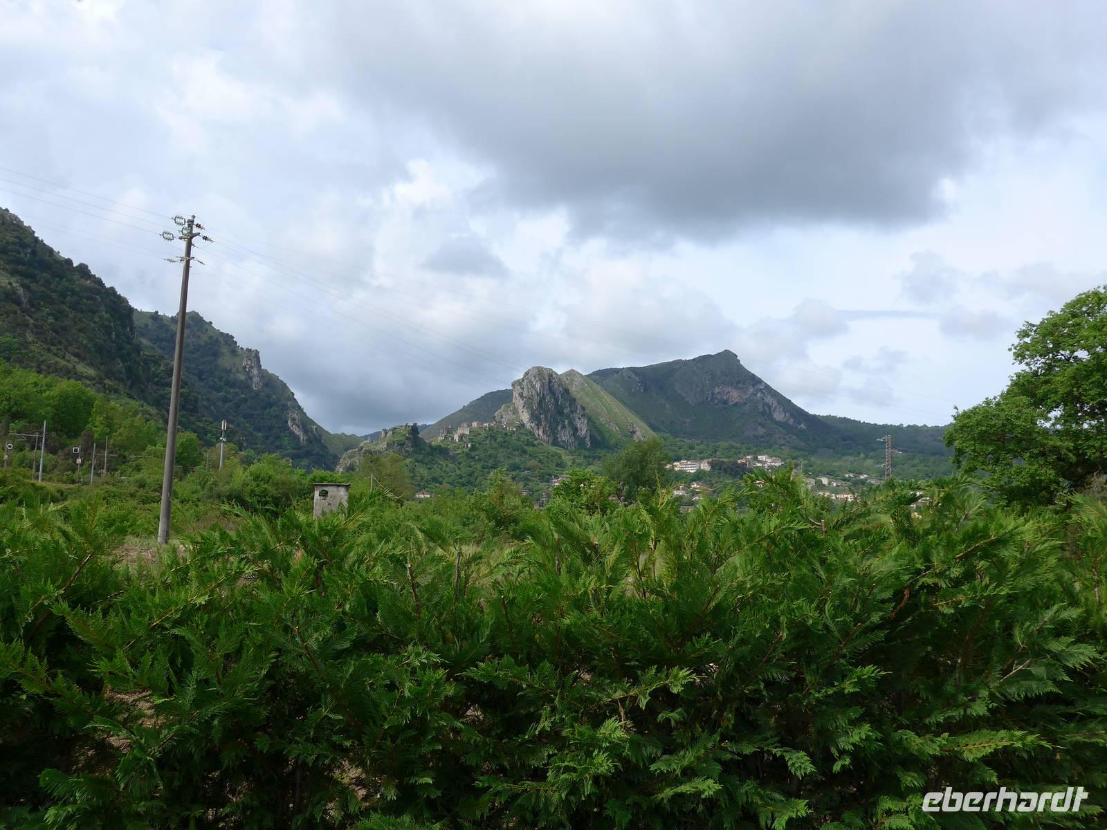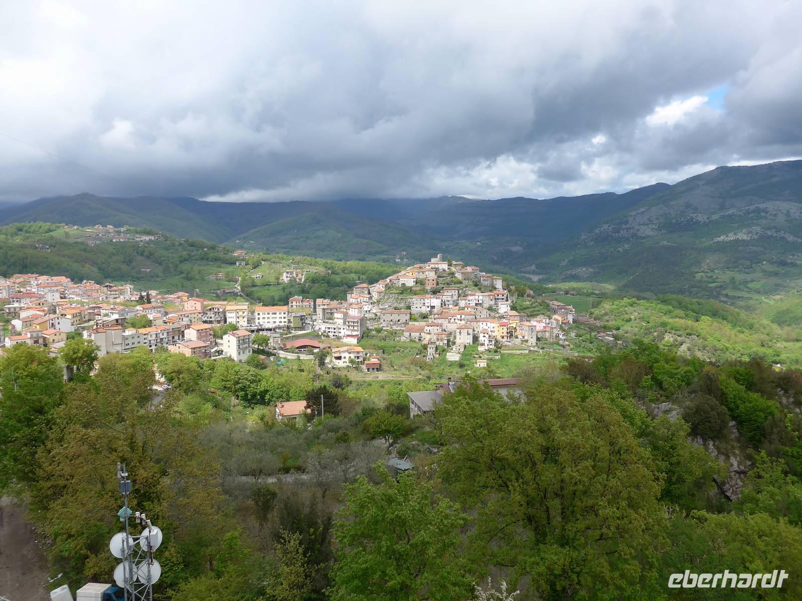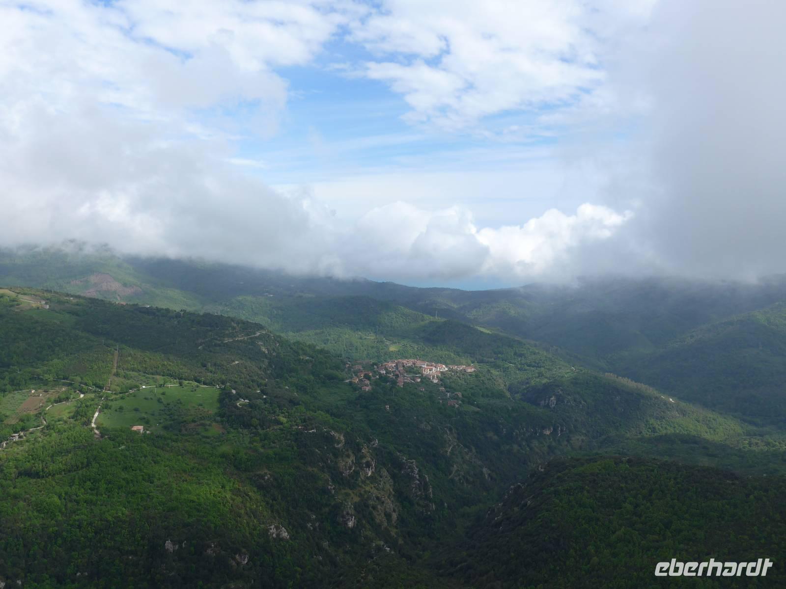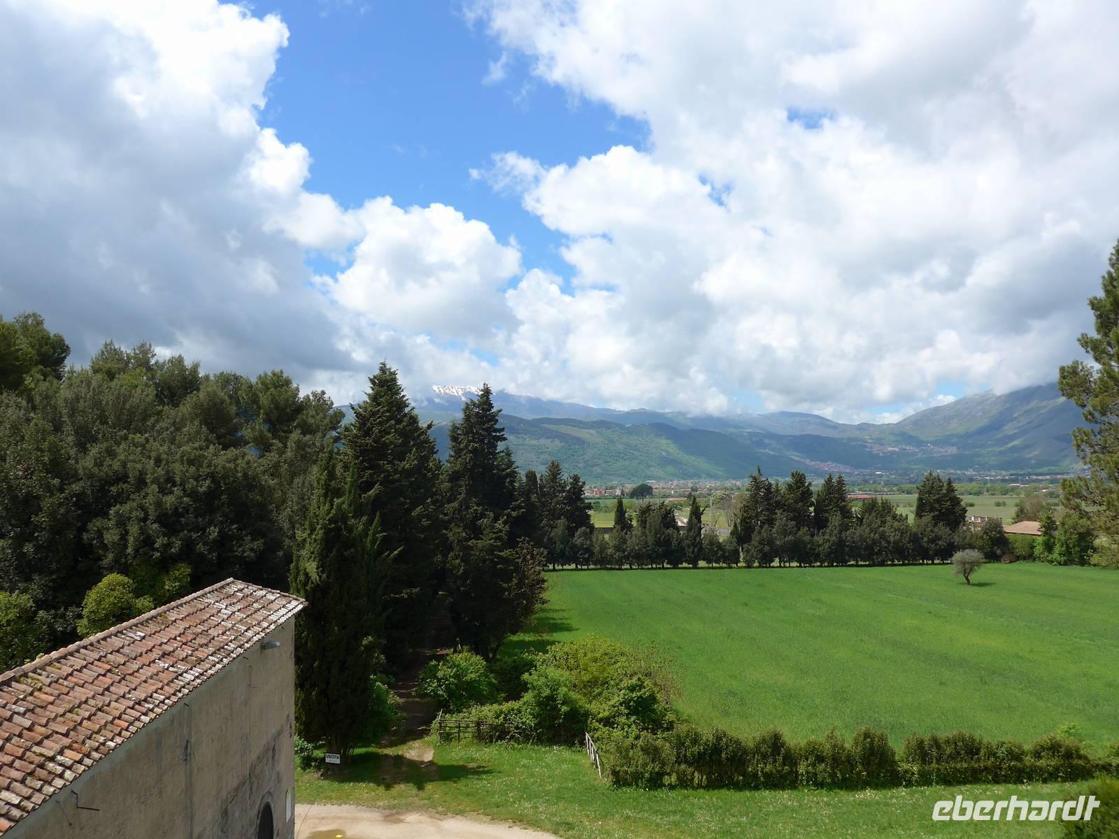 Vor unserer Abfahrt besuchten wir kurz den Fischladen gegenüber unserem Hotes. 1-2mal am Tag liefern die Fischer des Ortes frischen Fisch und was nicht verkauft wird, geht auf den Großmarkt nach Salerno. Unsere Fahrt nach Padula führte bei starkem Regen über die Schnellstrasse bis nach Sapri und weiter im Dianotal nach Padula. Dort war schon viel los als wir ankamen, weil am 1.Mai der Eintritt in die Kartause frei war. Nach kurzer Wartezeit durften wir hinein und Ursula machte mit uns eine ausführliche 2-stündige Führung. Der riesige Gebäudekomplex war beeindruckend, obwohl nur 24 Mönche dort wohnen konnten. Die Unterkünfte der Mönche bestanden aus mehrern Zimmern und einem Garten. Nur Sonntags durften sie 4 Stunden miteinander sprechen. Das Kloster hatte viele berühmte Persönlichkeiten als Gäste aufgenommen. Nach der Führung schien wieder die Sonne und wir konnten die schneebedeckten höchsten Berge um den Monto Sacro sehen. Danach machten wir unsere Mittagspause in einer Pizzeria mit einheimischer Wurst und Käse sowie 2 Pizzastücken. Bei Sonnenschein fuhren wir durch das Dianotal zurück nach Caselle in Pittari und wanderten auf einem alten Pilgerweg über Treppen steil hinauf zur Grotte des heiligen Michele. Wir müßten den Weg mit den dort weidenden Kühen teilen. Schon unterwegs und oben an der Grotte hatten wir tolle Ausblicke ins Tal und auf die Gipfel des Cilento. Zurück in Caselle di Pittari nahmen wir noch einen Kaffee und trafen unsere Gäste, die im Städtchen geblieben waren. Auf gleicher Strecke fuhren wir zurück ins Hotel. Zum Abendessen verwöhnte uns Umberto mit Lasagne und 4 verschiedenen Pizzen.