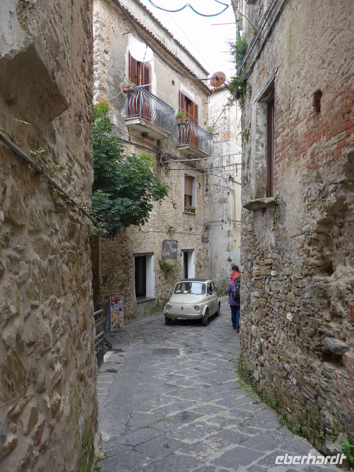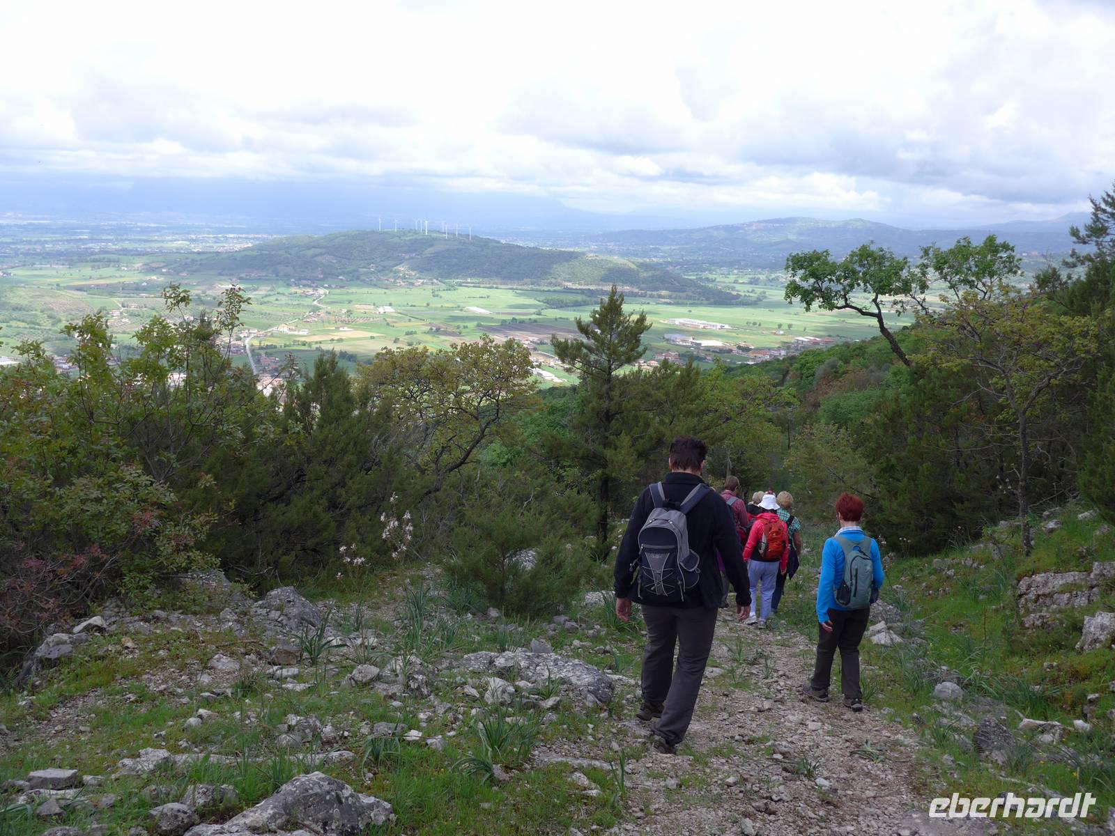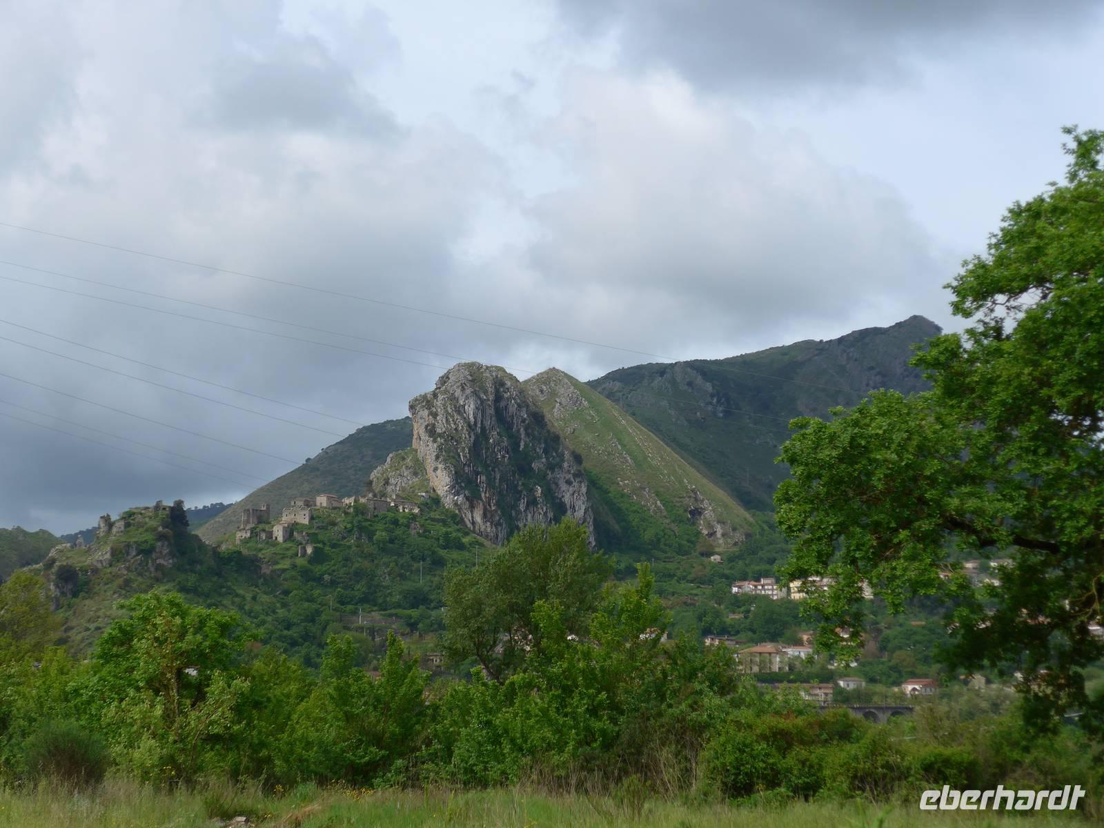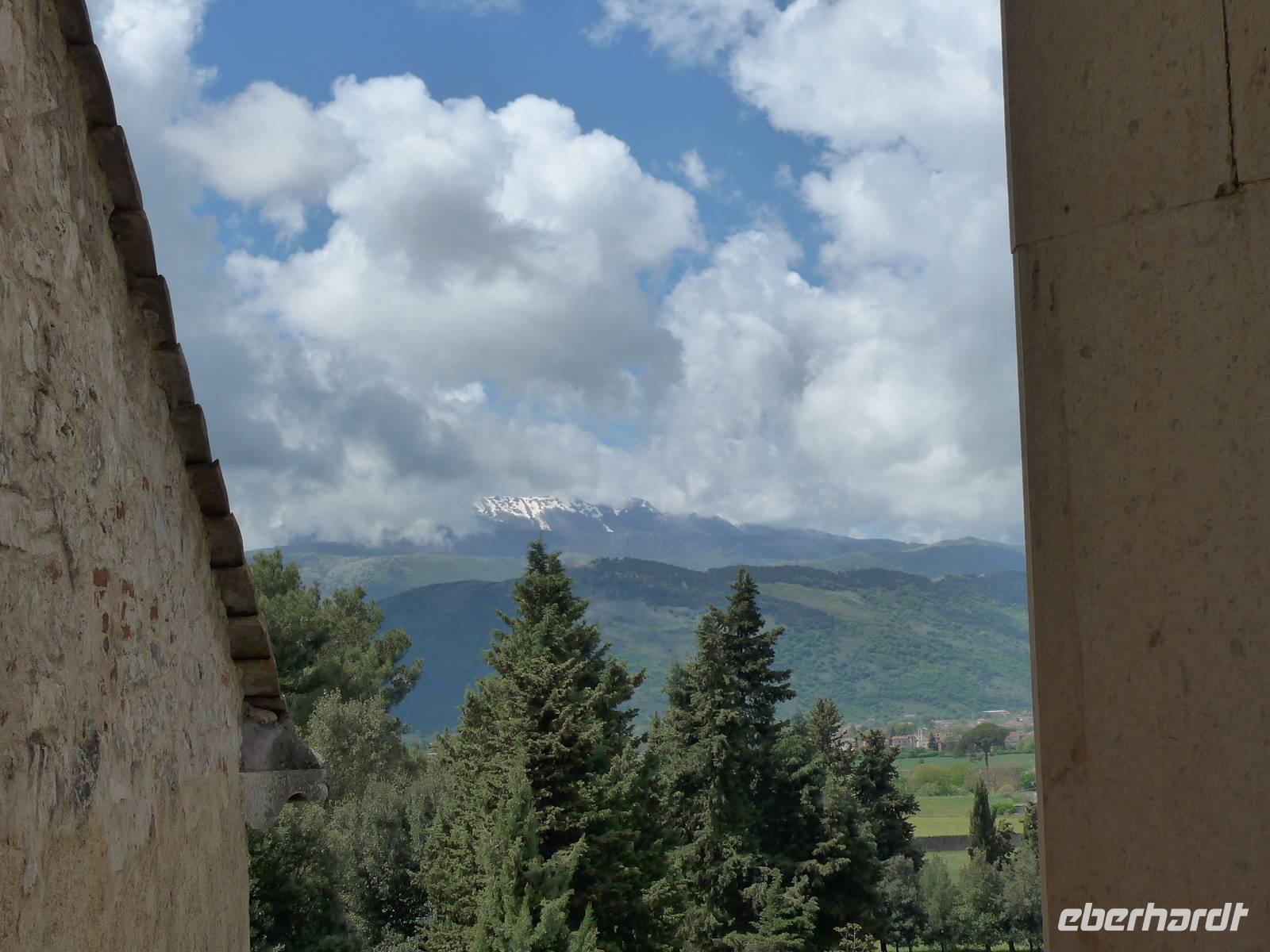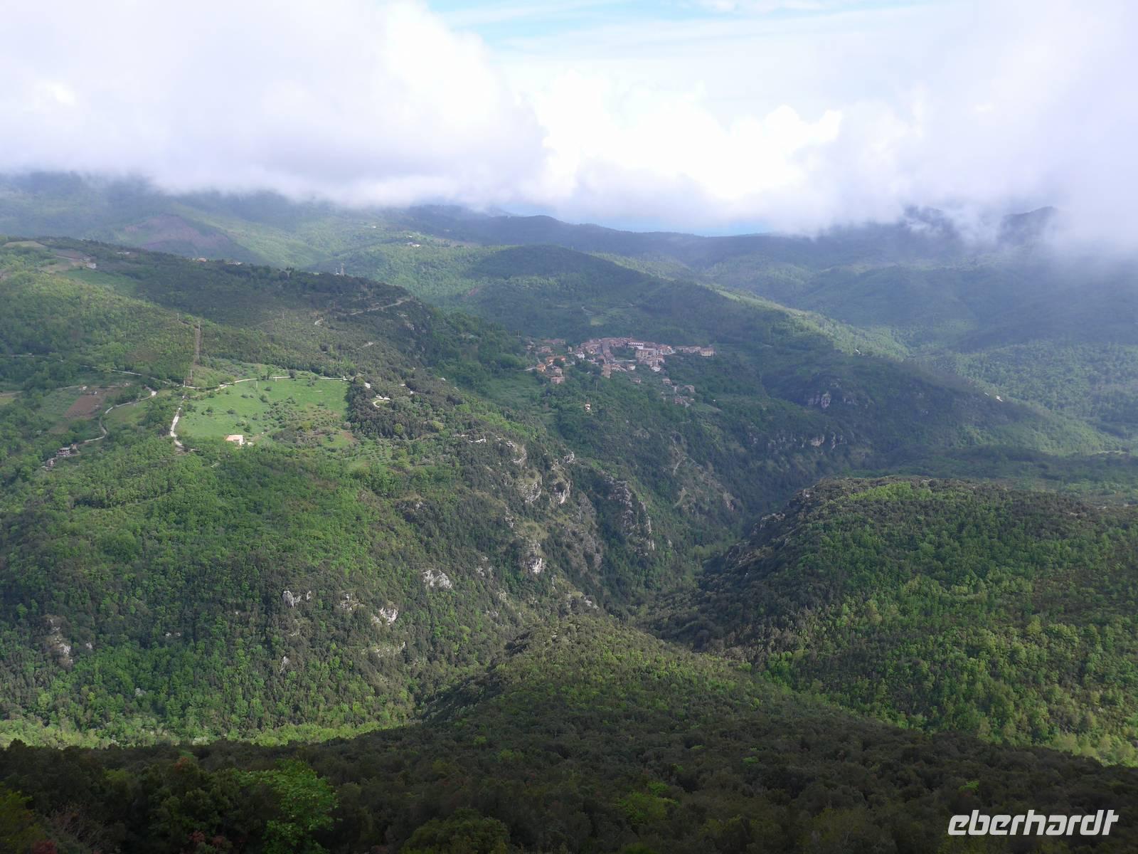 Vor unserer Abfahrt besuchten wir kurz den Fischladen gegenüber unserem Hotes. 1-2mal am Tag liefern die Fischer des Ortes frischen Fisch und was nicht verkauft wird, geht auf den Großmarkt nach Salerno. Unsere Fahrt nach Padula führte bei starkem Regen über die Schnellstrasse bis nach Sapri und weiter im Dianotal nach Padula. Dort war schon viel los als wir ankamen, weil am 1.Mai der Eintritt in die Kartause frei war. Nach kurzer Wartezeit durften wir hinein und Ursula machte mit uns eine ausführliche 2-stündige Führung. Der riesige Gebäudekomplex war beeindruckend, obwohl nur 24 Mönche dort wohnen konnten. Die Unterkünfte der Mönche bestanden aus mehrern Zimmern und einem Garten. Nur Sonntags durften sie 4 Stunden miteinander sprechen. Das Kloster hatte viele berühmte Persönlichkeiten als Gäste aufgenommen. Nach der Führung schien wieder die Sonne und wir konnten die schneebedeckten höchsten Berge um den Monto Sacro sehen. Danach machten wir unsere Mittagspause in einer Pizzeria mit einheimischer Wurst und Käse sowie 2 Pizzastücken. Bei Sonnenschein fuhren wir durch das Dianotal zurück nach Caselle in Pittari und wanderten auf einem alten Pilgerweg über Treppen steil hinauf zur Grotte des heiligen Michele. Wir müßten den Weg mit den dort weidenden Kühen teilen. Schon unterwegs und oben an der Grotte hatten wir tolle Ausblicke ins Tal und auf die Gipfel des Cilento. Zurück in Caselle di Pittari nahmen wir noch einen Kaffee und trafen unsere Gäste, die im Städtchen geblieben waren. Auf gleicher Strecke fuhren wir zurück ins Hotel. Zum Abendessen verwöhnte uns Umberto mit Lasagne und 4 verschiedenen Pizzen.