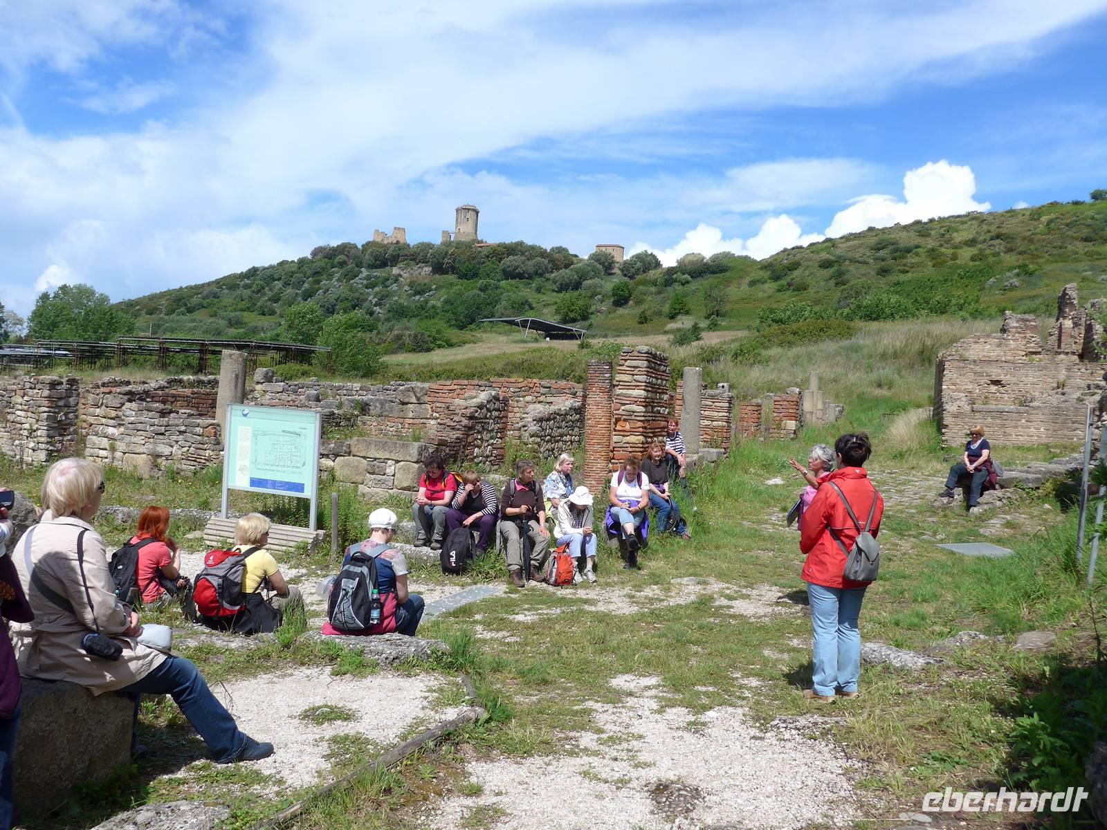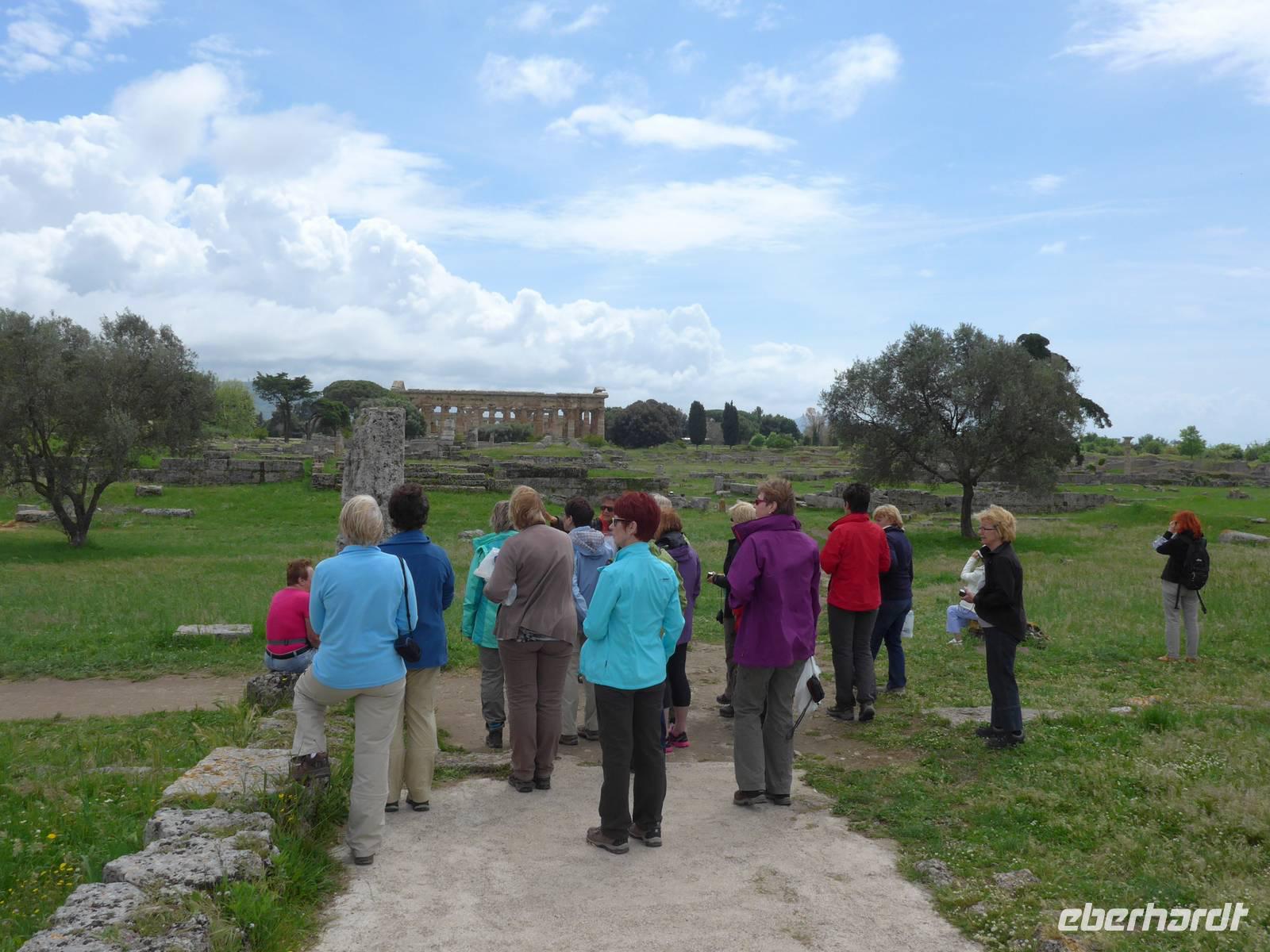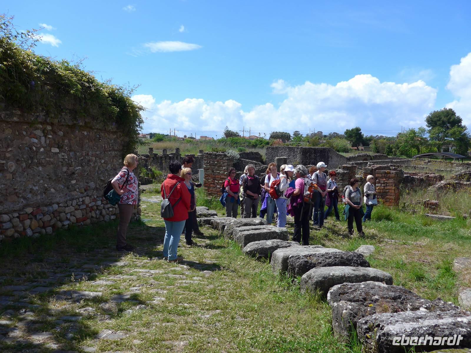 Unser Ausflug ganz in der Nähe begann mit dem Besuch einer Käserei. Wir sahen wie die Milch der Wasserbüffel zu Mozarella wird und durften diese auch probieren. Danach fuhren wir nach Velia und Ursula führte uns 2 Stunden durch die griechische und römische Stadt. Sie wurde sehr spät erst 1888 beim Bau der Eisebahn als ein Tunnel gebort werden mußte entdeckt und danach ausgegraben. Vieles liegt noch unentdeckt unter der Erde. Die Gebäudeteile des Hafentores, der Thermen, der Porta Rosa und der Akropolis lassen aber auf das sehr fortschrittliche Leben in der Antike schließen. Wir spazierten hinauf zur Porta Rosa, machten dort ein Gruppenfoto und gingen weiter hinauf zur Akropolis. Dort oben gab es einen Limoncello und wir bedankten uns bei Ursula. Bei leichtem Regen gingen wir zurück zum Ausgang und fuhren ins Hotel. Dabei durchquerten wir das Mündungsgebiet des Alento.