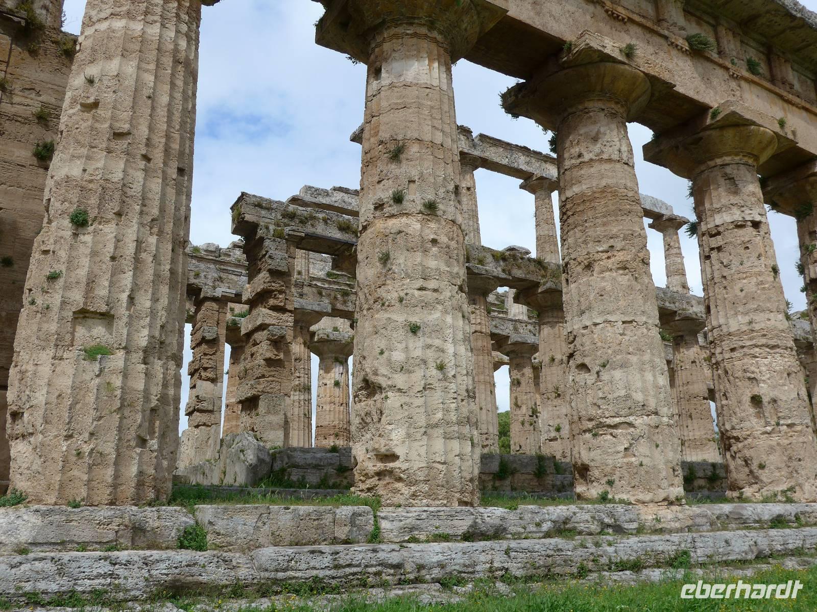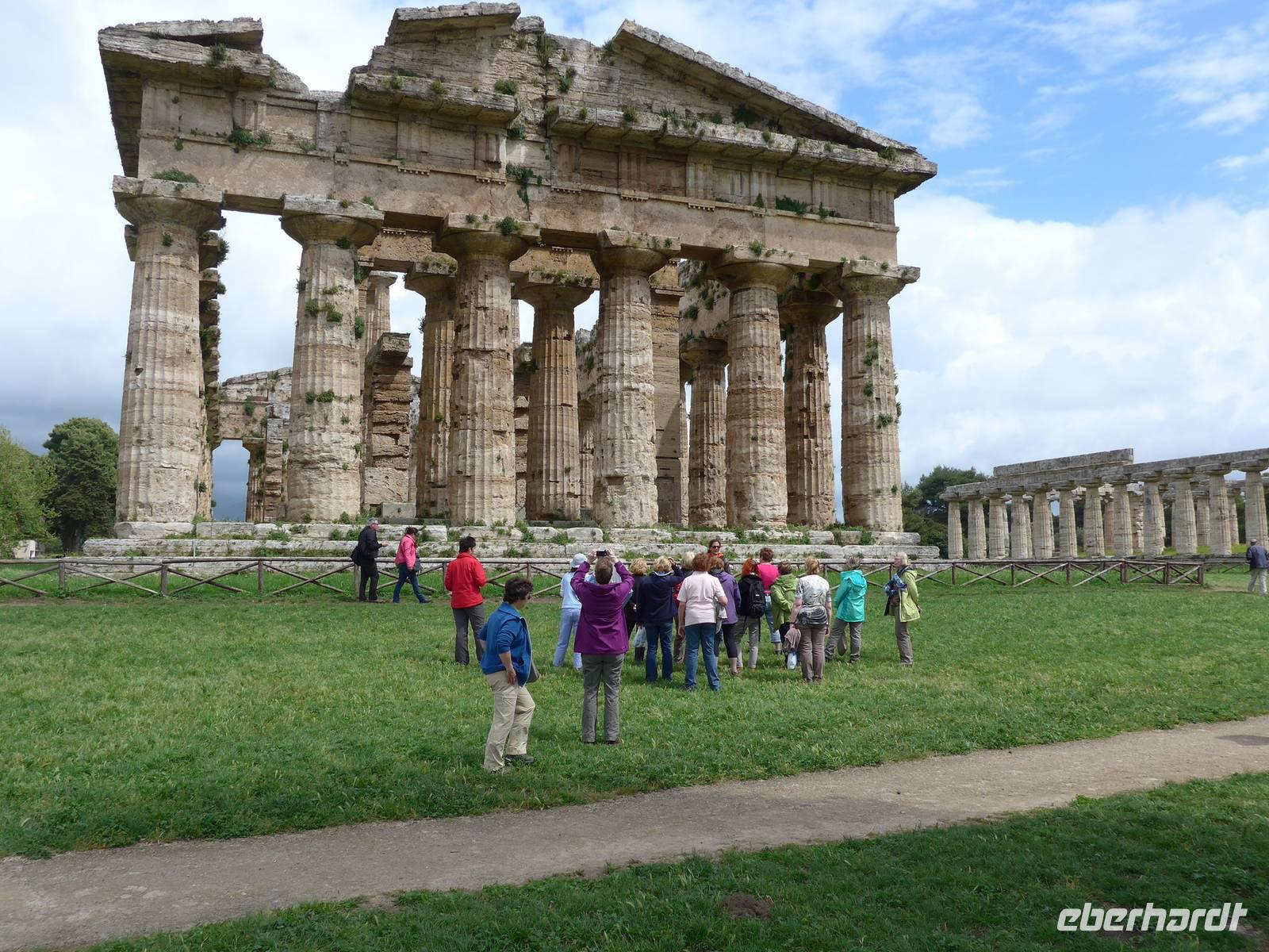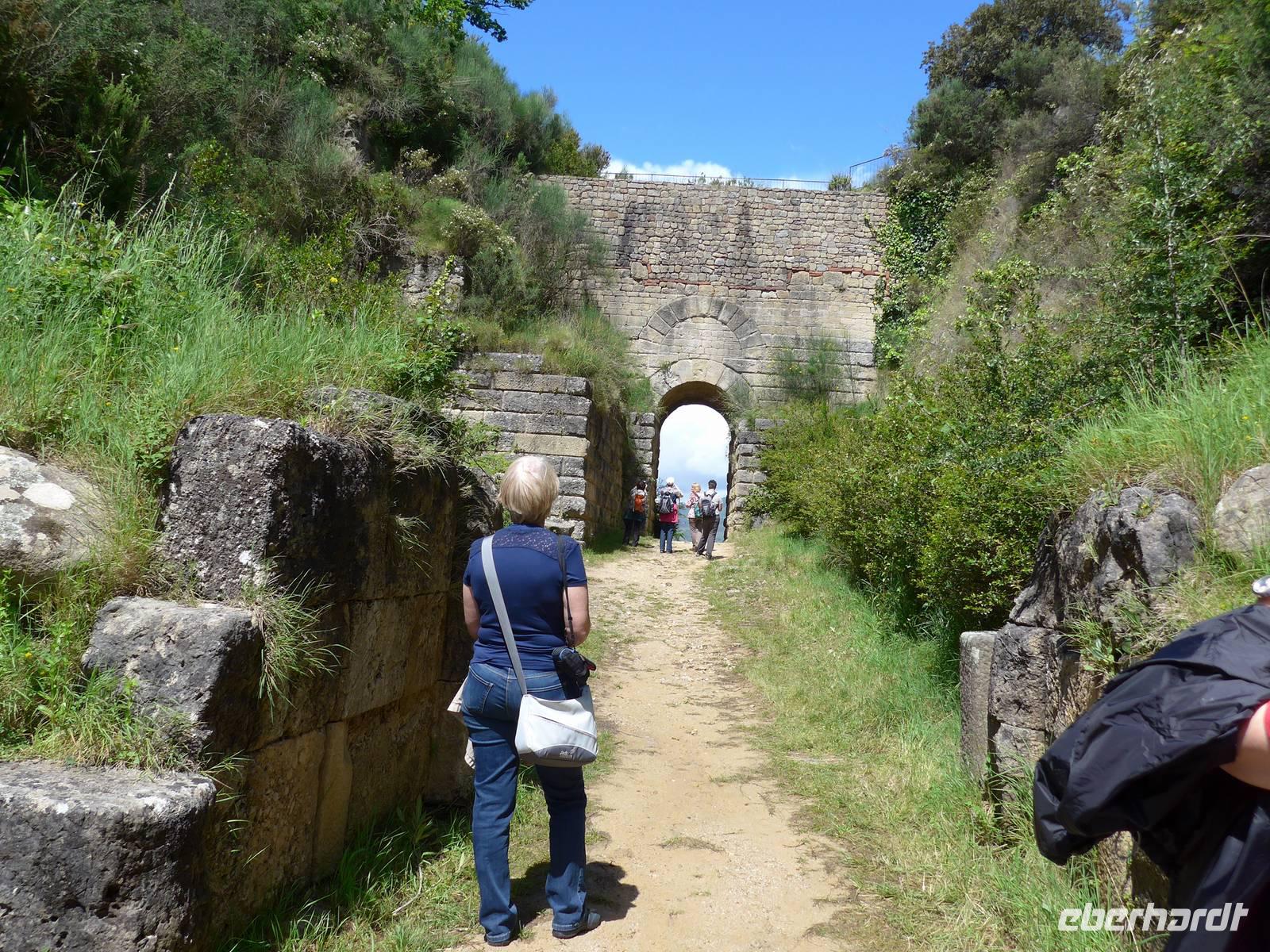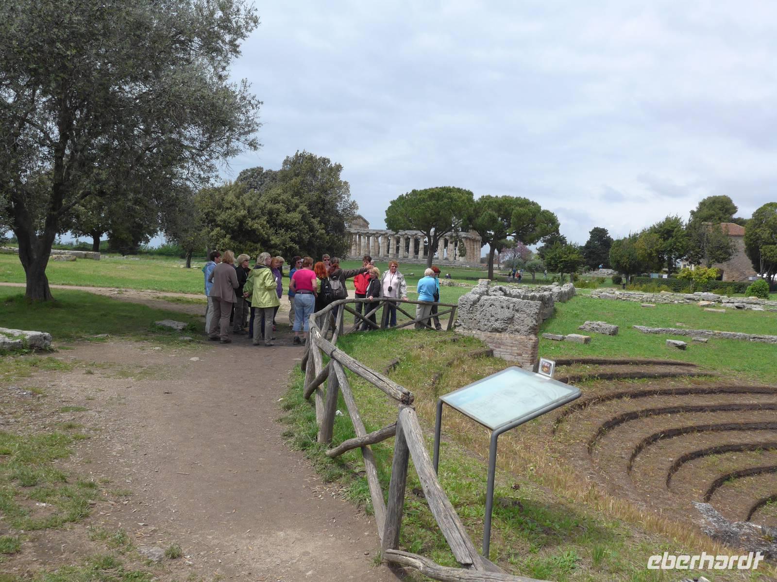 Unser Ausflug ganz in der Nähe begann mit dem Besuch einer Käserei. Wir sahen wie die Milch der Wasserbüffel zu Mozarella wird und durften diese auch probieren. Danach fuhren wir nach Velia und Ursula führte uns 2 Stunden durch die griechische und römische Stadt. Sie wurde sehr spät erst 1888 beim Bau der Eisebahn als ein Tunnel gebort werden mußte entdeckt und danach ausgegraben. Vieles liegt noch unentdeckt unter der Erde. Die Gebäudeteile des Hafentores, der Thermen, der Porta Rosa und der Akropolis lassen aber auf das sehr fortschrittliche Leben in der Antike schließen. Wir spazierten hinauf zur Porta Rosa, machten dort ein Gruppenfoto und gingen weiter hinauf zur Akropolis. Dort oben gab es einen Limoncello und wir bedankten uns bei Ursula. Bei leichtem Regen gingen wir zurück zum Ausgang und fuhren ins Hotel. Dabei durchquerten wir das Mündungsgebiet des Alento.