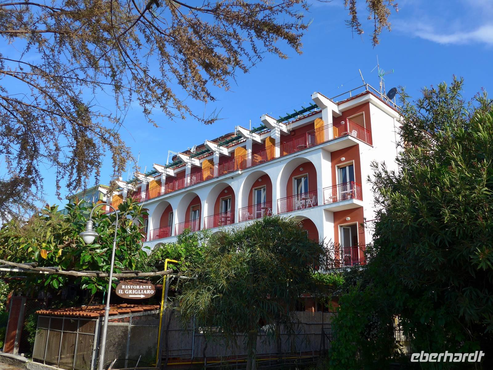 Nachdem die ersten Gäste schon kurz nach Mitternacht von zu Hause abgeholt wurden, um pünktlich 5.15 Uhr am Flughafen Berlin Tegel zu sein, gingen wir dann alle gemeinsam zum check in der Air Berlin im Terminal C. Alles verlief planmäßig, der Start, die Landung in Neapel und unser Zusammentreffen mit Ursula, unserer Reiseleiterin im Cilento. Ursula überraschte uns gleich mit einer Stadtrundfahrt durch Neapel und danach ging es auf der Autobahn mit unserem Busfahrer ANIELLO Richtung Süden. Bei Vietri verließen wir die Autobahn und fuhren nach Salerno zu einer einstündigen Mittagspause am Hafen. Auf der Weiterfahrt sahen wir das Fußballstadion mit vielen Fans und die herrliche Küste. Um 14.45 Uhr erreichten wir unser Hotel La Vela in Pioppi, verteilten die Zimmer und trafen uns 18 Uhr zu einer kurzen Vorstellungrunde in der Lobby des Hotels. Danach gab es ein Begrüßungsgetränk vom Hotel mit in Bierteig gebackenen Fischen und die Vorstellung des Personals. Wir besprachen das Programm für den nächsten Tag und entschieden aufgrund der unsicheren Wetterlage, das weitere Programm immer erst am Vortag festzulegen und die Programmtage zu tauschen. 19 Uhr nahmen wir unser erstes 4-Gang-Abendessen mit Wein und Wasser ein - der Beginn der Mittelmeerdiät!