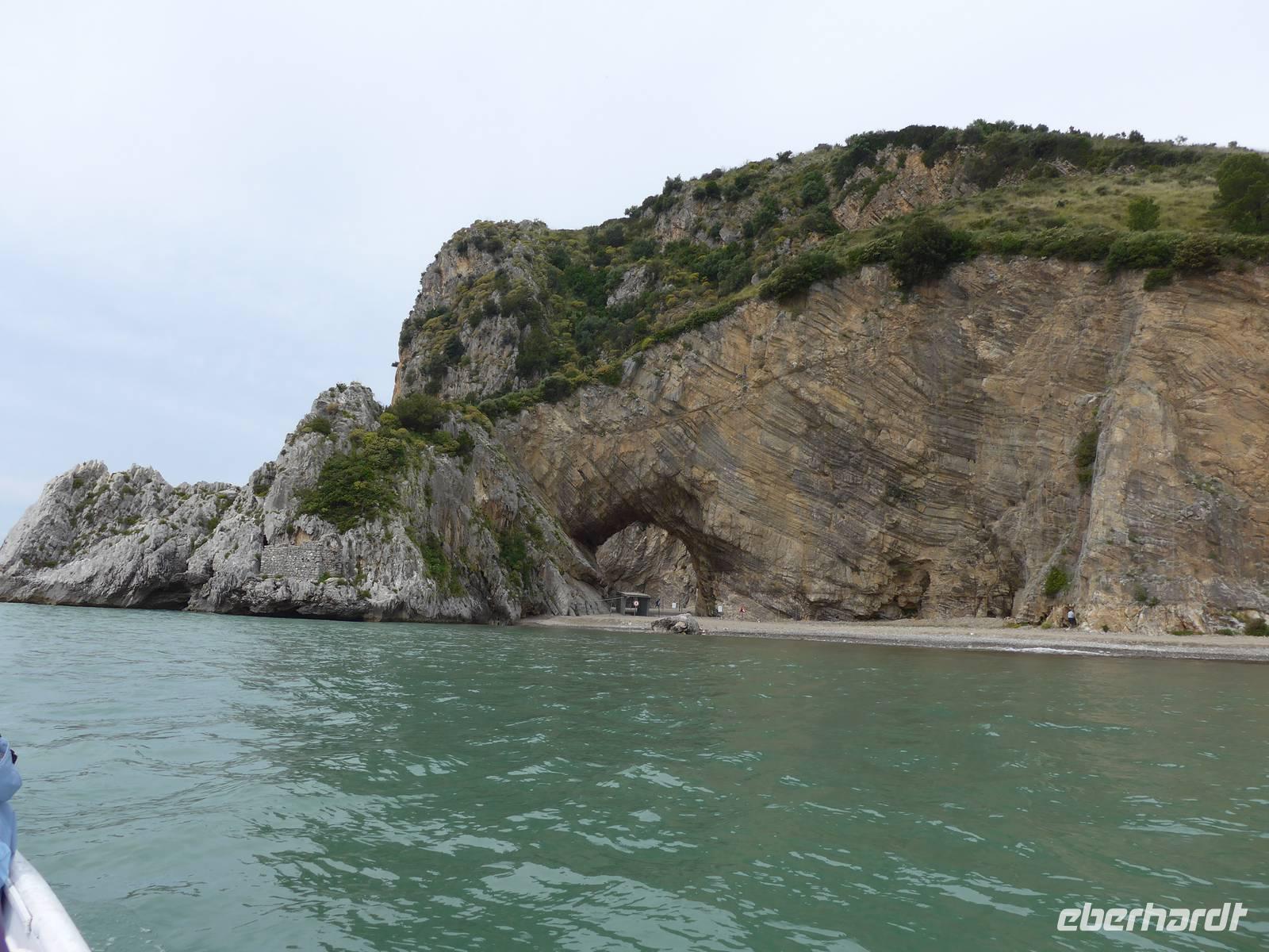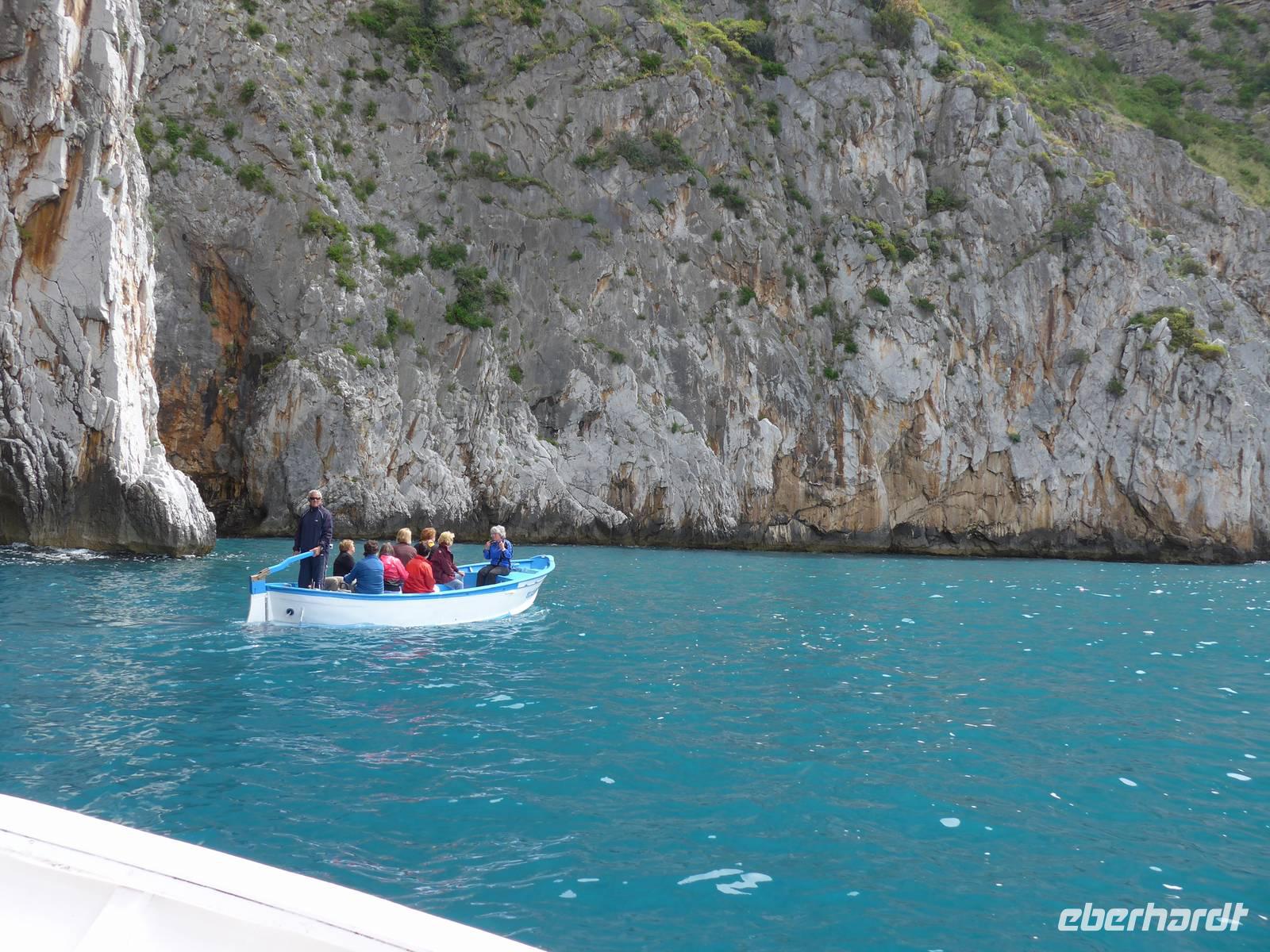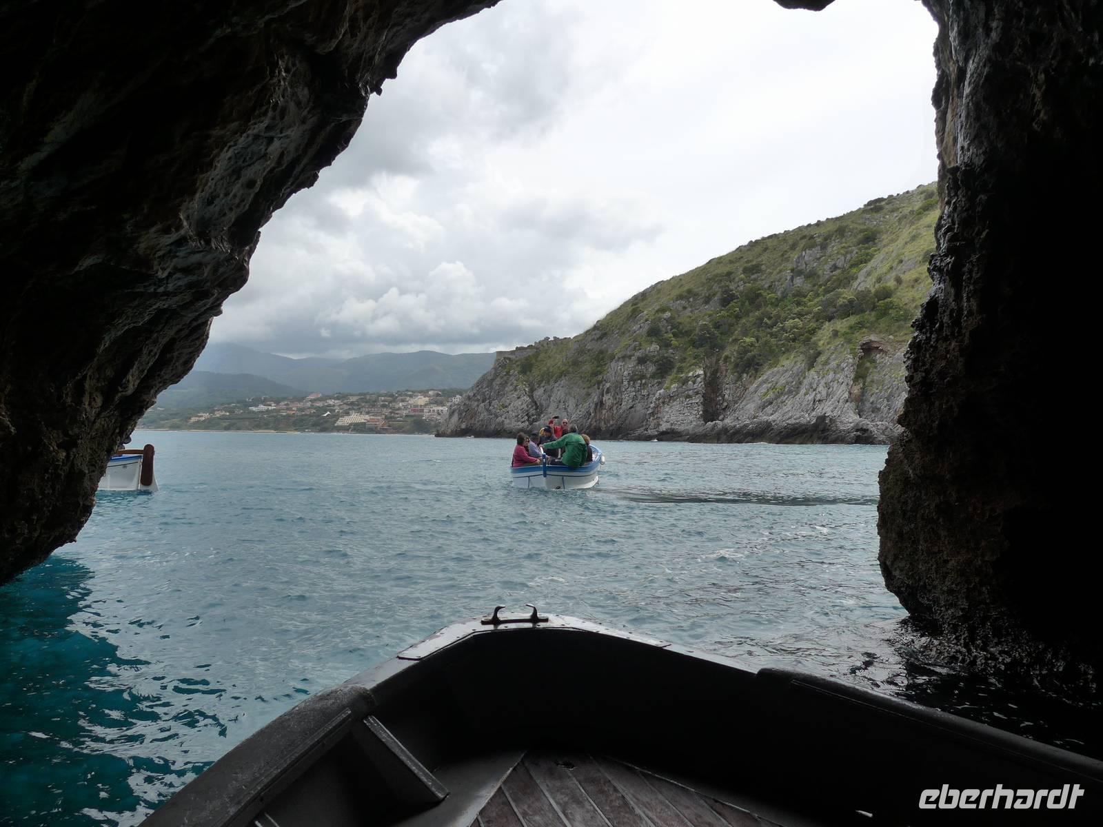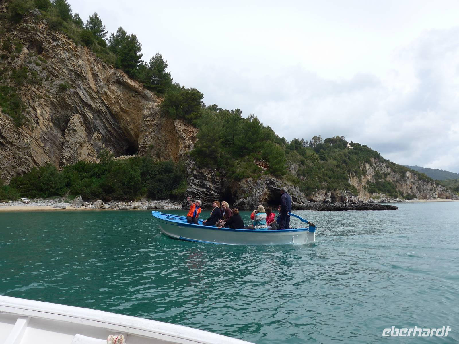 Nach kurzer Fahrt erreichten wir den Wochenmarkt im Nachbarort Casalvelino. Wir kauften ein und lernten die kleinen Händler aus der Region und deren Produkte kennen. Auf der Weiterfahrt nach Palinuro gab uns Ursula ihr Rezept für Limoncello und erzählte über die Geschichte der Pizza. Unterwegs im Mingardotal machten wir einen Halt, um die verlassene Stadt San Severino zu fotografieren. Bei Ankunft in Palinuro begannen wir gleich mit der Bootsfahrt um das Kap und zu den Grotten. Wir fuhren mit 2 kleinen Booten und konnten wegen des hohen Wasserstandes nur in die Blaue Grotte hineinfahren. In die Schwefelgrotte, Mönchsgrotte und Knochengrotte konnten wir nur hineinschauen. Vorbei am Kaninchenfelsen ging unsere Fahrt bis zum Arco Naturale und an der Küste wieder zurück nach Palinuro. Am Strand stärkten wir uns bei einem Picknick. Dann begann unsere Wanderung hinauf auf die Felsen am Kap Palinuro. Einige Gäste blieben unten am Strand. Von oben hatten wir wieder grandiose Ausblicke auf die Felsen am Kap, die wir schon vom Boot aus sahen und auf die gesamte Küste. Wir wanderten durch riesige Gräser und mußten uns den Weg wieder mit den Kühen teilen. Unterwegs sahen wir farbenfrohe Zistrosenwurzelwürker, Parasiten, die die Wurzeln der Zistrosen befallen, ihnen aber nicht schaden. Unten am Meer nahmen die Wanderer noch einen Kaffe und Eis und dann ging die Fahrt zurück nach Pioppi. Bei Sonnenschein badeten noch einige im Meer.