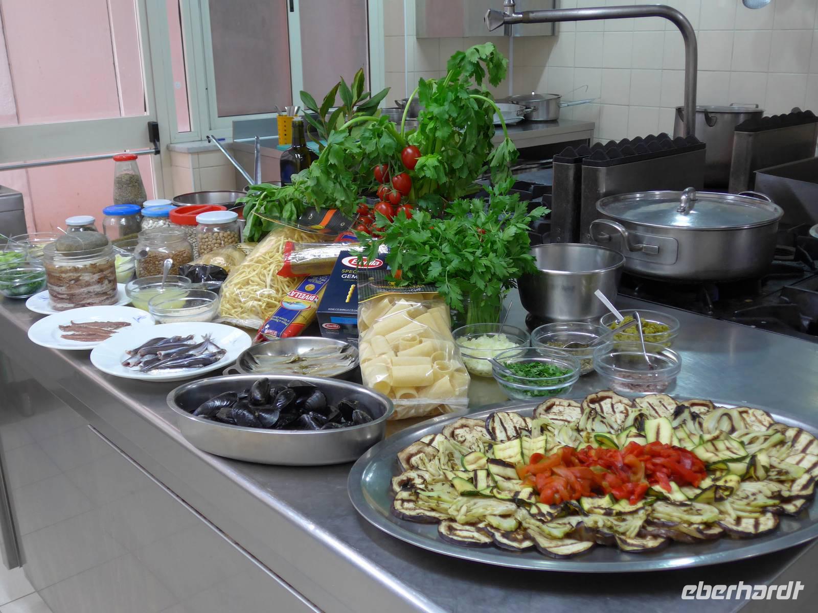 Danach nahmen wir Aufstellung um den großen Ofen herum und Umberto begann mit dem Kochen. Alle Gerichte wurden aufgeschrieben und wir erhielten die Rezepte am Abend. Das zubereitete Essen verspeisten wir in der Küche bei Wein und Wasser. Danach besuchten wir gemeinsam das Mittelmeermuseum im Palazzo Vinciprova. Bis zum Abendessen nutzten alle die Zeit zum Koffer packen, Bezahlen und zu einem letzten Spaziergang am Meer.