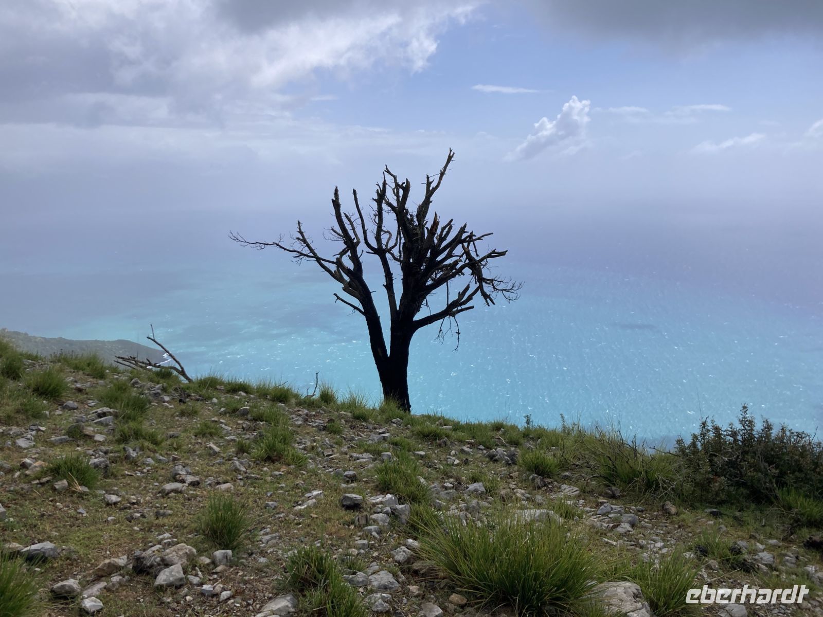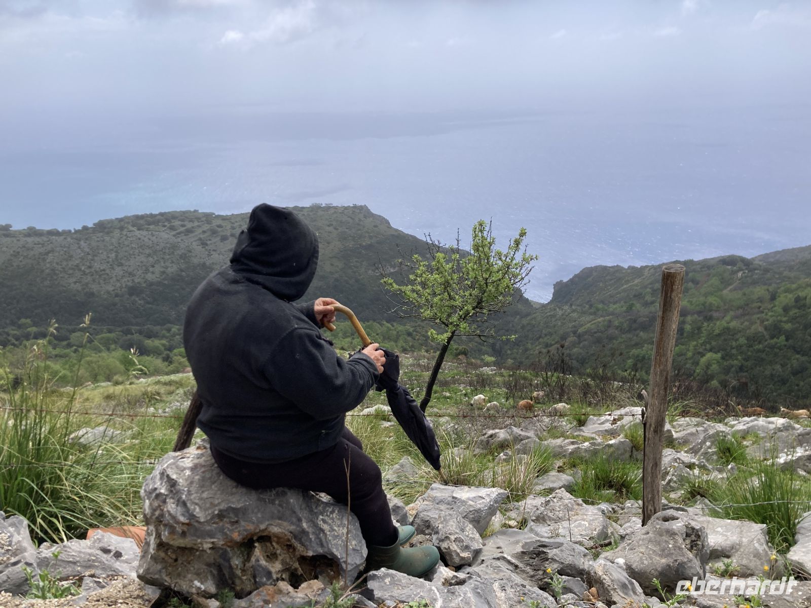 Und das Umplanen beginnt. Das Wetter ist zwar noch gut, allerdings ist der Wellengang so hoch, dass unser Boot zur Costa degli Infreschi nicht fahren kann. Also wandern wir eine schöne Alternativstrecke. Glücklicherweise haben wir mit Enzo einen echten Cilentano. Er ist ein wahres Füllhorn an Wanderstrecken. Wir laufen oberhalb der Küstenlinie und bestaunen das Wolkenspiel. Ein paar Tropfen schickt uns der Himmel auch noch noch. Wir begegnen Ziegen und Menschen, die sich um sie kümmern und mit der gewonnenen Milch für den guten Käse sorgen. Die Weite des Landes, das Licht und der Blick auf das Meer, ein Dreiklang, der den Cilento so sehenswert macht.