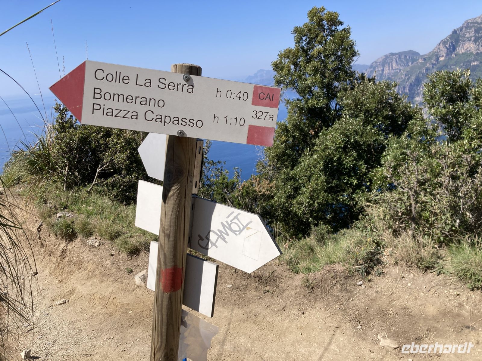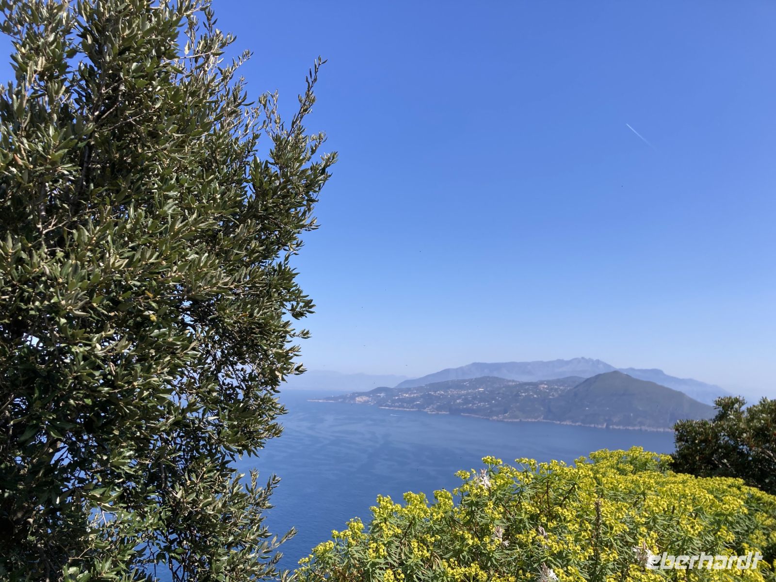 Ein bisschen Zeit dauert es schon, schließlich wollen 14 Einzelwünsche erfüllt werden und die Signora hinter der Theke nimmt sich Zeit, um alle individuellen Wünsche formvollendet zu erfüllen. Die Versorgung ist gesichert, auf geht es zur ersten Wanderung. Gemeinsam führt sie uns zur Punta Campanella. Mit einem Blick über den Golf von Neapel, stand hier ein Tempel zu Ehren der Minerva. Heute sehen wir nur noch einen Turm. Der Ausblick ist jedoch wunderbar.