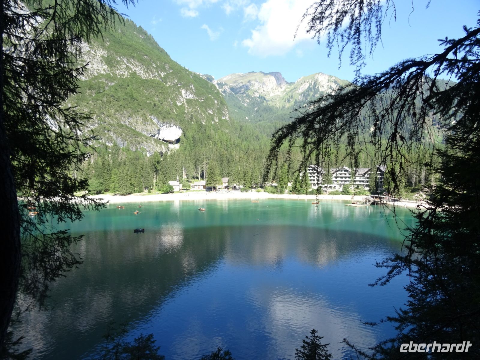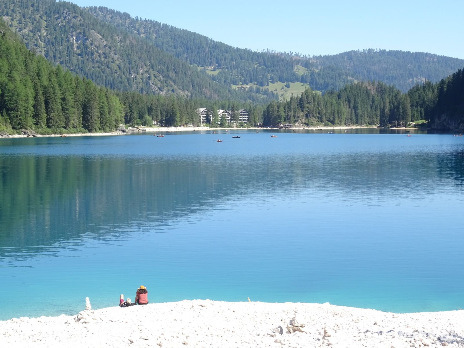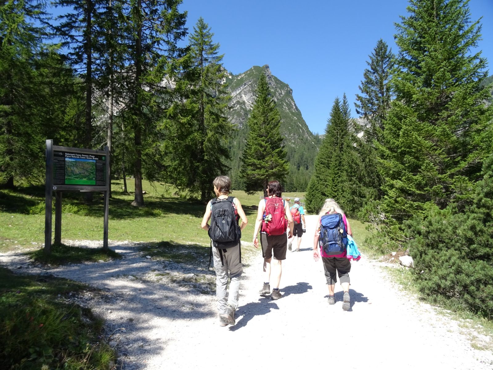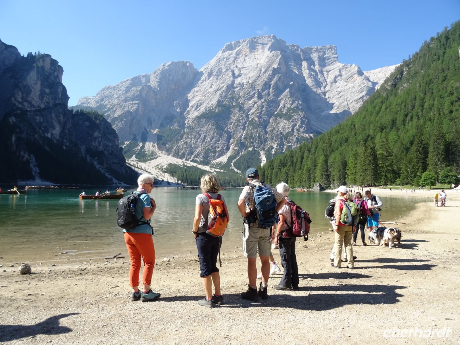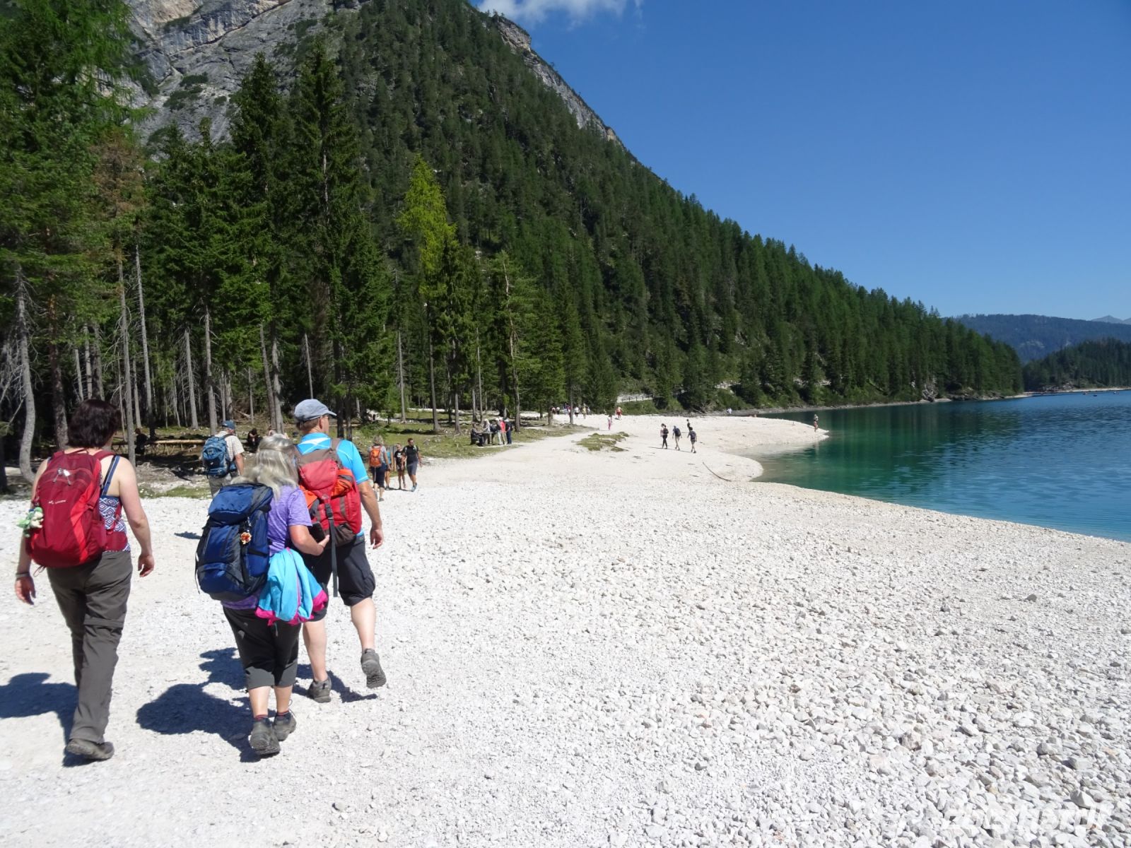 Nach einer großen „Mütze Schlaf“ und einem reichhaltigen Frühstück treffen wir nun endlich unsere Wanderleiterin Irmi und freuen uns endlich aktiv unterwegs zu sein. Unser Fahrer ist auch schon wieder startklar und so geht es mit unserem wendigen Reisebus zum romantischen Pragser Wildsee. Wir sind etwas angespannt, da wir sehr pünktlich am Eingang des Parkplatzes sein müssen auf Grund eines neuen, zeitlich begrenzten Parkprozederes. Aber da wir alle überpünktlich im Bus sitzen und Ricco mit seinem Bus auch gut durchkommt stehen wir zur rechten Zeit am richtigen Ort und können unsere erste Wanderung bei strahlenden Sonnenschein antreten. Unsere Irmi erklärt uns schon einiges zur Gegend und so saugen wir die Südtiroler Herzlichkeit förmlich auf.