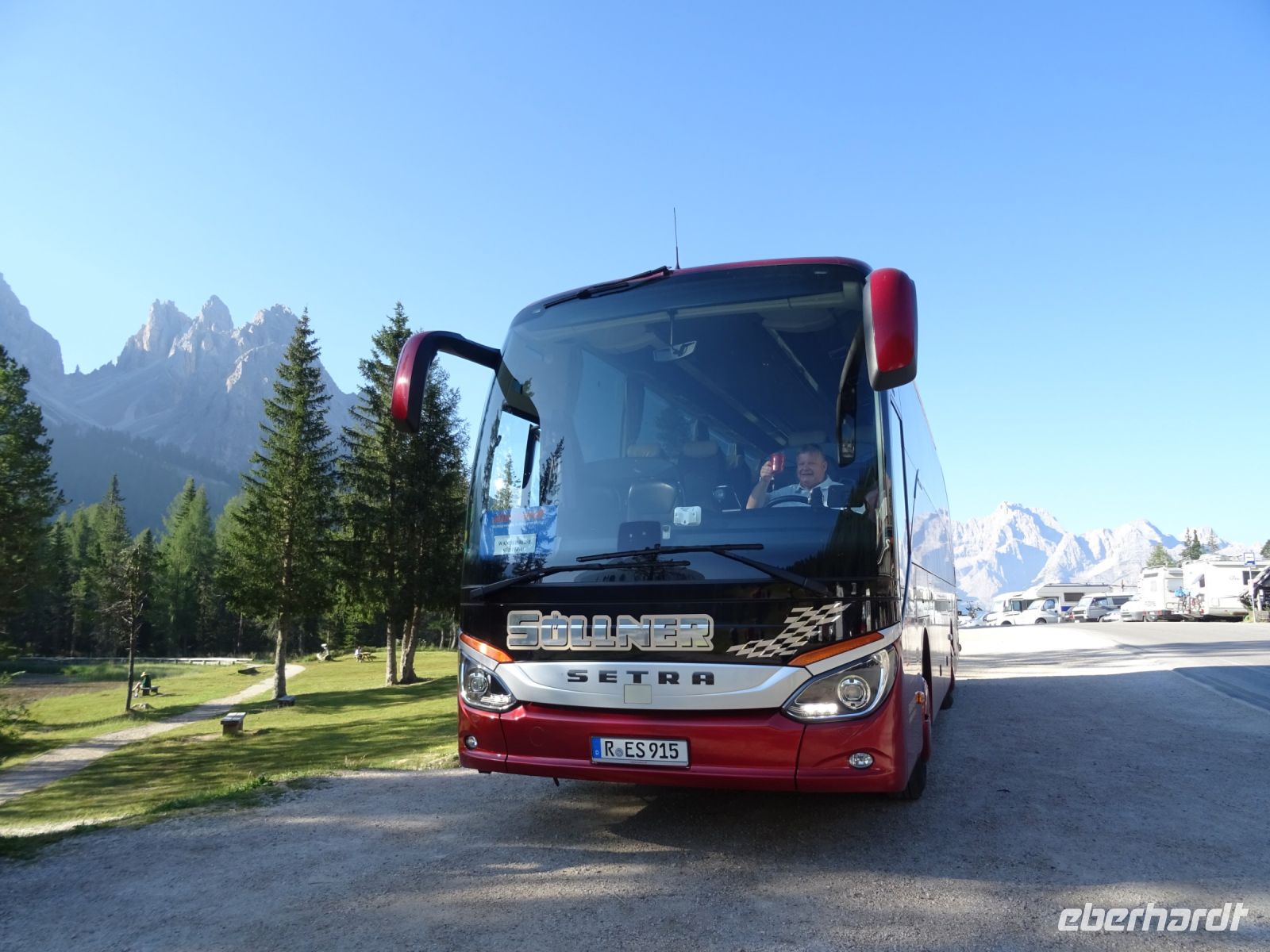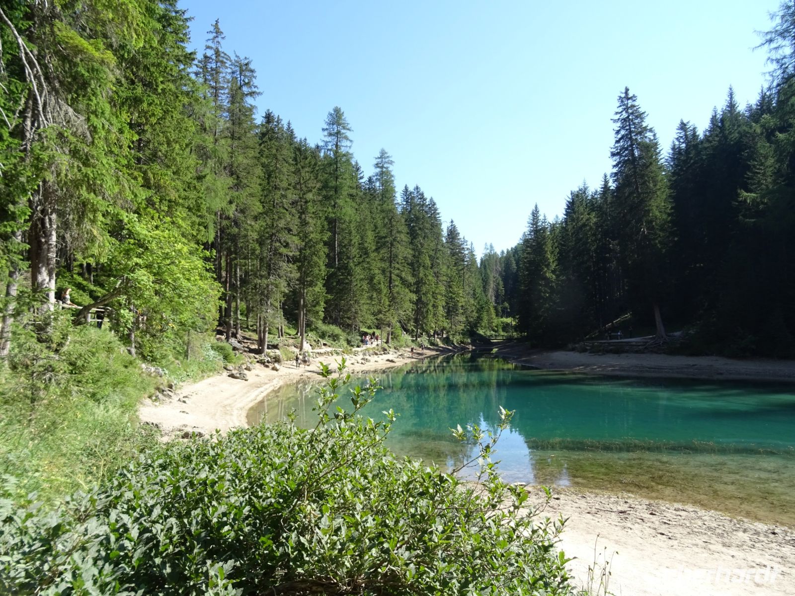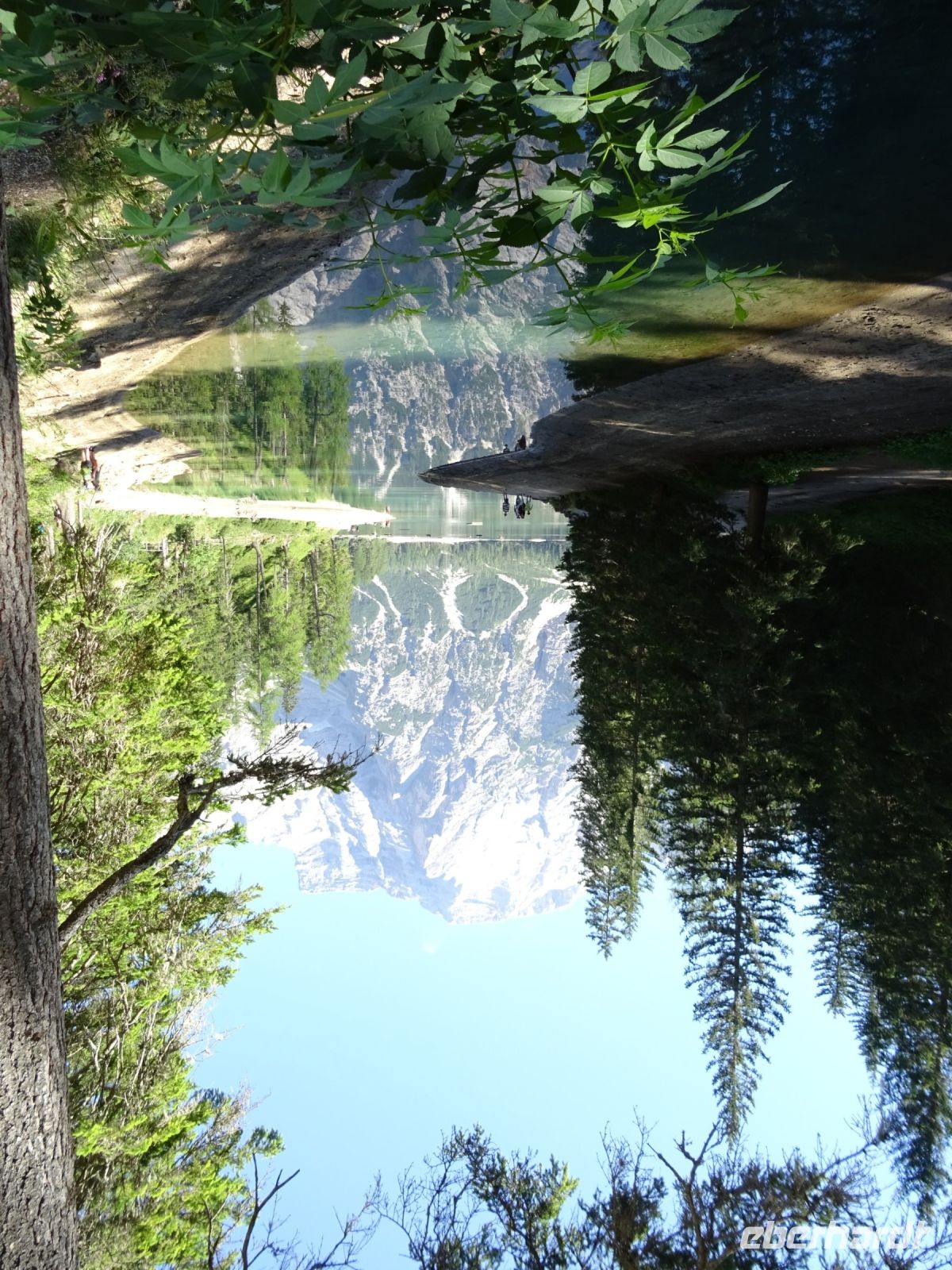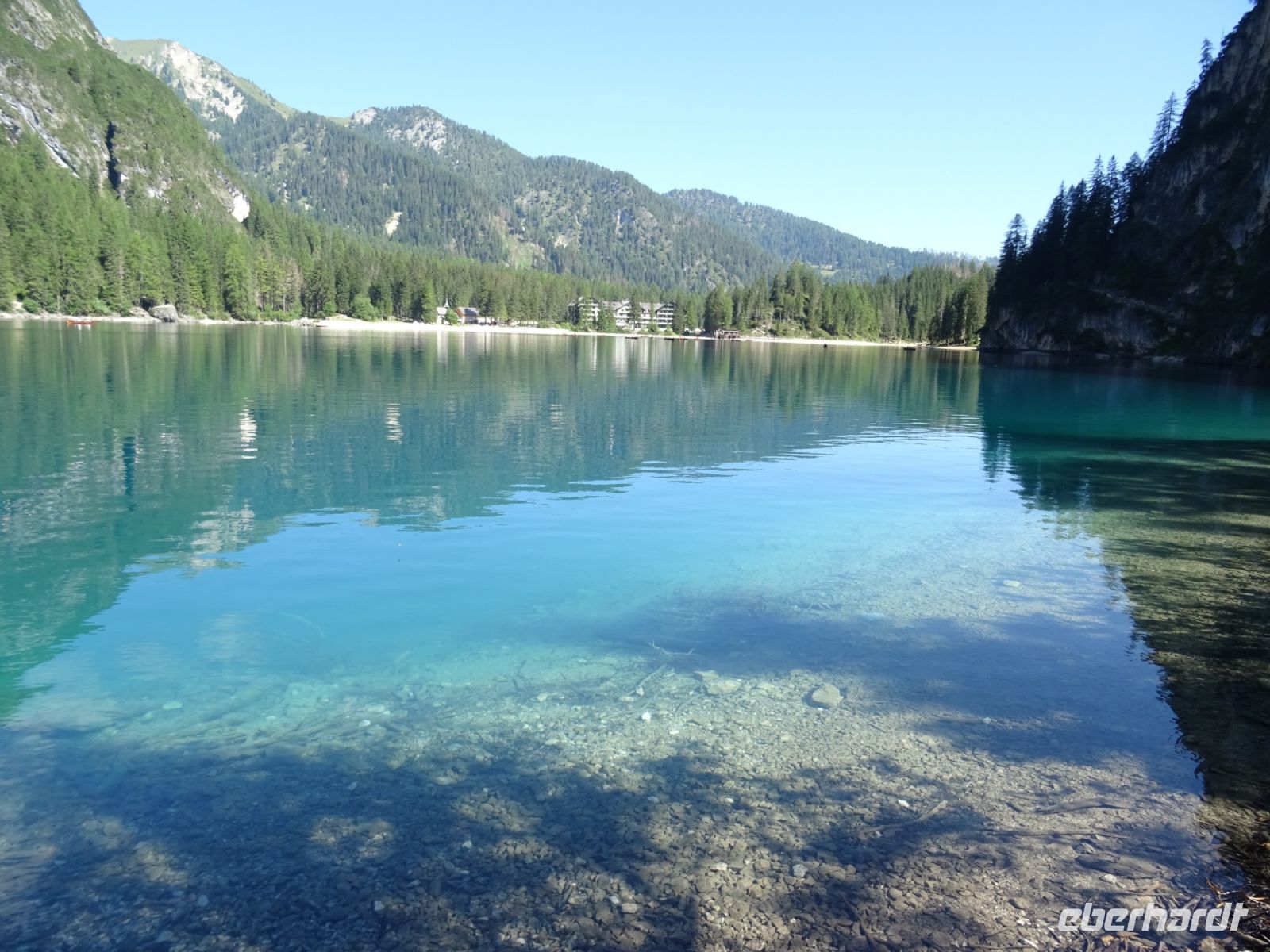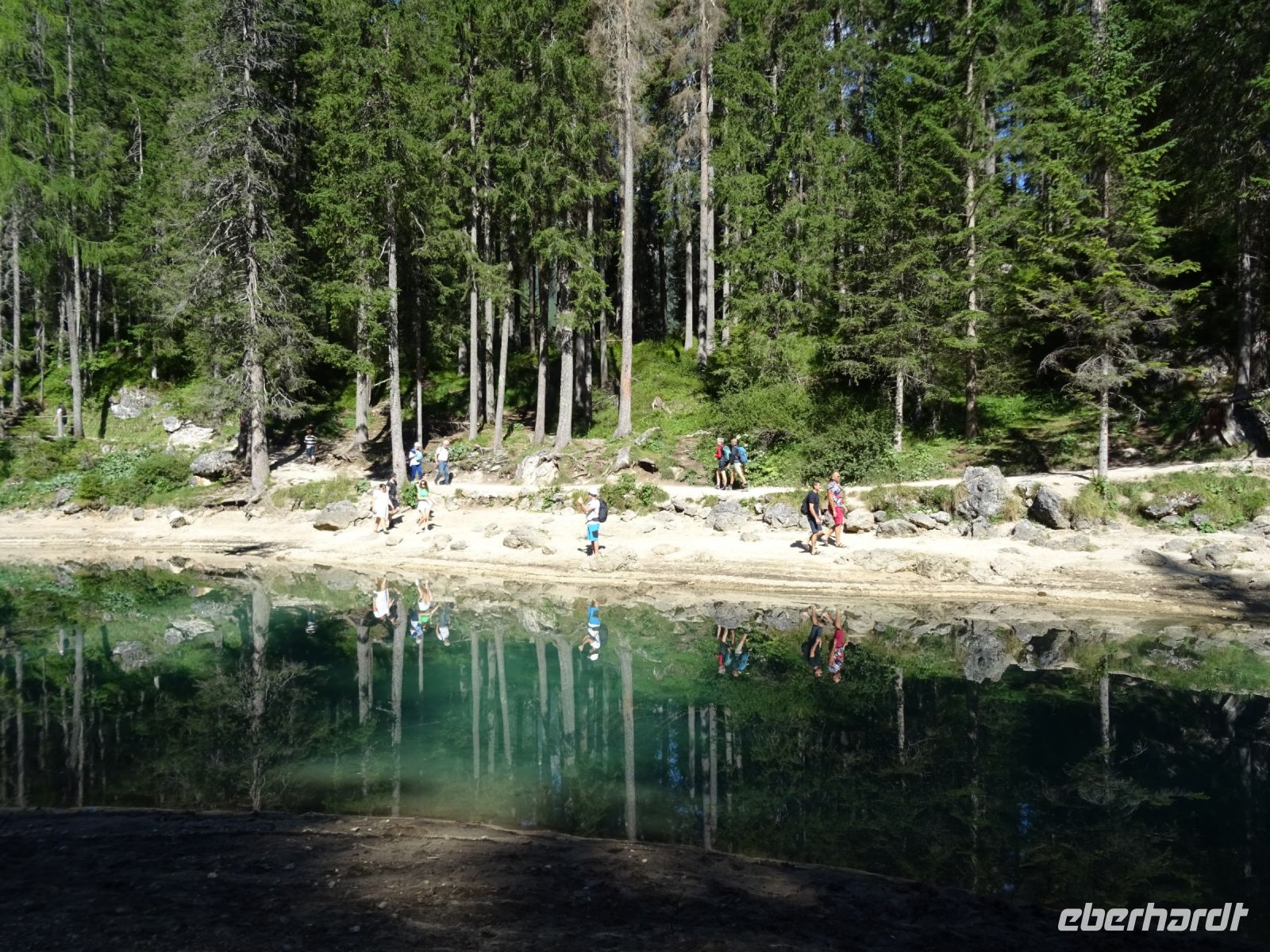 Nach einer großen „Mütze Schlaf“ und einem reichhaltigen Frühstück treffen wir nun endlich unsere Wanderleiterin Irmi und freuen uns endlich aktiv unterwegs zu sein. Unser Fahrer ist auch schon wieder startklar und so geht es mit unserem wendigen Reisebus zum romantischen Pragser Wildsee. Wir sind etwas angespannt, da wir sehr pünktlich am Eingang des Parkplatzes sein müssen auf Grund eines neuen, zeitlich begrenzten Parkprozederes. Aber da wir alle überpünktlich im Bus sitzen und Ricco mit seinem Bus auch gut durchkommt stehen wir zur rechten Zeit am richtigen Ort und können unsere erste Wanderung bei strahlenden Sonnenschein antreten. Unsere Irmi erklärt uns schon einiges zur Gegend und so saugen wir die Südtiroler Herzlichkeit förmlich auf.