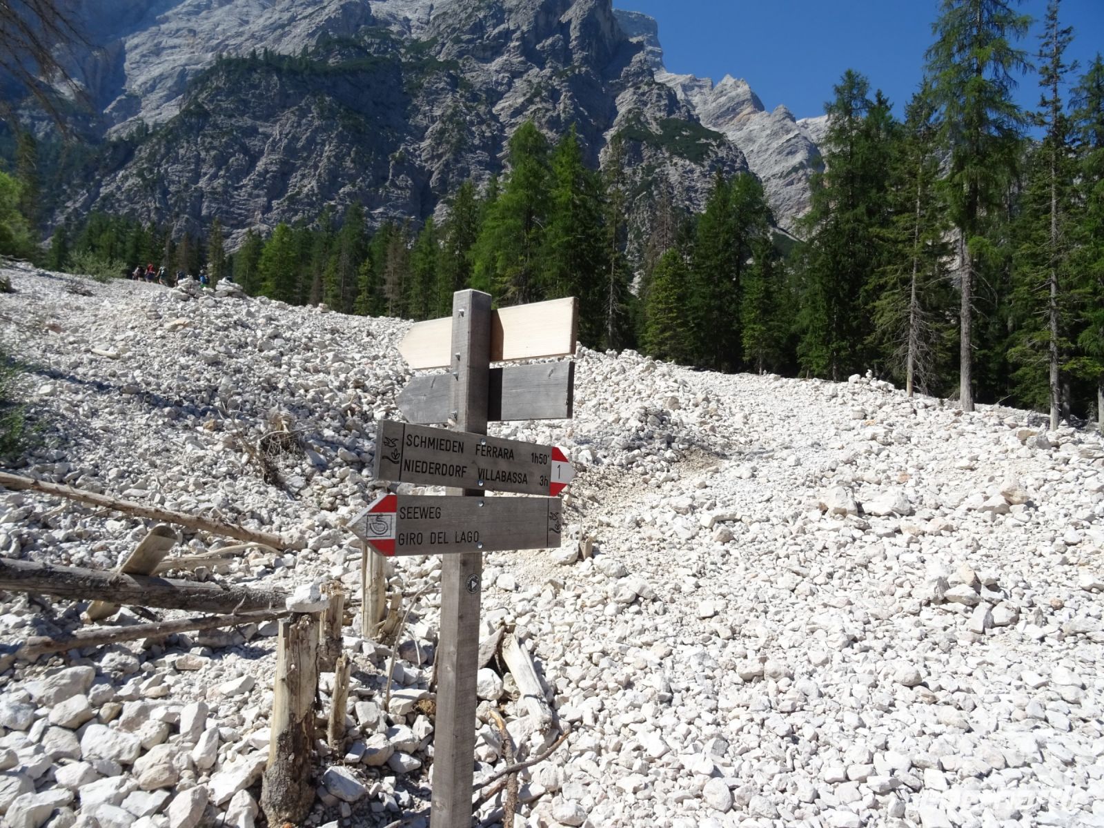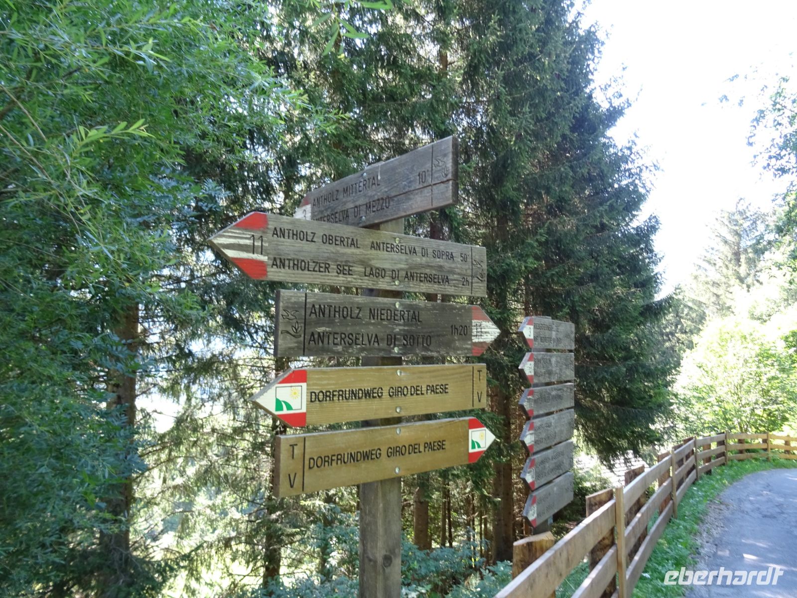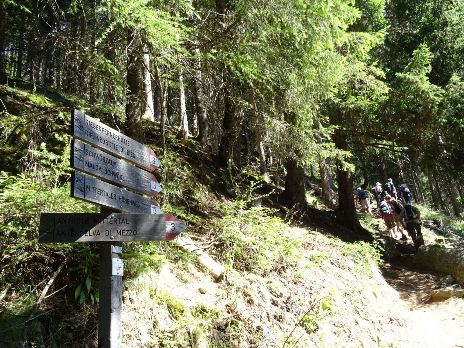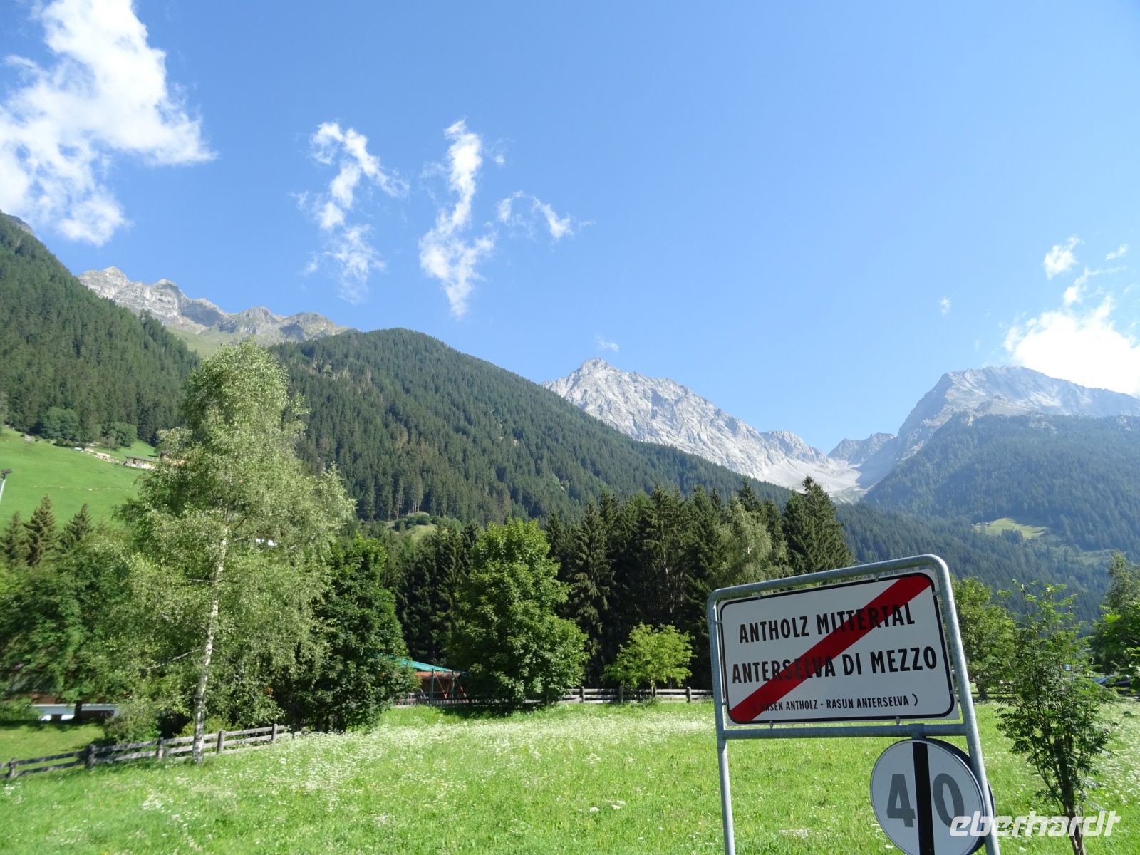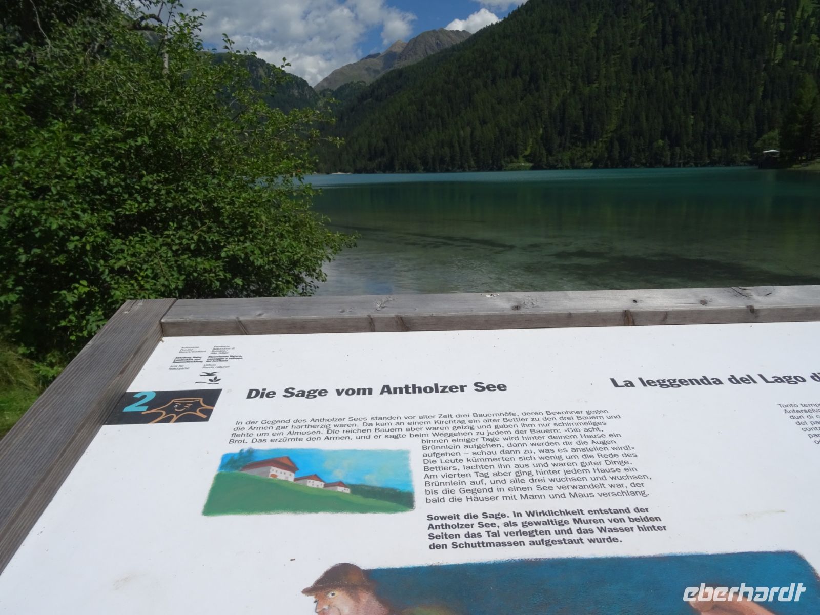 Minuten wieder an der Bergeralm auf 1600 Höhenmetern. Weiter führt uns der Weg nach gut zwanzig Minuten weiter zur Schwörz Alm, deren fantastisches Panorama wir für eine ausgiebige Jause und einem kühlen Radler nutzen. Immer wieder schweift unser Blick in das Antholzer Tal und die umliegende Berglandschaft. Auch den Seekofel – der Hausberg der gestrigen Tour am Pragser Wildsee - können wir in der Ferne erkennen. Weiter geht es nun nicht denselben Weg zurück, sondern wir entscheiden uns den relativ neu angelegten 2-Täler-Trail über das Biathlonzentrum bis zum Antholzer See zu marschieren. Wir sehen die übriggebliebenen Schäden der Mure, die erst Ende Juni das Antholzer Tal heimgesucht hat. Riesige Geröllmassen sind das Tal hinabgestürzt und haben auch den Wanderweg teilweise zerstört. Aber die Forstwirtschaft hat innerhalb kürzester Zeit die Schäden größtenteils beseitigt, so dass unser Weg passierbar ist und wir auf dem Weg zu unserem Tagesziel entlang des Antholzer Bachs immer wieder tolle Panoramen genießen konnten. Links die gewaltigen Geröllmassen und vor uns die sanften Berge des Antholzer Tals. Am Biathlonzentrum angekommen genießen wir nun die tolle Kulisse am Antholzer See und erfrischen uns entweder im See oder belohnen uns mit einem leckeren Eiskaffee. Wieder geht ein toller Tag zu Ende und voller neuer Eindrücke chauffiert uns Ricco zu unserem Hotel zurück.