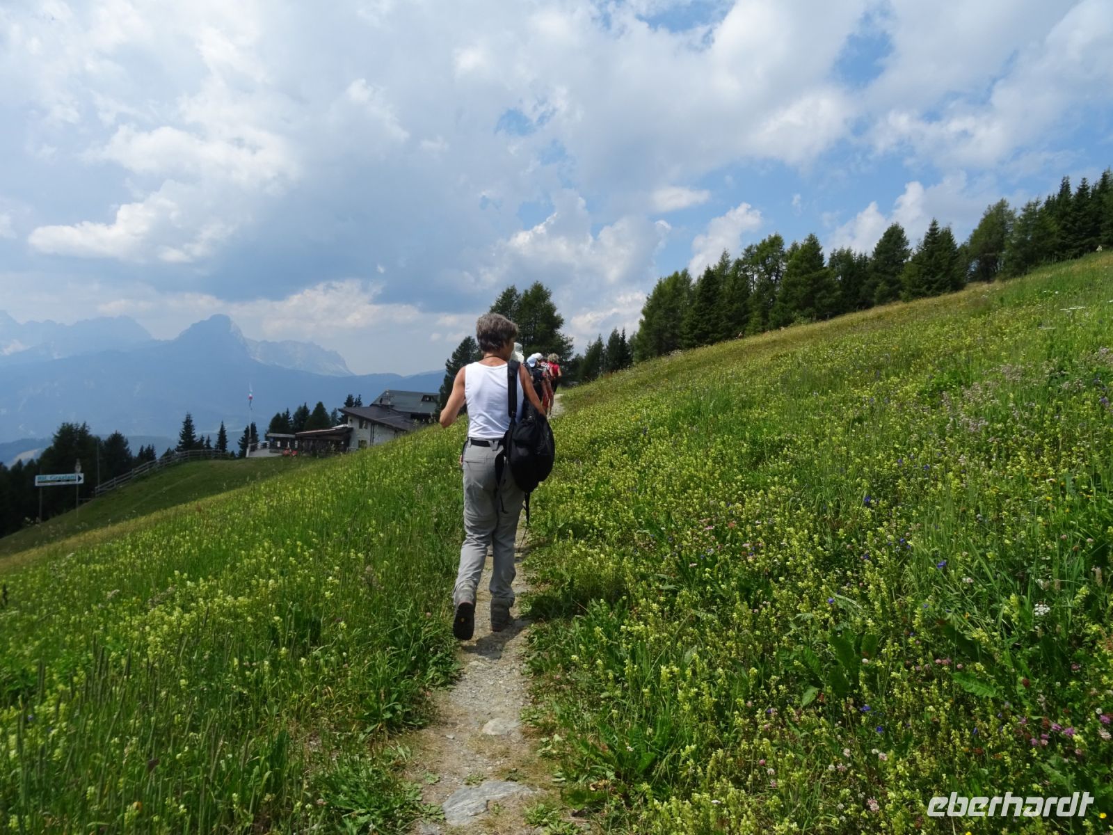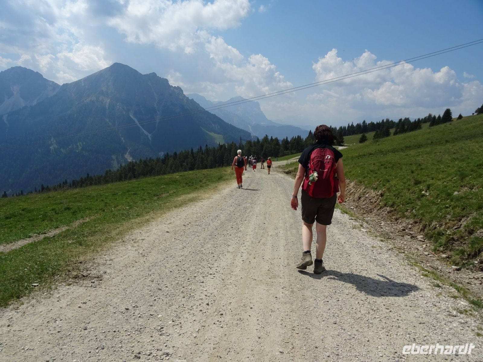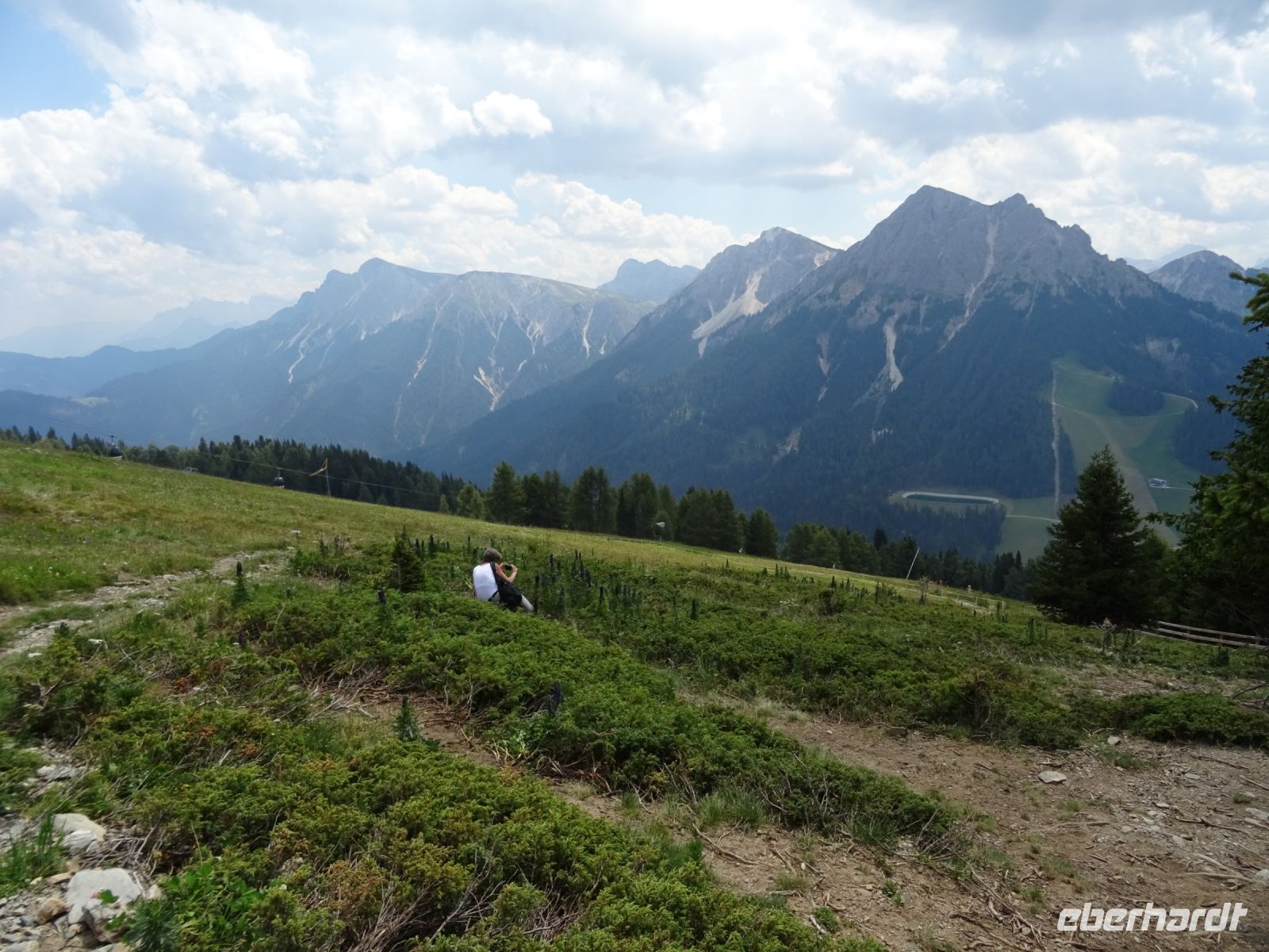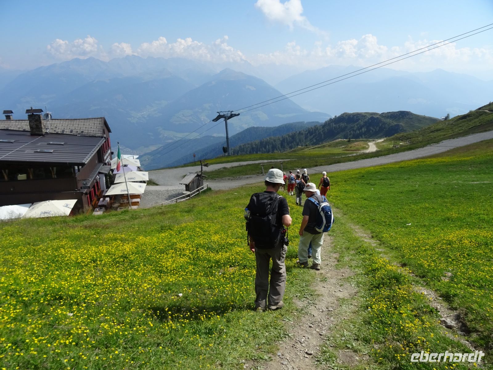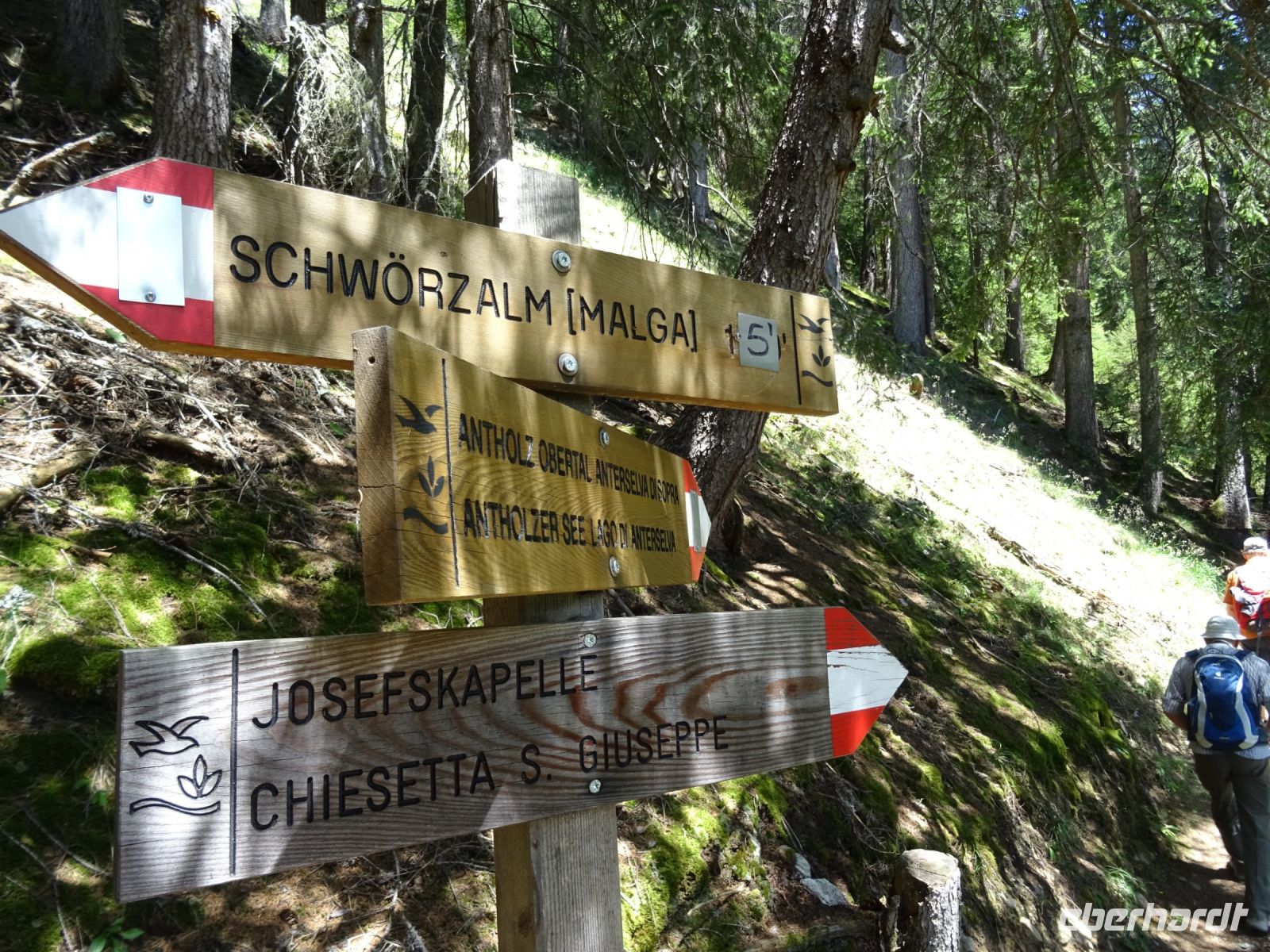 Minuten wieder an der Bergeralm auf 1600 Höhenmetern. Weiter führt uns der Weg nach gut zwanzig Minuten weiter zur Schwörz Alm, deren fantastisches Panorama wir für eine ausgiebige Jause und einem kühlen Radler nutzen. Immer wieder schweift unser Blick in das Antholzer Tal und die umliegende Berglandschaft. Auch den Seekofel – der Hausberg der gestrigen Tour am Pragser Wildsee - können wir in der Ferne erkennen. Weiter geht es nun nicht denselben Weg zurück, sondern wir entscheiden uns den relativ neu angelegten 2-Täler-Trail über das Biathlonzentrum bis zum Antholzer See zu marschieren. Wir sehen die übriggebliebenen Schäden der Mure, die erst Ende Juni das Antholzer Tal heimgesucht hat. Riesige Geröllmassen sind das Tal hinabgestürzt und haben auch den Wanderweg teilweise zerstört. Aber die Forstwirtschaft hat innerhalb kürzester Zeit die Schäden größtenteils beseitigt, so dass unser Weg passierbar ist und wir auf dem Weg zu unserem Tagesziel entlang des Antholzer Bachs immer wieder tolle Panoramen genießen konnten. Links die gewaltigen Geröllmassen und vor uns die sanften Berge des Antholzer Tals. Am Biathlonzentrum angekommen genießen wir nun die tolle Kulisse am Antholzer See und erfrischen uns entweder im See oder belohnen uns mit einem leckeren Eiskaffee. Wieder geht ein toller Tag zu Ende und voller neuer Eindrücke chauffiert uns Ricco zu unserem Hotel zurück.