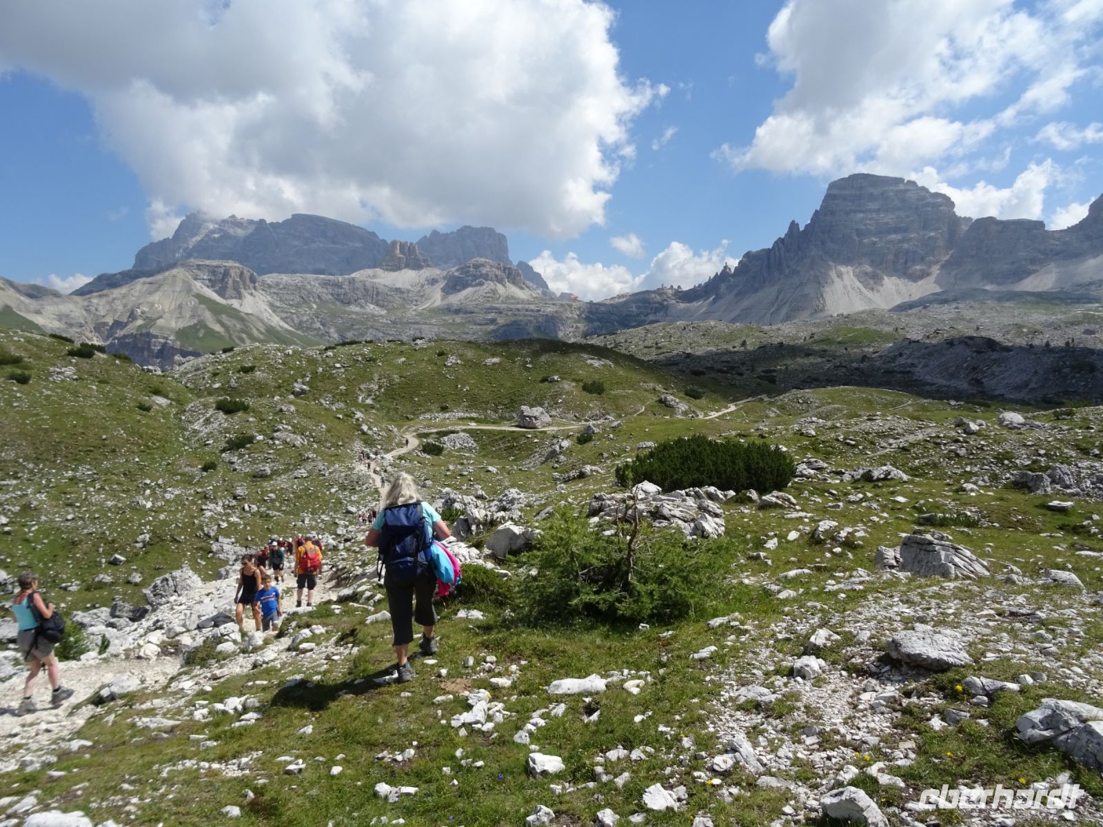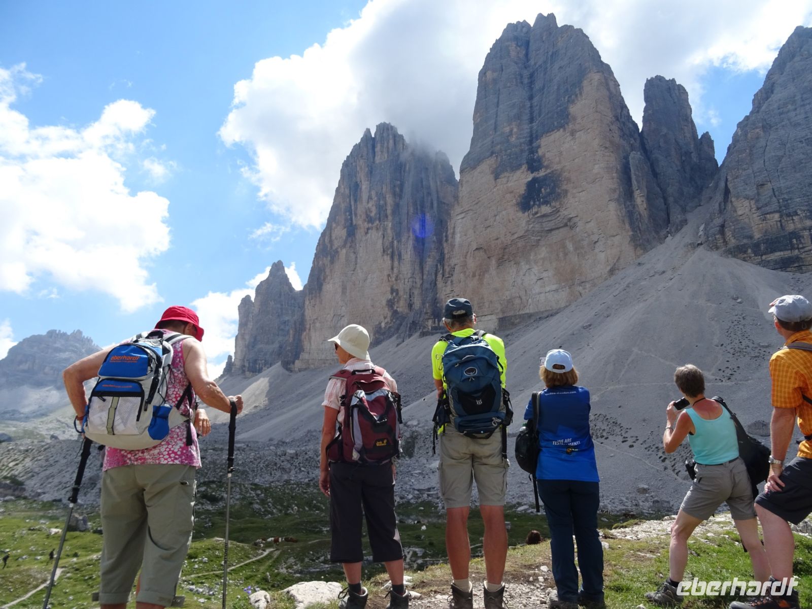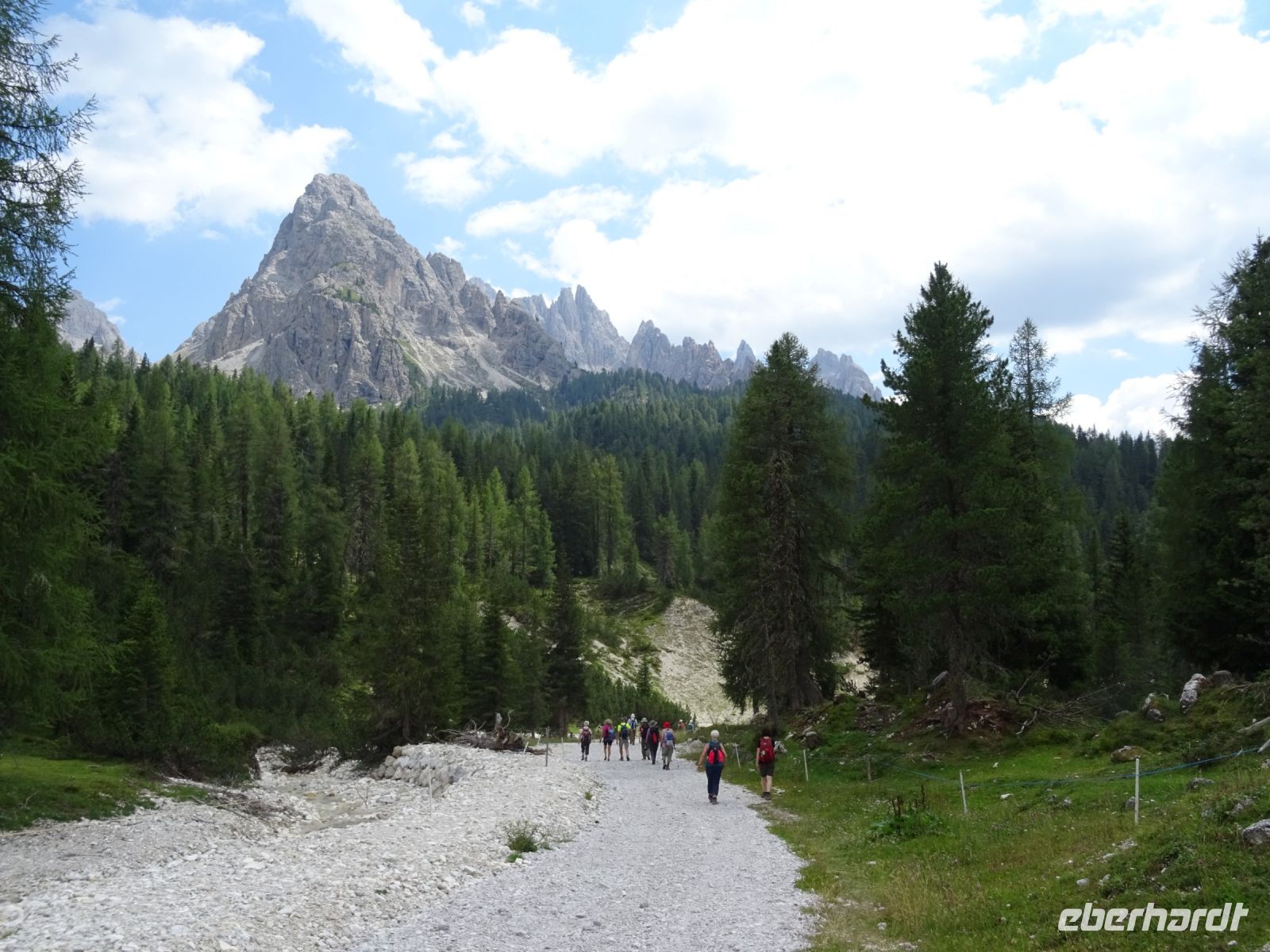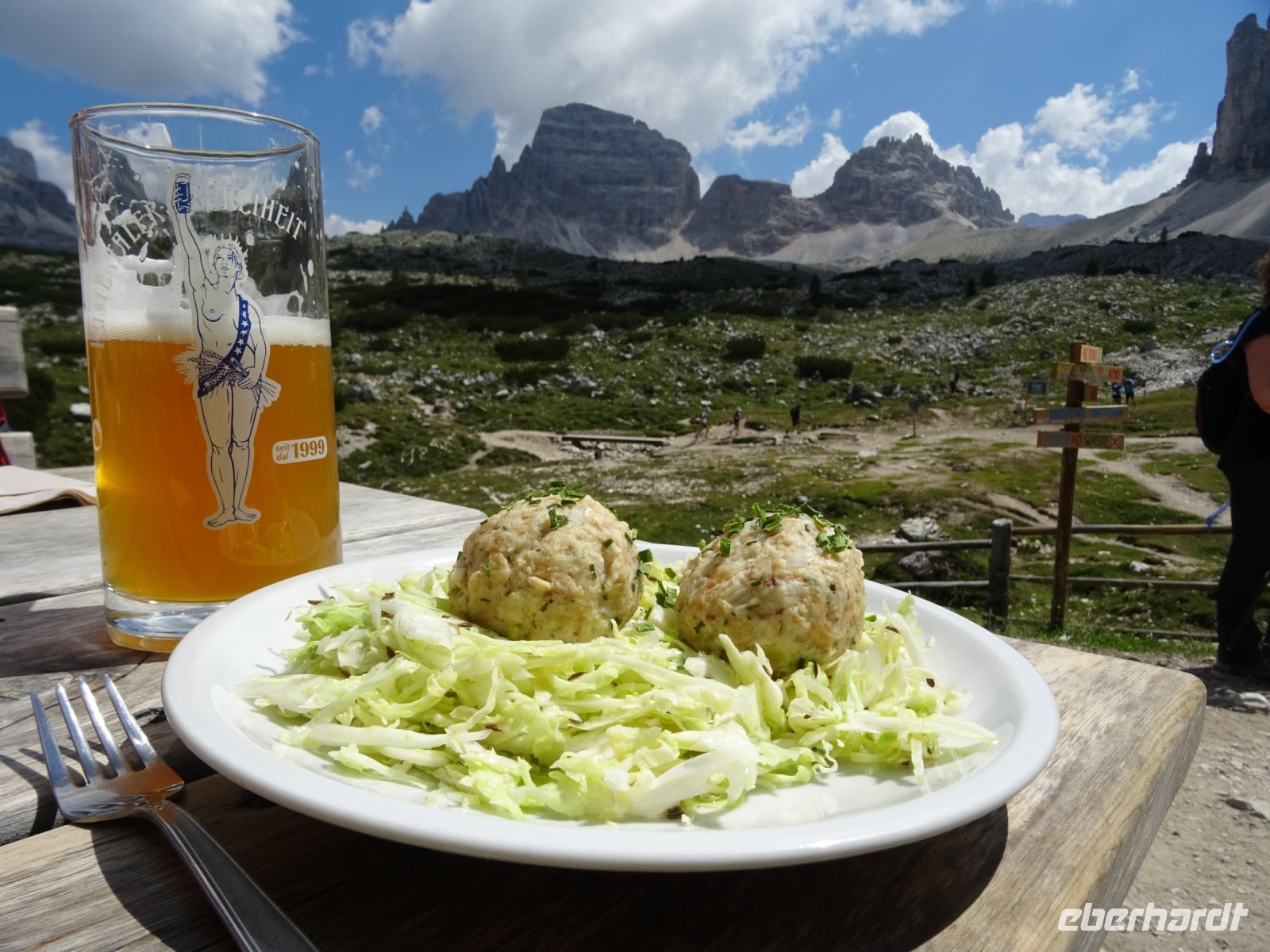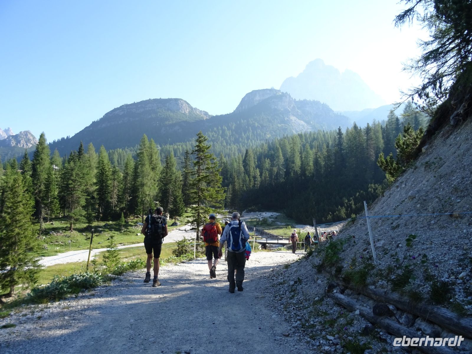 Mit den ersten Sonnenstrahlen schnüren wir unsere Wanderschuhe und packen unseren Rucksack, um mit Irmi bereits um sieben Uhr morgens mit dem Bus in die Sextener Dolomiten zu fahren. Aus der Erfahrung des letzten Jahres, nehmen wir das zeitige Aufstehen in Kauf um noch vor den ersten italienischen Touristen an den Drei Zinnen zu sein. Frühstück und Kaffee gibt es im Bus und so vergeht die Stunde Fahrtzeit wie im Flug. Die Drei Zinnen sind das Wahrzeichen der Dolomiten und somit ein beliebtes Ausflugsziel für Groß und Klein. Wir bewegen uns heute aber etwas abseits vom Trubel und beginnen unsere Tour auf circa 1900 Metern am Lago d’Antorno. Auf einem wenig begangenen Steig wandern wir von der Rinbiancoalm zur Forcella di Mezzo auf. Wir genießen die herrliche, morgendliche Ruhe, das Vögelgezwitscher und nehmen uns vor allem Zeit für die ersten, größeren Anstiege. Immer wieder pausieren wir, um das atemberaubende Panorama der Dolomiten aufzusaugen. Die Fotoapparate laufen jedenfalls heiß, denn vor dem tiefblauen Himmel wirken die Gipfel vom Monte Piano, der Cadini-Gruppe oder der Schusterspitze noch gewaltiger. Auf dem Hochplateau angekommen, legen wir erst einmal eine kleine Pause ein, bevor wir von dort weiter zur Langalm gehen und den gigantischem Blick auf die Nordwände der Zinnen bestaunen. Für ein paar Meter ist schon deutlich mehr Begängnis, aber immerhin ist die Mittagsrast in Sicht. Nach einer ausgiebigen Stärkung auf der Alm geht es zurück zur Forcella. Immer wieder lassen wir die Blicke zurück schweifen und sind stolz auf das was wir bereits geschafft haben. Der Abstieg geht nun etwas steiler und teilweise sehr uneben nach unten. Obacht ist angesagt und jeder nimmt sich ausreichend Zeit. Die Füße tragen uns wieder bis zum Ausgangspunkt unserer heutigen Tour. Unser Chauffeur Ricco erwartet uns bereits mit einem „kühlen Blonden“ und selbstverständlich stoßen wir bei einem Südtiroler Grappa auf diesen grandiosen, aber auch anspruchsvollen Tag an! Das leckere Menü im Hotel haben wir uns jedenfalls redlich verdient! Buona notte!