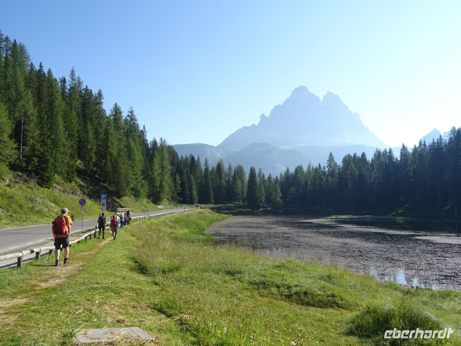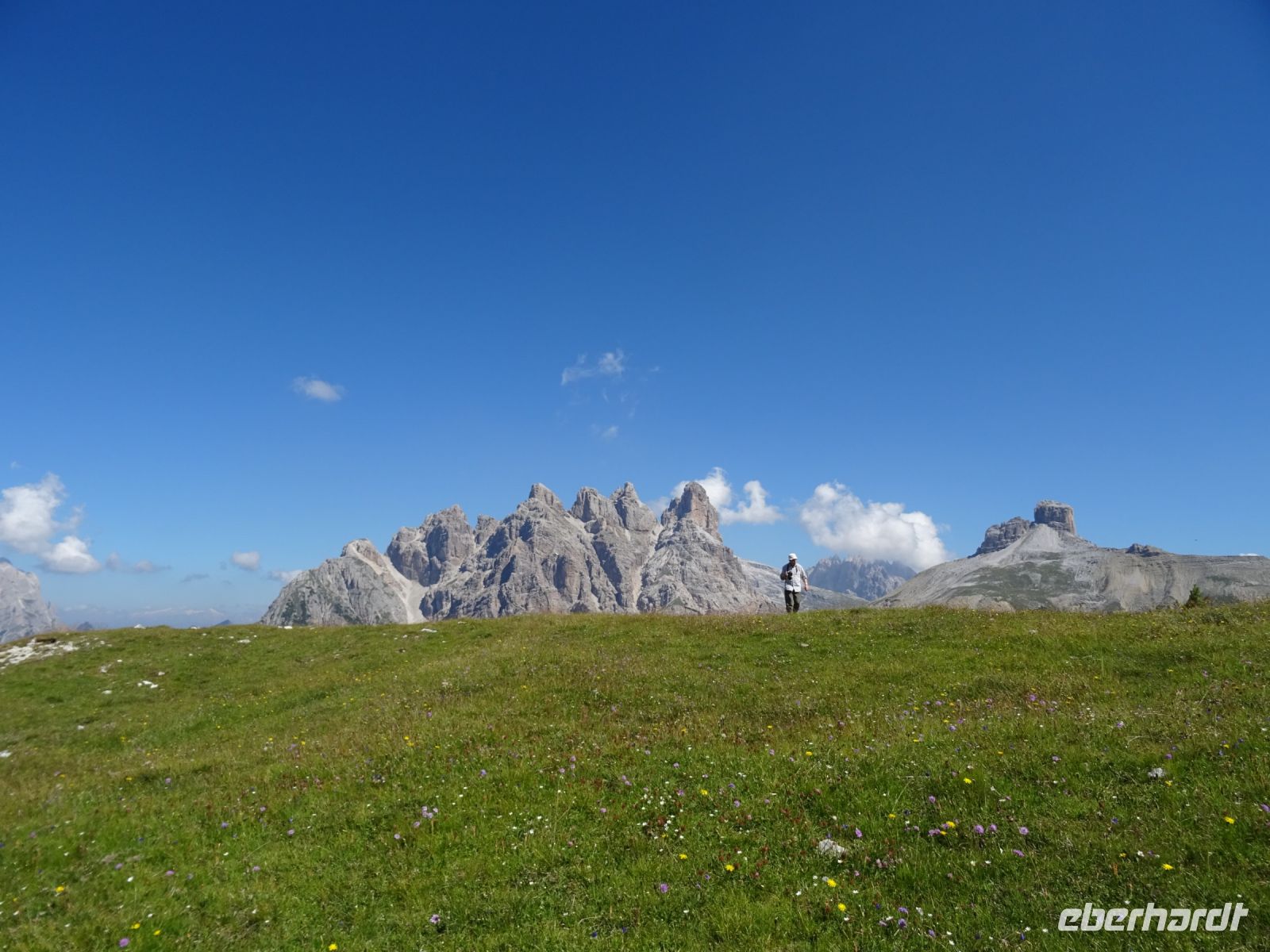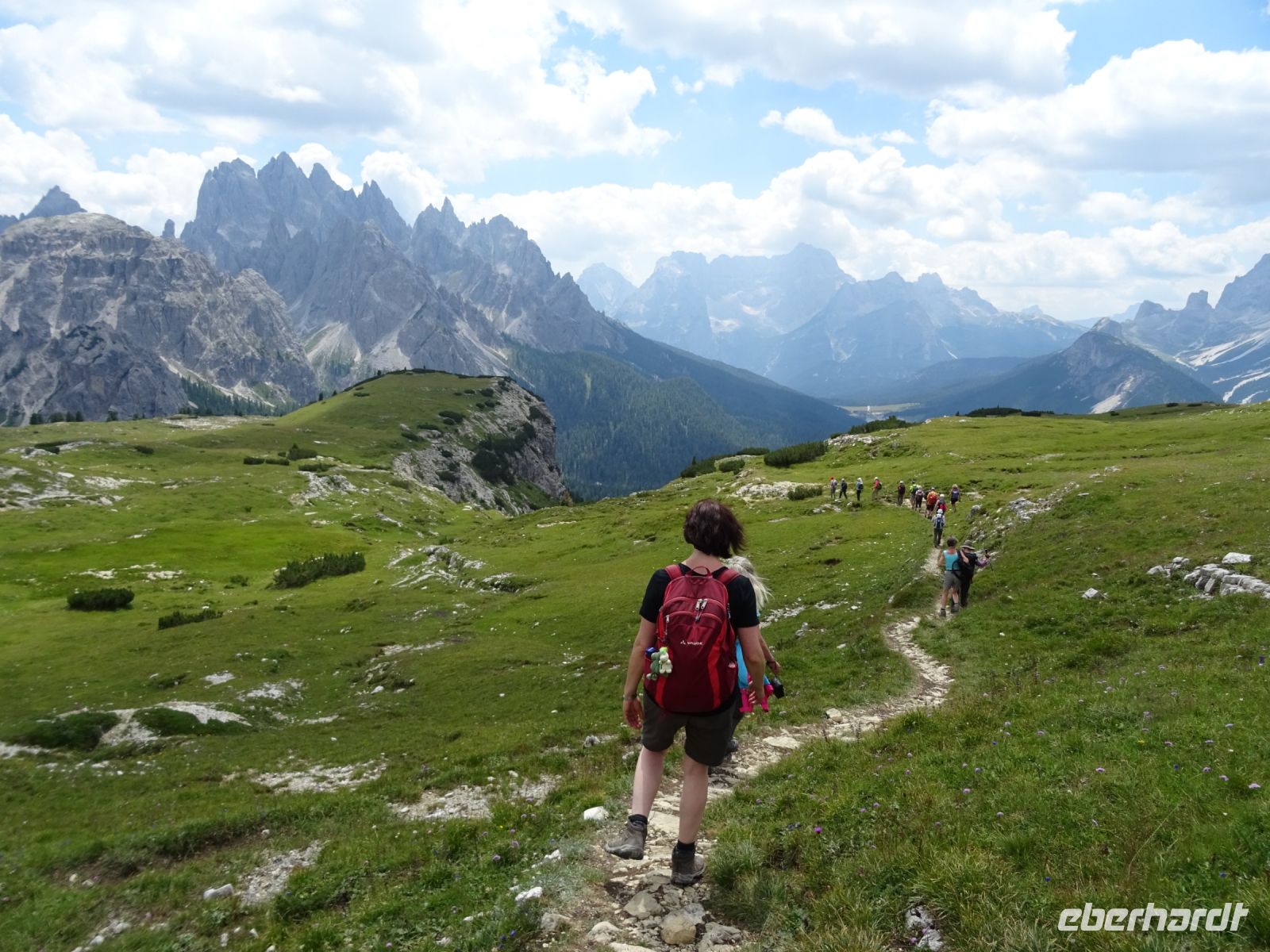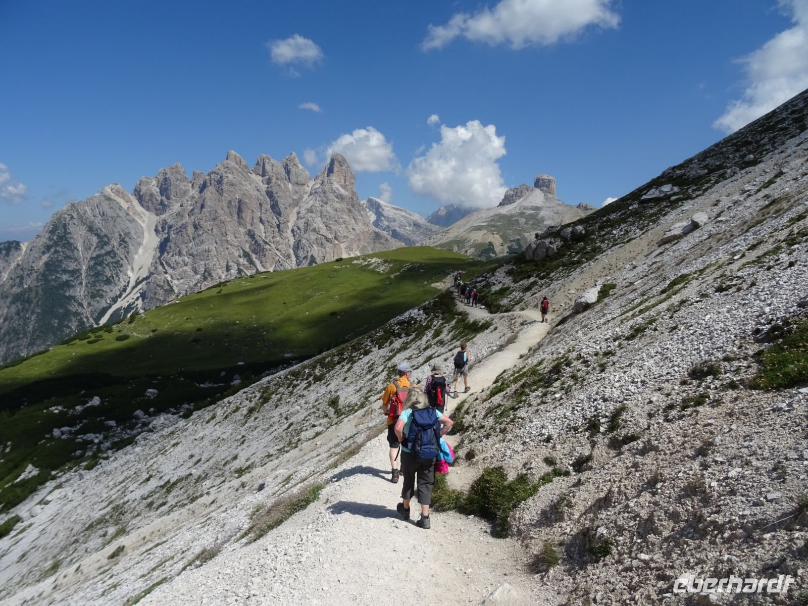 Mit den ersten Sonnenstrahlen schnüren wir unsere Wanderschuhe und packen unseren Rucksack, um mit Irmi bereits um sieben Uhr morgens mit dem Bus in die Sextener Dolomiten zu fahren. Aus der Erfahrung des letzten Jahres, nehmen wir das zeitige Aufstehen in Kauf um noch vor den ersten italienischen Touristen an den Drei Zinnen zu sein. Frühstück und Kaffee gibt es im Bus und so vergeht die Stunde Fahrtzeit wie im Flug. Die Drei Zinnen sind das Wahrzeichen der Dolomiten und somit ein beliebtes Ausflugsziel für Groß und Klein. Wir bewegen uns heute aber etwas abseits vom Trubel und beginnen unsere Tour auf circa 1900 Metern am Lago d’Antorno. Auf einem wenig begangenen Steig wandern wir von der Rinbiancoalm zur Forcella di Mezzo auf. Wir genießen die herrliche, morgendliche Ruhe, das Vögelgezwitscher und nehmen uns vor allem Zeit für die ersten, größeren Anstiege. Immer wieder pausieren wir, um das atemberaubende Panorama der Dolomiten aufzusaugen. Die Fotoapparate laufen jedenfalls heiß, denn vor dem tiefblauen Himmel wirken die Gipfel vom Monte Piano, der Cadini-Gruppe oder der Schusterspitze noch gewaltiger. Auf dem Hochplateau angekommen, legen wir erst einmal eine kleine Pause ein, bevor wir von dort weiter zur Langalm gehen und den gigantischem Blick auf die Nordwände der Zinnen bestaunen. Für ein paar Meter ist schon deutlich mehr Begängnis, aber immerhin ist die Mittagsrast in Sicht. Nach einer ausgiebigen Stärkung auf der Alm geht es zurück zur Forcella. Immer wieder lassen wir die Blicke zurück schweifen und sind stolz auf das was wir bereits geschafft haben. Der Abstieg geht nun etwas steiler und teilweise sehr uneben nach unten. Obacht ist angesagt und jeder nimmt sich ausreichend Zeit. Die Füße tragen uns wieder bis zum Ausgangspunkt unserer heutigen Tour. Unser Chauffeur Ricco erwartet uns bereits mit einem „kühlen Blonden“ und selbstverständlich stoßen wir bei einem Südtiroler Grappa auf diesen grandiosen, aber auch anspruchsvollen Tag an! Das leckere Menü im Hotel haben wir uns jedenfalls redlich verdient! Buona notte!