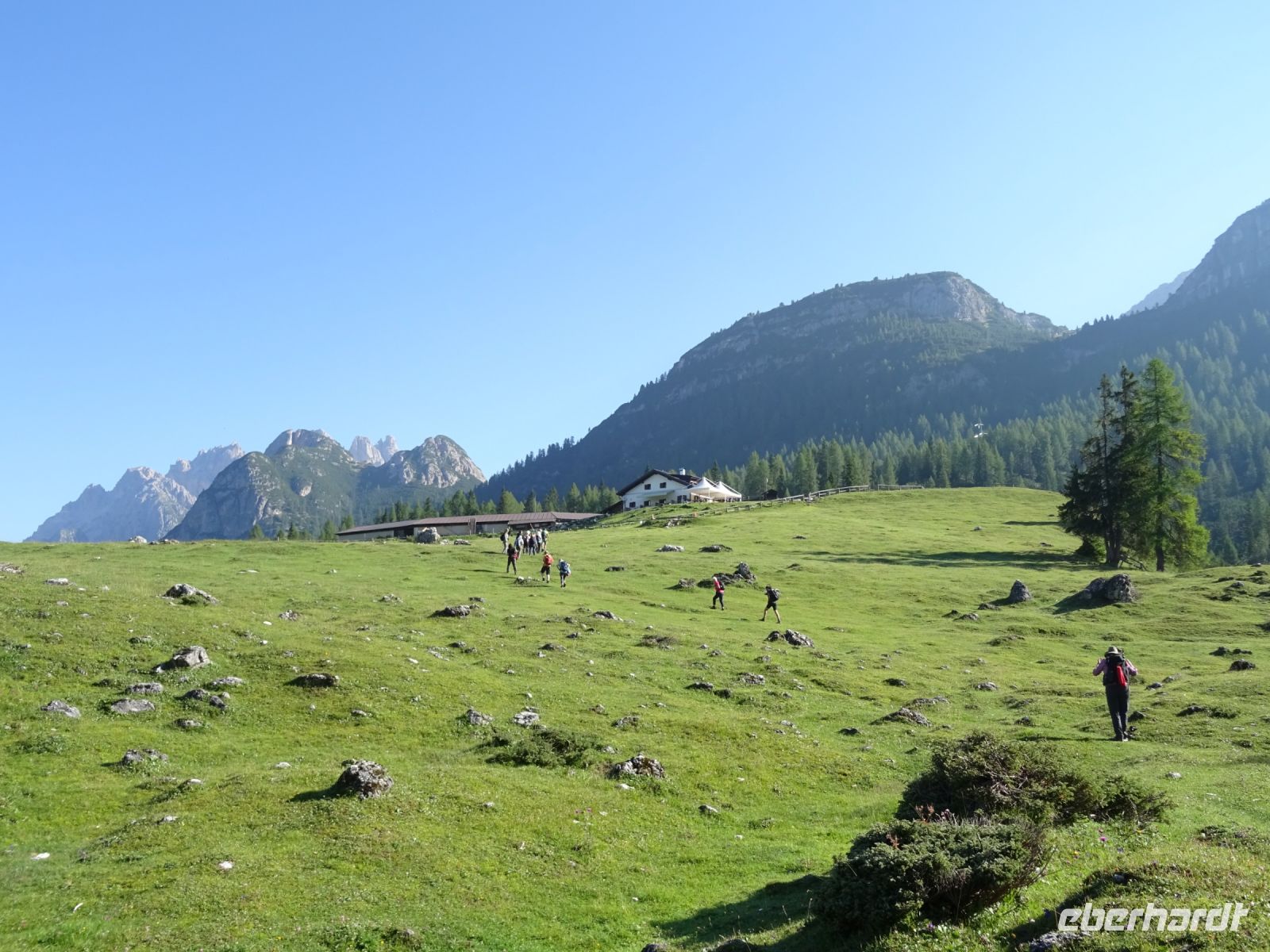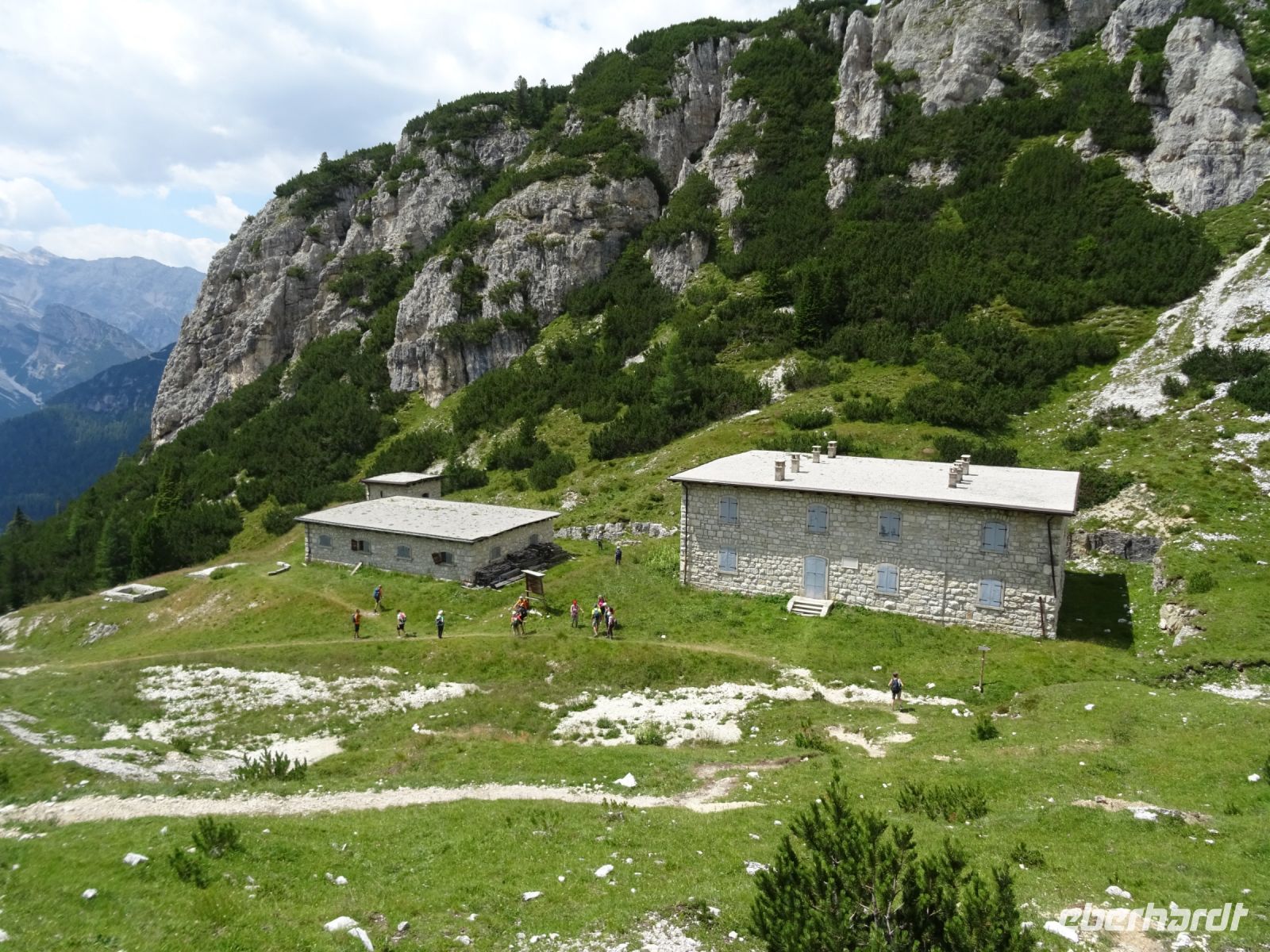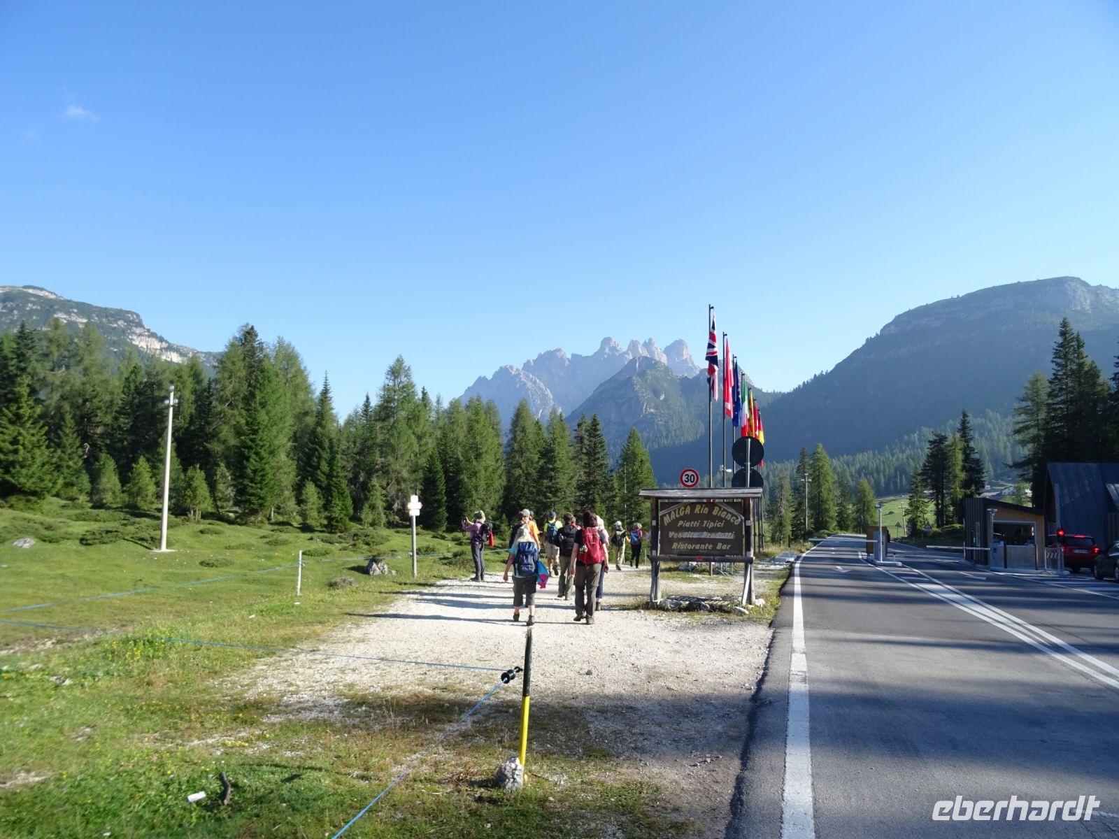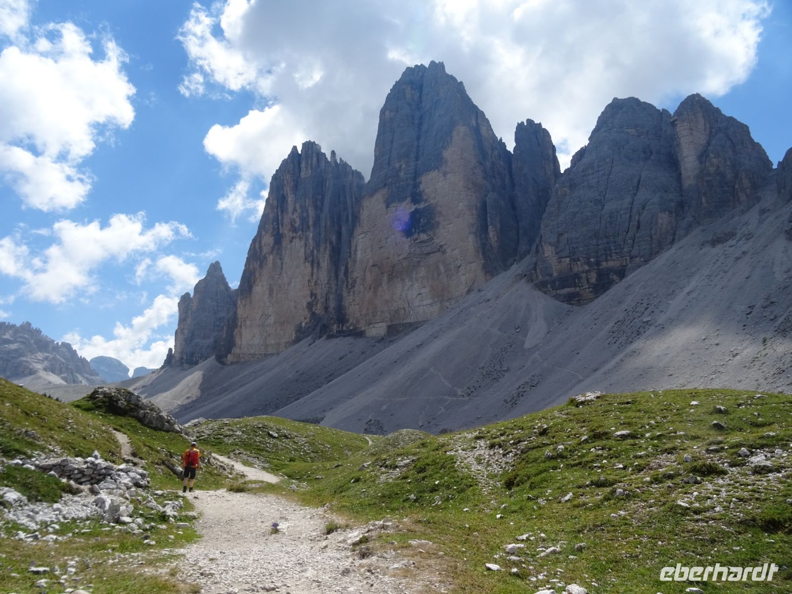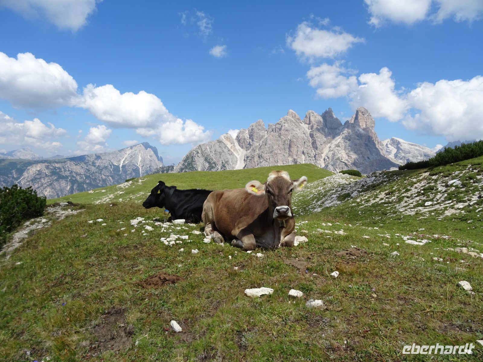 Mit den ersten Sonnenstrahlen schnüren wir unsere Wanderschuhe und packen unseren Rucksack, um mit Irmi bereits um sieben Uhr morgens mit dem Bus in die Sextener Dolomiten zu fahren. Aus der Erfahrung des letzten Jahres, nehmen wir das zeitige Aufstehen in Kauf um noch vor den ersten italienischen Touristen an den Drei Zinnen zu sein. Frühstück und Kaffee gibt es im Bus und so vergeht die Stunde Fahrtzeit wie im Flug. Die Drei Zinnen sind das Wahrzeichen der Dolomiten und somit ein beliebtes Ausflugsziel für Groß und Klein. Wir bewegen uns heute aber etwas abseits vom Trubel und beginnen unsere Tour auf circa 1900 Metern am Lago d’Antorno. Auf einem wenig begangenen Steig wandern wir von der Rinbiancoalm zur Forcella di Mezzo auf. Wir genießen die herrliche, morgendliche Ruhe, das Vögelgezwitscher und nehmen uns vor allem Zeit für die ersten, größeren Anstiege. Immer wieder pausieren wir, um das atemberaubende Panorama der Dolomiten aufzusaugen. Die Fotoapparate laufen jedenfalls heiß, denn vor dem tiefblauen Himmel wirken die Gipfel vom Monte Piano, der Cadini-Gruppe oder der Schusterspitze noch gewaltiger. Auf dem Hochplateau angekommen, legen wir erst einmal eine kleine Pause ein, bevor wir von dort weiter zur Langalm gehen und den gigantischem Blick auf die Nordwände der Zinnen bestaunen. Für ein paar Meter ist schon deutlich mehr Begängnis, aber immerhin ist die Mittagsrast in Sicht. Nach einer ausgiebigen Stärkung auf der Alm geht es zurück zur Forcella. Immer wieder lassen wir die Blicke zurück schweifen und sind stolz auf das was wir bereits geschafft haben. Der Abstieg geht nun etwas steiler und teilweise sehr uneben nach unten. Obacht ist angesagt und jeder nimmt sich ausreichend Zeit. Die Füße tragen uns wieder bis zum Ausgangspunkt unserer heutigen Tour. Unser Chauffeur Ricco erwartet uns bereits mit einem „kühlen Blonden“ und selbstverständlich stoßen wir bei einem Südtiroler Grappa auf diesen grandiosen, aber auch anspruchsvollen Tag an! Das leckere Menü im Hotel haben wir uns jedenfalls redlich verdient! Buona notte!