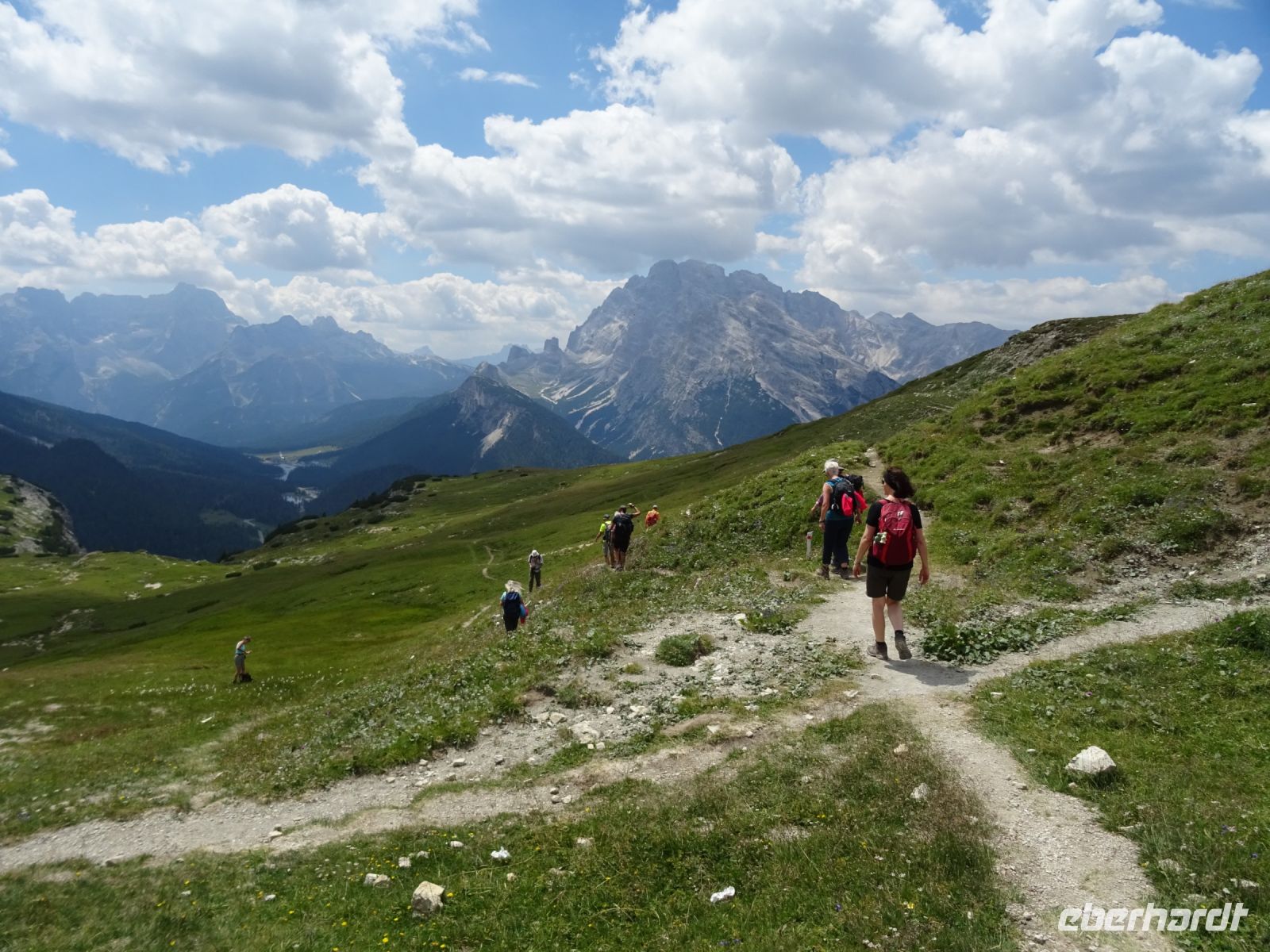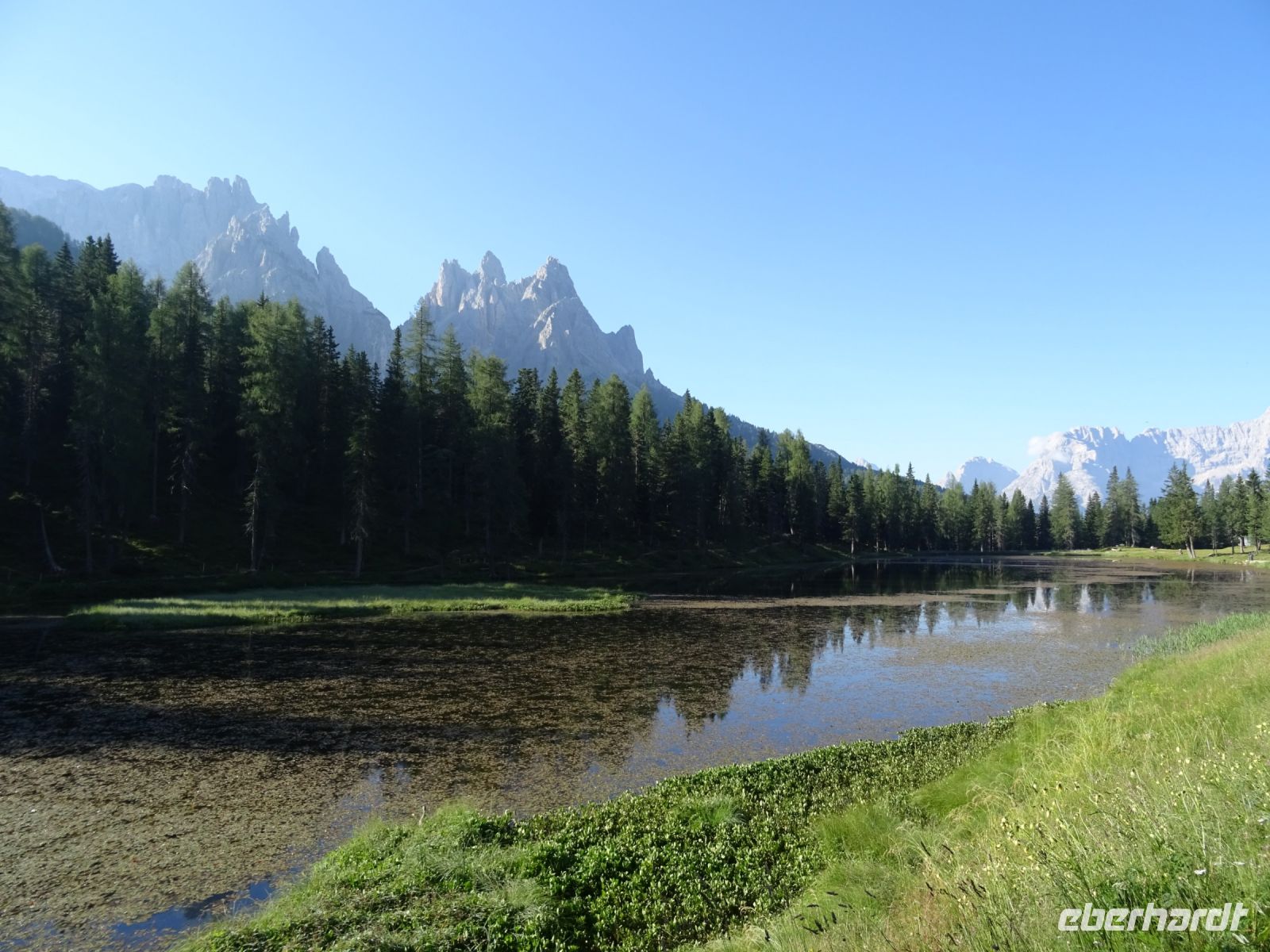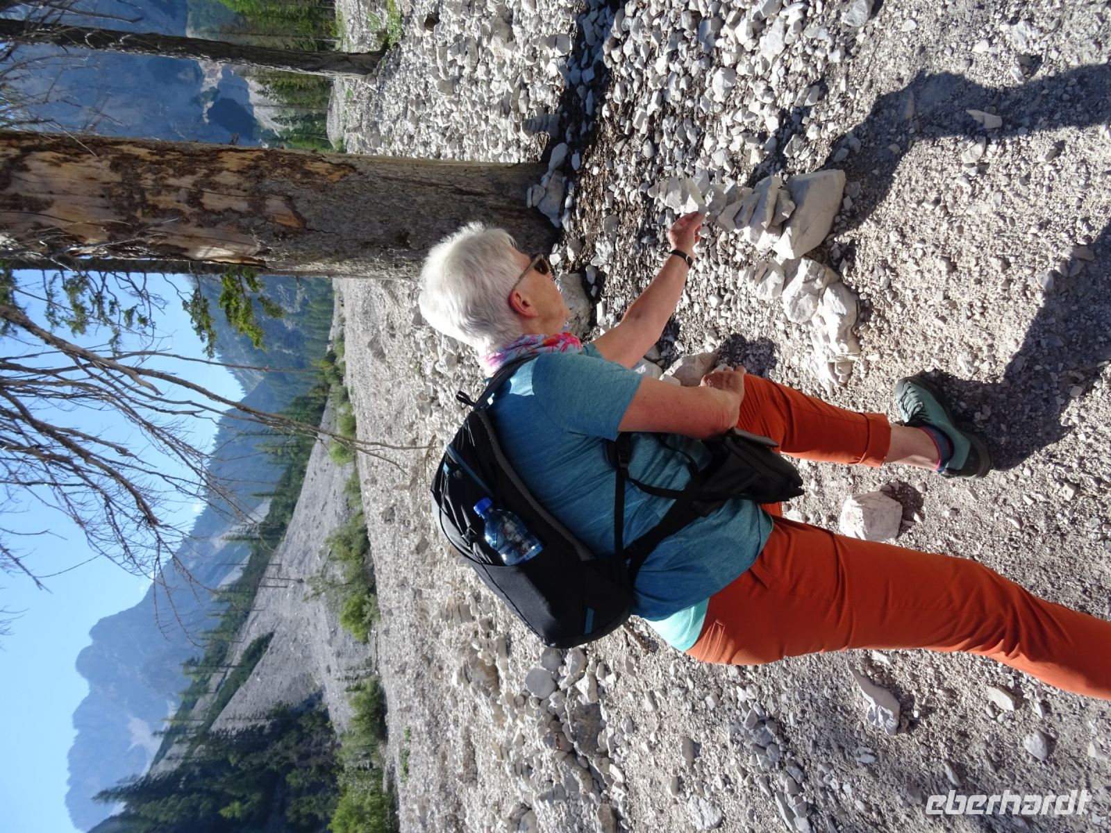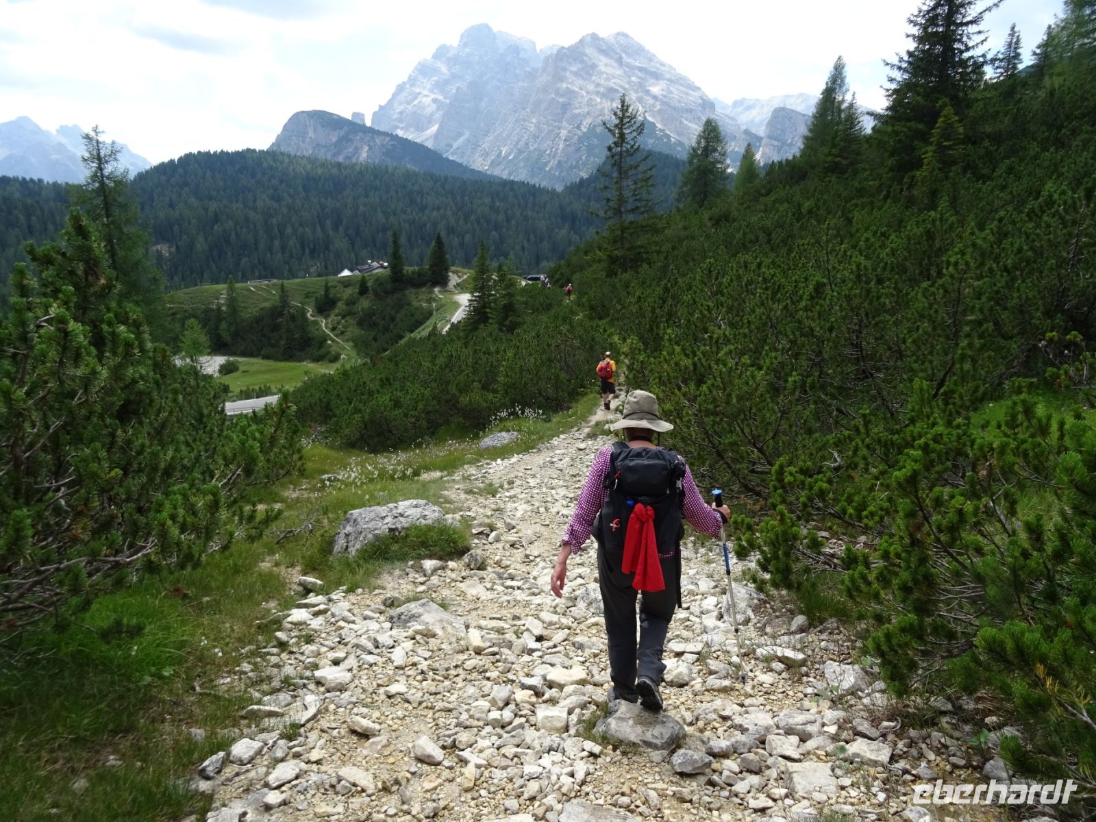 Mit den ersten Sonnenstrahlen schnüren wir unsere Wanderschuhe und packen unseren Rucksack, um mit Irmi bereits um sieben Uhr morgens mit dem Bus in die Sextener Dolomiten zu fahren. Aus der Erfahrung des letzten Jahres, nehmen wir das zeitige Aufstehen in Kauf um noch vor den ersten italienischen Touristen an den Drei Zinnen zu sein. Frühstück und Kaffee gibt es im Bus und so vergeht die Stunde Fahrtzeit wie im Flug. Die Drei Zinnen sind das Wahrzeichen der Dolomiten und somit ein beliebtes Ausflugsziel für Groß und Klein. Wir bewegen uns heute aber etwas abseits vom Trubel und beginnen unsere Tour auf circa 1900 Metern am Lago d’Antorno. Auf einem wenig begangenen Steig wandern wir von der Rinbiancoalm zur Forcella di Mezzo auf. Wir genießen die herrliche, morgendliche Ruhe, das Vögelgezwitscher und nehmen uns vor allem Zeit für die ersten, größeren Anstiege. Immer wieder pausieren wir, um das atemberaubende Panorama der Dolomiten aufzusaugen. Die Fotoapparate laufen jedenfalls heiß, denn vor dem tiefblauen Himmel wirken die Gipfel vom Monte Piano, der Cadini-Gruppe oder der Schusterspitze noch gewaltiger. Auf dem Hochplateau angekommen, legen wir erst einmal eine kleine Pause ein, bevor wir von dort weiter zur Langalm gehen und den gigantischem Blick auf die Nordwände der Zinnen bestaunen. Für ein paar Meter ist schon deutlich mehr Begängnis, aber immerhin ist die Mittagsrast in Sicht. Nach einer ausgiebigen Stärkung auf der Alm geht es zurück zur Forcella. Immer wieder lassen wir die Blicke zurück schweifen und sind stolz auf das was wir bereits geschafft haben. Der Abstieg geht nun etwas steiler und teilweise sehr uneben nach unten. Obacht ist angesagt und jeder nimmt sich ausreichend Zeit. Die Füße tragen uns wieder bis zum Ausgangspunkt unserer heutigen Tour. Unser Chauffeur Ricco erwartet uns bereits mit einem „kühlen Blonden“ und selbstverständlich stoßen wir bei einem Südtiroler Grappa auf diesen grandiosen, aber auch anspruchsvollen Tag an! Das leckere Menü im Hotel haben wir uns jedenfalls redlich verdient! Buona notte!