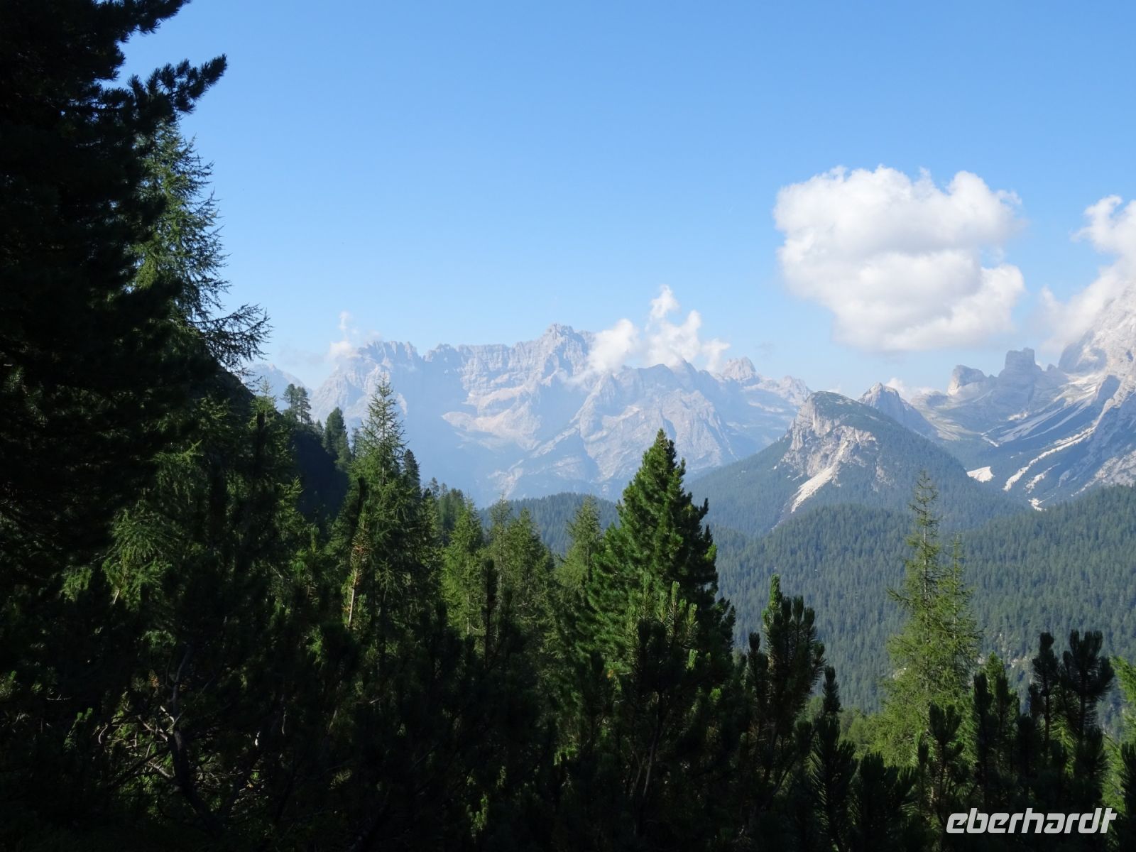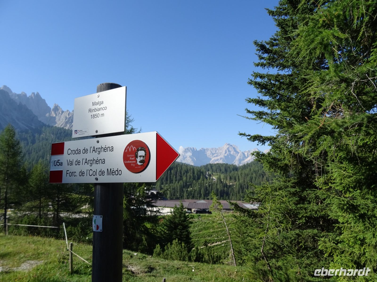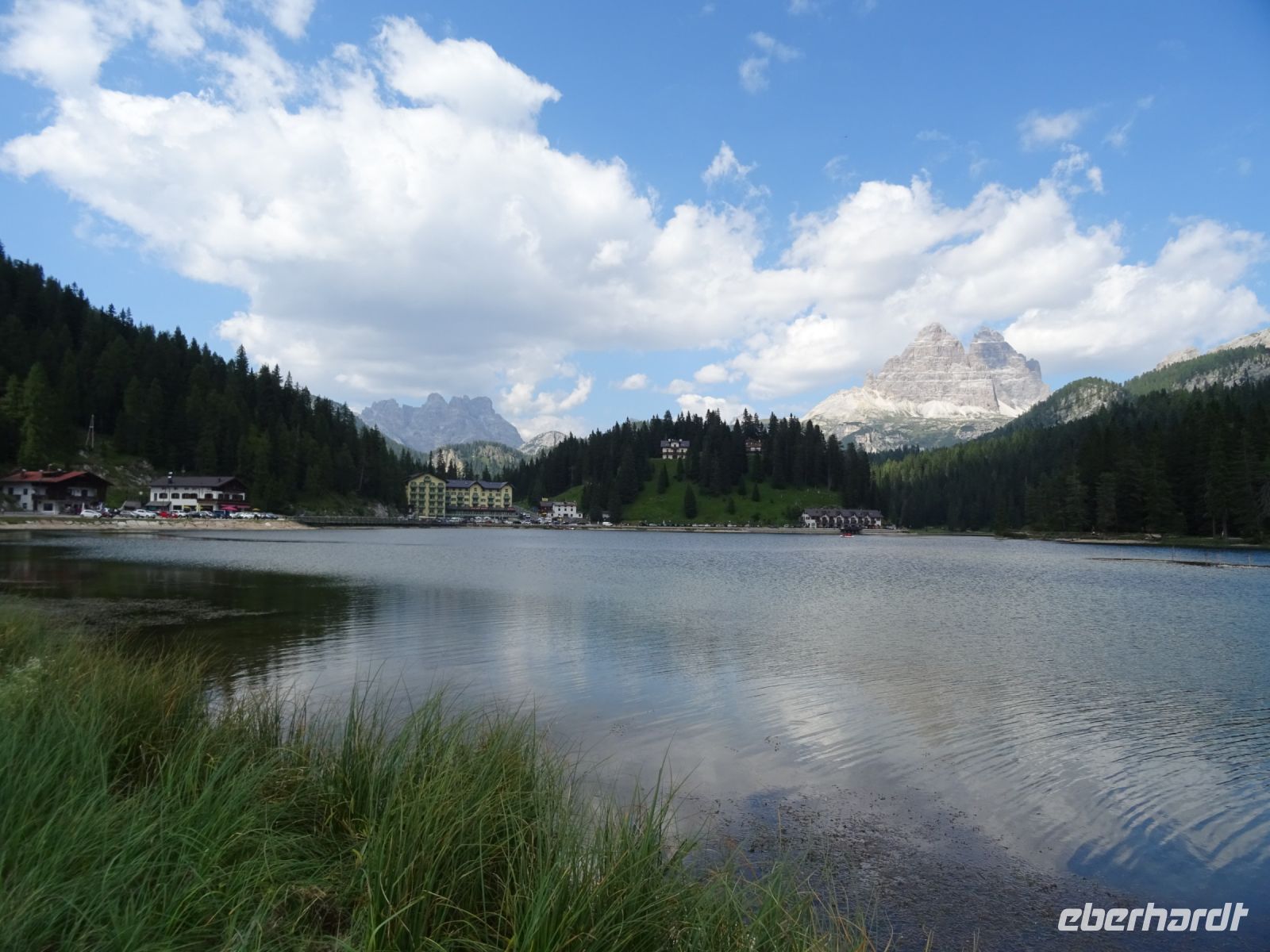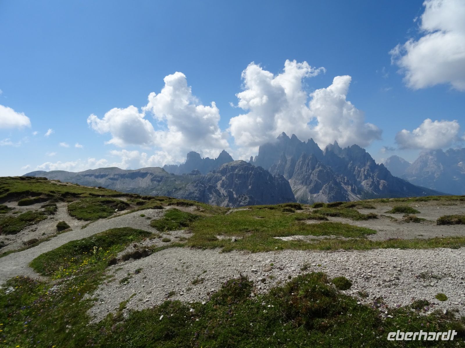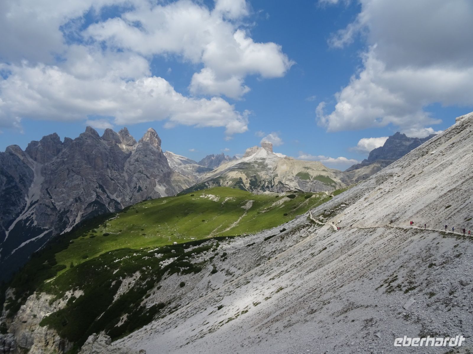 Mit den ersten Sonnenstrahlen schnüren wir unsere Wanderschuhe und packen unseren Rucksack, um mit Irmi bereits um sieben Uhr morgens mit dem Bus in die Sextener Dolomiten zu fahren. Aus der Erfahrung des letzten Jahres, nehmen wir das zeitige Aufstehen in Kauf um noch vor den ersten italienischen Touristen an den Drei Zinnen zu sein. Frühstück und Kaffee gibt es im Bus und so vergeht die Stunde Fahrtzeit wie im Flug. Die Drei Zinnen sind das Wahrzeichen der Dolomiten und somit ein beliebtes Ausflugsziel für Groß und Klein. Wir bewegen uns heute aber etwas abseits vom Trubel und beginnen unsere Tour auf circa 1900 Metern am Lago d’Antorno. Auf einem wenig begangenen Steig wandern wir von der Rinbiancoalm zur Forcella di Mezzo auf. Wir genießen die herrliche, morgendliche Ruhe, das Vögelgezwitscher und nehmen uns vor allem Zeit für die ersten, größeren Anstiege. Immer wieder pausieren wir, um das atemberaubende Panorama der Dolomiten aufzusaugen. Die Fotoapparate laufen jedenfalls heiß, denn vor dem tiefblauen Himmel wirken die Gipfel vom Monte Piano, der Cadini-Gruppe oder der Schusterspitze noch gewaltiger. Auf dem Hochplateau angekommen, legen wir erst einmal eine kleine Pause ein, bevor wir von dort weiter zur Langalm gehen und den gigantischem Blick auf die Nordwände der Zinnen bestaunen. Für ein paar Meter ist schon deutlich mehr Begängnis, aber immerhin ist die Mittagsrast in Sicht. Nach einer ausgiebigen Stärkung auf der Alm geht es zurück zur Forcella. Immer wieder lassen wir die Blicke zurück schweifen und sind stolz auf das was wir bereits geschafft haben. Der Abstieg geht nun etwas steiler und teilweise sehr uneben nach unten. Obacht ist angesagt und jeder nimmt sich ausreichend Zeit. Die Füße tragen uns wieder bis zum Ausgangspunkt unserer heutigen Tour. Unser Chauffeur Ricco erwartet uns bereits mit einem „kühlen Blonden“ und selbstverständlich stoßen wir bei einem Südtiroler Grappa auf diesen grandiosen, aber auch anspruchsvollen Tag an! Das leckere Menü im Hotel haben wir uns jedenfalls redlich verdient! Buona notte!