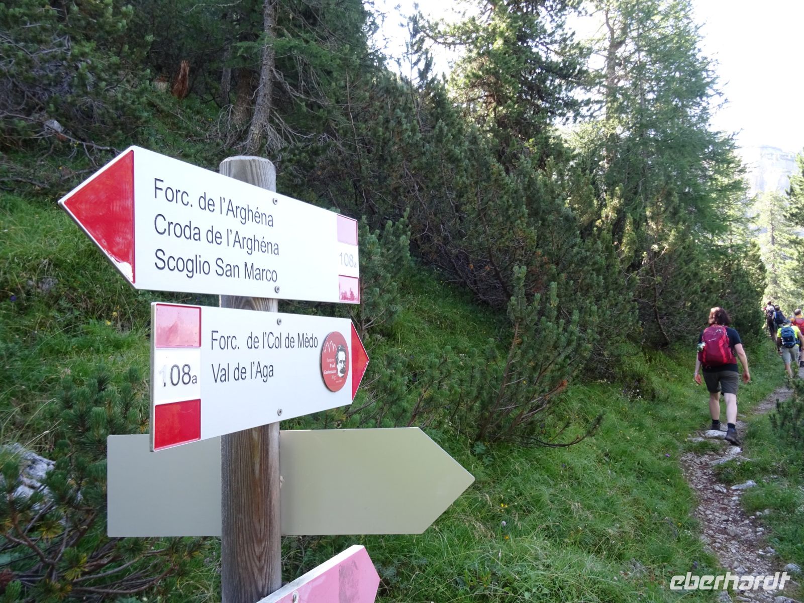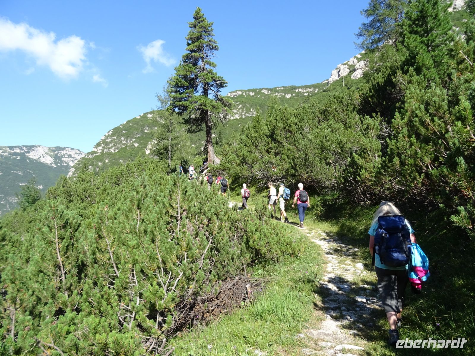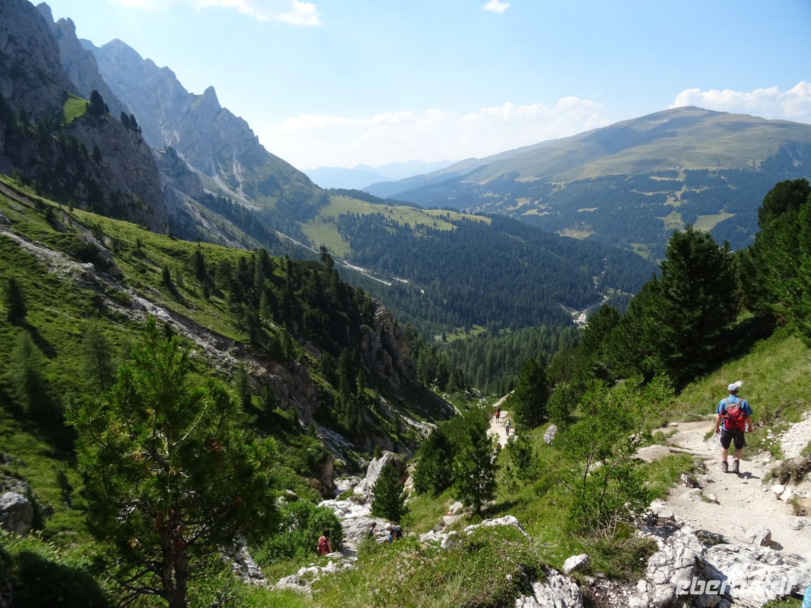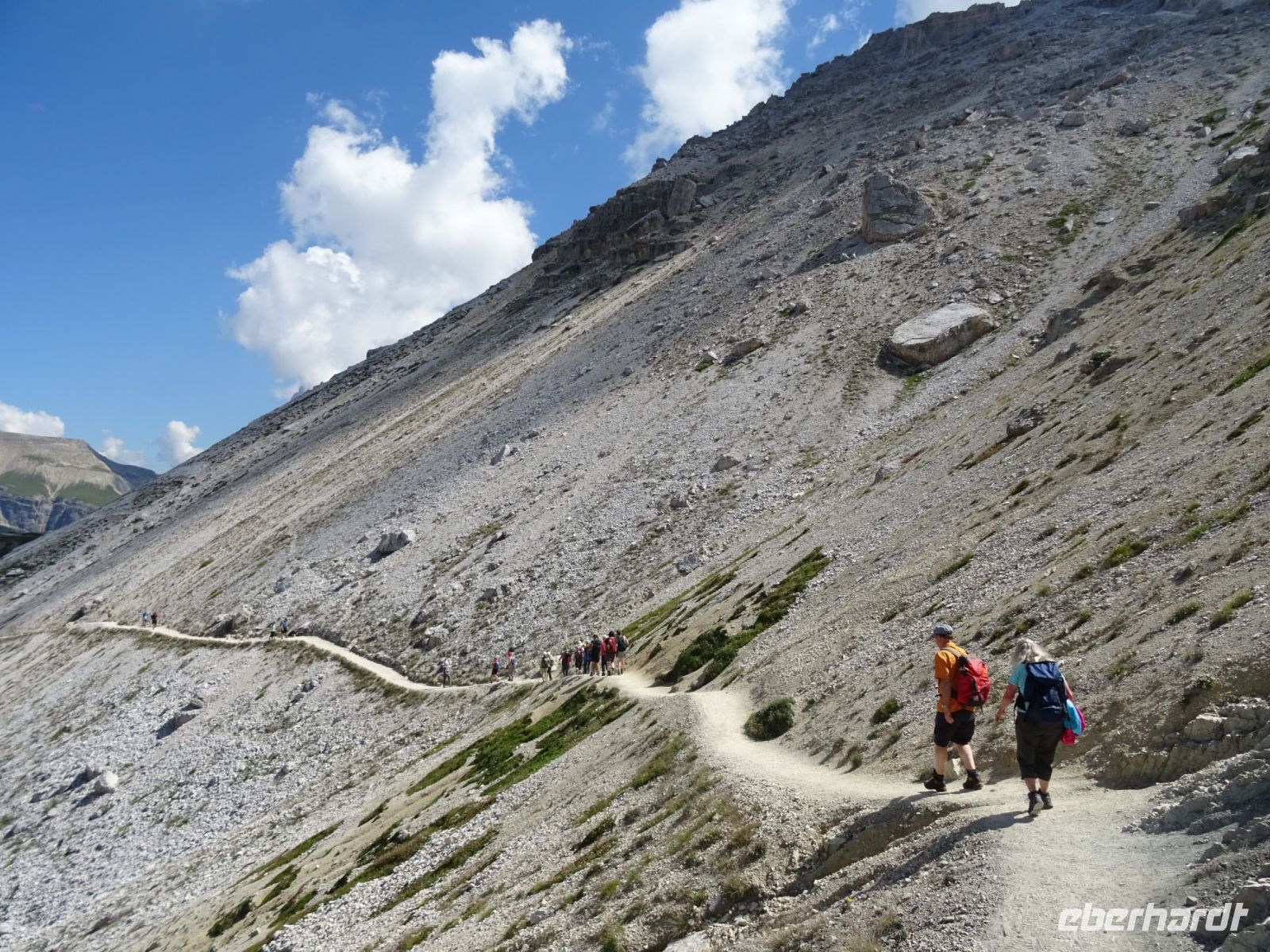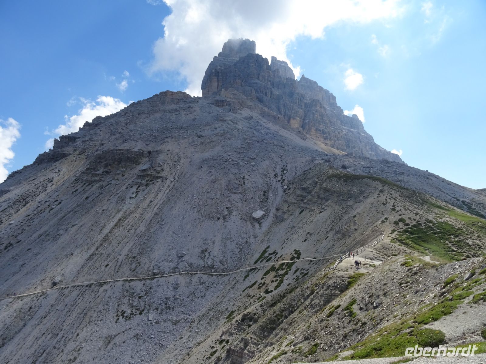 Mit den ersten Sonnenstrahlen schnüren wir unsere Wanderschuhe und packen unseren Rucksack, um mit Irmi bereits um sieben Uhr morgens mit dem Bus in die Sextener Dolomiten zu fahren. Aus der Erfahrung des letzten Jahres, nehmen wir das zeitige Aufstehen in Kauf um noch vor den ersten italienischen Touristen an den Drei Zinnen zu sein. Frühstück und Kaffee gibt es im Bus und so vergeht die Stunde Fahrtzeit wie im Flug. Die Drei Zinnen sind das Wahrzeichen der Dolomiten und somit ein beliebtes Ausflugsziel für Groß und Klein. Wir bewegen uns heute aber etwas abseits vom Trubel und beginnen unsere Tour auf circa 1900 Metern am Lago d’Antorno. Auf einem wenig begangenen Steig wandern wir von der Rinbiancoalm zur Forcella di Mezzo auf. Wir genießen die herrliche, morgendliche Ruhe, das Vögelgezwitscher und nehmen uns vor allem Zeit für die ersten, größeren Anstiege. Immer wieder pausieren wir, um das atemberaubende Panorama der Dolomiten aufzusaugen. Die Fotoapparate laufen jedenfalls heiß, denn vor dem tiefblauen Himmel wirken die Gipfel vom Monte Piano, der Cadini-Gruppe oder der Schusterspitze noch gewaltiger. Auf dem Hochplateau angekommen, legen wir erst einmal eine kleine Pause ein, bevor wir von dort weiter zur Langalm gehen und den gigantischem Blick auf die Nordwände der Zinnen bestaunen. Für ein paar Meter ist schon deutlich mehr Begängnis, aber immerhin ist die Mittagsrast in Sicht. Nach einer ausgiebigen Stärkung auf der Alm geht es zurück zur Forcella. Immer wieder lassen wir die Blicke zurück schweifen und sind stolz auf das was wir bereits geschafft haben. Der Abstieg geht nun etwas steiler und teilweise sehr uneben nach unten. Obacht ist angesagt und jeder nimmt sich ausreichend Zeit. Die Füße tragen uns wieder bis zum Ausgangspunkt unserer heutigen Tour. Unser Chauffeur Ricco erwartet uns bereits mit einem „kühlen Blonden“ und selbstverständlich stoßen wir bei einem Südtiroler Grappa auf diesen grandiosen, aber auch anspruchsvollen Tag an! Das leckere Menü im Hotel haben wir uns jedenfalls redlich verdient! Buona notte!
