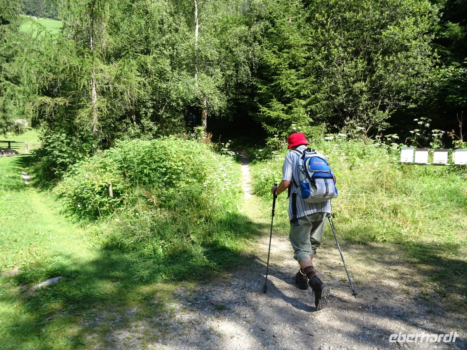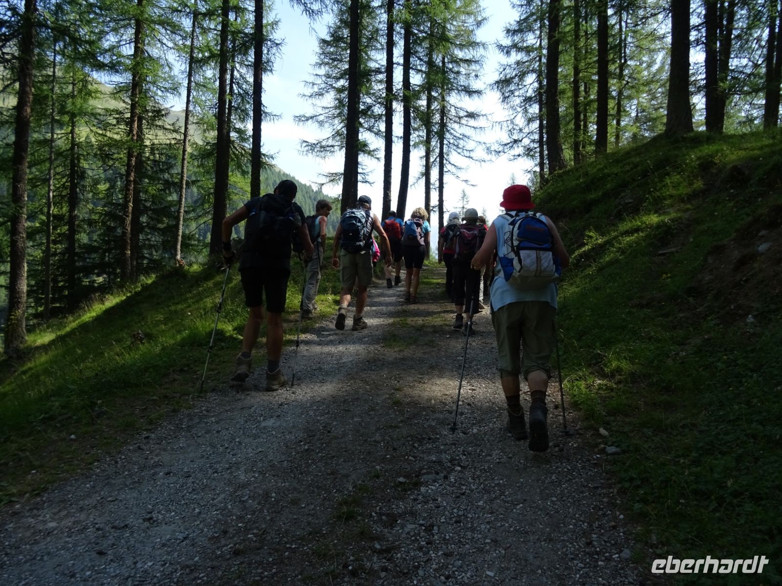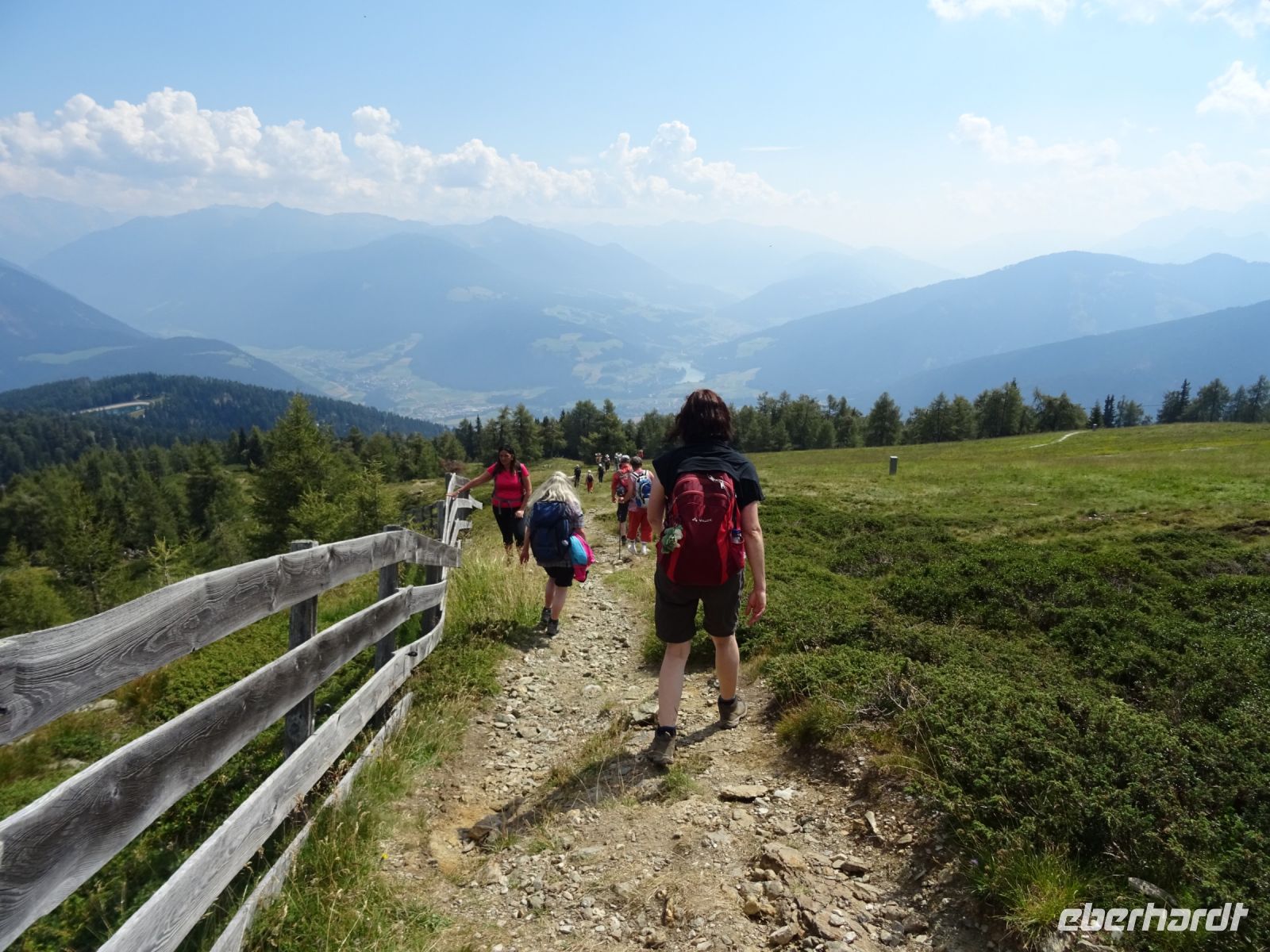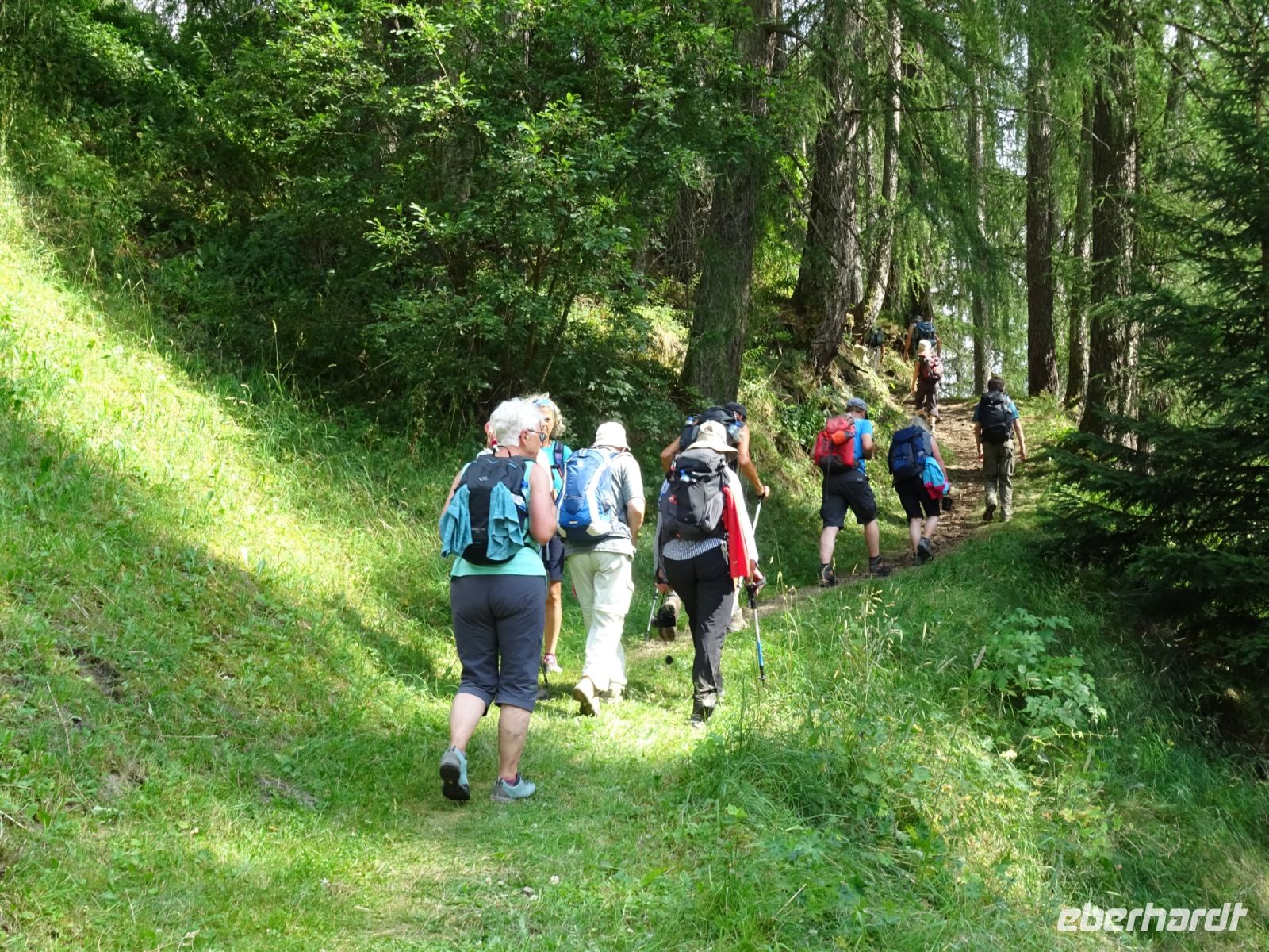 Wieder werden wir von der Sonne wachgekitzelt und stehen frisch gestärkt pünktlich am Bus, an dem uns der liebe Ricco und unsere Irmi bereits erwarten. Der heutige Wandertag führt uns in den beschaulichen Ort Antholz, wo eine einzigartige Naturlandschaft schon darauf wartet, von uns erkundet zu werden. Erst einmal geht der Weg etwas steiler aufwärts Richtung Eggerhöfe. Wir nehmen uns Zeit und legen immer wieder ein kleines Verschnaufpäuschen ein, damit wir die grandiose Landschaft genießen können. Auf Grund des sehr warmen Wetters sparen wir uns den Umweg zum Egger Wasserfall, den wir auch vom Weg aus bestaunen können. Es geht nun auf direktem Wege immer entlang eines breiten Forstweges zum Klammbachwasserfall, der uns ebenfalls tief beeindruckt. Die tosenden Wassermassen kühlen die Luft spürbar ab und wir nutzen das tolle Panorama für ein Gruppenfoto. Auf dem Weg zur Bergeralm trennen wir uns kurz – so gehen die abenteuerlustigen Bergziegen die steile Abkürzung durch den Wald hinauf und die genussvolleren Gemsen den gemütlichen Forstweg weiter. Aber da ja niemand verloren gehen kann, treffen wir uns schon nach einigen