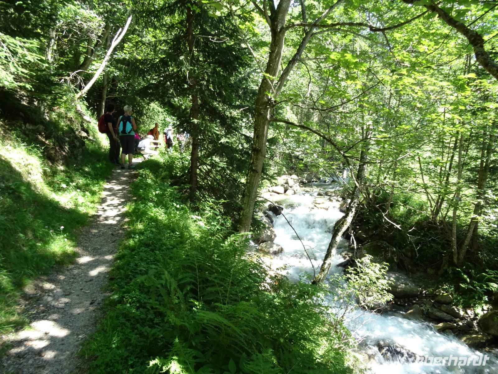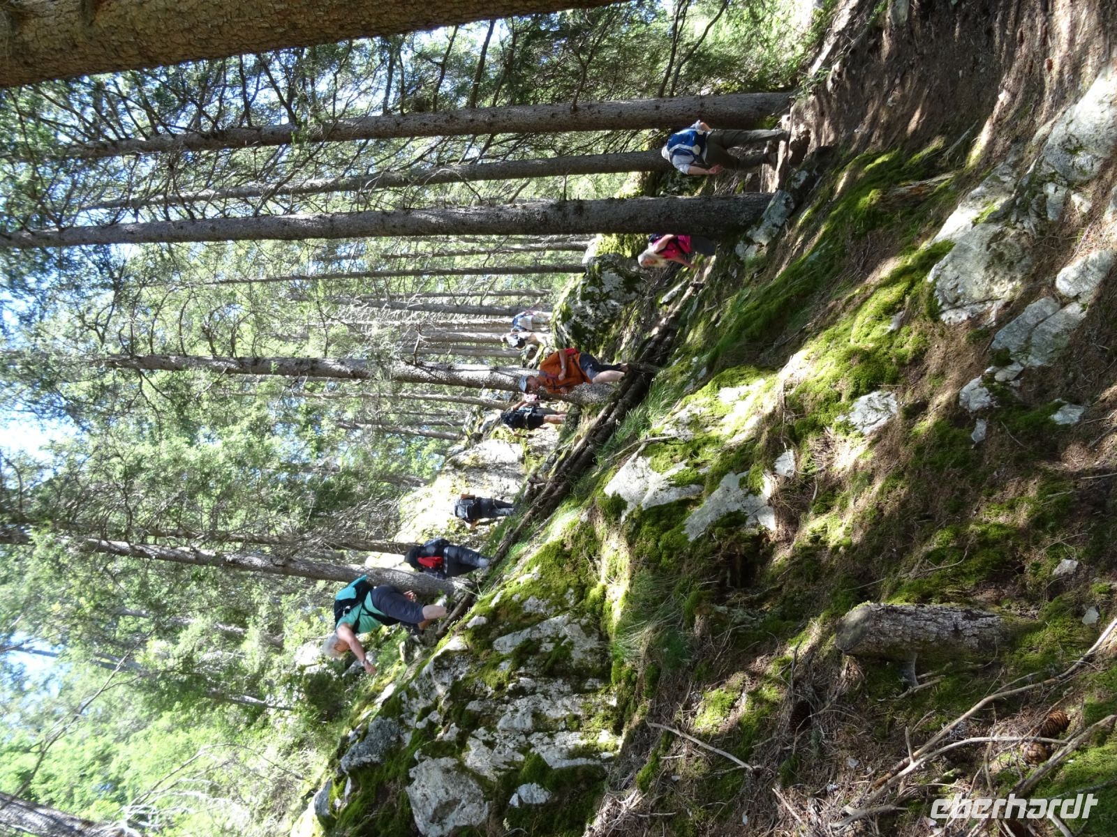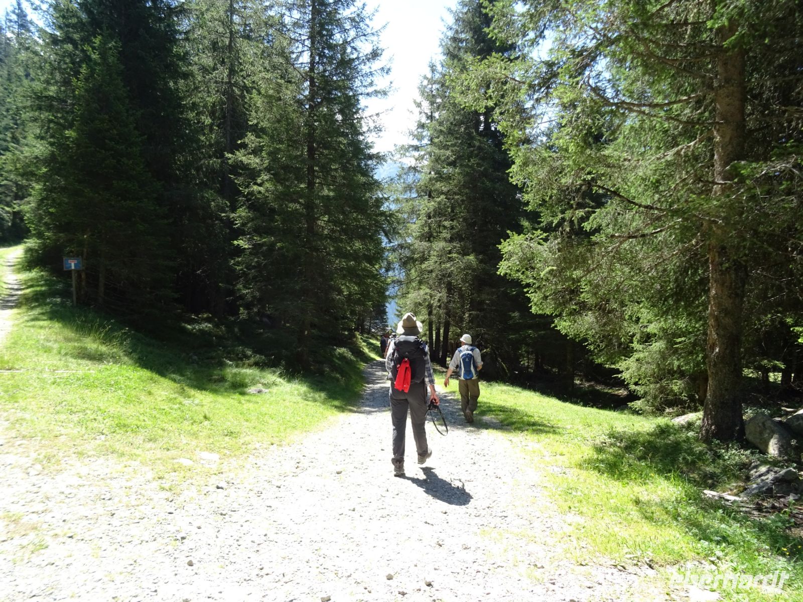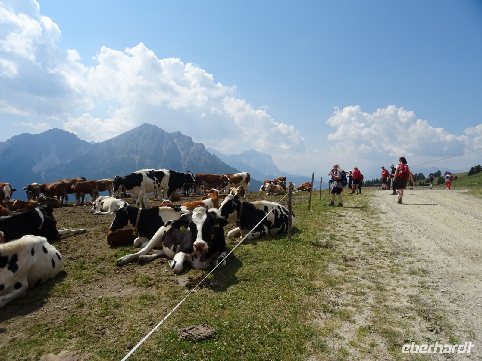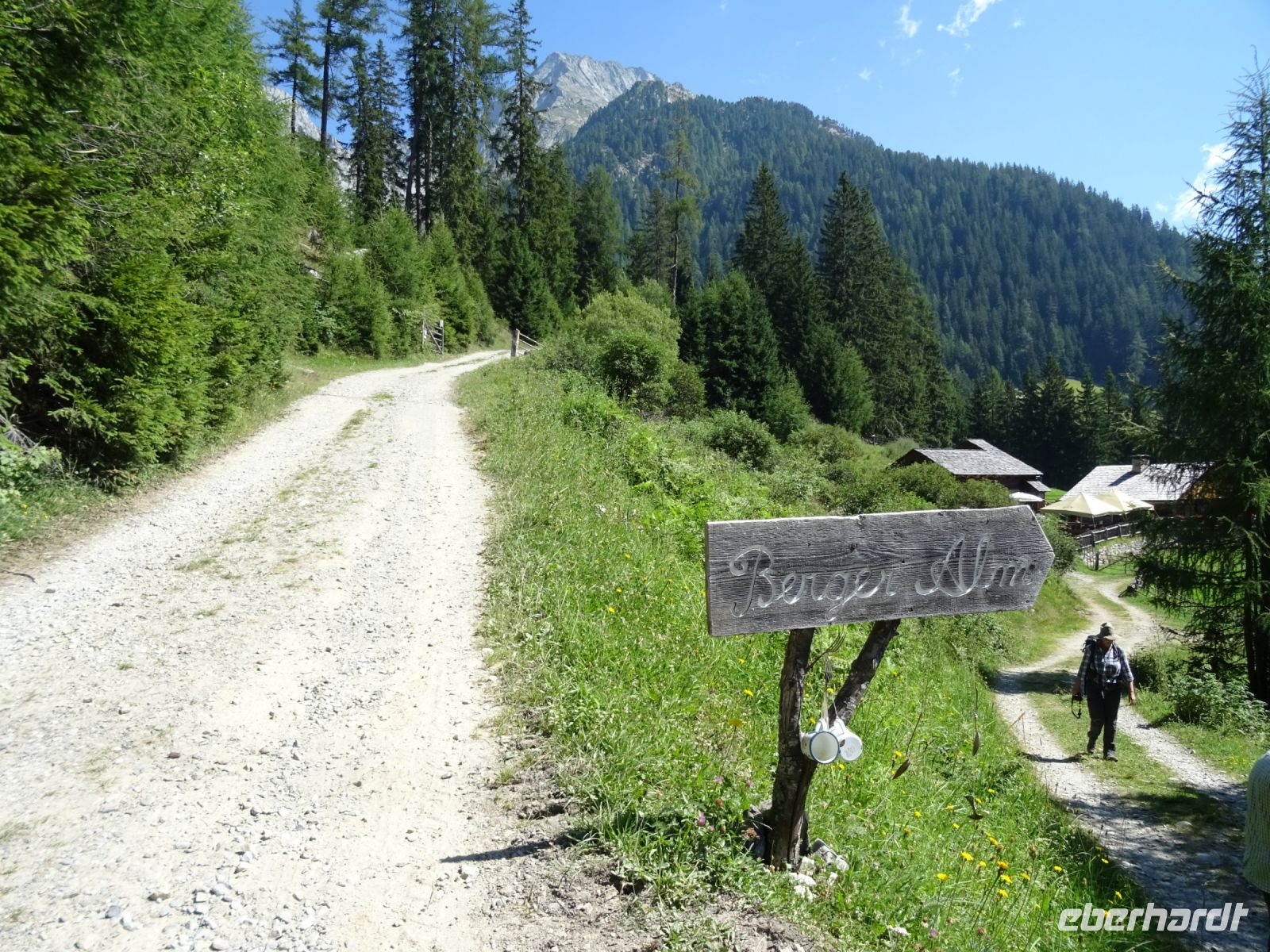 Wieder werden wir von der Sonne wachgekitzelt und stehen frisch gestärkt pünktlich am Bus, an dem uns der liebe Ricco und unsere Irmi bereits erwarten. Der heutige Wandertag führt uns in den beschaulichen Ort Antholz, wo eine einzigartige Naturlandschaft schon darauf wartet, von uns erkundet zu werden. Erst einmal geht der Weg etwas steiler aufwärts Richtung Eggerhöfe. Wir nehmen uns Zeit und legen immer wieder ein kleines Verschnaufpäuschen ein, damit wir die grandiose Landschaft genießen können. Auf Grund des sehr warmen Wetters sparen wir uns den Umweg zum Egger Wasserfall, den wir auch vom Weg aus bestaunen können. Es geht nun auf direktem Wege immer entlang eines breiten Forstweges zum Klammbachwasserfall, der uns ebenfalls tief beeindruckt. Die tosenden Wassermassen kühlen die Luft spürbar ab und wir nutzen das tolle Panorama für ein Gruppenfoto. Auf dem Weg zur Bergeralm trennen wir uns kurz – so gehen die abenteuerlustigen Bergziegen die steile Abkürzung durch den Wald hinauf und die genussvolleren Gemsen den gemütlichen Forstweg weiter. Aber da ja niemand verloren gehen kann, treffen wir uns schon nach einigen
