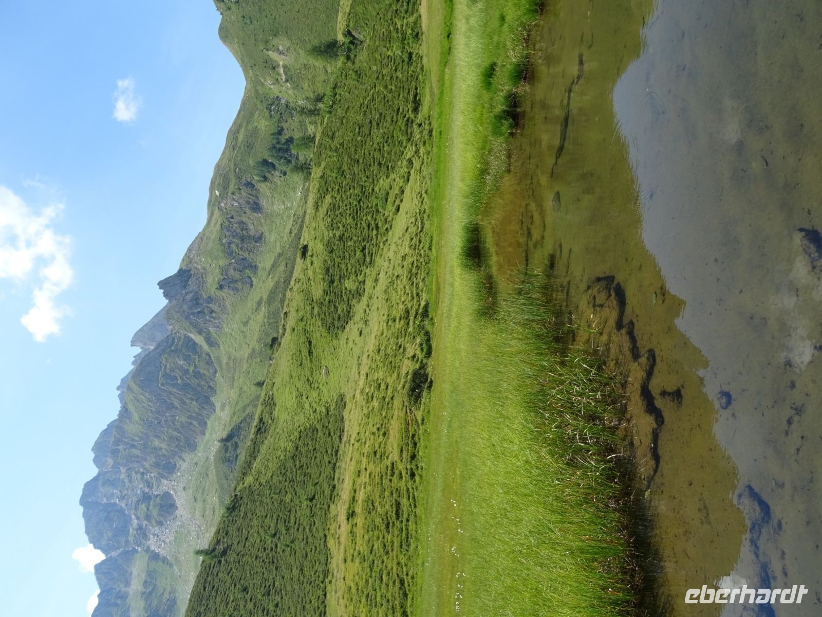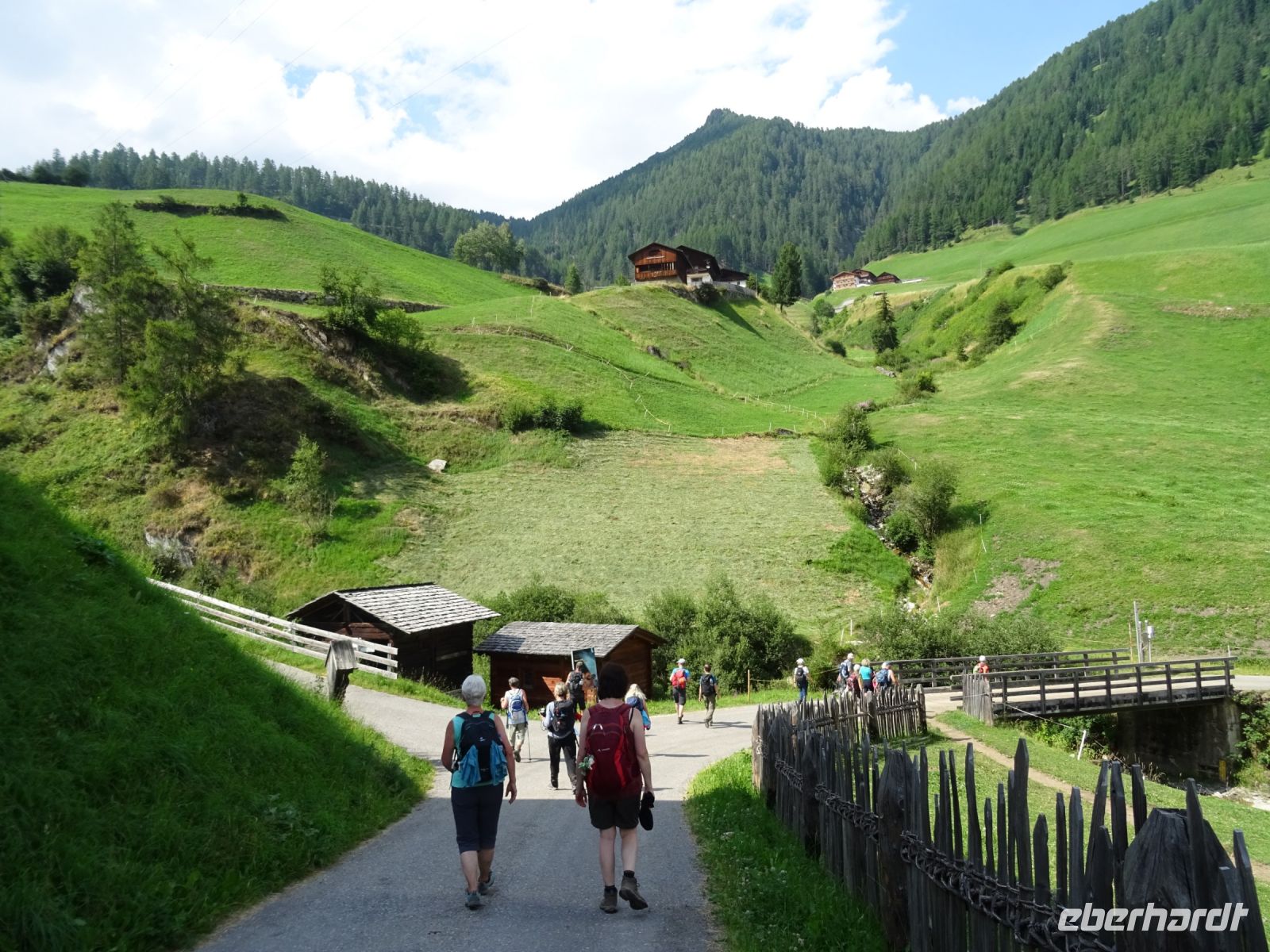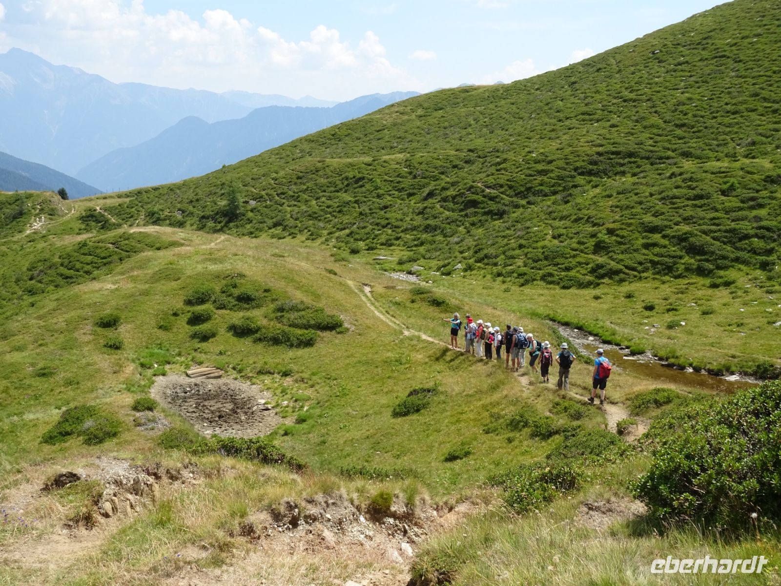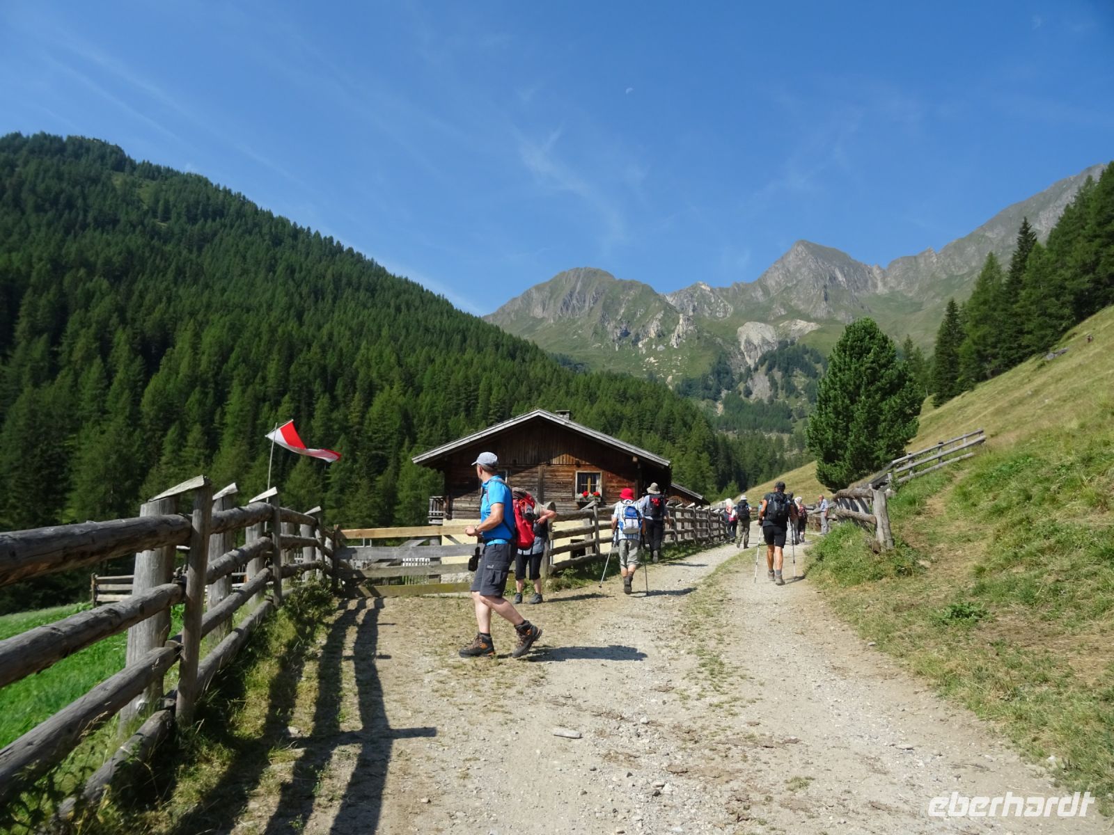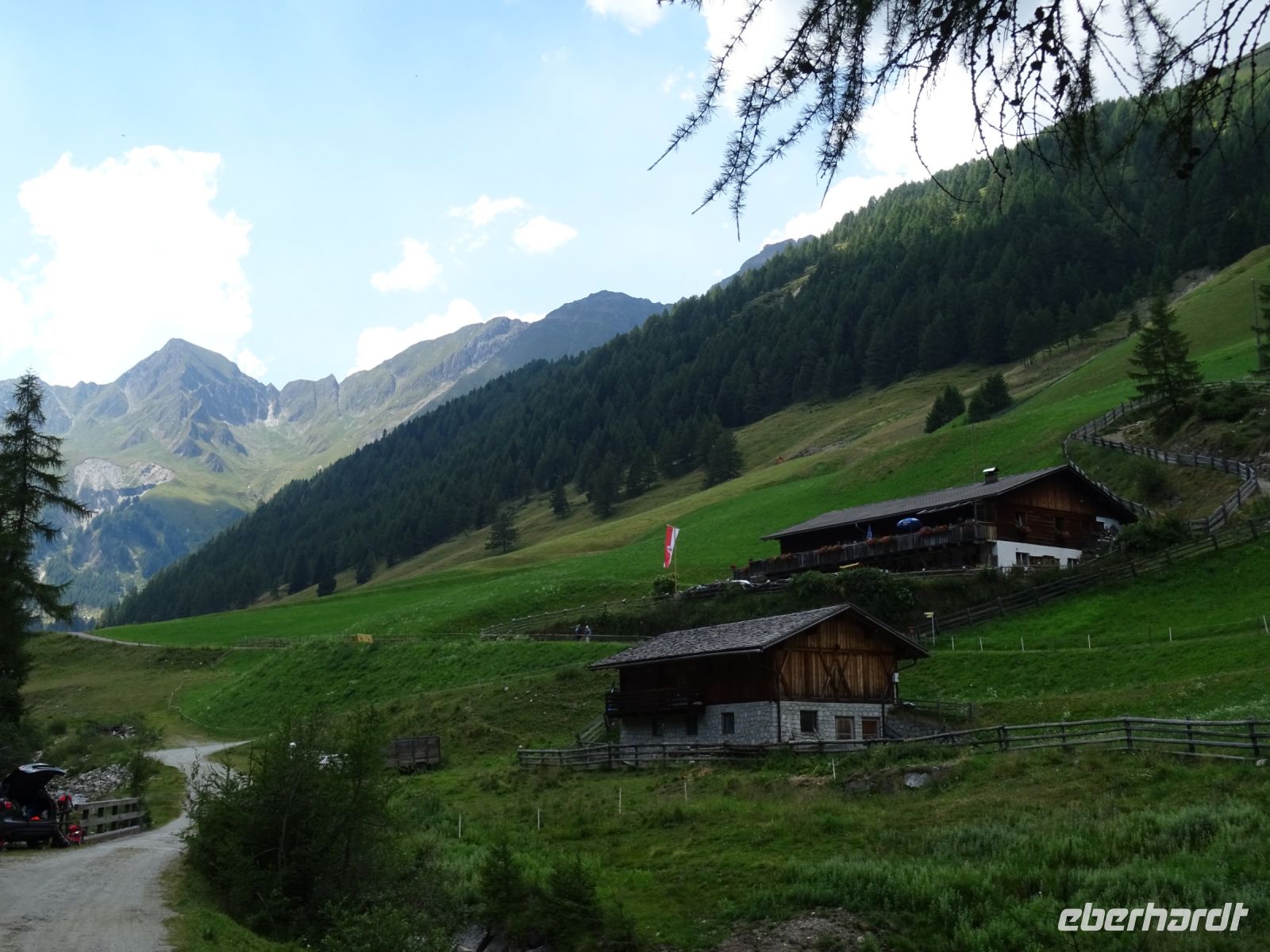 Zwar waren die Beine heute noch etwas müde vom gestrigen Tag, nichtsdestotrotz ruft auch heute wieder der Berg. Dieses Mal die Eggespitz im Ahrntal bzw. genauer im Lappacher Tal. Da für die kommenden Tage am Nachmittag Gewitter gemeldet sind, ziehen wir unsere Freitagstour vor. Nach gut einer Stunde sind wir nun in Lappach auf 1.439 m angekommen und werden mit zwei Taxen zum eigentlichen Ausgangspunkt der Tour chauffiert. Die weitere Zufahrt mit dem Bus ist leider nicht möglich. Nun laufen wir mit unserer Irmi durch die Klamm des Mühlwalder Baches in das Zösental hinauf. Nach der Mair-zu-Hof-Alm gelangen wir auf einem breiten, leicht ansteigenden Weg zu einer Hochfläche, den sogenannten Flemmsee, der leider durch die langanhaltende Trockenheit nicht mehr so Wasser durchtränkt ist, wie gewöhnlich. Aber dennoch können wir tolle Spiegelbilder bewundern und auch die umliegende Wiesenlandschaft sowie die Ausläufer