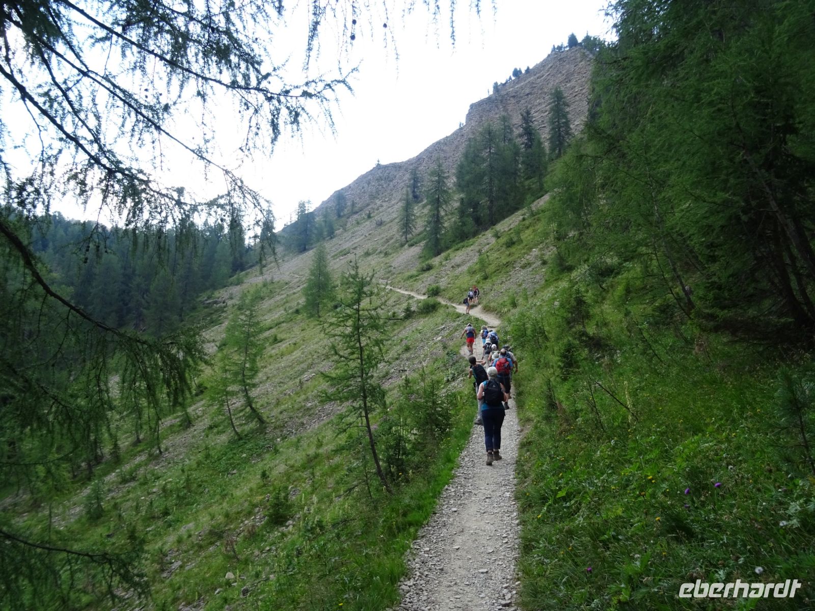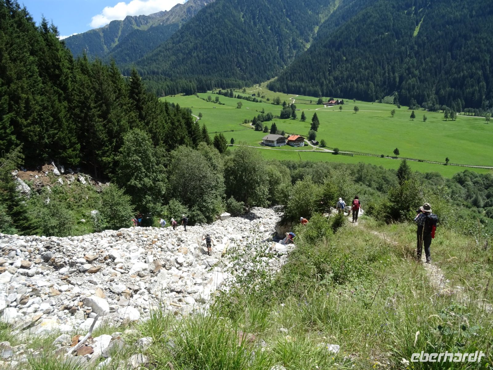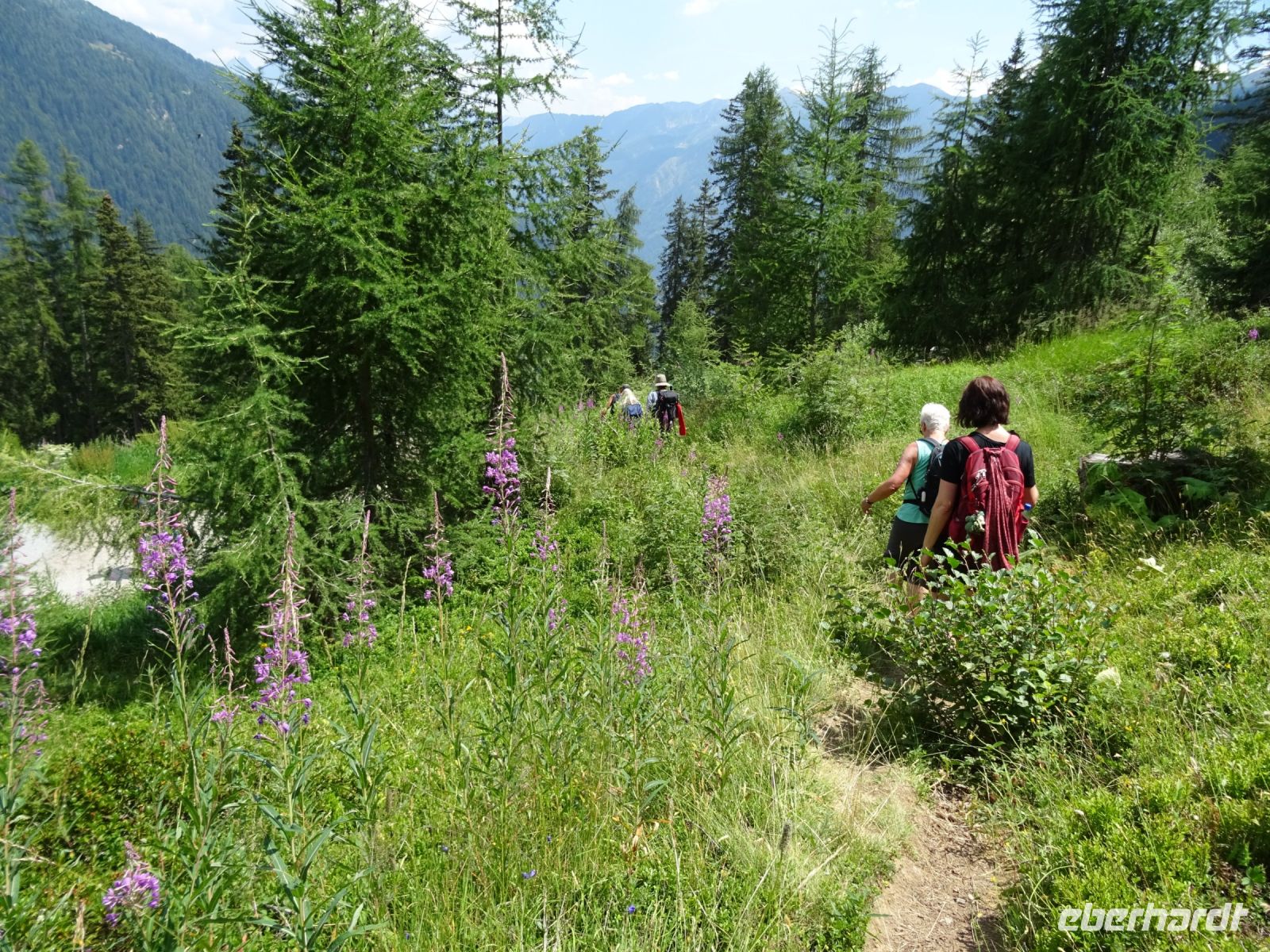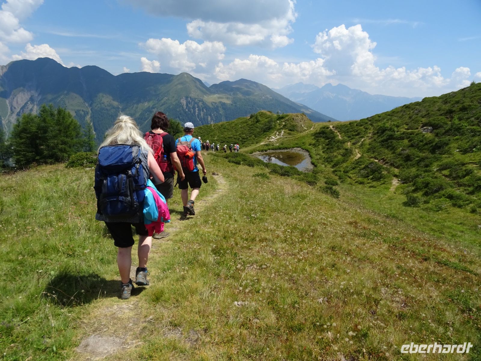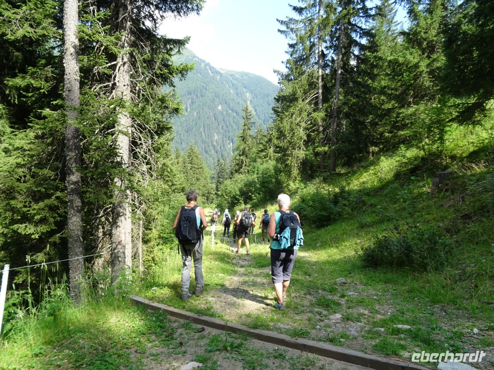 Zwar waren die Beine heute noch etwas müde vom gestrigen Tag, nichtsdestotrotz ruft auch heute wieder der Berg. Dieses Mal die Eggespitz im Ahrntal bzw. genauer im Lappacher Tal. Da für die kommenden Tage am Nachmittag Gewitter gemeldet sind, ziehen wir unsere Freitagstour vor. Nach gut einer Stunde sind wir nun in Lappach auf 1.439 m angekommen und werden mit zwei Taxen zum eigentlichen Ausgangspunkt der Tour chauffiert. Die weitere Zufahrt mit dem Bus ist leider nicht möglich. Nun laufen wir mit unserer Irmi durch die Klamm des Mühlwalder Baches in das Zösental hinauf. Nach der Mair-zu-Hof-Alm gelangen wir auf einem breiten, leicht ansteigenden Weg zu einer Hochfläche, den sogenannten Flemmsee, der leider durch die langanhaltende Trockenheit nicht mehr so Wasser durchtränkt ist, wie gewöhnlich. Aber dennoch können wir tolle Spiegelbilder bewundern und auch die umliegende Wiesenlandschaft sowie die Ausläufer