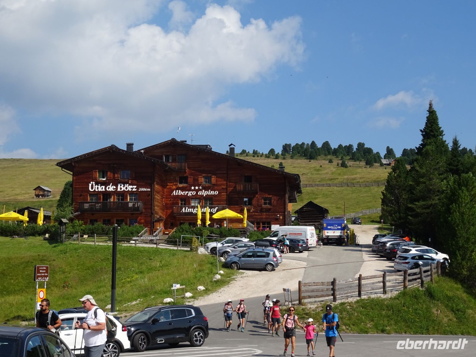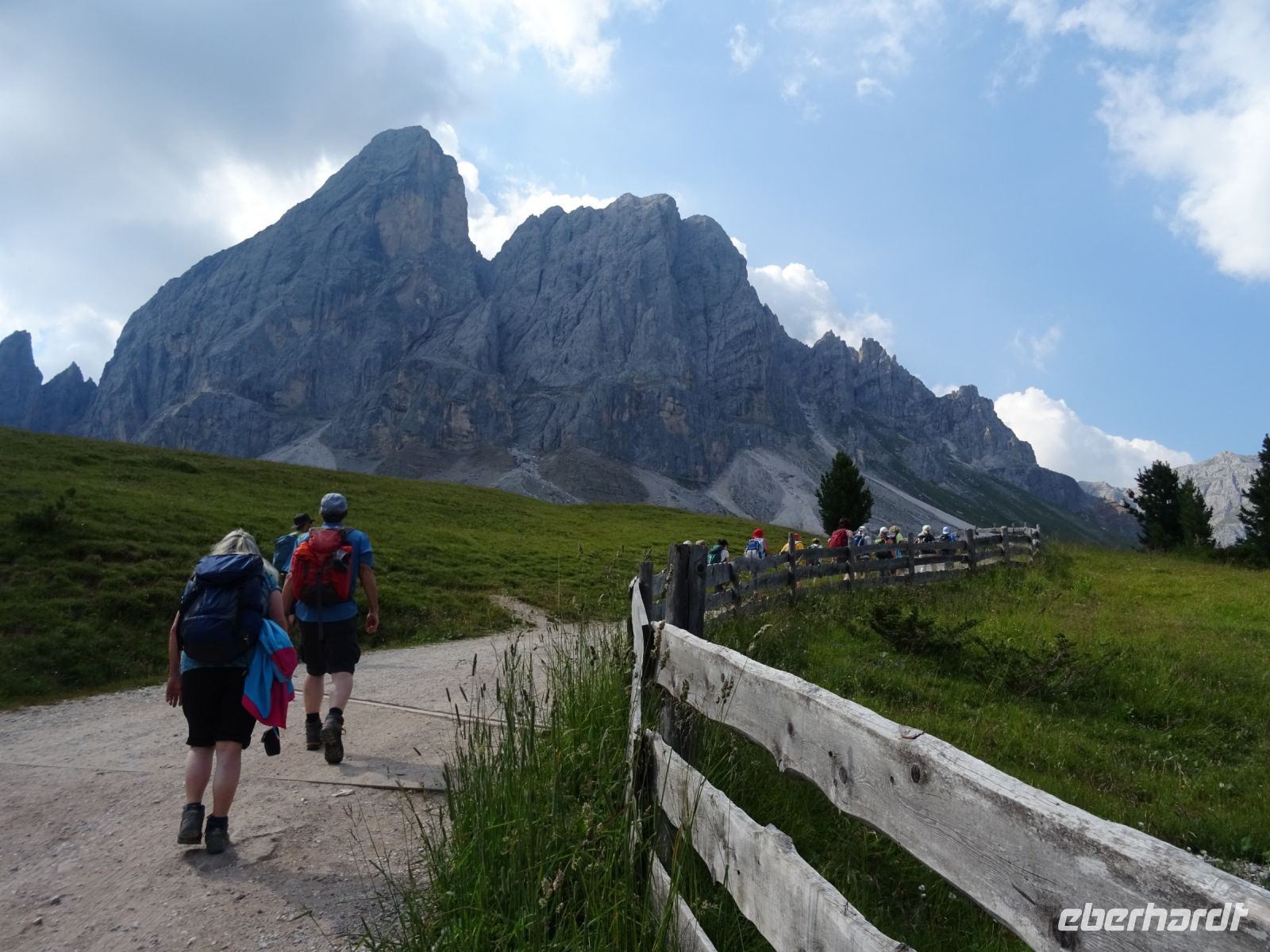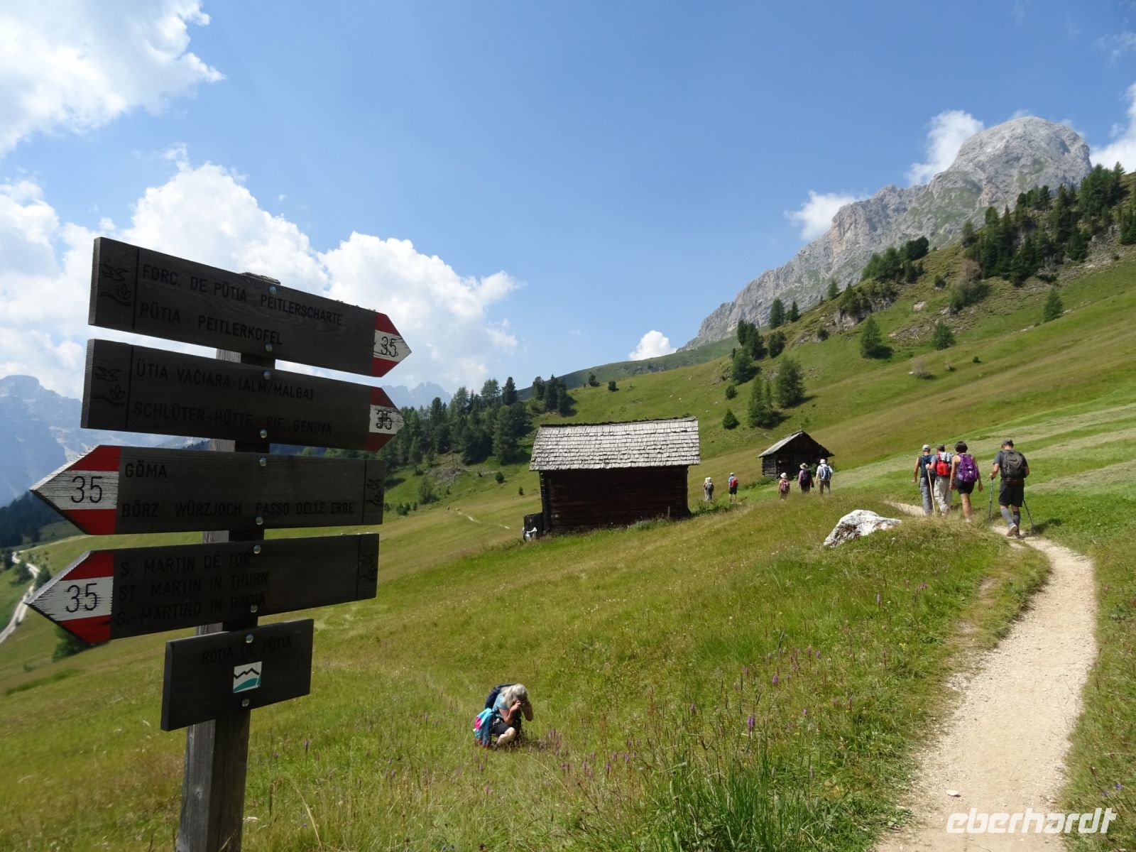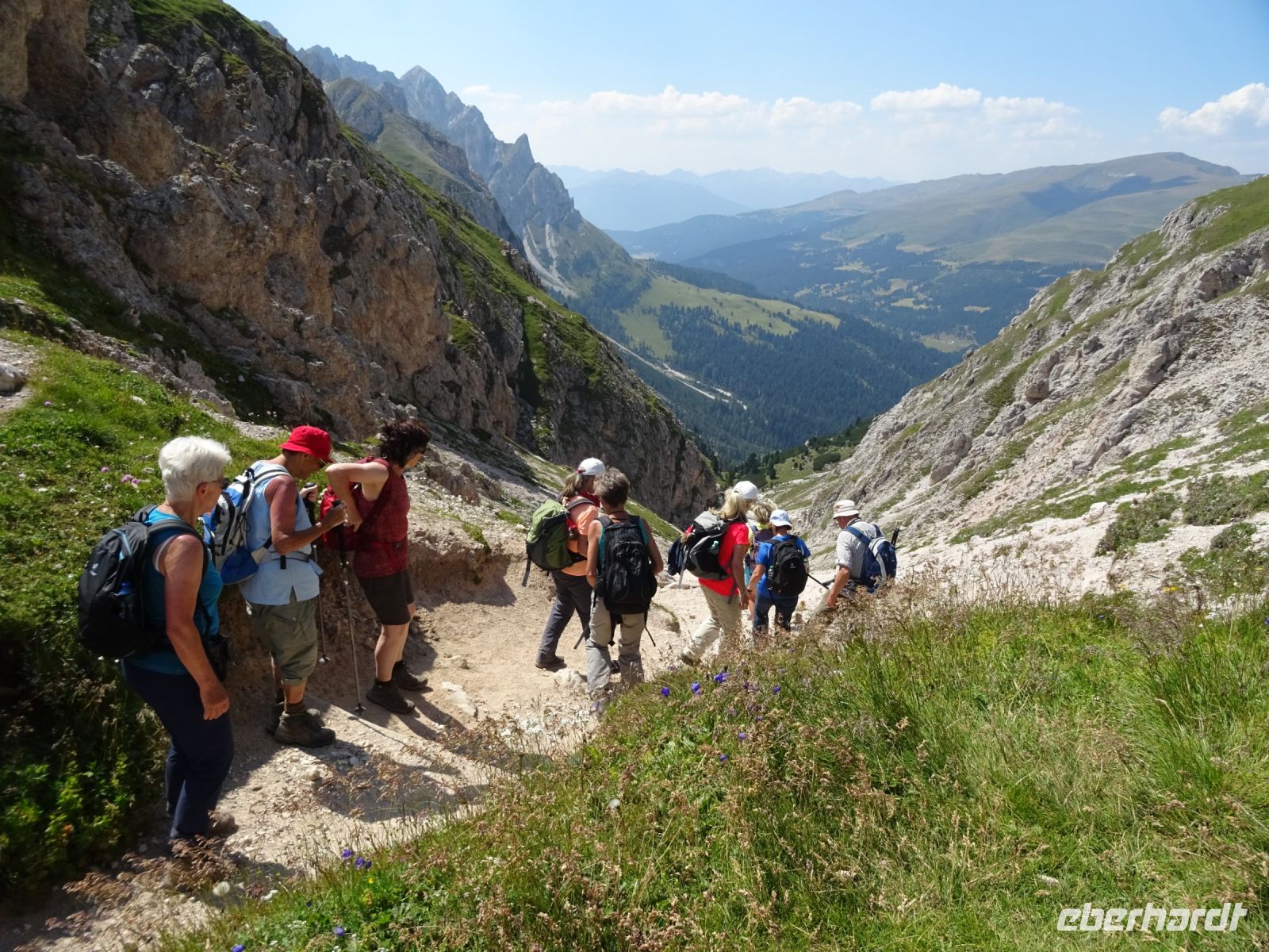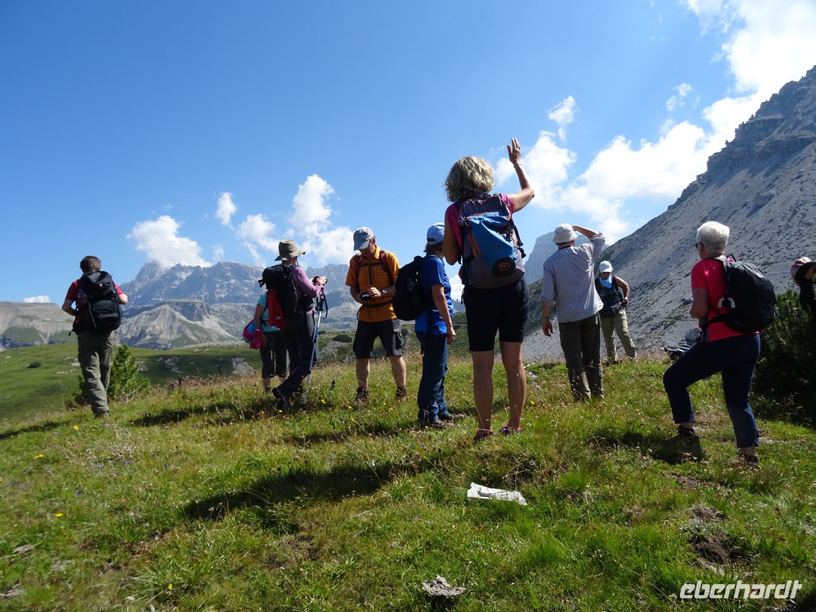Auch an unserem letzten Wandertag auf dieser schönen Reise starten wir bei perfektem Wetter vom Hotel und lassen uns von Ricco 1 Stunde auf den Parkplatz am Würzjoch (1.987 m) chauffieren. Auch Irmi ist wieder bestens gelaunt und freut sich mit uns auf diese tolle und auch lange Tour. Vom etwas überfüllten Parkplatz führt mit etwas Anstieg der Wanderweg hinauf und wir erblicken bald eine herrliche Bergwiese. Die Flora, welche uns auf unserem Aufstieg begleitet, sucht ihresgleichen. Bunte Almwiesen, blauer Himmel und der gewaltige Peitlerkofel thront vor unseren Augen. Immer wieder legen wir eine Trinkpause ein, denn auch heute ist es wieder sehr warm. Schritt für Schritt wandern wir weiter Richtung Osten durch lichte Wälder bis zum Gömajoch (2111m) hinauf. Hier ist noch Zeit für ein Foto mit dem gewaltigen Holzadler und natürlich auch um diese atemberaubende Aussicht zu genießen. Wir sind dankbar, dass der Wettergott es diese Woche so gut mit uns meint und so geht es nach dieser kurzen Pause weiter entlang der Südseite des Peitlerkofels bergauf und vorbei an entzückenden und noch bunteren Wiesen. Bevor wir uns zum höchsten Punkt unserer Wanderung aufmachen, stärken wir uns erst einmal auf der Alm bei einer deftigen Knödelsuppe und einem erfrischenden Getränk. Wieder schweifen unsere Blicke in die beeindruckende Bergwelt, aber wir hören sie schon rufen, die Peitlerscharte. Nun geht es auch schon los und wir bezwingen die nächsten 300 Höhenmeter - jeder in seinem Tempo. An der Peitlerscharte auf 2357 Metern angekommen, genießen wir die Natur, atmen tief durch und nutzen die Pause um ausgiebig zu trinken, bevor wir den Abstieg wagen. Dieser fällt etwas anspruchsvoller aus und die Überquerung von Schottersteigen und Felsschrofen erfordert schon ein gewisses Maß an Schwindelfreiheit und Trittsicherheit. Wir werden von den Alpendohlen begleitet und sogar in den Schottermassen haben sich der zartgelbe Alpenmohn versteckt. Unten angekommen, ist noch Zeit den gewaltigen Peitlerkofel in der Nachmittagssonne zu fotografieren, aber auch vor allem den Anblick ganz fest im Herzen zu speichern. Ricco erwartet uns bereits sehnsüchtig am Bus und glücklich und etwas erschöpft fahren wir zurück ins Hotel. Nicht aber ohne unseren Gipfel-Grappa, den sich heute jeder redlich verdient hat!.