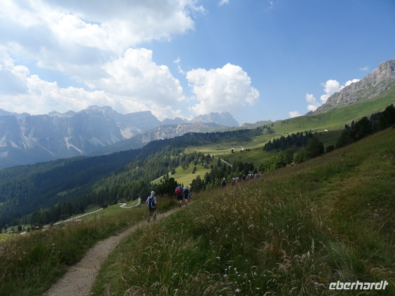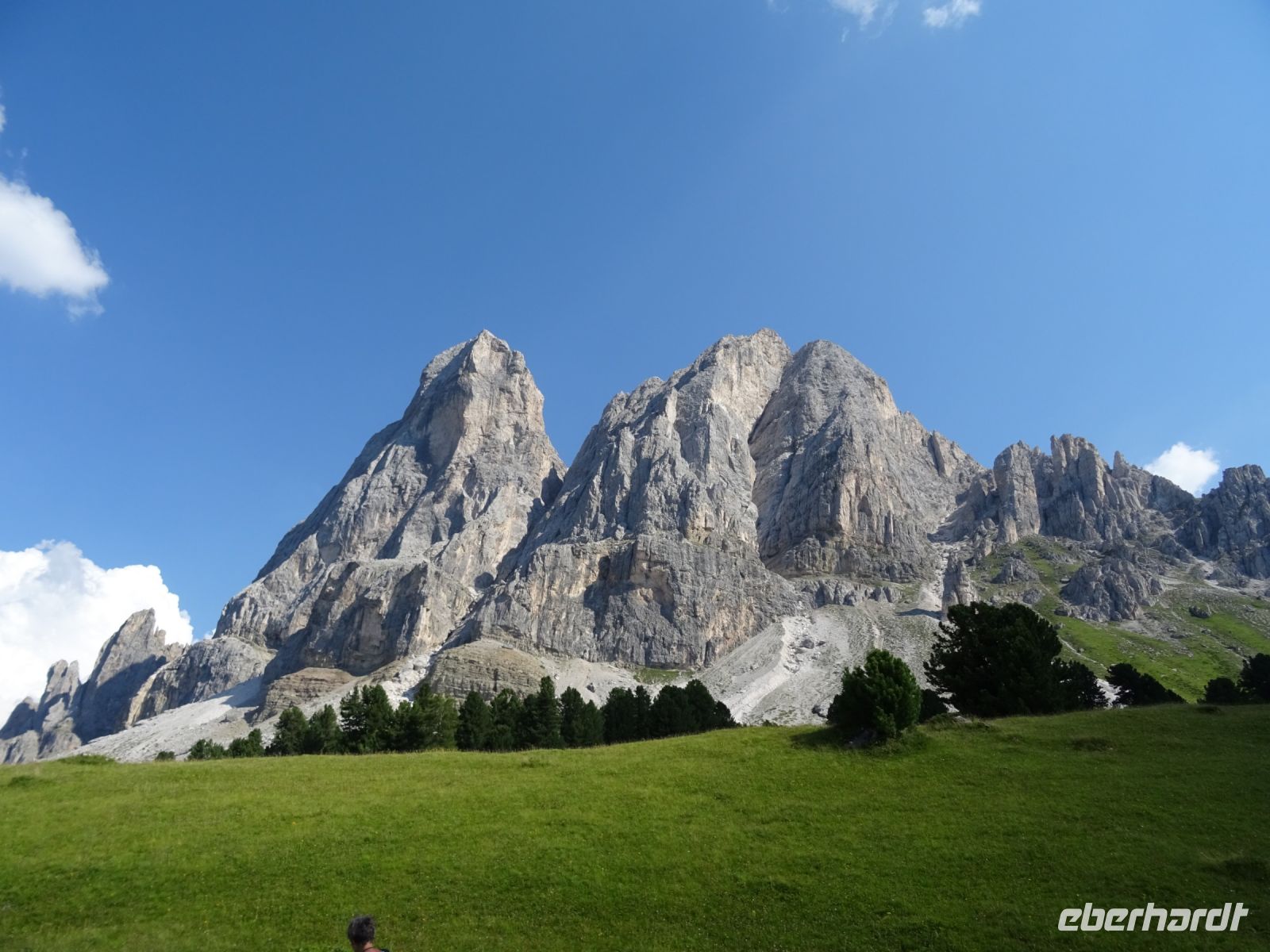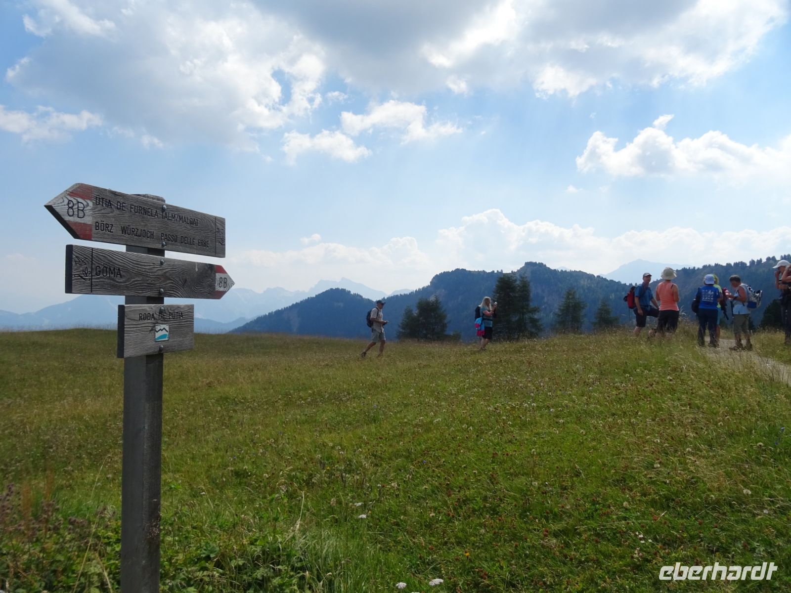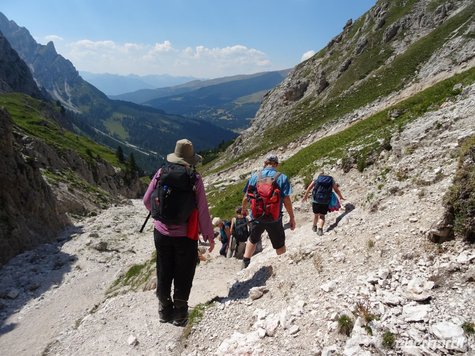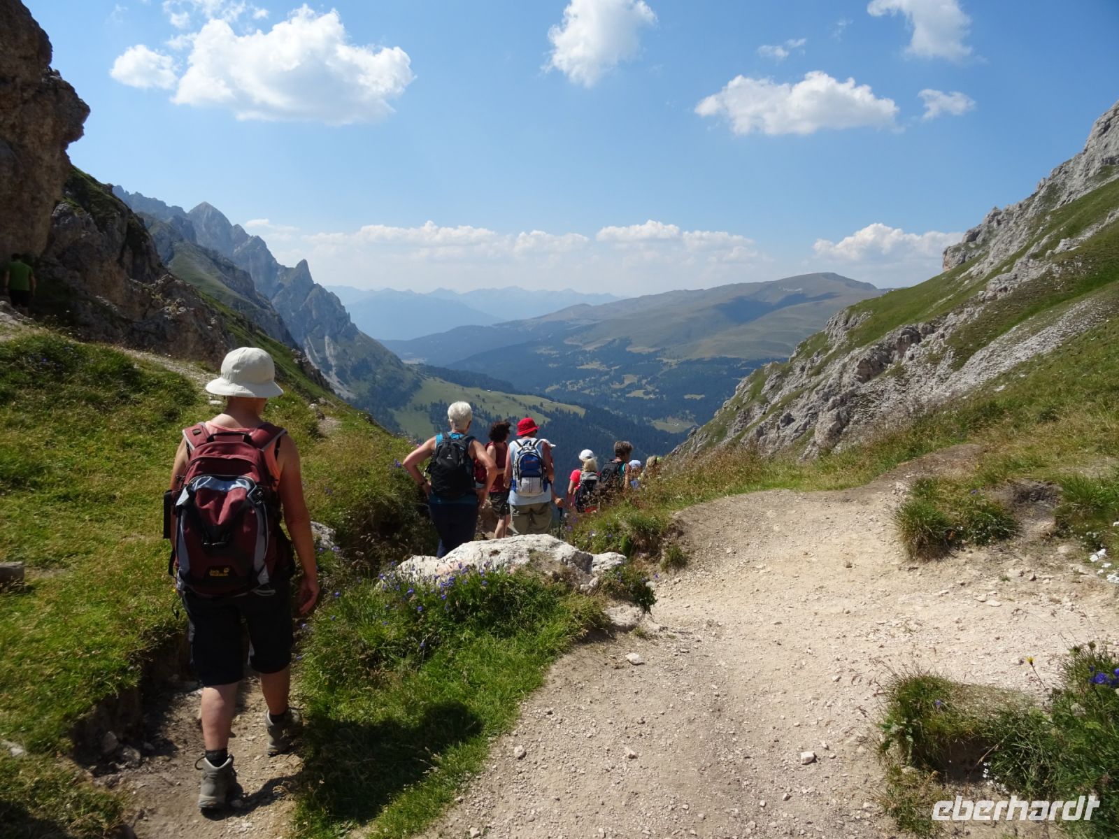 Auch an unserem letzten Wandertag auf dieser schönen Reise starten wir bei perfektem Wetter vom Hotel und lassen uns von Ricco 1 Stunde auf den Parkplatz am Würzjoch (1.987 m) chauffieren. Auch Irmi ist wieder bestens gelaunt und freut sich mit uns auf diese tolle und auch lange Tour. Vom etwas überfüllten Parkplatz führt mit etwas Anstieg der Wanderweg hinauf und wir erblicken bald eine herrliche Bergwiese. Die Flora, welche uns auf unserem Aufstieg begleitet, sucht ihresgleichen. Bunte Almwiesen, blauer Himmel und der gewaltige Peitlerkofel thront vor unseren Augen. Immer wieder legen wir eine Trinkpause ein, denn auch heute ist es wieder sehr warm. Schritt für Schritt wandern wir weiter Richtung Osten durch lichte Wälder bis zum Gömajoch (2111m) hinauf. Hier ist noch Zeit für ein Foto mit dem gewaltigen Holzadler und natürlich auch um diese atemberaubende Aussicht zu genießen. Wir sind dankbar, dass der Wettergott es diese Woche so gut mit uns meint und so geht es nach dieser kurzen Pause weiter entlang der Südseite des Peitlerkofels bergauf und vorbei an entzückenden und noch bunteren Wiesen. Bevor wir uns zum höchsten Punkt unserer Wanderung aufmachen, stärken wir uns erst einmal auf der Alm bei einer deftigen Knödelsuppe und einem erfrischenden Getränk. Wieder schweifen unsere Blicke in die beeindruckende Bergwelt, aber wir hören sie schon rufen, die Peitlerscharte. Nun geht es auch schon los und wir bezwingen die nächsten 300 Höhenmeter - jeder in seinem Tempo. An der Peitlerscharte auf 2357 Metern angekommen, genießen wir die Natur, atmen tief durch und nutzen die Pause um ausgiebig zu trinken, bevor wir den Abstieg wagen. Dieser fällt etwas anspruchsvoller aus und die Überquerung von Schottersteigen und Felsschrofen erfordert schon ein gewisses Maß an Schwindelfreiheit und Trittsicherheit. Wir werden von den Alpendohlen begleitet und sogar in den Schottermassen haben sich der zartgelbe Alpenmohn versteckt. Unten angekommen, ist noch Zeit den gewaltigen Peitlerkofel in der Nachmittagssonne zu fotografieren, aber auch vor allem den Anblick ganz fest im Herzen zu speichern. Ricco erwartet uns bereits sehnsüchtig am Bus und glücklich und etwas erschöpft fahren wir zurück ins Hotel. Nicht aber ohne unseren Gipfel-Grappa, den sich heute jeder redlich verdient hat!.
