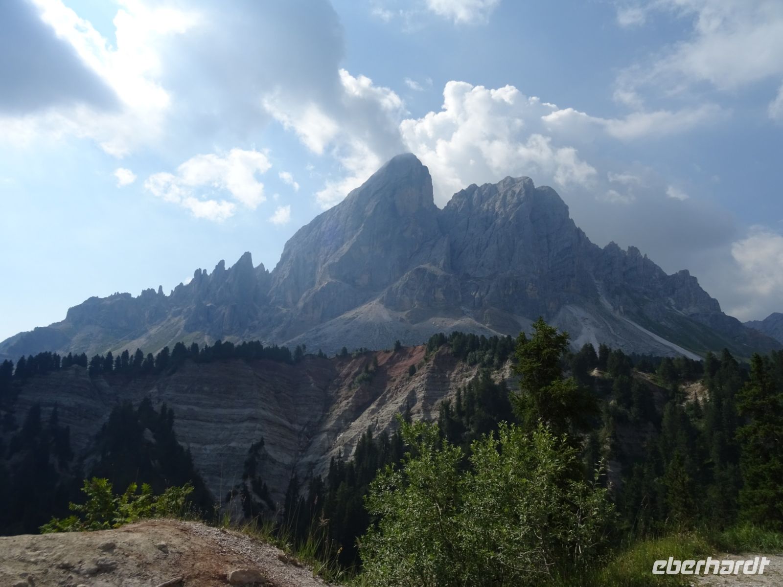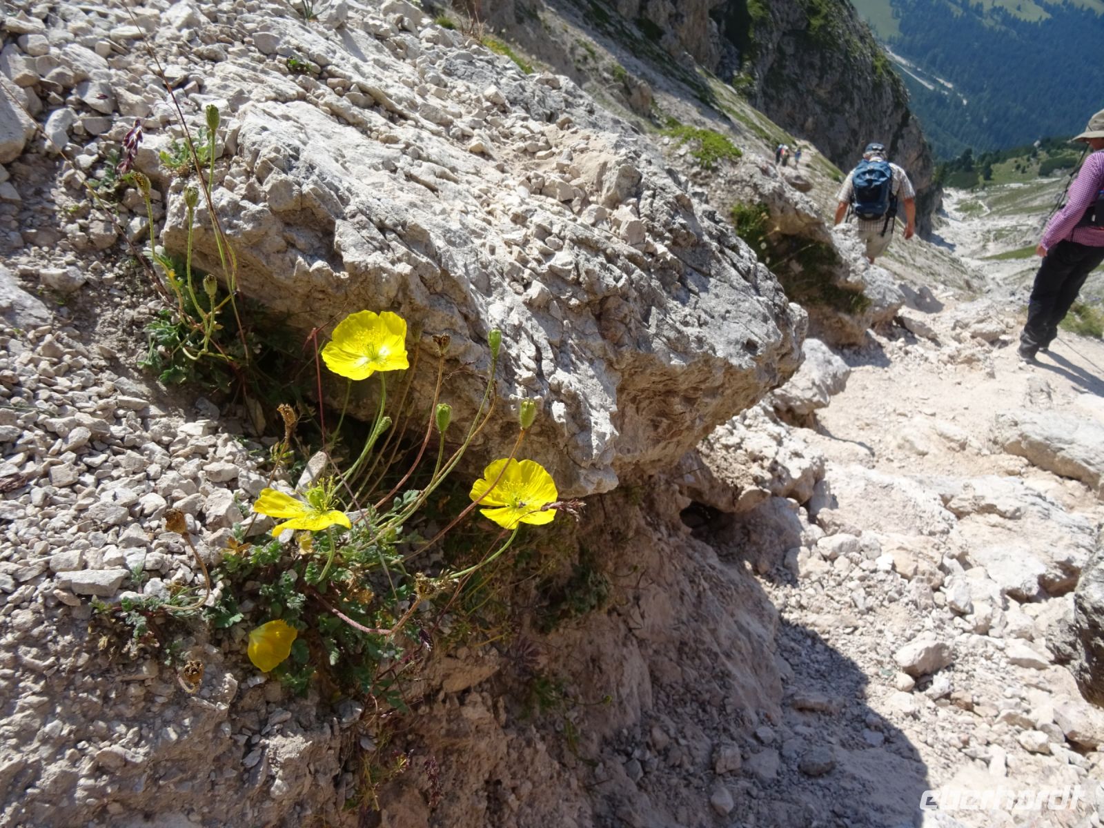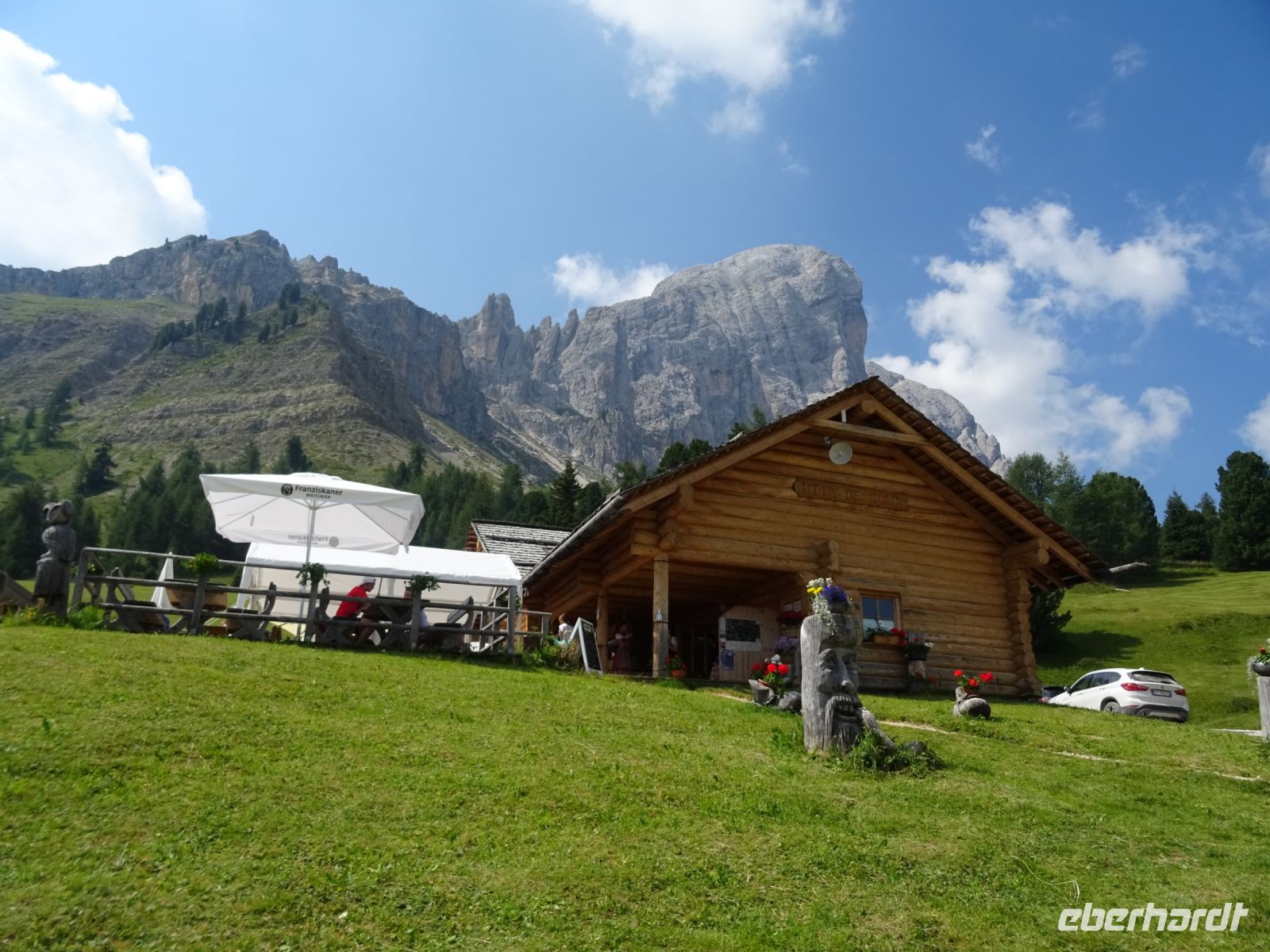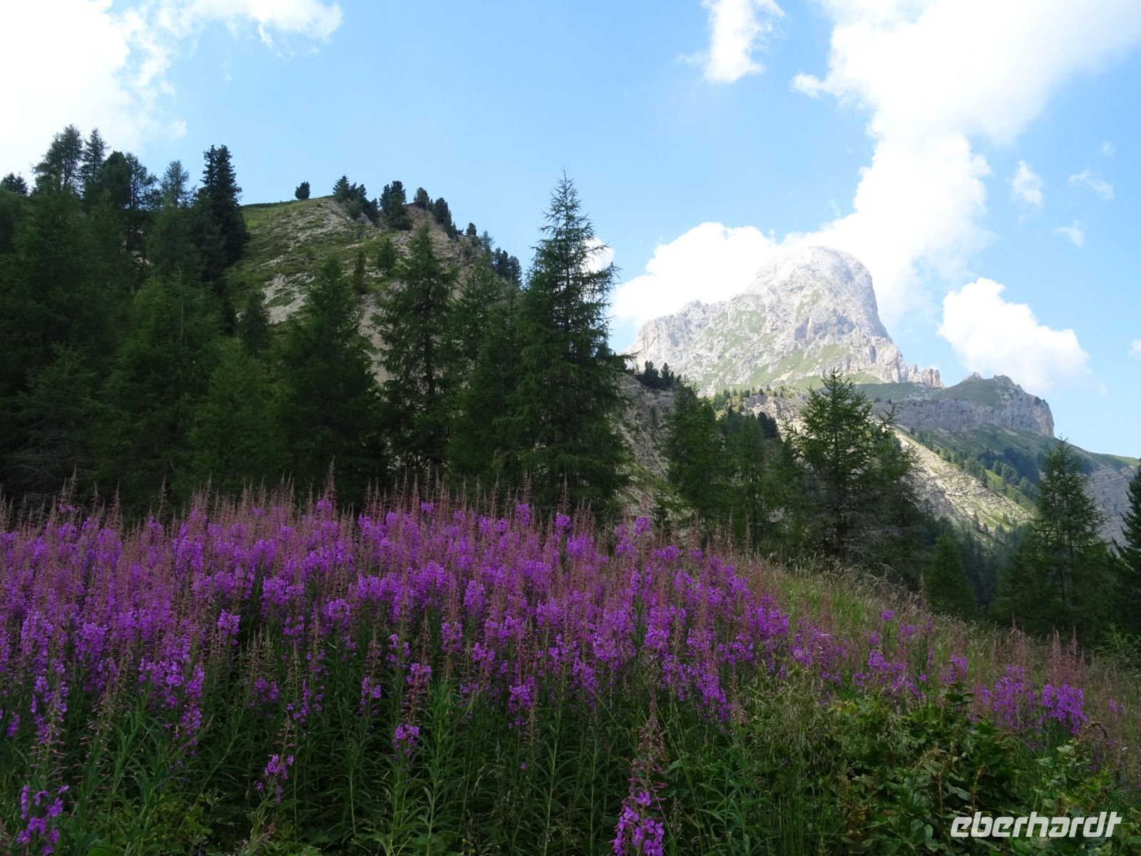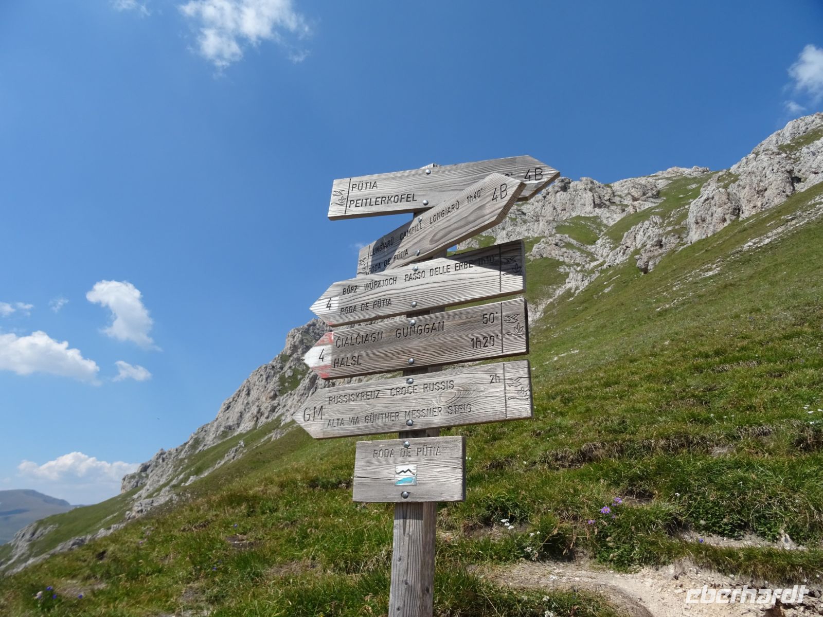 Auch an unserem letzten Wandertag auf dieser schönen Reise starten wir bei perfektem Wetter vom Hotel und lassen uns von Ricco 1 Stunde auf den Parkplatz am Würzjoch (1.987 m) chauffieren. Auch Irmi ist wieder bestens gelaunt und freut sich mit uns auf diese tolle und auch lange Tour. Vom etwas überfüllten Parkplatz führt mit etwas Anstieg der Wanderweg hinauf und wir erblicken bald eine herrliche Bergwiese. Die Flora, welche uns auf unserem Aufstieg begleitet, sucht ihresgleichen. Bunte Almwiesen, blauer Himmel und der gewaltige Peitlerkofel thront vor unseren Augen. Immer wieder legen wir eine Trinkpause ein, denn auch heute ist es wieder sehr warm. Schritt für Schritt wandern wir weiter Richtung Osten durch lichte Wälder bis zum Gömajoch (2111m) hinauf. Hier ist noch Zeit für ein Foto mit dem gewaltigen Holzadler und natürlich auch um diese atemberaubende Aussicht zu genießen. Wir sind dankbar, dass der Wettergott es diese Woche so gut mit uns meint und so geht es nach dieser kurzen Pause weiter entlang der Südseite des Peitlerkofels bergauf und vorbei an entzückenden und noch bunteren Wiesen. Bevor wir uns zum höchsten Punkt unserer Wanderung aufmachen, stärken wir uns erst einmal auf der Alm bei einer deftigen Knödelsuppe und einem erfrischenden Getränk. Wieder schweifen unsere Blicke in die beeindruckende Bergwelt, aber wir hören sie schon rufen, die Peitlerscharte. Nun geht es auch schon los und wir bezwingen die nächsten 300 Höhenmeter - jeder in seinem Tempo. An der Peitlerscharte auf 2357 Metern angekommen, genießen wir die Natur, atmen tief durch und nutzen die Pause um ausgiebig zu trinken, bevor wir den Abstieg wagen. Dieser fällt etwas anspruchsvoller aus und die Überquerung von Schottersteigen und Felsschrofen erfordert schon ein gewisses Maß an Schwindelfreiheit und Trittsicherheit. Wir werden von den Alpendohlen begleitet und sogar in den Schottermassen haben sich der zartgelbe Alpenmohn versteckt. Unten angekommen, ist noch Zeit den gewaltigen Peitlerkofel in der Nachmittagssonne zu fotografieren, aber auch vor allem den Anblick ganz fest im Herzen zu speichern. Ricco erwartet uns bereits sehnsüchtig am Bus und glücklich und etwas erschöpft fahren wir zurück ins Hotel. Nicht aber ohne unseren Gipfel-Grappa, den sich heute jeder redlich verdient hat!.