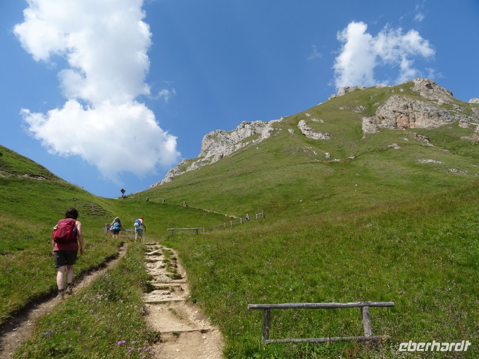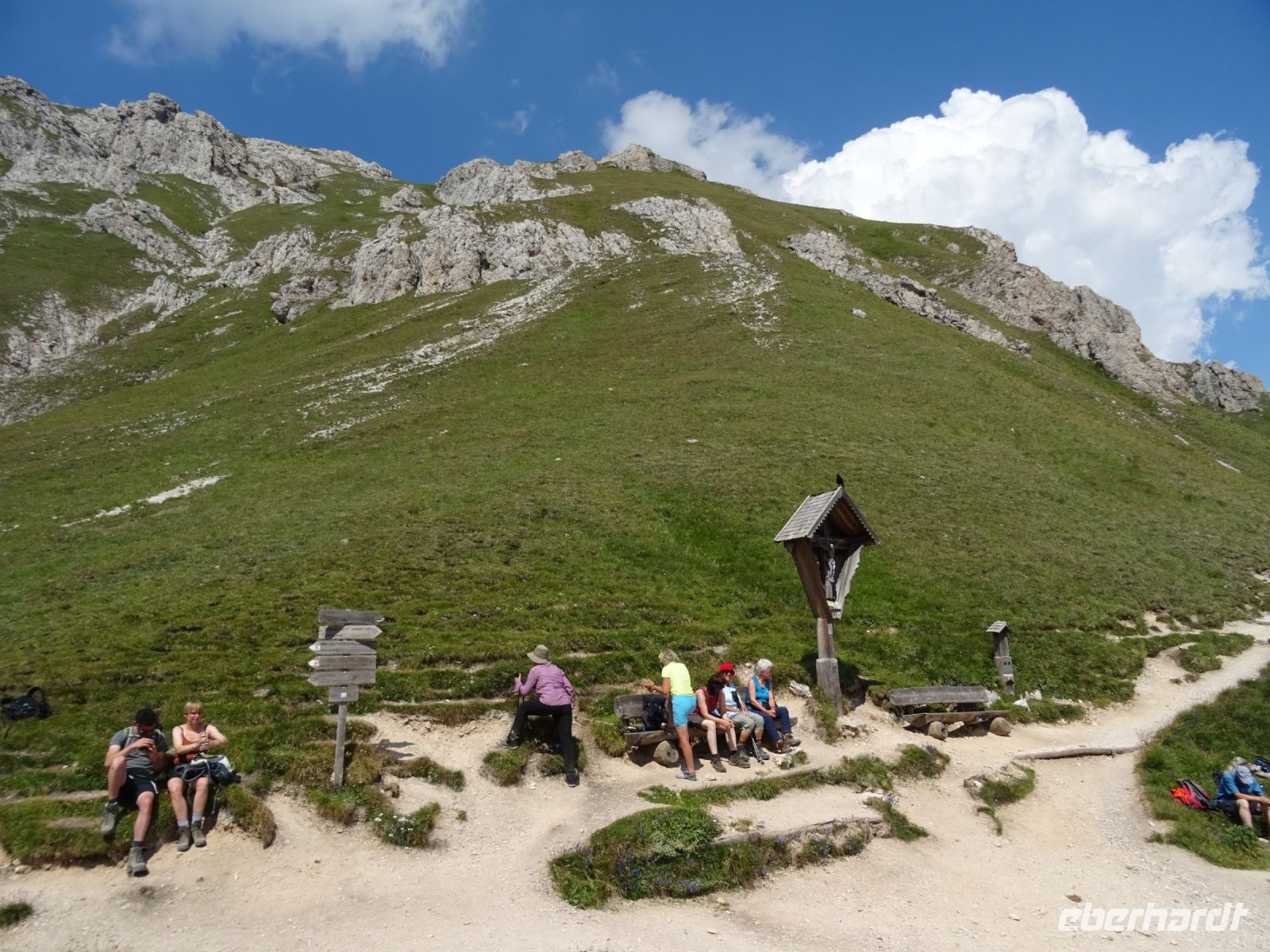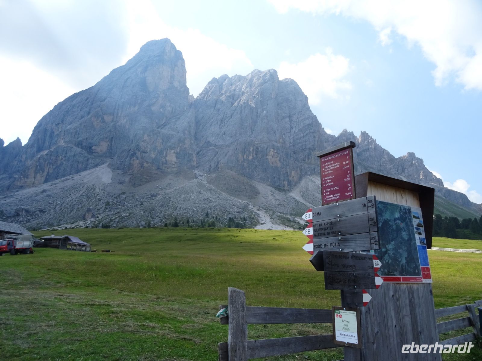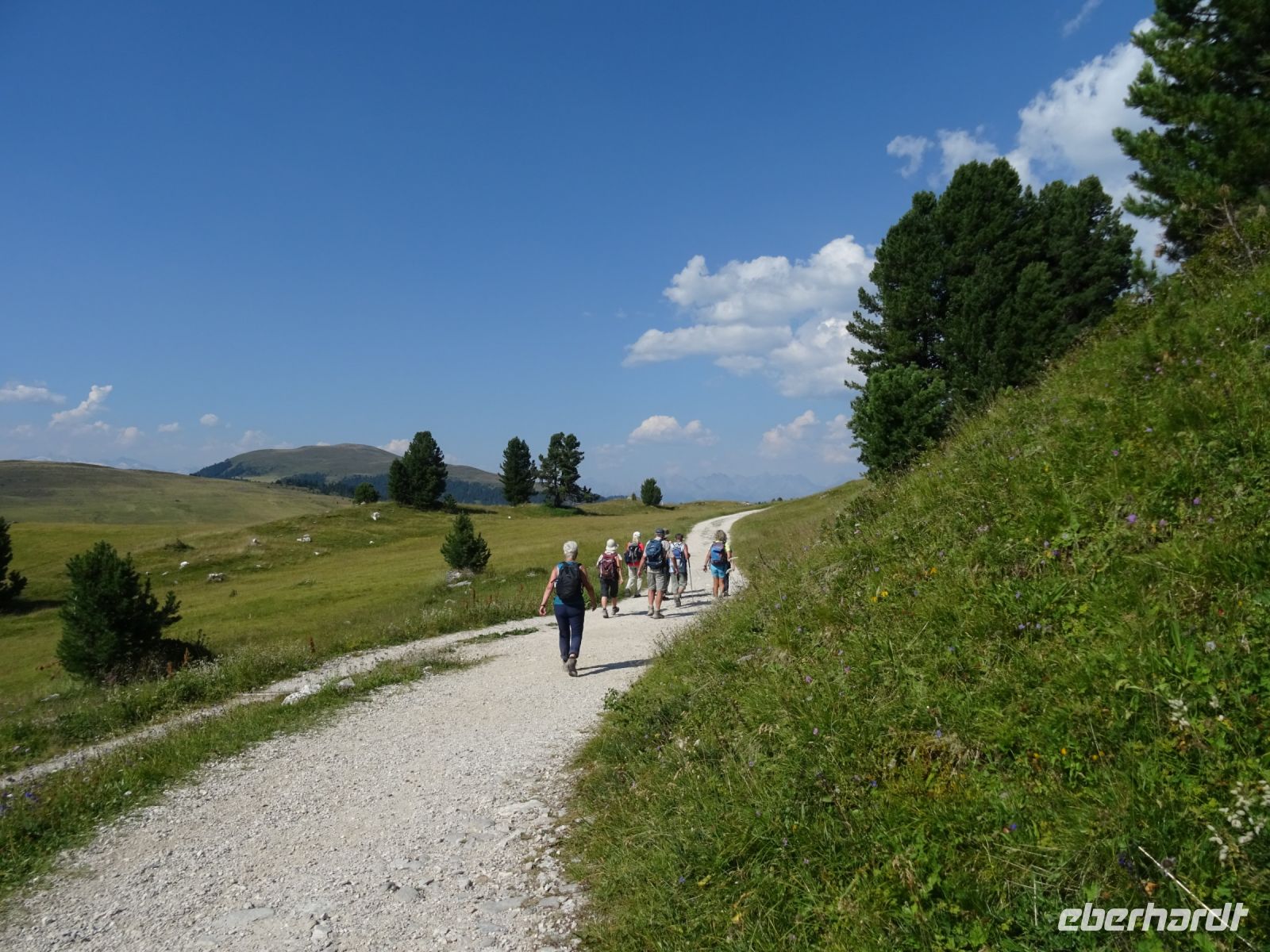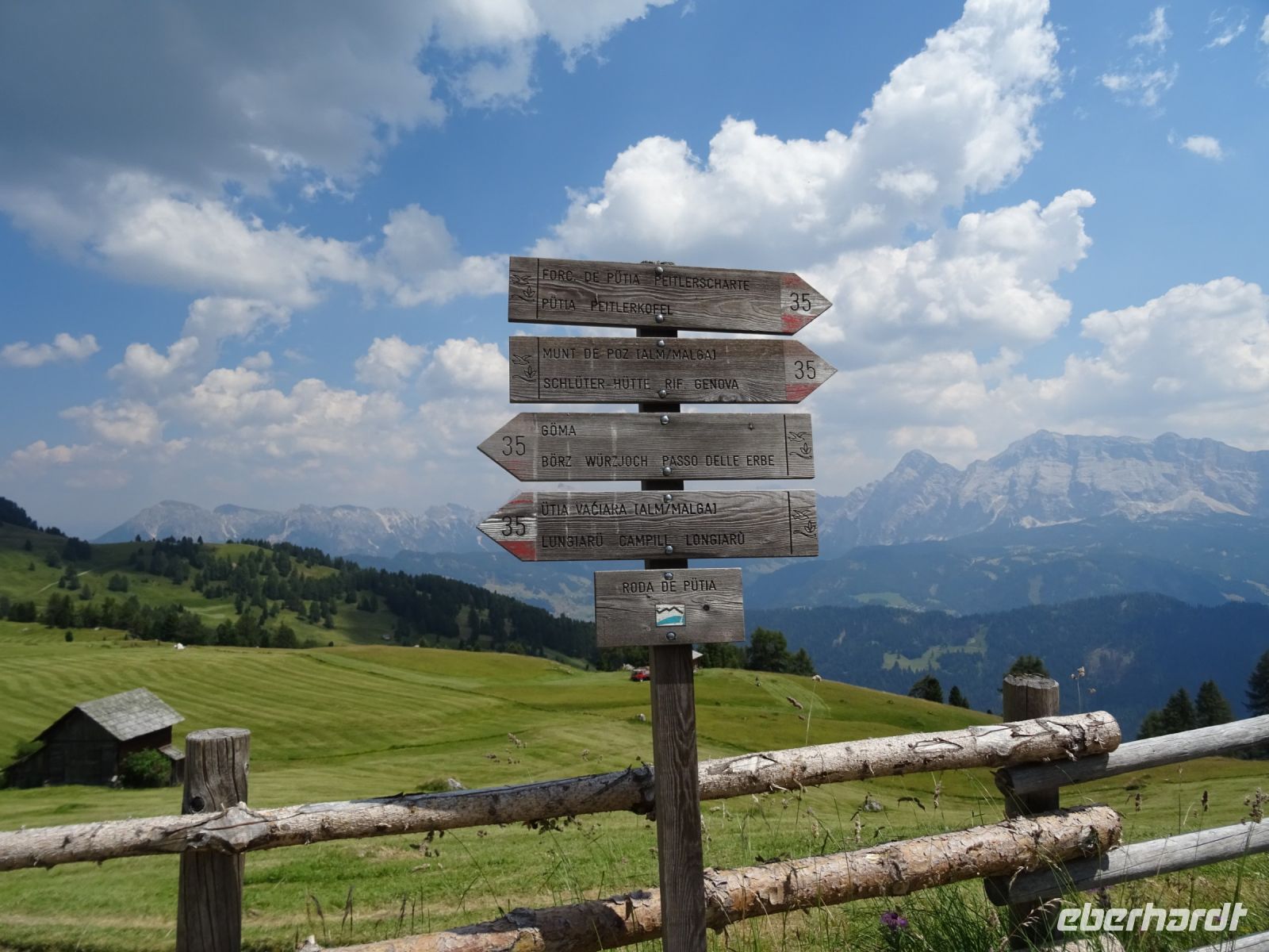 Auch an unserem letzten Wandertag auf dieser schönen Reise starten wir bei perfektem Wetter vom Hotel und lassen uns von Ricco 1 Stunde auf den Parkplatz am Würzjoch (1.987 m) chauffieren. Auch Irmi ist wieder bestens gelaunt und freut sich mit uns auf diese tolle und auch lange Tour. Vom etwas überfüllten Parkplatz führt mit etwas Anstieg der Wanderweg hinauf und wir erblicken bald eine herrliche Bergwiese. Die Flora, welche uns auf unserem Aufstieg begleitet, sucht ihresgleichen. Bunte Almwiesen, blauer Himmel und der gewaltige Peitlerkofel thront vor unseren Augen. Immer wieder legen wir eine Trinkpause ein, denn auch heute ist es wieder sehr warm. Schritt für Schritt wandern wir weiter Richtung Osten durch lichte Wälder bis zum Gömajoch (2111m) hinauf. Hier ist noch Zeit für ein Foto mit dem gewaltigen Holzadler und natürlich auch um diese atemberaubende Aussicht zu genießen. Wir sind dankbar, dass der Wettergott es diese Woche so gut mit uns meint und so geht es nach dieser kurzen Pause weiter entlang der Südseite des Peitlerkofels bergauf und vorbei an entzückenden und noch bunteren Wiesen. Bevor wir uns zum höchsten Punkt unserer Wanderung aufmachen, stärken wir uns erst einmal auf der Alm bei einer deftigen Knödelsuppe und einem erfrischenden Getränk. Wieder schweifen unsere Blicke in die beeindruckende Bergwelt, aber wir hören sie schon rufen, die Peitlerscharte. Nun geht es auch schon los und wir bezwingen die nächsten 300 Höhenmeter - jeder in seinem Tempo. An der Peitlerscharte auf 2357 Metern angekommen, genießen wir die Natur, atmen tief durch und nutzen die Pause um ausgiebig zu trinken, bevor wir den Abstieg wagen. Dieser fällt etwas anspruchsvoller aus und die Überquerung von Schottersteigen und Felsschrofen erfordert schon ein gewisses Maß an Schwindelfreiheit und Trittsicherheit. Wir werden von den Alpendohlen begleitet und sogar in den Schottermassen haben sich der zartgelbe Alpenmohn versteckt. Unten angekommen, ist noch Zeit den gewaltigen Peitlerkofel in der Nachmittagssonne zu fotografieren, aber auch vor allem den Anblick ganz fest im Herzen zu speichern. Ricco erwartet uns bereits sehnsüchtig am Bus und glücklich und etwas erschöpft fahren wir zurück ins Hotel. Nicht aber ohne unseren Gipfel-Grappa, den sich heute jeder redlich verdient hat!.