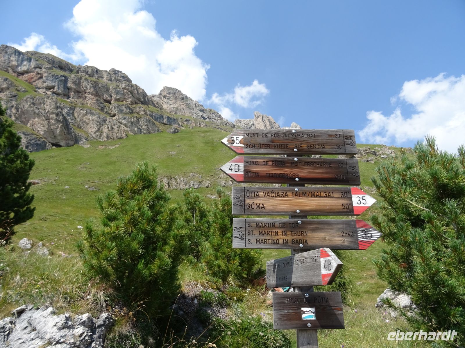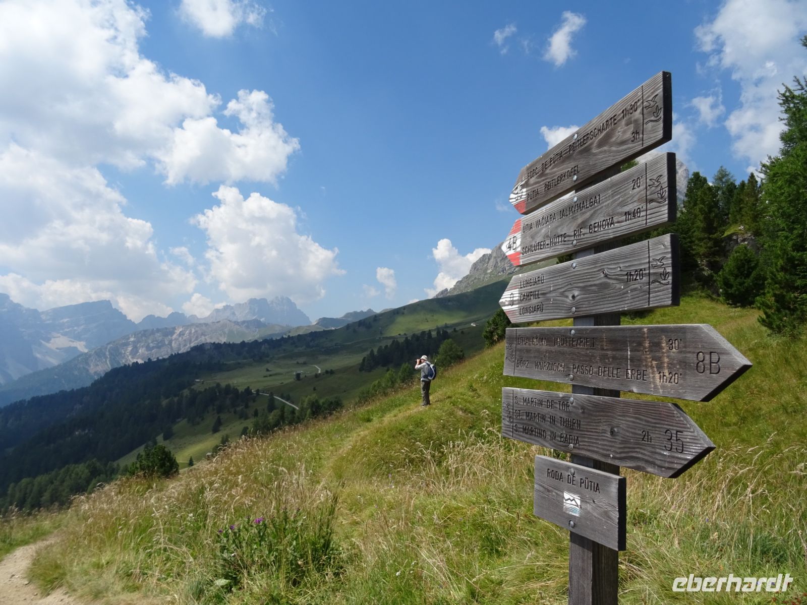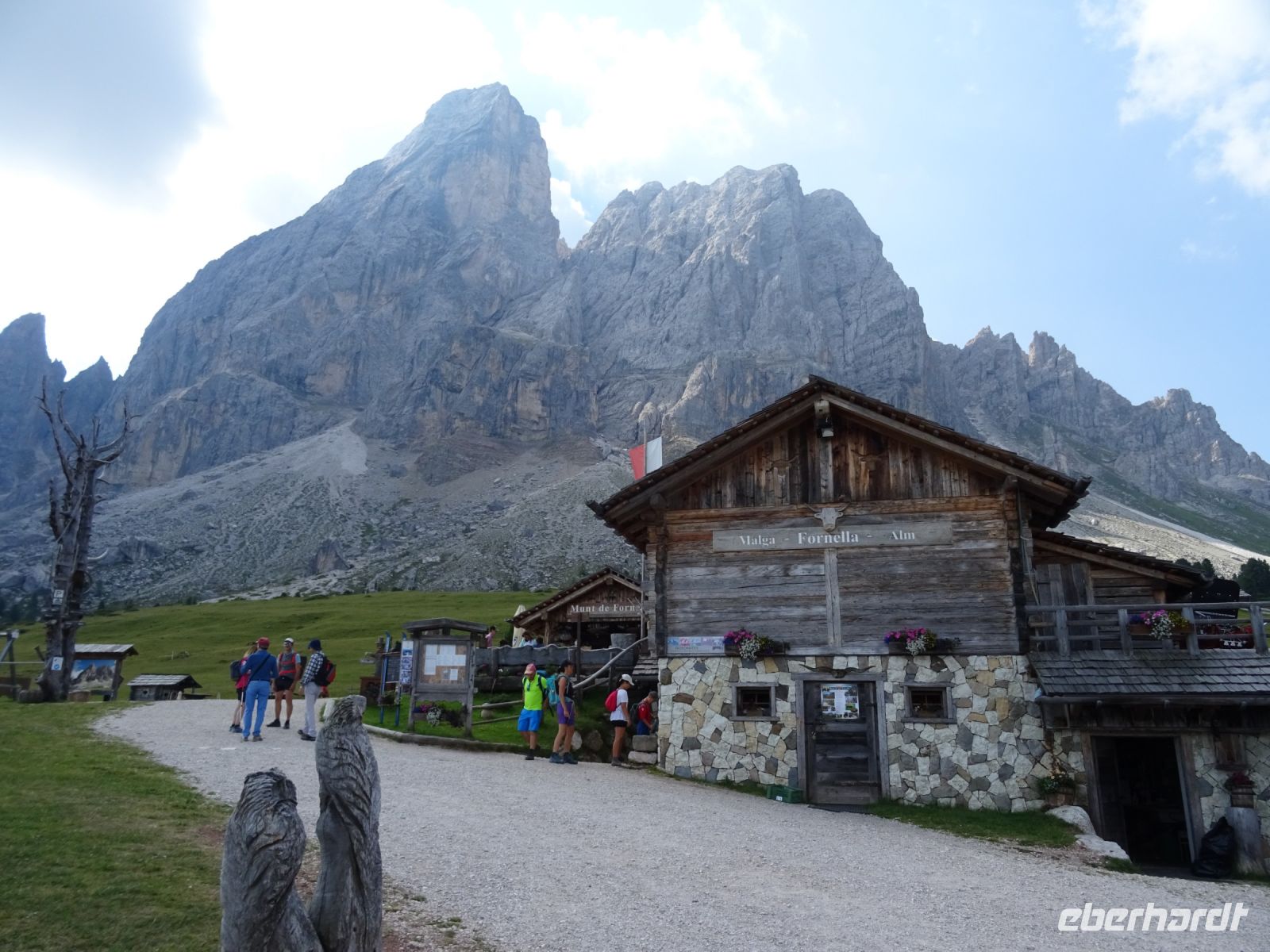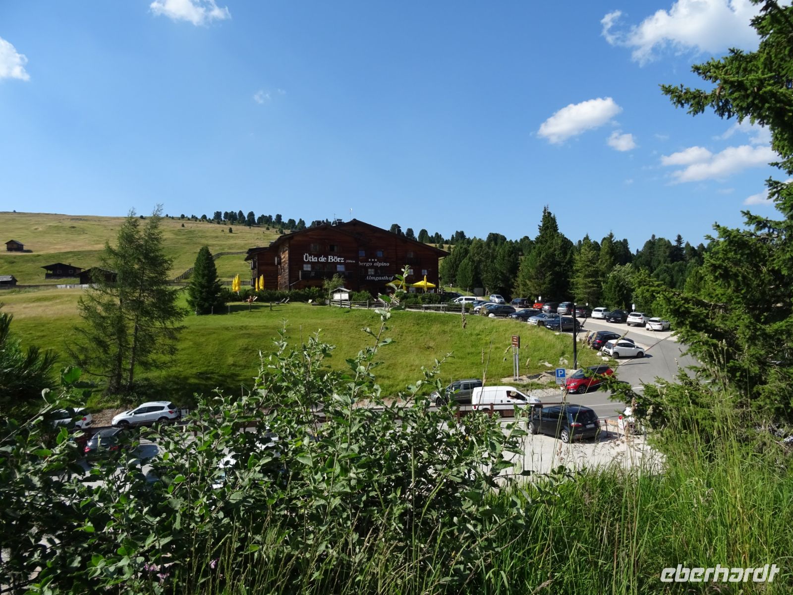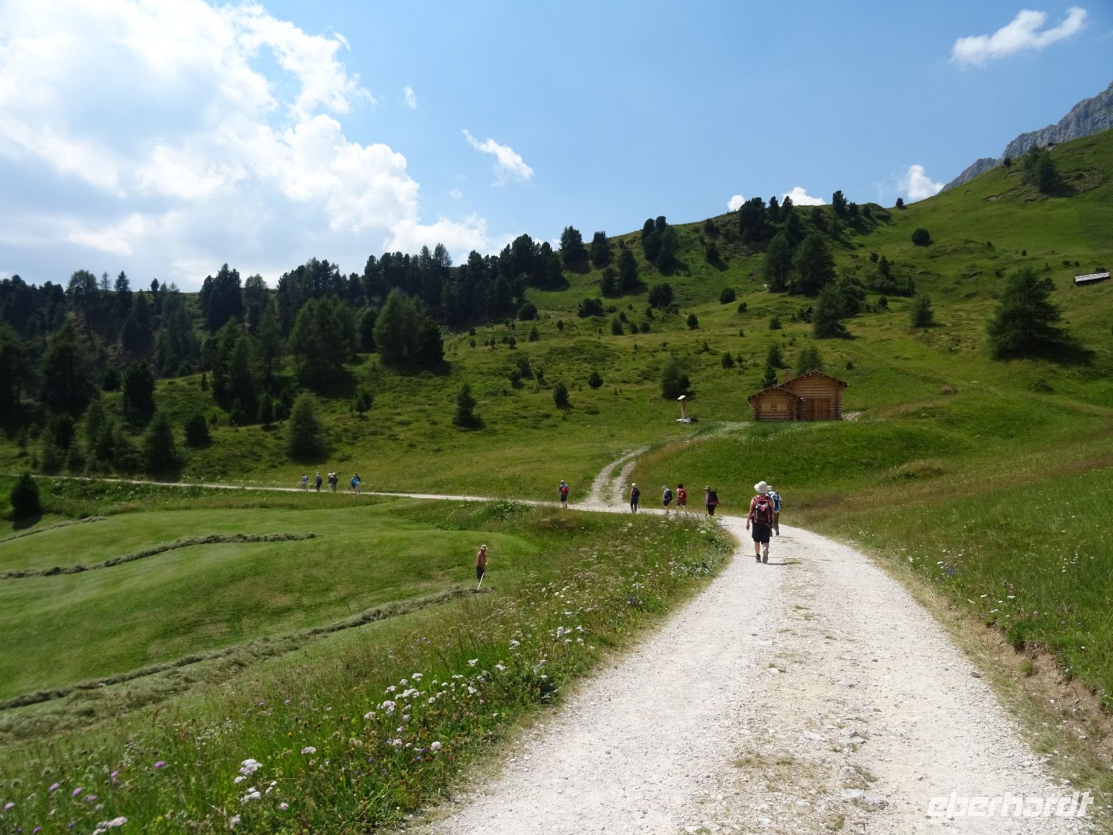 Auch an unserem letzten Wandertag auf dieser schönen Reise starten wir bei perfektem Wetter vom Hotel und lassen uns von Ricco 1 Stunde auf den Parkplatz am Würzjoch (1.987 m) chauffieren. Auch Irmi ist wieder bestens gelaunt und freut sich mit uns auf diese tolle und auch lange Tour. Vom etwas überfüllten Parkplatz führt mit etwas Anstieg der Wanderweg hinauf und wir erblicken bald eine herrliche Bergwiese. Die Flora, welche uns auf unserem Aufstieg begleitet, sucht ihresgleichen. Bunte Almwiesen, blauer Himmel und der gewaltige Peitlerkofel thront vor unseren Augen. Immer wieder legen wir eine Trinkpause ein, denn auch heute ist es wieder sehr warm. Schritt für Schritt wandern wir weiter Richtung Osten durch lichte Wälder bis zum Gömajoch (2111m) hinauf. Hier ist noch Zeit für ein Foto mit dem gewaltigen Holzadler und natürlich auch um diese atemberaubende Aussicht zu genießen. Wir sind dankbar, dass der Wettergott es diese Woche so gut mit uns meint und so geht es nach dieser kurzen Pause weiter entlang der Südseite des Peitlerkofels bergauf und vorbei an entzückenden und noch bunteren Wiesen. Bevor wir uns zum höchsten Punkt unserer Wanderung aufmachen, stärken wir uns erst einmal auf der Alm bei einer deftigen Knödelsuppe und einem erfrischenden Getränk. Wieder schweifen unsere Blicke in die beeindruckende Bergwelt, aber wir hören sie schon rufen, die Peitlerscharte. Nun geht es auch schon los und wir bezwingen die nächsten 300 Höhenmeter - jeder in seinem Tempo. An der Peitlerscharte auf 2357 Metern angekommen, genießen wir die Natur, atmen tief durch und nutzen die Pause um ausgiebig zu trinken, bevor wir den Abstieg wagen. Dieser fällt etwas anspruchsvoller aus und die Überquerung von Schottersteigen und Felsschrofen erfordert schon ein gewisses Maß an Schwindelfreiheit und Trittsicherheit. Wir werden von den Alpendohlen begleitet und sogar in den Schottermassen haben sich der zartgelbe Alpenmohn versteckt. Unten angekommen, ist noch Zeit den gewaltigen Peitlerkofel in der Nachmittagssonne zu fotografieren, aber auch vor allem den Anblick ganz fest im Herzen zu speichern. Ricco erwartet uns bereits sehnsüchtig am Bus und glücklich und etwas erschöpft fahren wir zurück ins Hotel. Nicht aber ohne unseren Gipfel-Grappa, den sich heute jeder redlich verdient hat!.