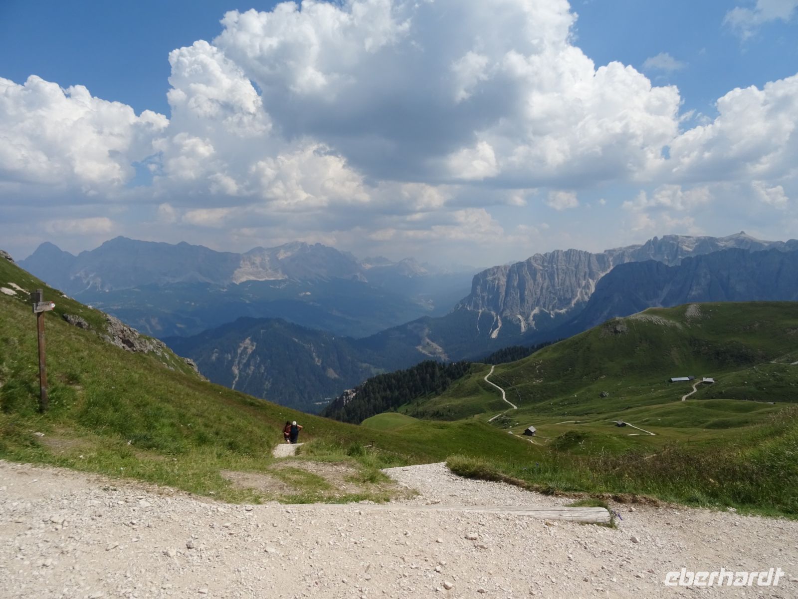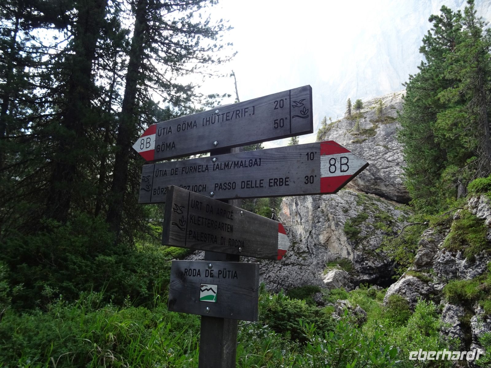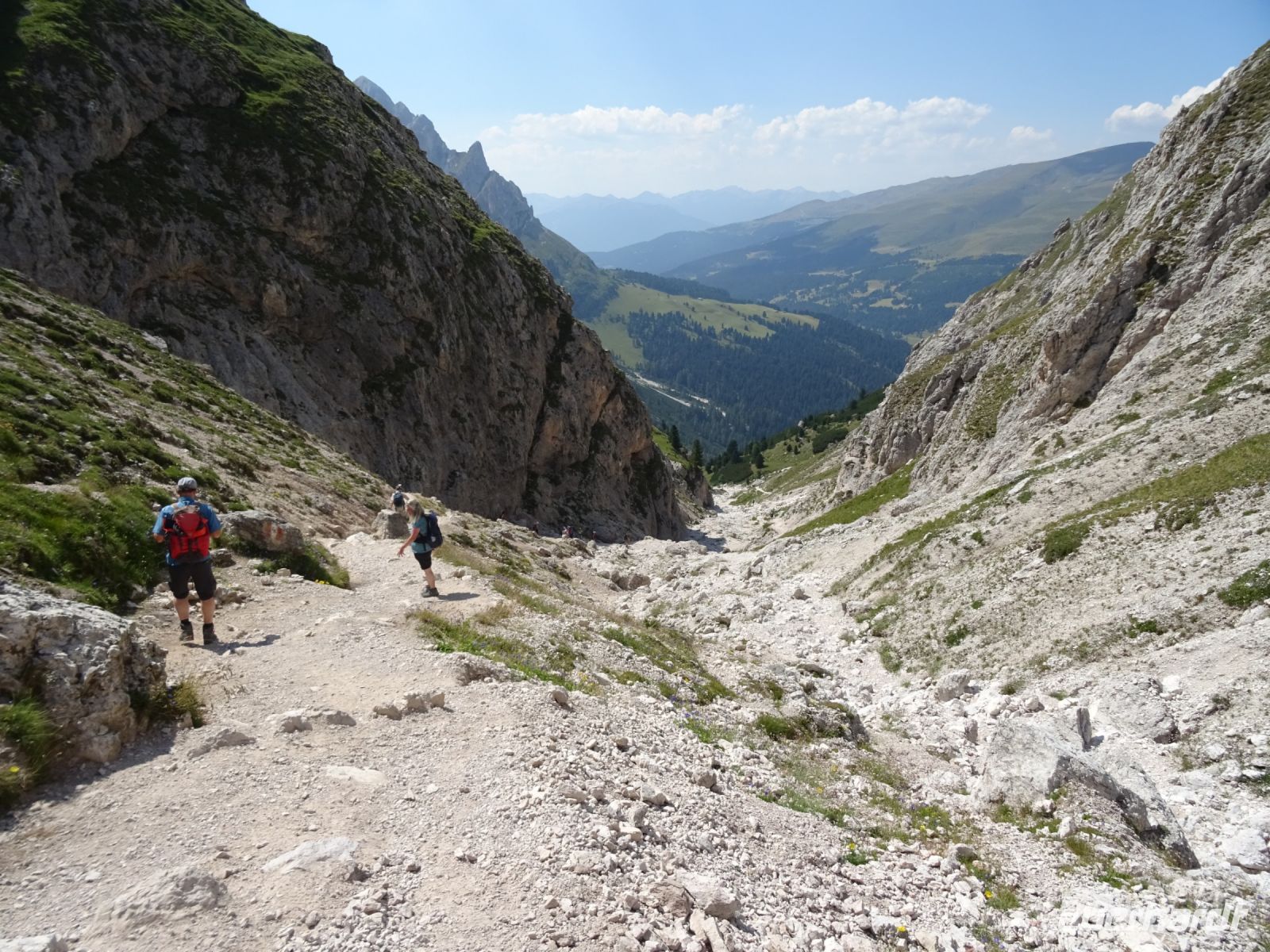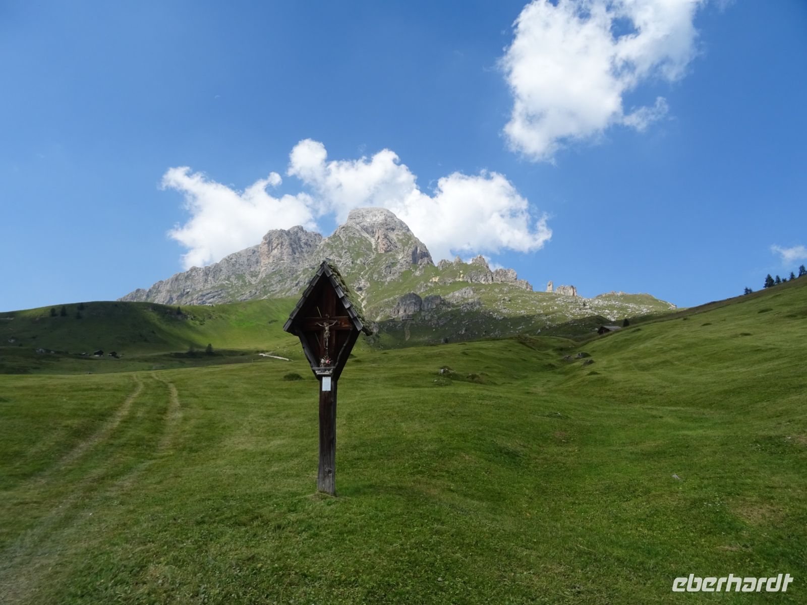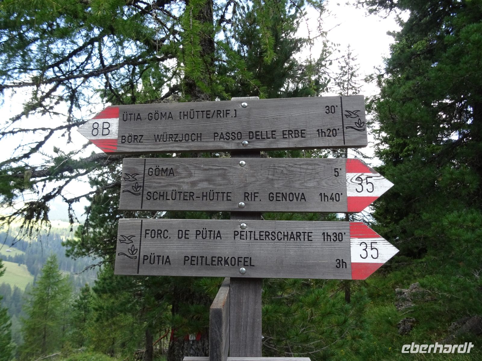 Auch an unserem letzten Wandertag auf dieser schönen Reise starten wir bei perfektem Wetter vom Hotel und lassen uns von Ricco 1 Stunde auf den Parkplatz am Würzjoch (1.987 m) chauffieren. Auch Irmi ist wieder bestens gelaunt und freut sich mit uns auf diese tolle und auch lange Tour. Vom etwas überfüllten Parkplatz führt mit etwas Anstieg der Wanderweg hinauf und wir erblicken bald eine herrliche Bergwiese. Die Flora, welche uns auf unserem Aufstieg begleitet, sucht ihresgleichen. Bunte Almwiesen, blauer Himmel und der gewaltige Peitlerkofel thront vor unseren Augen. Immer wieder legen wir eine Trinkpause ein, denn auch heute ist es wieder sehr warm. Schritt für Schritt wandern wir weiter Richtung Osten durch lichte Wälder bis zum Gömajoch (2111m) hinauf. Hier ist noch Zeit für ein Foto mit dem gewaltigen Holzadler und natürlich auch um diese atemberaubende Aussicht zu genießen. Wir sind dankbar, dass der Wettergott es diese Woche so gut mit uns meint und so geht es nach dieser kurzen Pause weiter entlang der Südseite des Peitlerkofels bergauf und vorbei an entzückenden und noch bunteren Wiesen. Bevor wir uns zum höchsten Punkt unserer Wanderung aufmachen, stärken wir uns erst einmal auf der Alm bei einer deftigen Knödelsuppe und einem erfrischenden Getränk. Wieder schweifen unsere Blicke in die beeindruckende Bergwelt, aber wir hören sie schon rufen, die Peitlerscharte. Nun geht es auch schon los und wir bezwingen die nächsten 300 Höhenmeter - jeder in seinem Tempo. An der Peitlerscharte auf 2357 Metern angekommen, genießen wir die Natur, atmen tief durch und nutzen die Pause um ausgiebig zu trinken, bevor wir den Abstieg wagen. Dieser fällt etwas anspruchsvoller aus und die Überquerung von Schottersteigen und Felsschrofen erfordert schon ein gewisses Maß an Schwindelfreiheit und Trittsicherheit. Wir werden von den Alpendohlen begleitet und sogar in den Schottermassen haben sich der zartgelbe Alpenmohn versteckt. Unten angekommen, ist noch Zeit den gewaltigen Peitlerkofel in der Nachmittagssonne zu fotografieren, aber auch vor allem den Anblick ganz fest im Herzen zu speichern. Ricco erwartet uns bereits sehnsüchtig am Bus und glücklich und etwas erschöpft fahren wir zurück ins Hotel. Nicht aber ohne unseren Gipfel-Grappa, den sich heute jeder redlich verdient hat!.