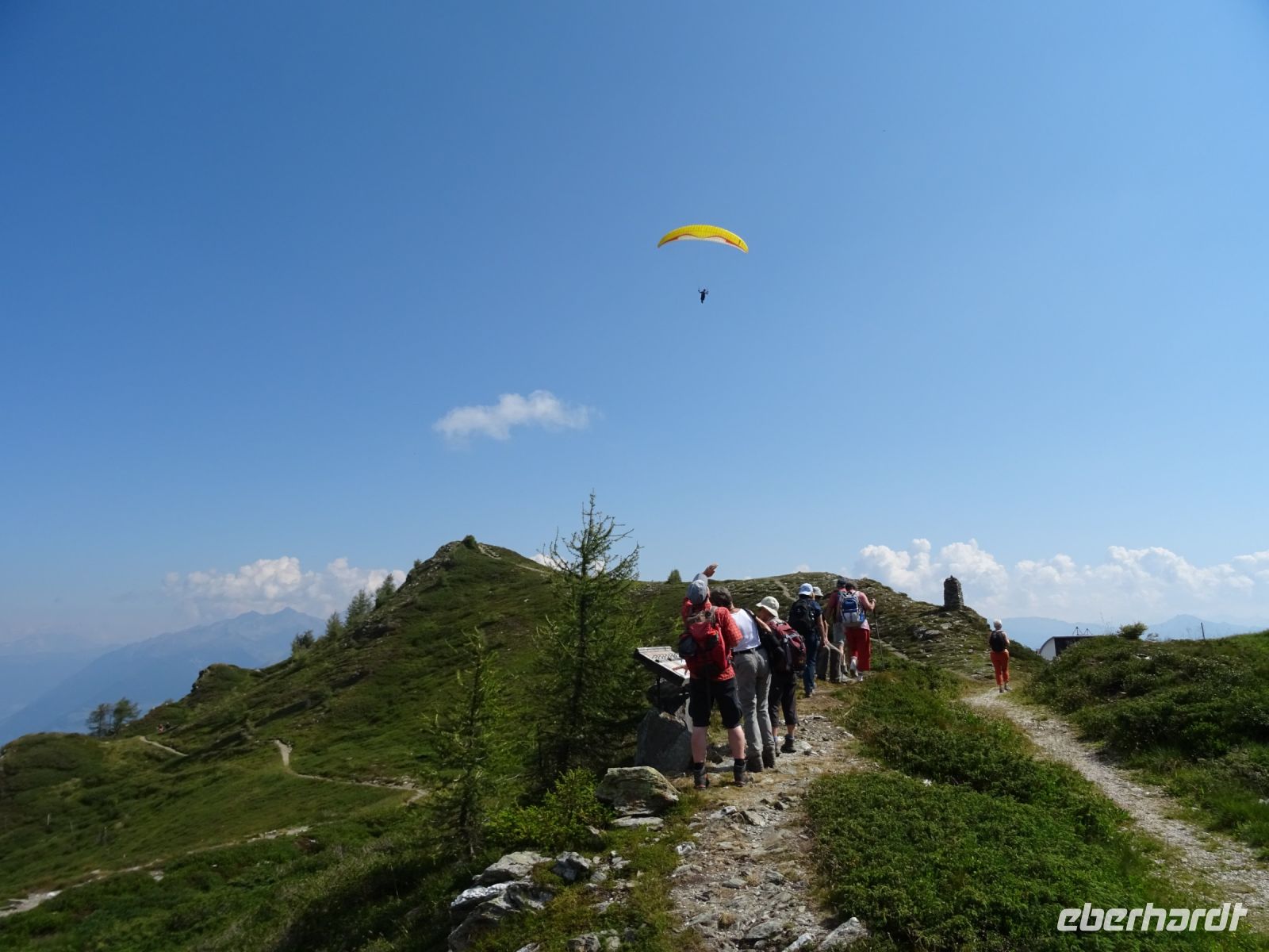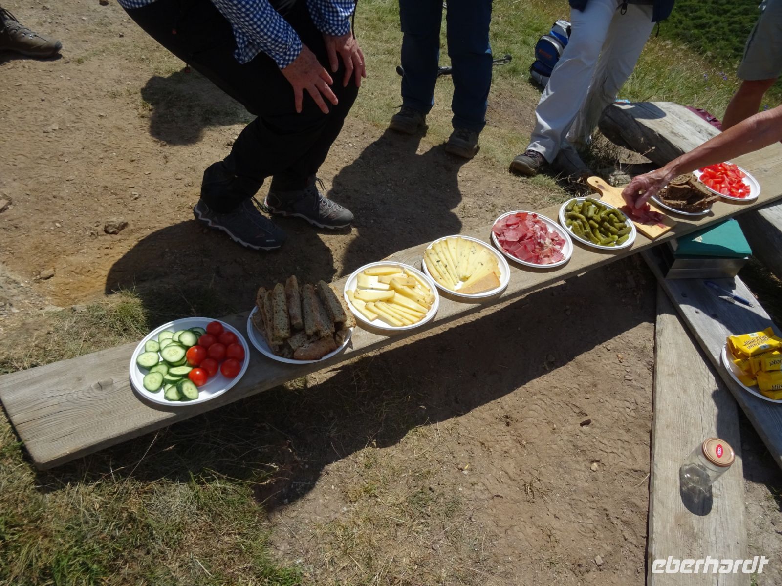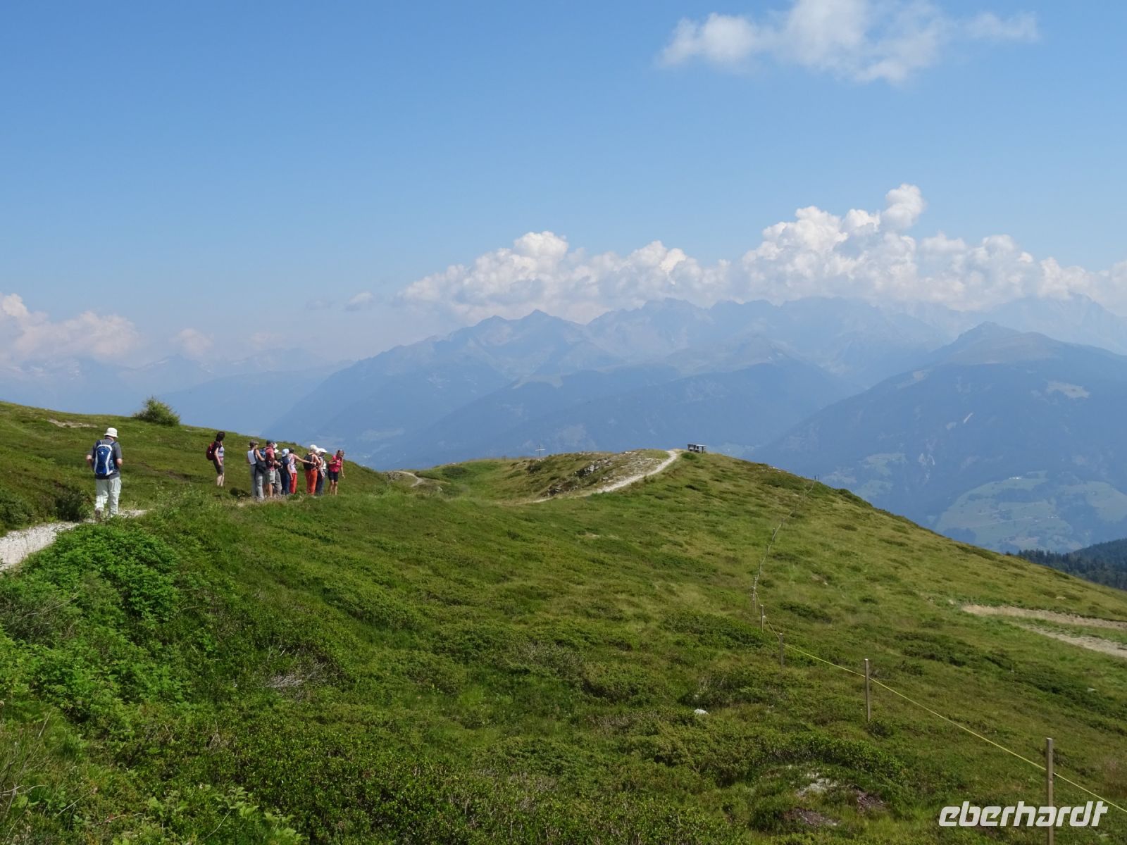 der Zillertaler Alpen bestaunen. Die Sonne steht senkrecht über uns und selbst auf diesen Höhenmetern ist es mit 26 Grad sehr heiß. Es heißt viel trinken und nun sind es nur einige Minuten über einen Wiesensteig zum Gipfel der Eggespitz auf 2.187 m Höhe, von dem wir eine prächtige Aussicht auf den Neves-Stausee und den Großen Möseler genießen können. Wir legen eine zünftige Mittagsrast á lá Irmi & Doreen ein und kredenzen ein leckeres Picknick mit Südtiroler Speck, Trüffelkäse, Anisbrot, Gürkchen und einer kleinen Nascherei, damit jeder gut gestärkt den Abstieg bewältigen kann. Wir genießen die ausgiebige Rast und beobachten das atemberaubende Panorama der Gletscherwelt. Natürlich darf auch der Eintrag ins Gipfelbuch nicht fehlen und etwas erholt, führt uns ein etwas steilerer, neu ausgebauter Steig über den Zösenbichl hinunter ins Tal. Bevor wir unseren Bus erreichen, kehren wir noch an einer Jausenstation ein und genießen einen leckeren, hausgemachten Mohnstrudel oder eine erfrischende Saftschorle.
