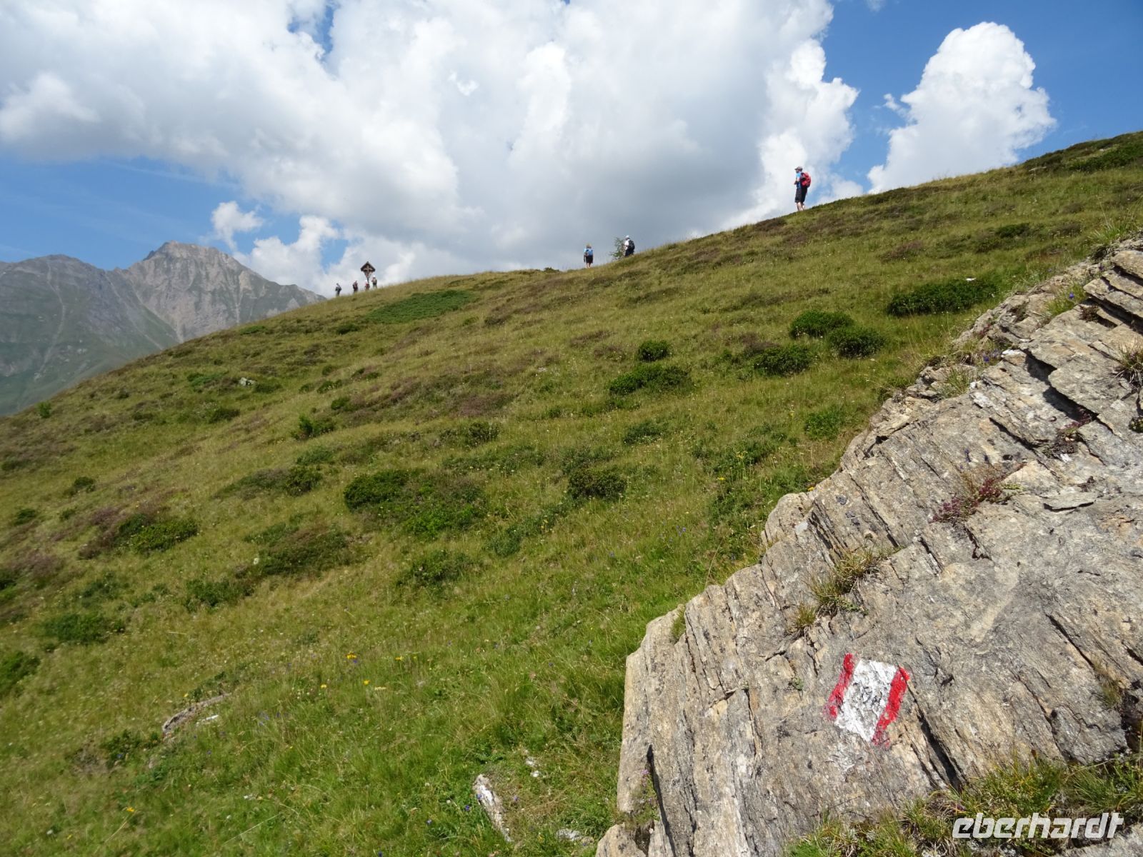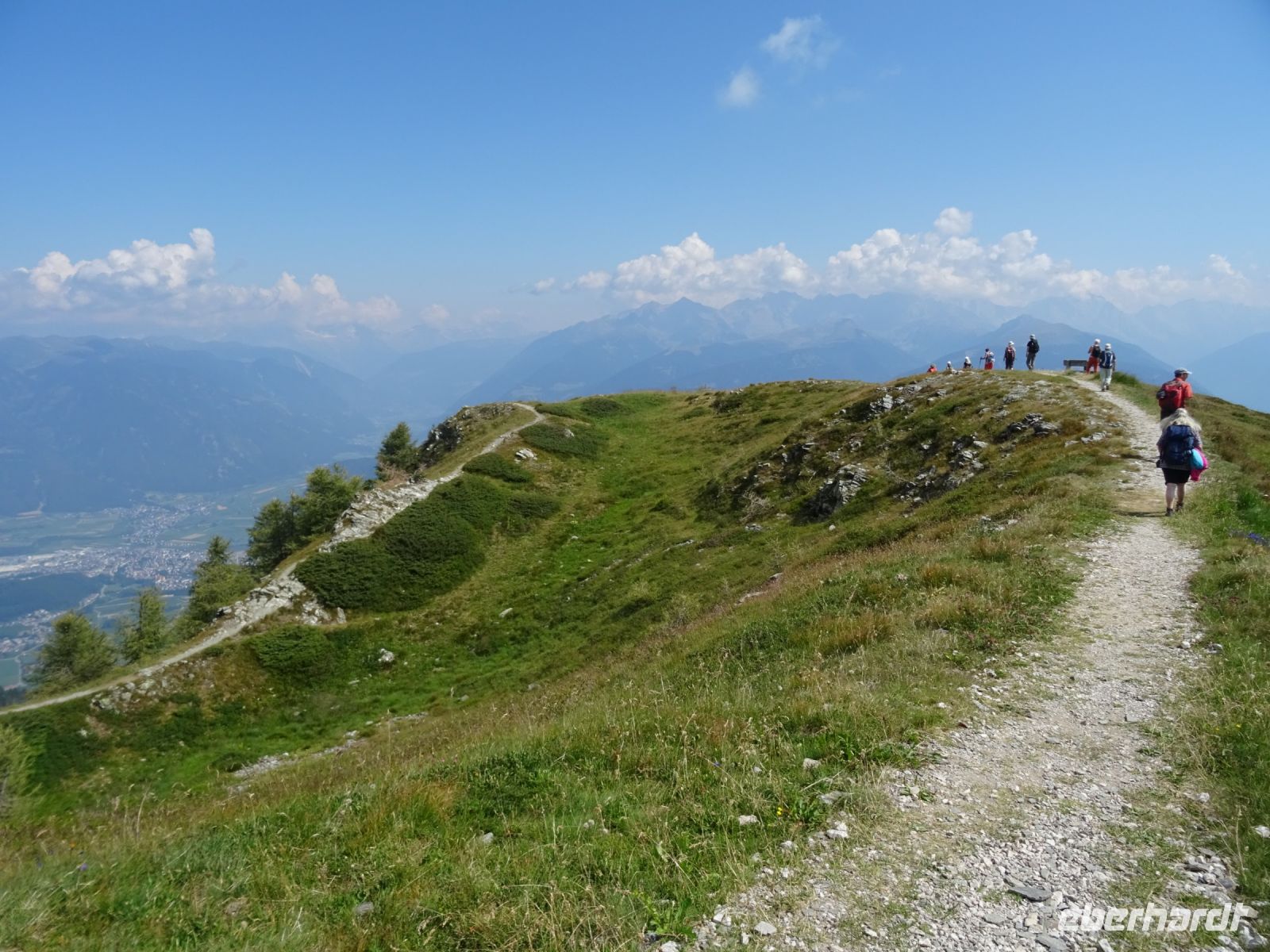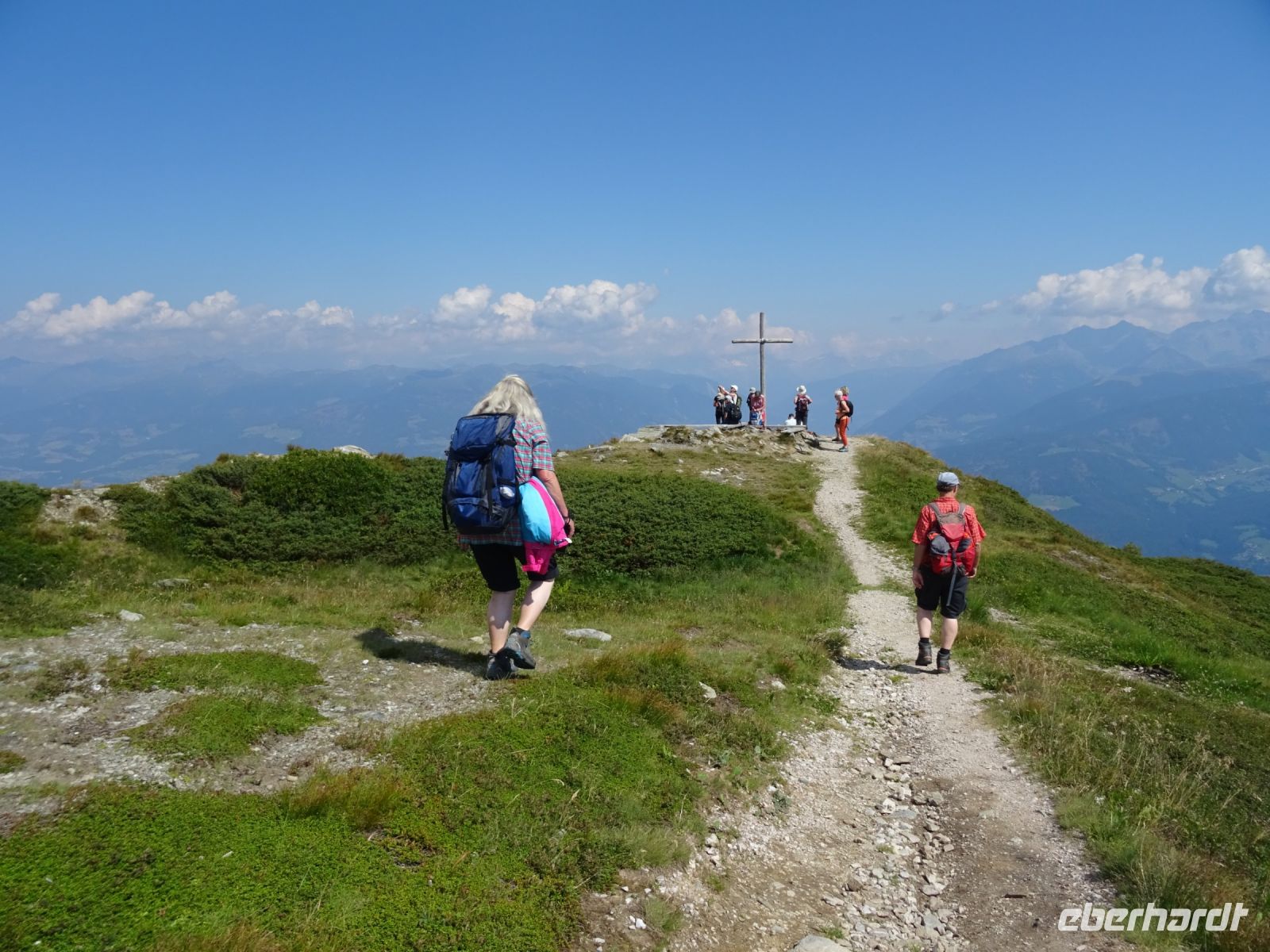 der Zillertaler Alpen bestaunen. Die Sonne steht senkrecht über uns und selbst auf diesen Höhenmetern ist es mit 26 Grad sehr heiß. Es heißt viel trinken und nun sind es nur einige Minuten über einen Wiesensteig zum Gipfel der Eggespitz auf 2.187 m Höhe, von dem wir eine prächtige Aussicht auf den Neves-Stausee und den Großen Möseler genießen können. Wir legen eine zünftige Mittagsrast á lá Irmi & Doreen ein und kredenzen ein leckeres Picknick mit Südtiroler Speck, Trüffelkäse, Anisbrot, Gürkchen und einer kleinen Nascherei, damit jeder gut gestärkt den Abstieg bewältigen kann. Wir genießen die ausgiebige Rast und beobachten das atemberaubende Panorama der Gletscherwelt. Natürlich darf auch der Eintrag ins Gipfelbuch nicht fehlen und etwas erholt, führt uns ein etwas steilerer, neu ausgebauter Steig über den Zösenbichl hinunter ins Tal. Bevor wir unseren Bus erreichen, kehren wir noch an einer Jausenstation ein und genießen einen leckeren, hausgemachten Mohnstrudel oder eine erfrischende Saftschorle.