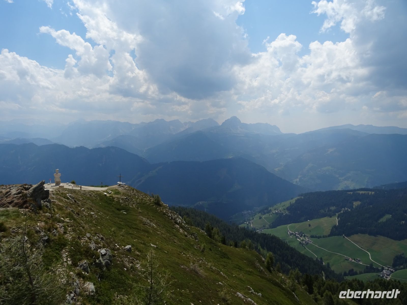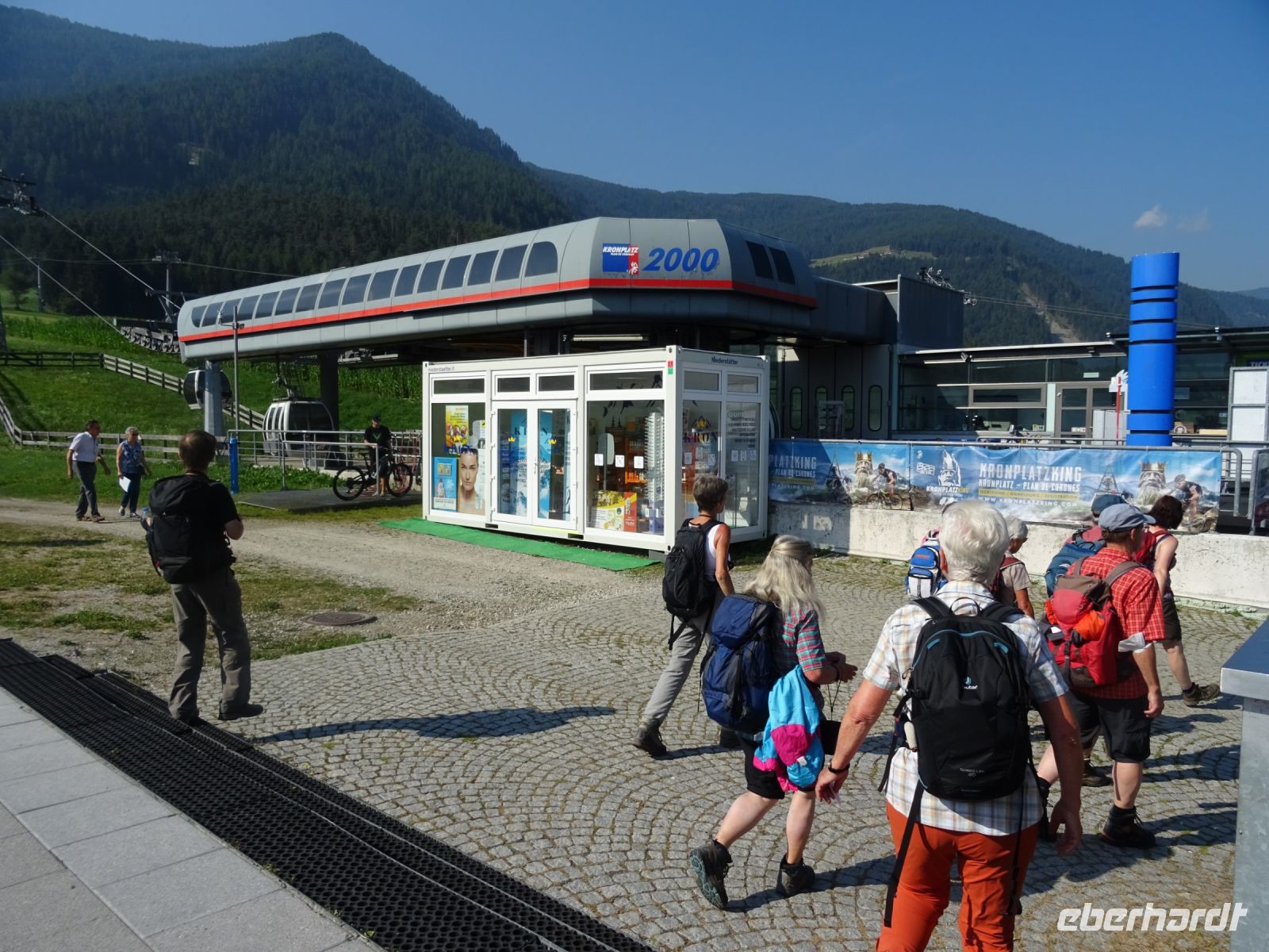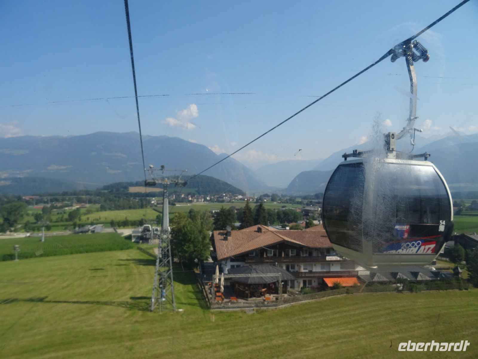 Nach einem leicht gewittrigen Abend erwartet uns heute ein entschleunigter Wandertag rund um unser Hotel. Mit Irmi starten wir einem gemütlichen Spaziergang Richtung Talstation des Kronplatzes im benachbarten Reischach. Die Seilbahn befördert uns nun auf schnellstem Wege auf den 2275 Meter hohen Hausberg von Bruneck. Der Blick vom Gipfel gilt als einer der Schönsten der Alpen. Innerhalb weniger Minuten überwinden wir nun über 1.300 Höhenmeter und gehen als erstes zur Friedensglocke „Concordia 2000“, welche im Jahre 2003 zum 25-jährigen Jubiläum des Skigebietes auf der Aussichtsplattform des Gipfels angebracht wurde und eine der größten Glocken in Südtirol und den Alpen ist. Sie ist mit der Inschrift „Gott schenke den Völkern Frieden“ versehen – Worte, die aktueller denn je sind.