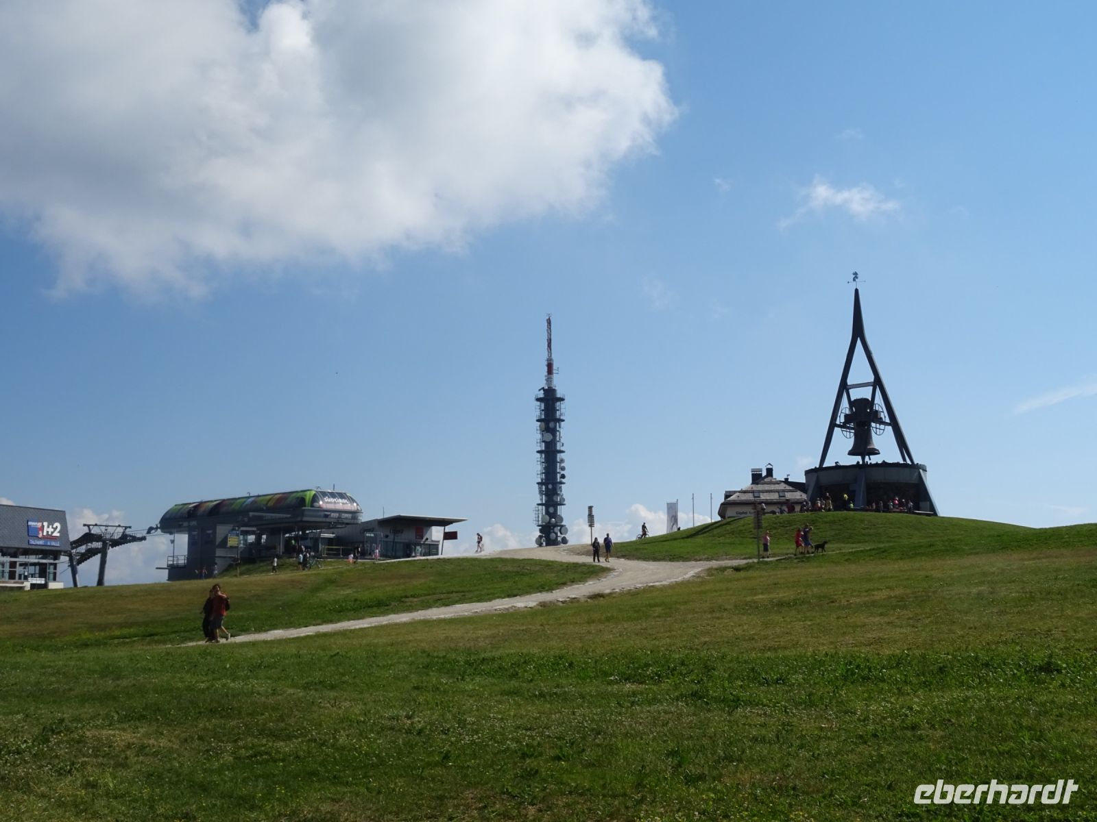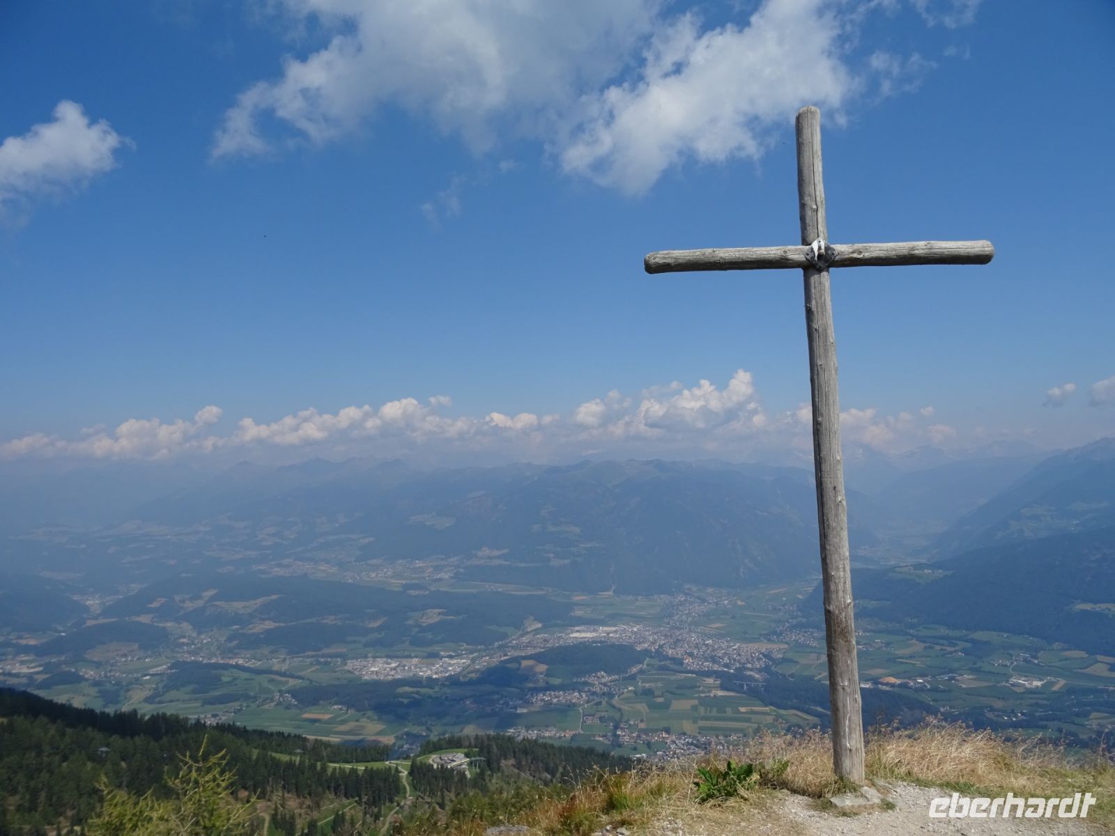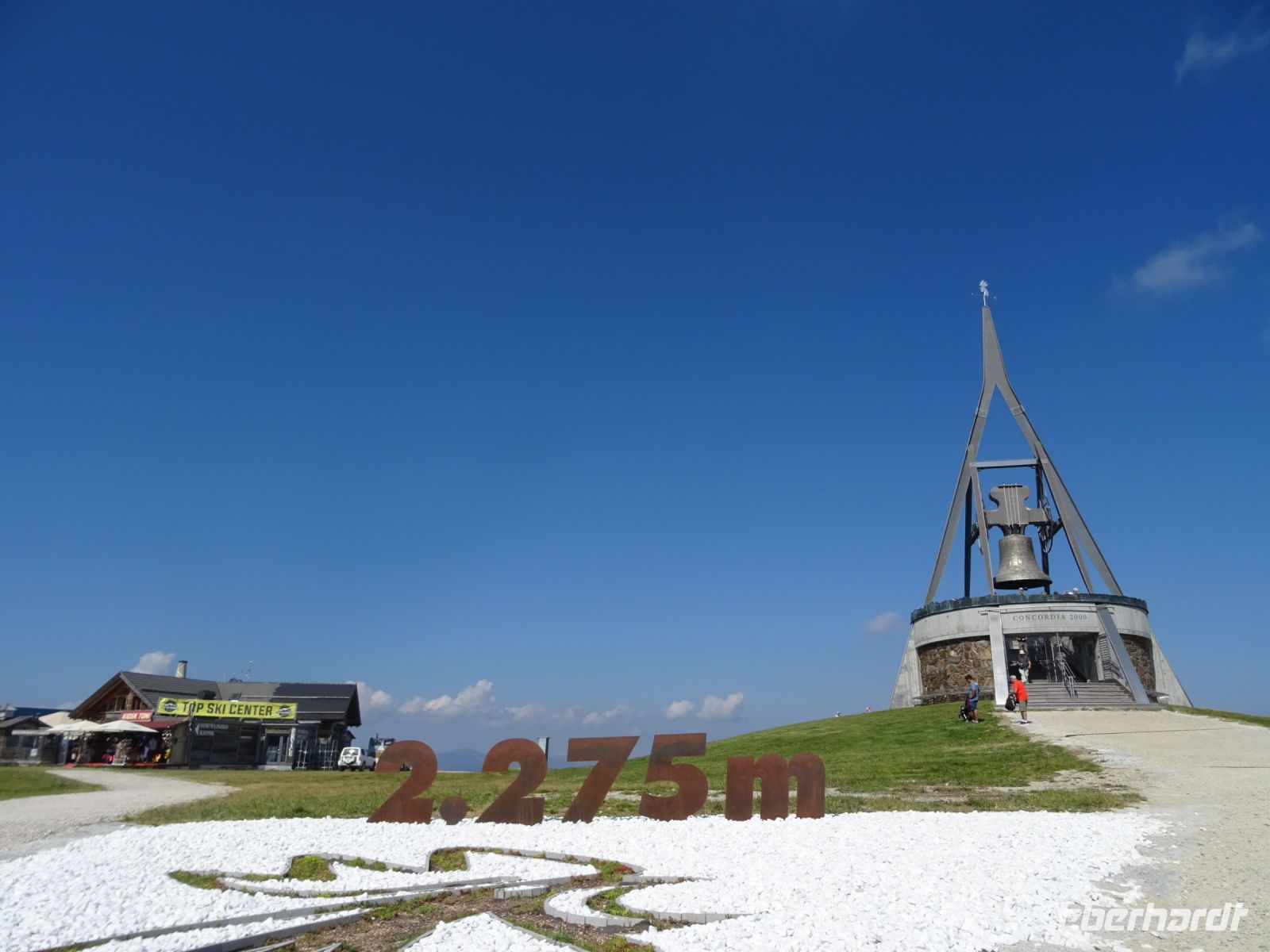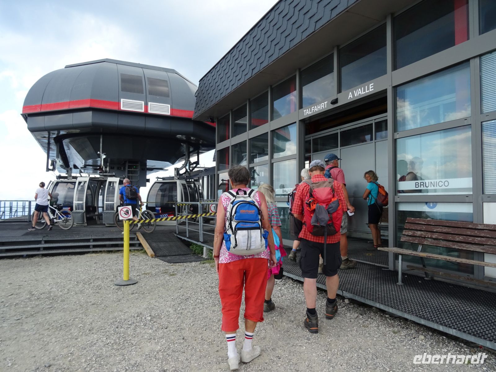 Nach einem leicht gewittrigen Abend erwartet uns heute ein entschleunigter Wandertag rund um unser Hotel. Mit Irmi starten wir einem gemütlichen Spaziergang Richtung Talstation des Kronplatzes im benachbarten Reischach. Die Seilbahn befördert uns nun auf schnellstem Wege auf den 2275 Meter hohen Hausberg von Bruneck. Der Blick vom Gipfel gilt als einer der Schönsten der Alpen. Innerhalb weniger Minuten überwinden wir nun über 1.300 Höhenmeter und gehen als erstes zur Friedensglocke „Concordia 2000“, welche im Jahre 2003 zum 25-jährigen Jubiläum des Skigebietes auf der Aussichtsplattform des Gipfels angebracht wurde und eine der größten Glocken in Südtirol und den Alpen ist. Sie ist mit der Inschrift „Gott schenke den Völkern Frieden“ versehen – Worte, die aktueller denn je sind.