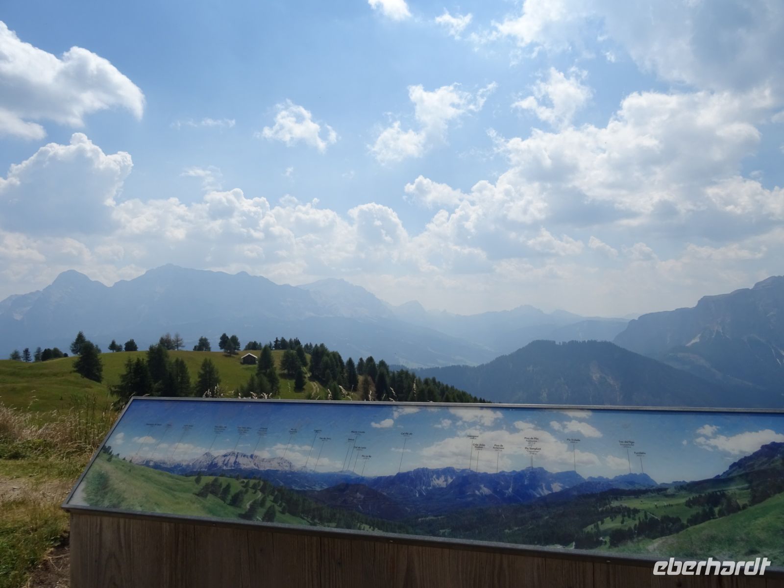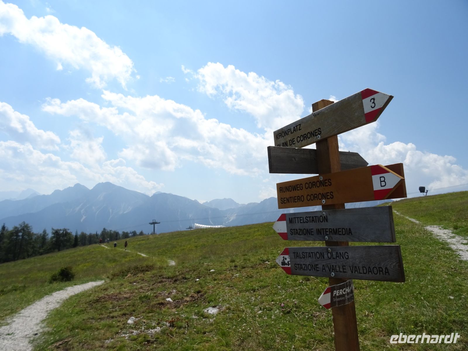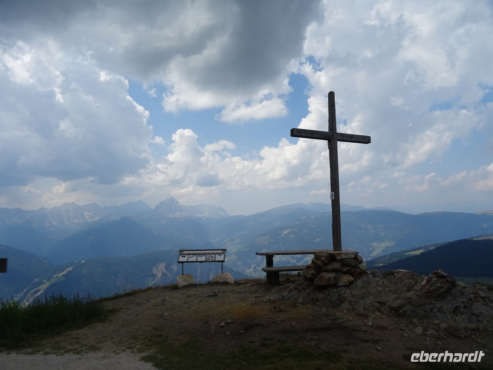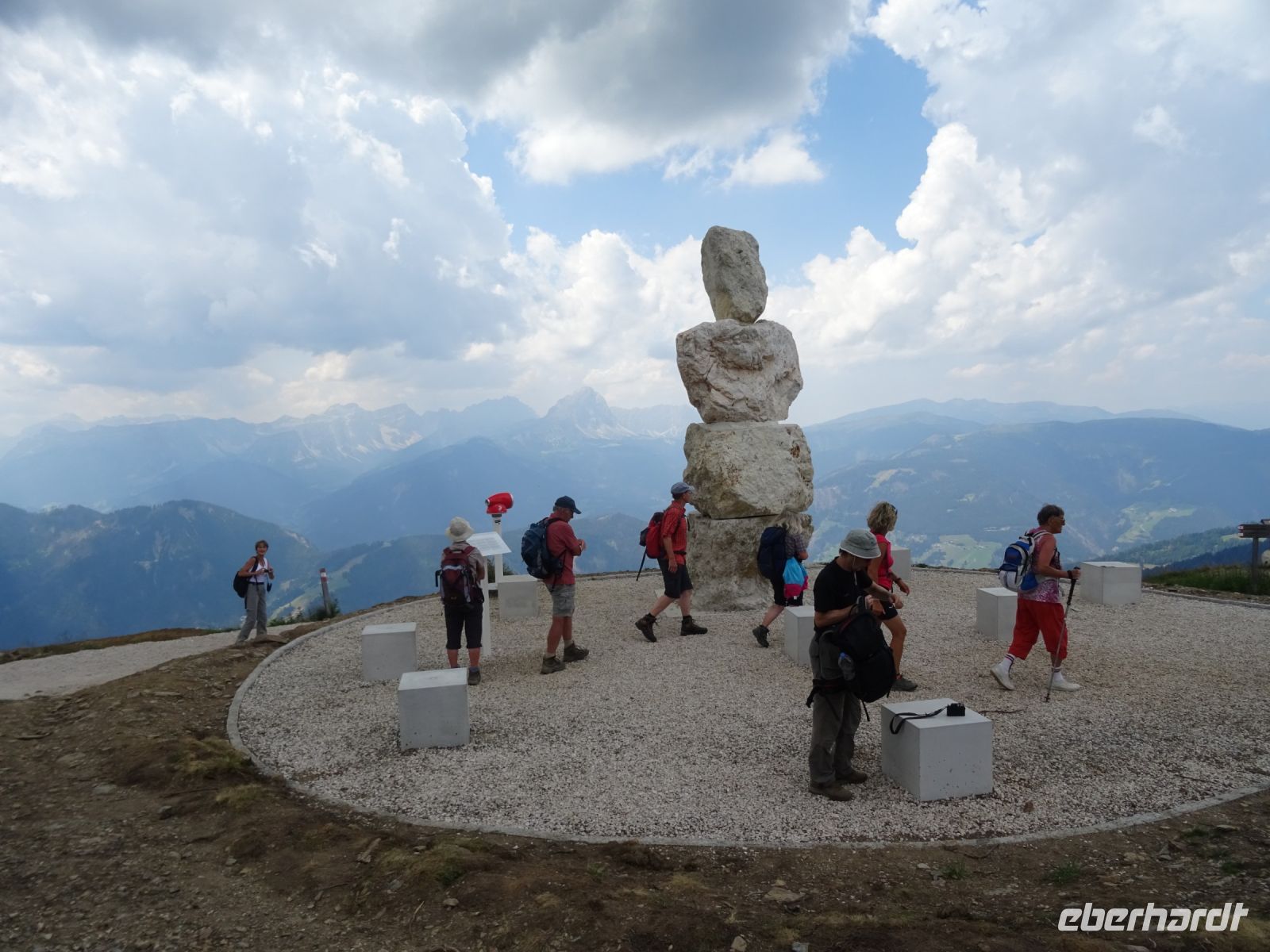 Trotz etwas diesiger Sicht freuen wir uns wieder über das Kaiserwetter und wandern als erstes entlang des Kronplatzrundweges und genießen die umgebene Landschaft. Auch unser morgiges Ziel, den Peitlerkofel, können wir in der Ferne erspäen. Nun ist es bis zu unserem Ausgangspunkt nicht mehr weit und bevor wir Messners „Krönung“ besichtigen, stärken wir uns wieder bei einer zünftigen Mittagsrast.