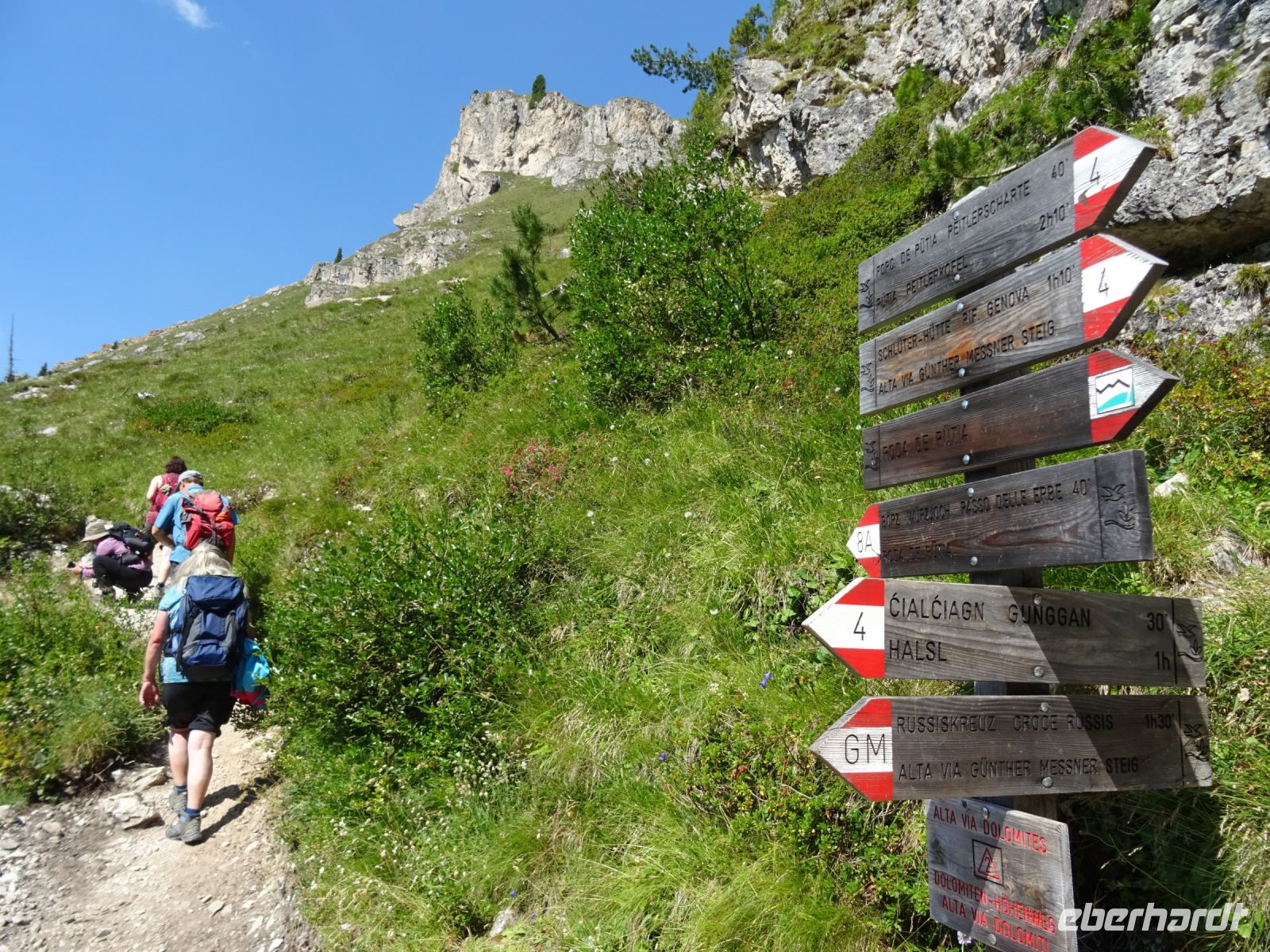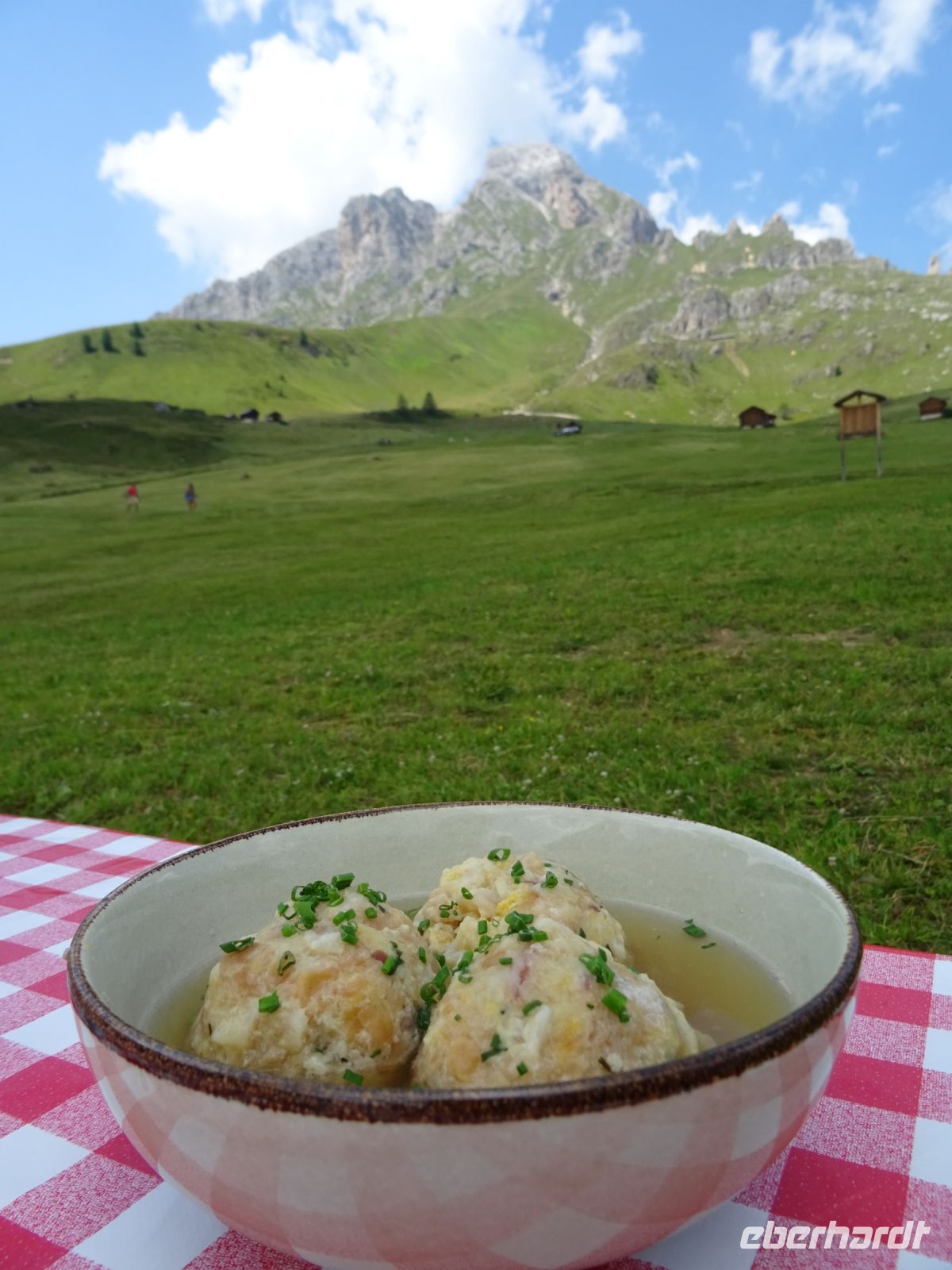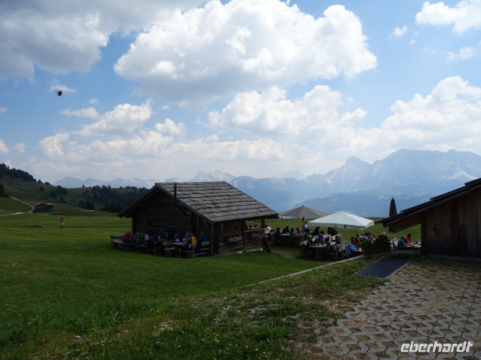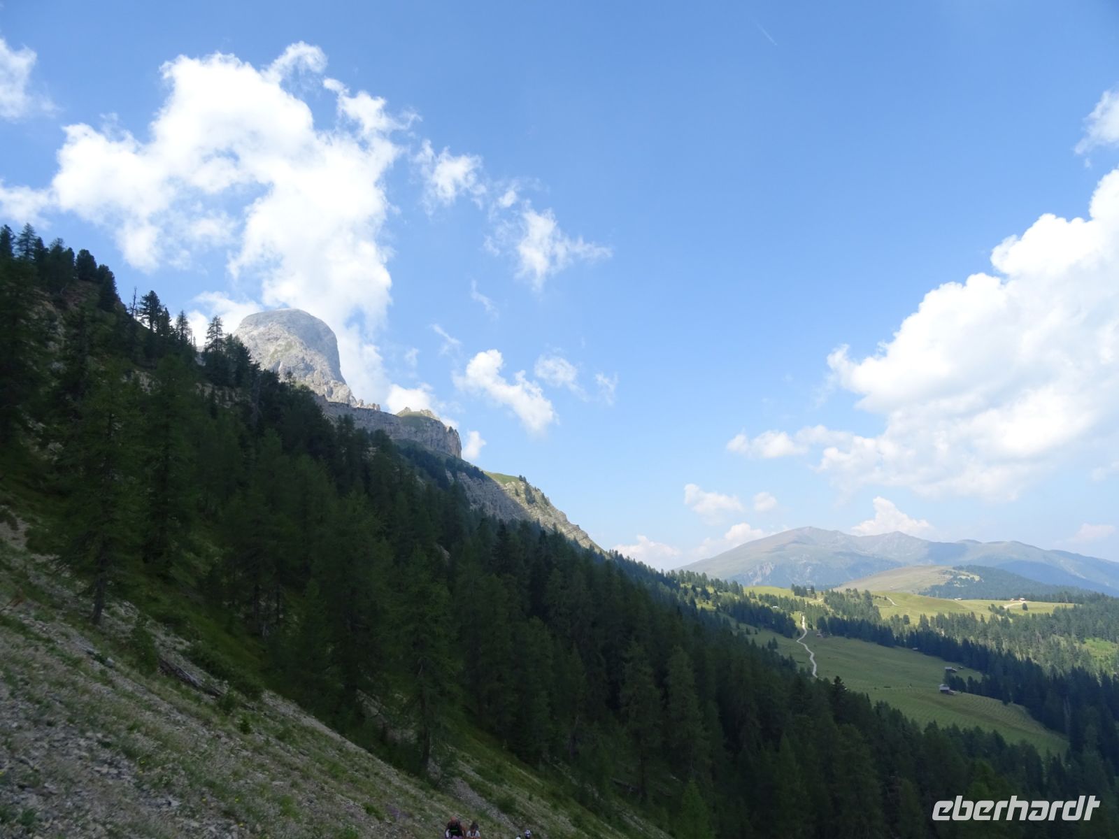 Trotz etwas diesiger Sicht freuen wir uns wieder über das Kaiserwetter und wandern als erstes entlang des Kronplatzrundweges und genießen die umgebene Landschaft. Auch unser morgiges Ziel, den Peitlerkofel, können wir in der Ferne erspäen. Nun ist es bis zu unserem Ausgangspunkt nicht mehr weit und bevor wir Messners „Krönung“ besichtigen, stärken wir uns wieder bei einer zünftigen Mittagsrast.