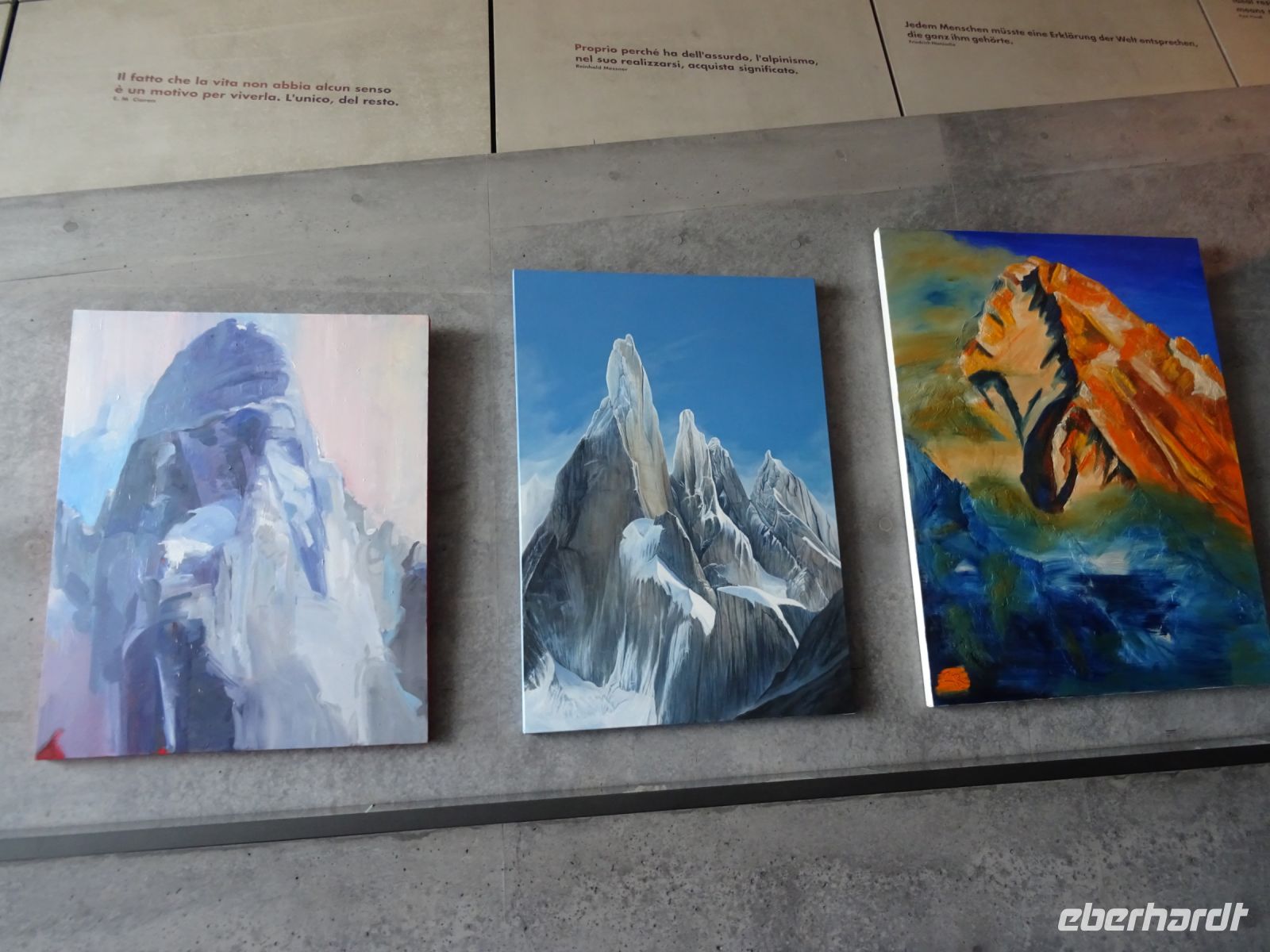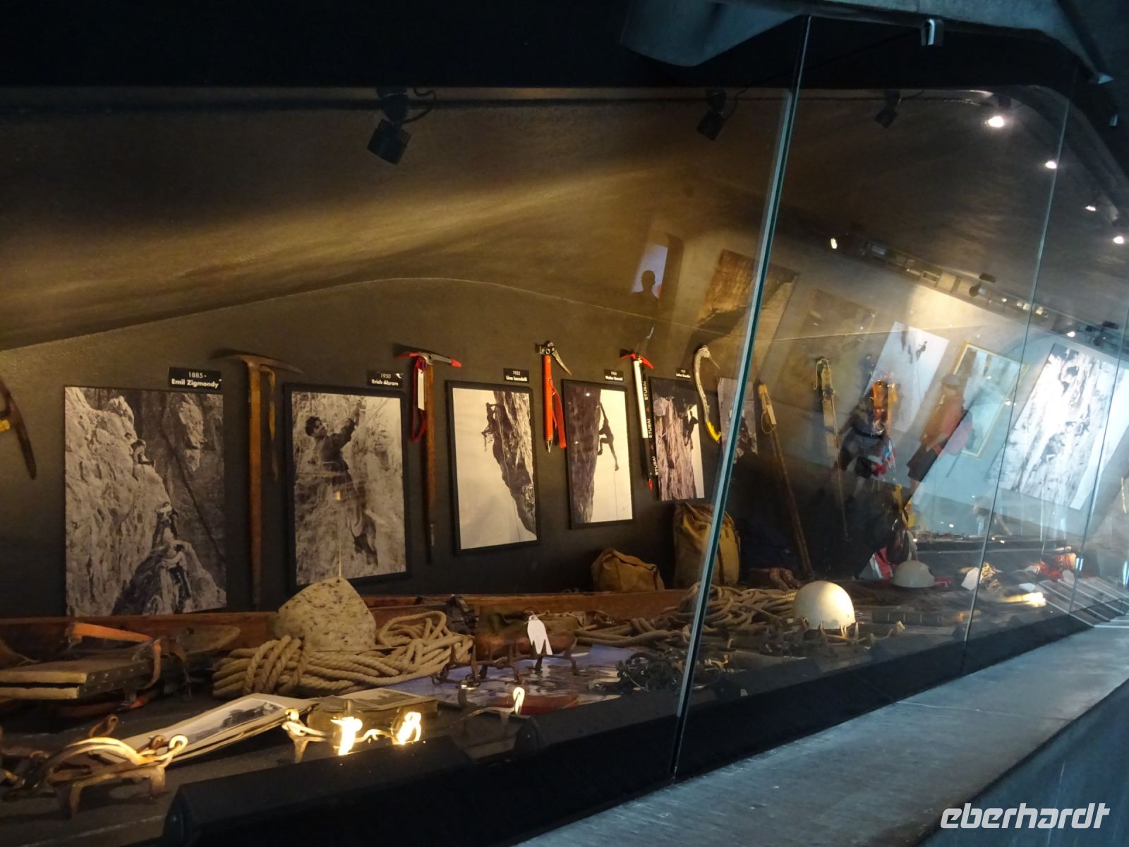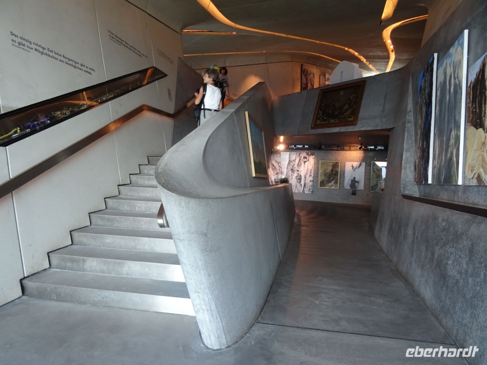 Nun gehen wir zum unverwechselbaren Museumsbau von Zaha Hadid, der entsprechend Messners Wünsche 3 große „Ausgucks“ entworfen hat. Vom einen schaut man in seine Heimat des Peitlerkofels, beim zweiten erblickt man den Heiligkreuzkofel , an dem er seine schwierigste Kletterei hatte und das dritte zielt in die unberührte, naturbelassene Gegend. Jeder kann nun individuell für sich das Museum besuchen, welches sich dem traditionellen Alpinismus gewidmet hat. Weiterhin sehen wir die verschiedensten Ausrüstungen des Bergsteigers, interessante Fotodokumentationen und natürlich eine große Auswahl seiner „Lieblingsberge“. Getreu seines Motto „Ich entscheide nicht nach richtig oder falsch, sondern nach möglich oder unmöglich“.