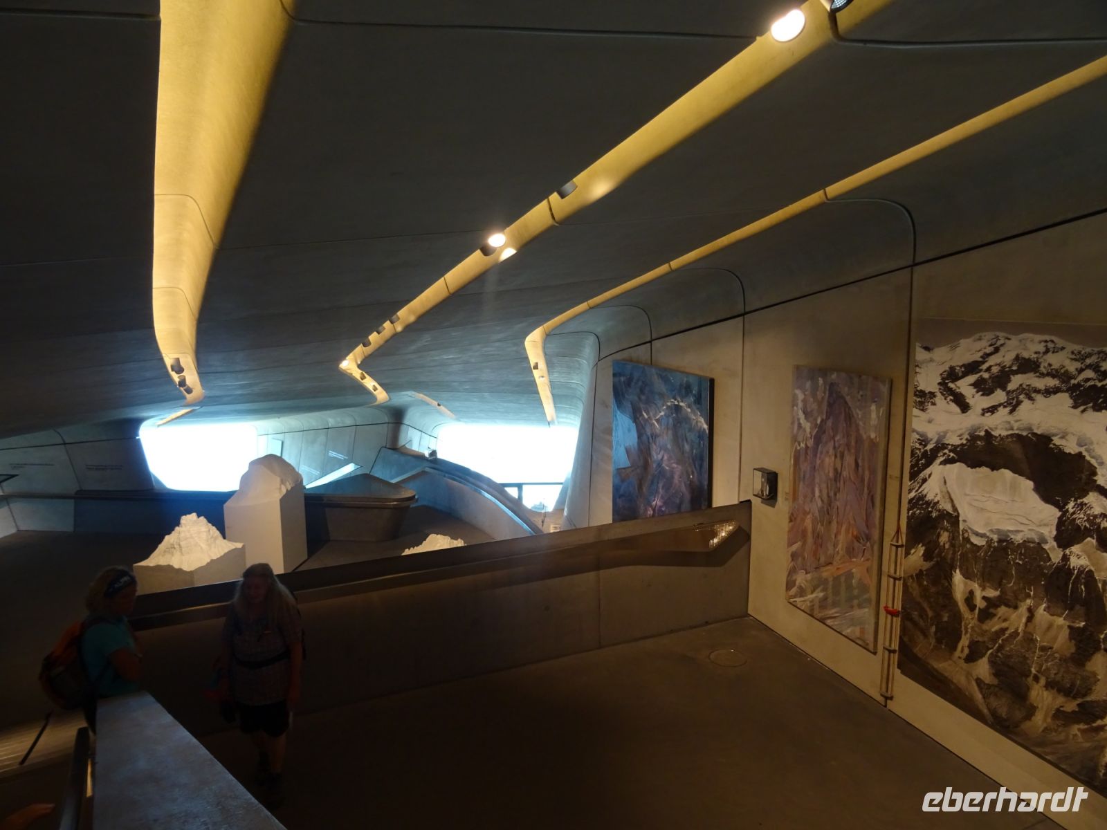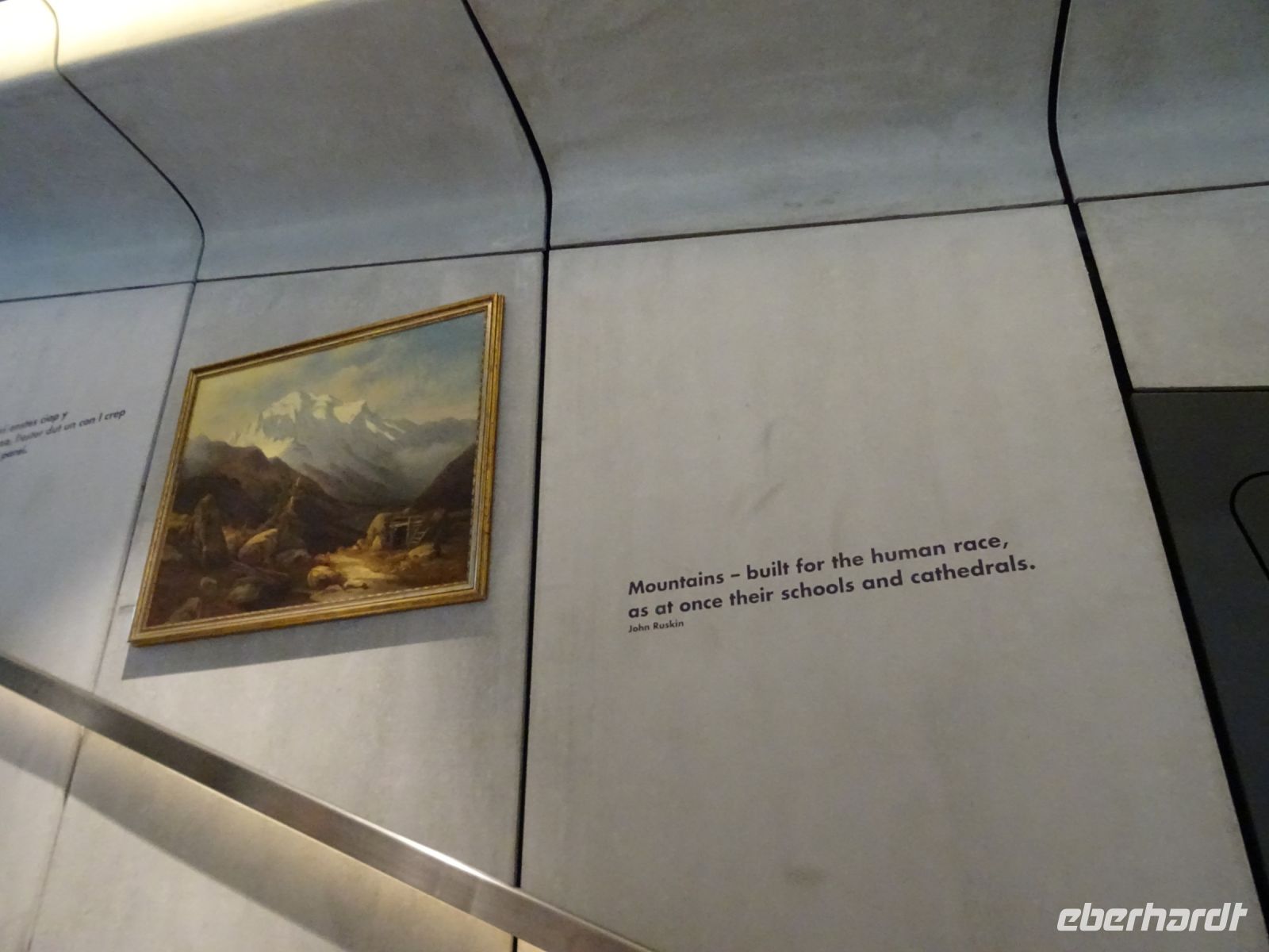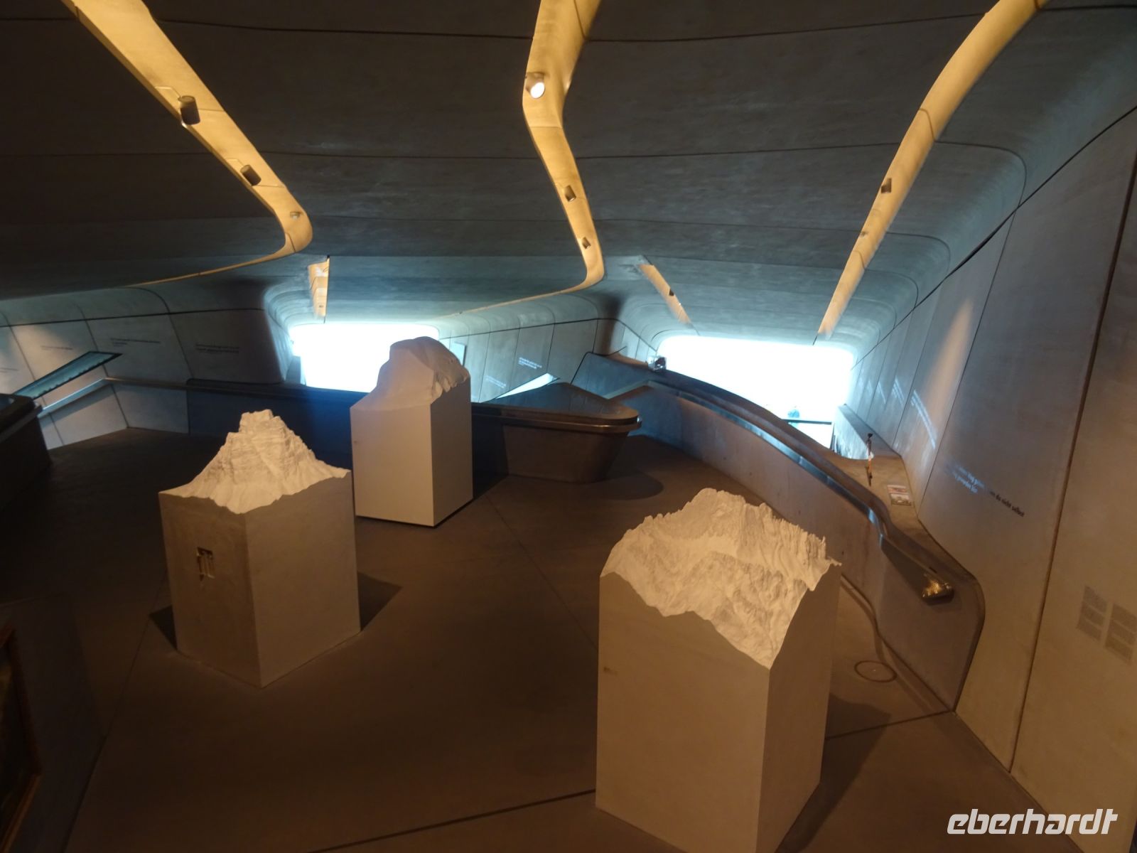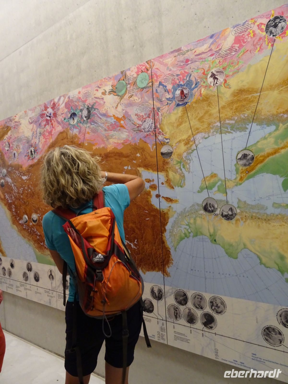 Nun gehen wir zum unverwechselbaren Museumsbau von Zaha Hadid, der entsprechend Messners Wünsche 3 große „Ausgucks“ entworfen hat. Vom einen schaut man in seine Heimat des Peitlerkofels, beim zweiten erblickt man den Heiligkreuzkofel , an dem er seine schwierigste Kletterei hatte und das dritte zielt in die unberührte, naturbelassene Gegend. Jeder kann nun individuell für sich das Museum besuchen, welches sich dem traditionellen Alpinismus gewidmet hat. Weiterhin sehen wir die verschiedensten Ausrüstungen des Bergsteigers, interessante Fotodokumentationen und natürlich eine große Auswahl seiner „Lieblingsberge“. Getreu seines Motto „Ich entscheide nicht nach richtig oder falsch, sondern nach möglich oder unmöglich“.