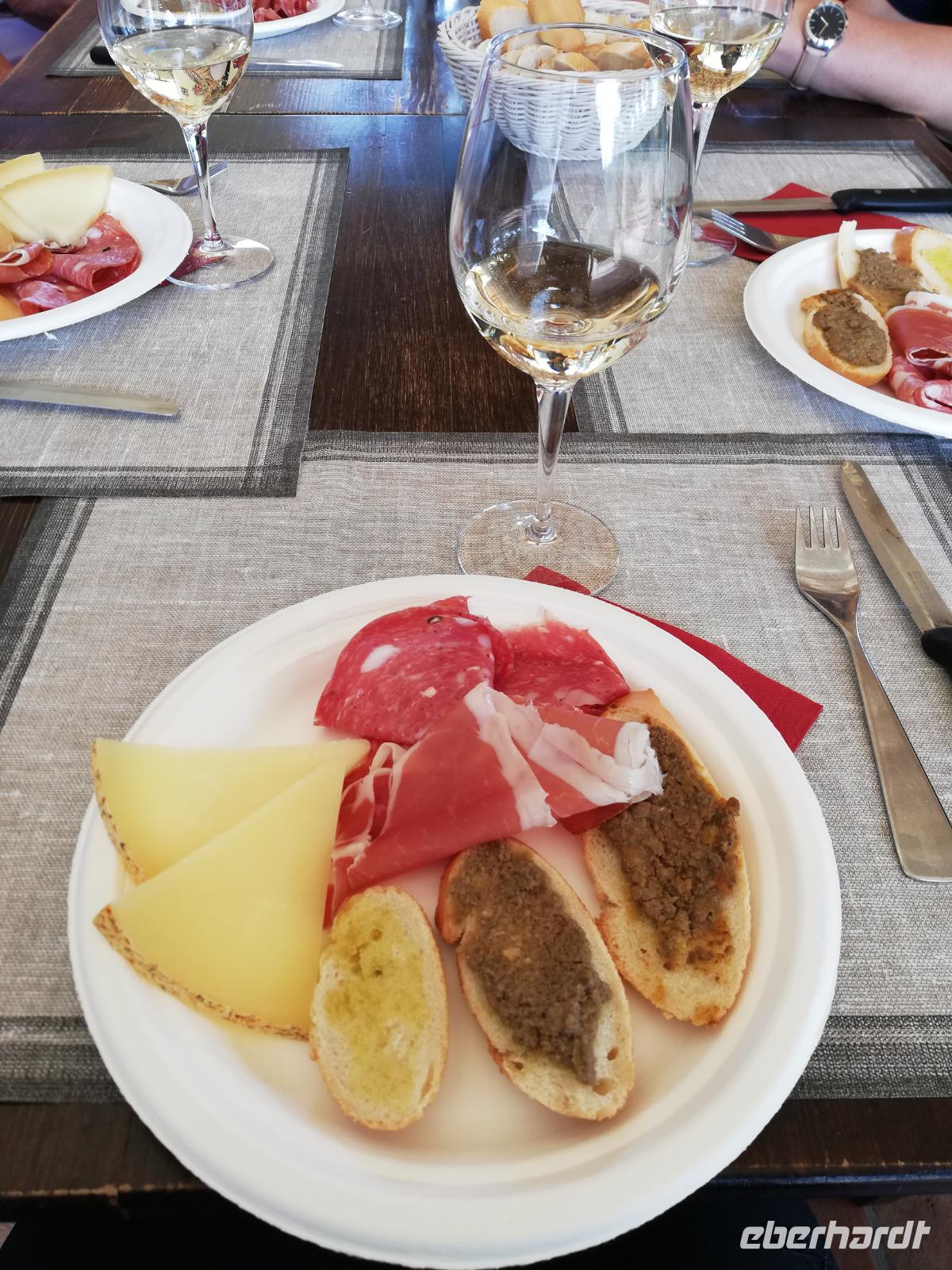 Das Wetter fest im Blick begeben wir uns auf unsere heutige Wanderung. An Marschverpflegung haben wir gedacht und umrunden den Monte Calamita. Durch das hohe Magnetitvorkommen wird er auch als Magnetberg bezeichnet und ist mit ca. 411 Höhenmetern der höchste Punkt der Halbinsel Calamita. Über viele Jahre wurde hier nachhaltig abgebaut. Somit finden wir alte Bergbau-Terrassen und Reste der Industrieanlagen vor. Unterwegs genießen wir immer wieder fantastische Aussichten auf verschiedene elbanische Städte und auf die benachbarte Inseln wie Montecristo und Giglio. Den Ort Capoliveri erreichen wir am Nachmittag und am Ende unserer Wanderung. Wir spazieren durch die Gässchen und schlemmen dabei ein typisches italienisches Eis und beobachten das Treiben auf den Plätzen dieses schönen Ortes. Auf der Fahrt Richtung Hotel kommen wir auf einem Landgut in den Genuss einer Weinprobe. Dazu werden uns leckere Spezialitäten der Elbaner gereicht. In gemütlicher Runde zu Rot- und Weißwein gibt es zum Abschluss den berühmten "Besoffenen Kuchen", auf Italienisch Schiaccia Briaca. Hm köstlich. Wir nehmen noch den Einen oder Anderen köstlichen Tropfen mit und treten die Heimreise an.