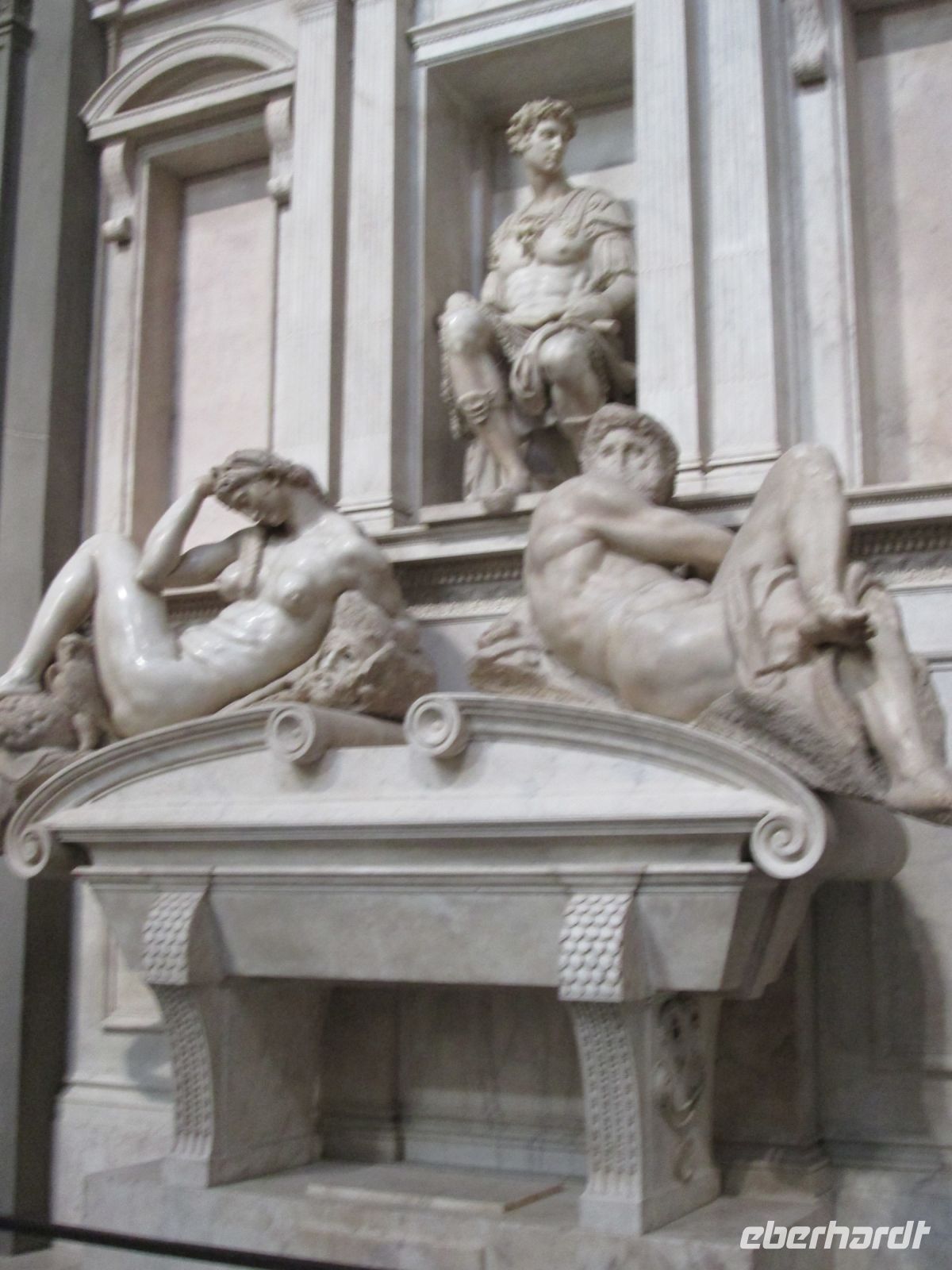 In der Neuen Sakristei dagegen gibt es 2 Grabmäler in schlichtem weißen Marmor. Schlicht mag der erste Eindruck sein, tatsächlich haben wir hier Michelangelos erstes großes Werk von 1520 . Er fertigte die Gräber für Lorenzo II. und Giuliano II, jüngster Sohn von Lorenzo dem Prächtigen.